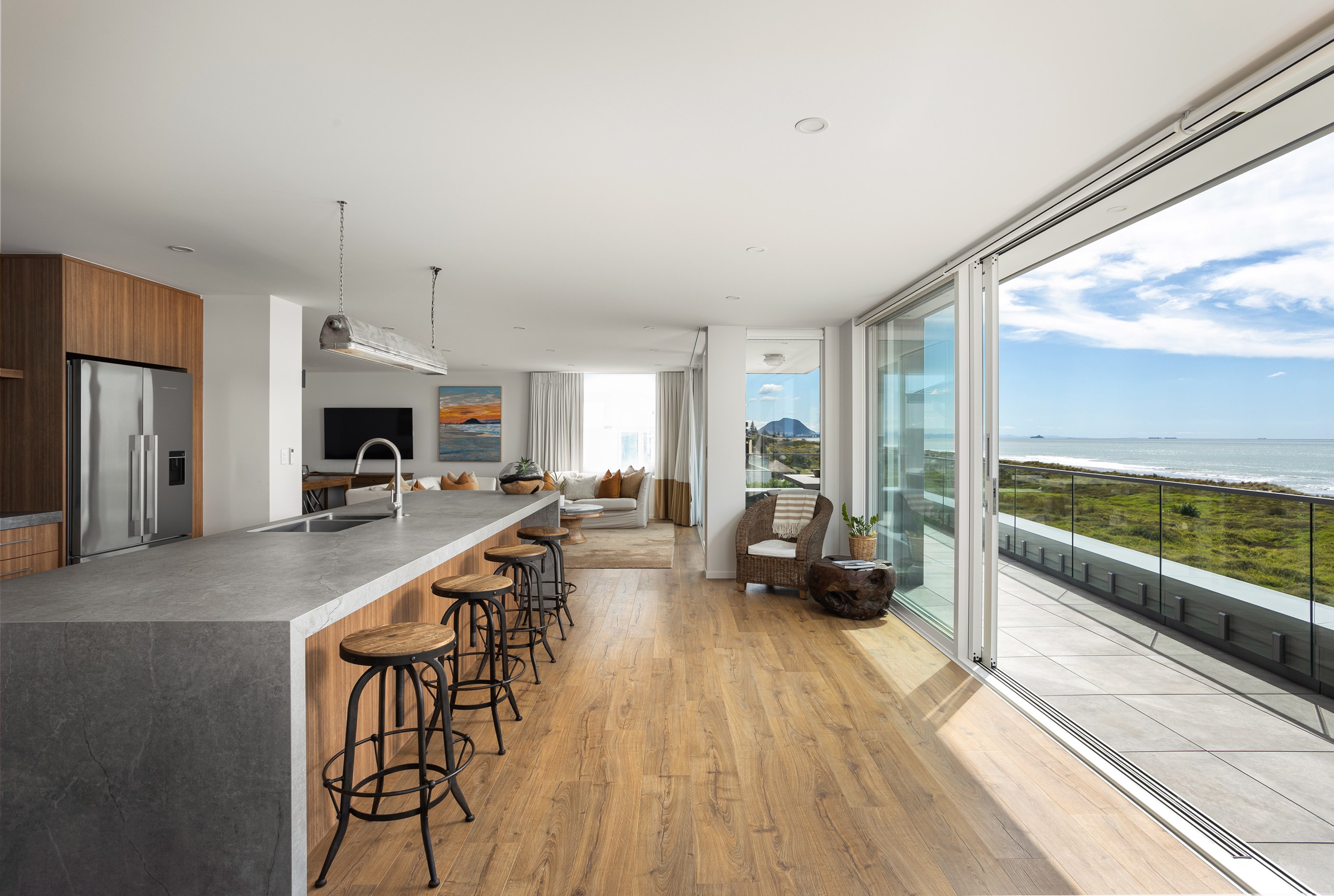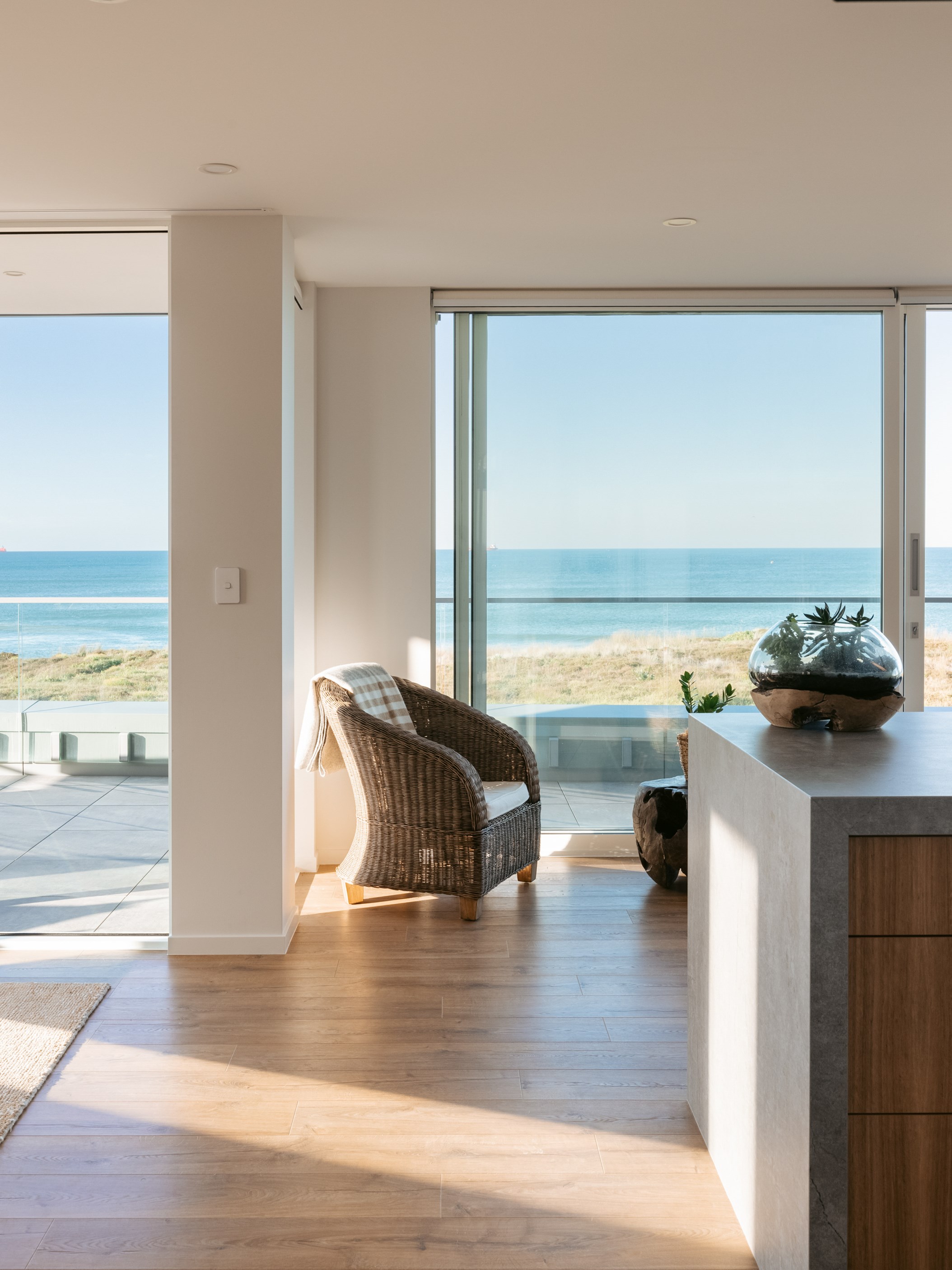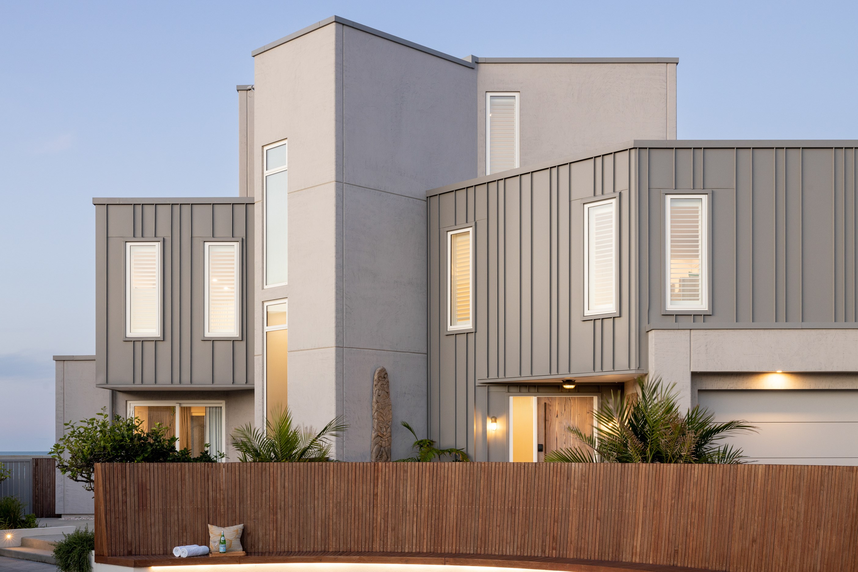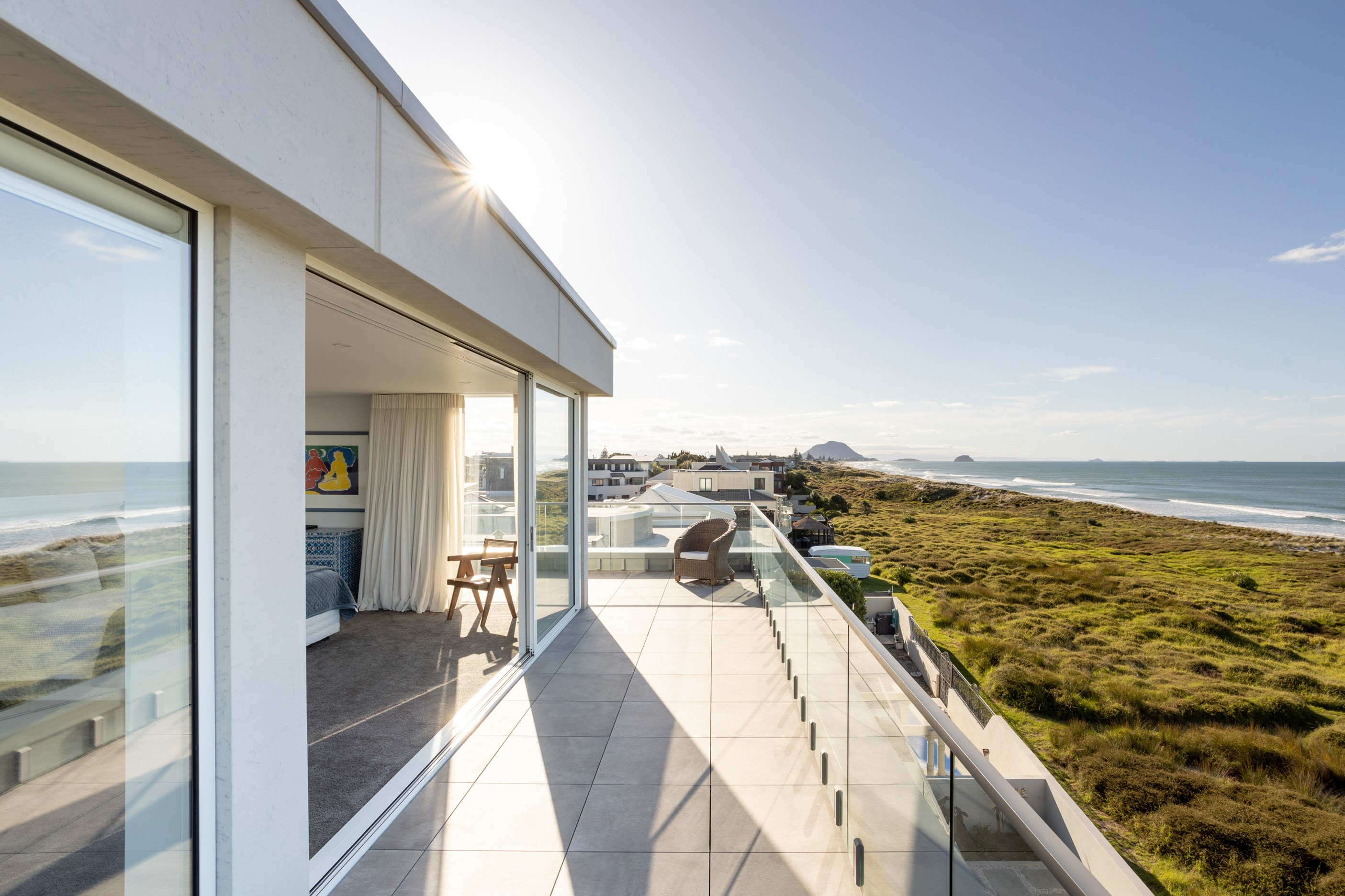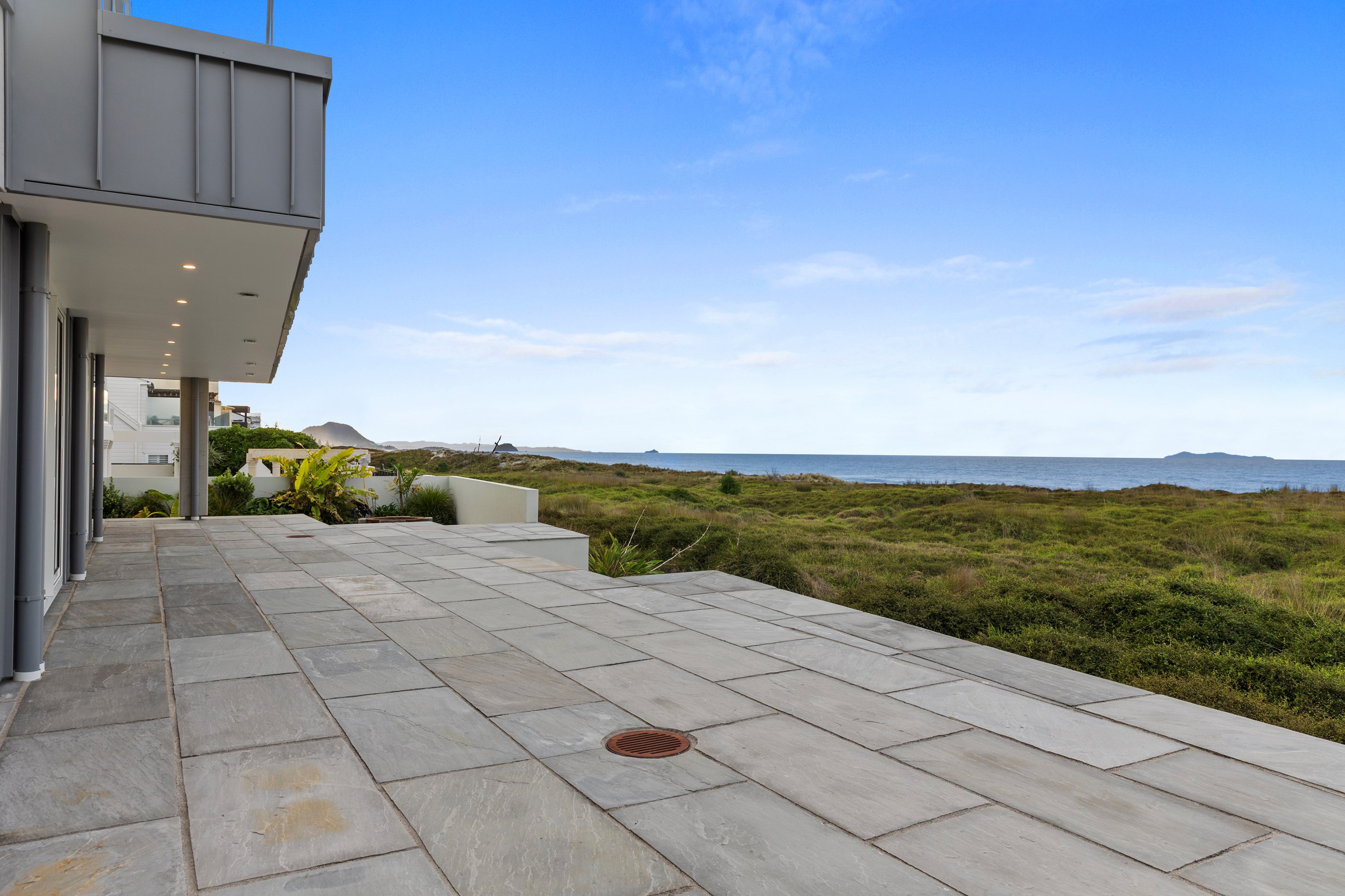 Nestling serenely among the sand dunes of Mount Maunganui beach, a high-end metamorphosis has breathed new life into a dated waterfront property that now stands as a testament to the power of restoration, craftsmanship and innovative design. The ambitious project has infused modern aesthetics into every facet of the residence, including reshaping the structure. A lowmaintenance concrete-plaster system, with the look of precast concrete panels, rejuvenates the exterior adding sophistication, robustness and timeless appeal. Vertical rolled-seam trays, arranged in a captivating pattern, add contrast and texture. Making the most of the panoramic coastal views, all interior spaces have been opened up for comfortable living, with swathes of glass doors allowing the indoors to seamlessly integrate with the outdoors and the ocean beyond.