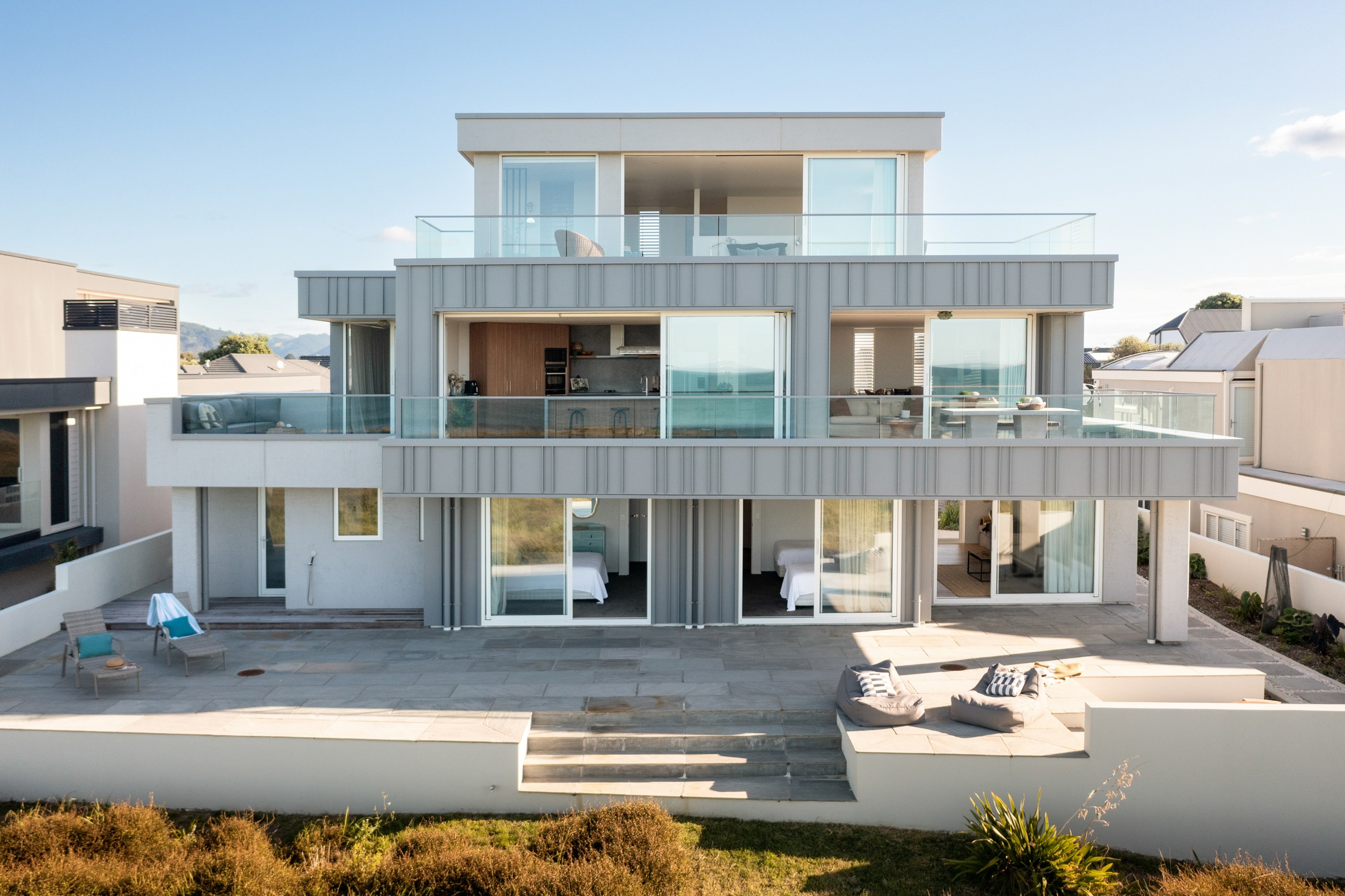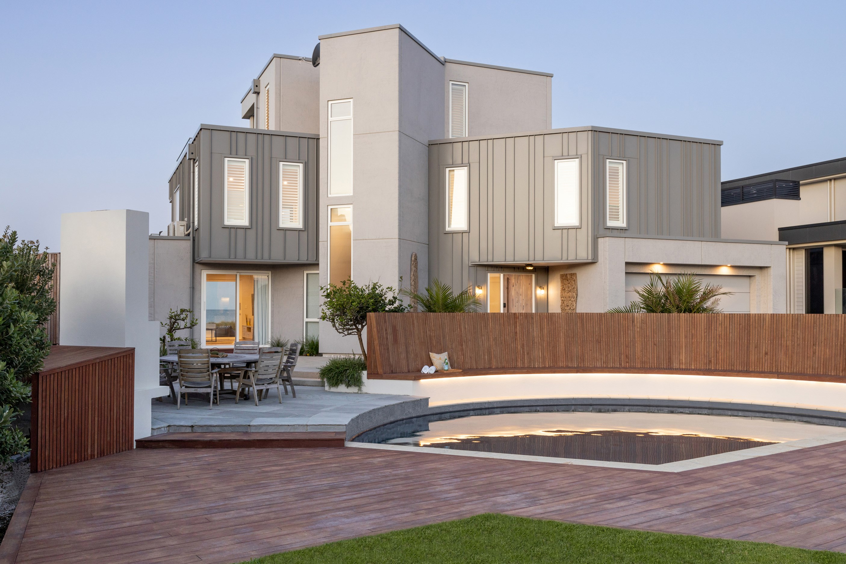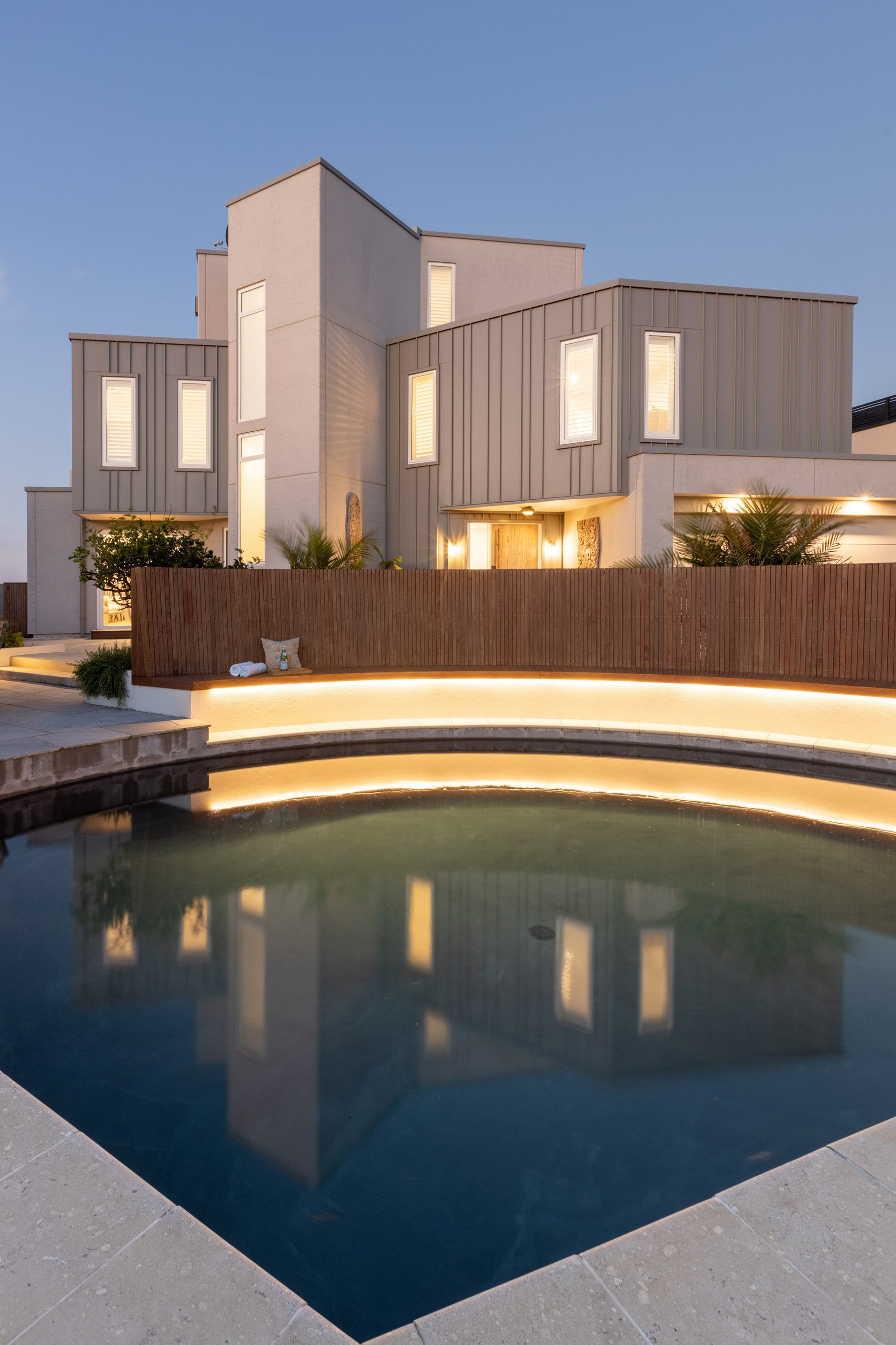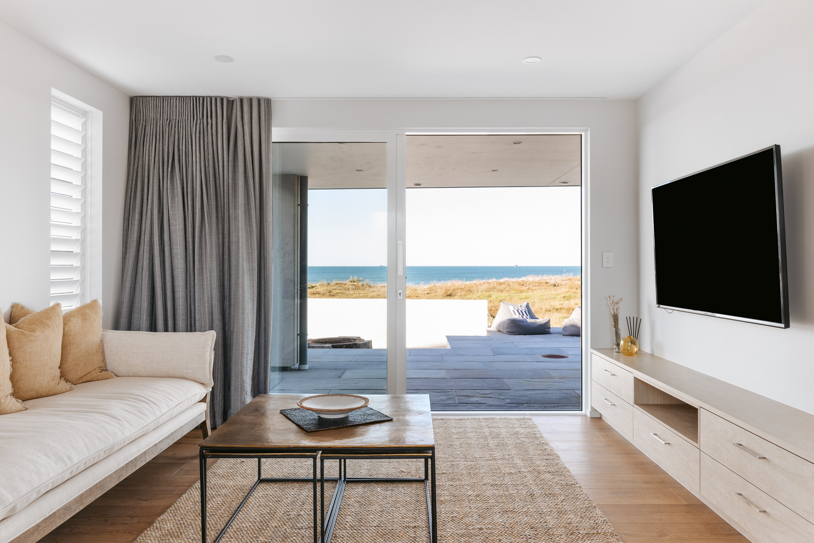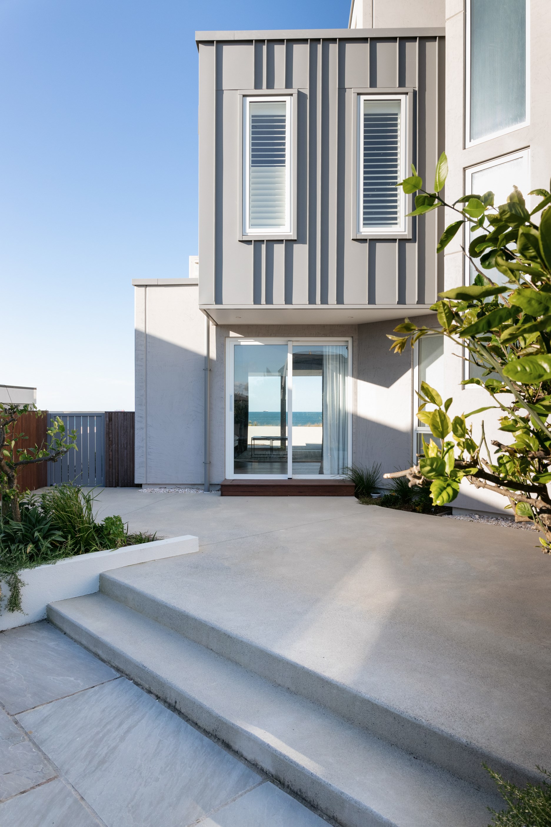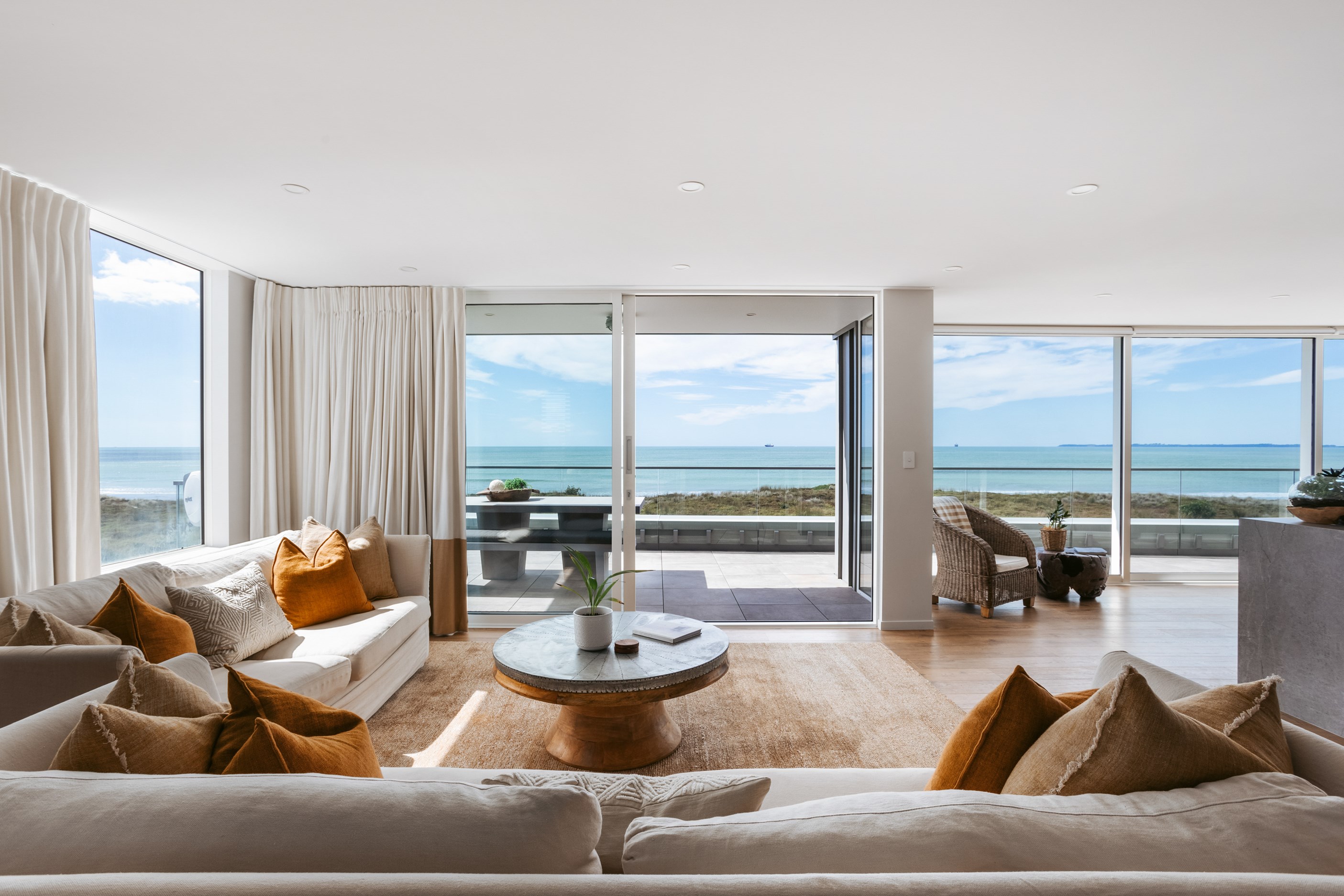 Nestling serenely among the sand dunes of Mount Maunganui beach, a high-end metamorphosis has breathed new life into a dated waterfront property that now stands as a testament to the power of restoration, craftsmanship and innovative design. The ambitious project has infused modern aesthetics into every facet of the residence, including reshaping the structure. A lowmaintenance concrete-plaster system, with the look of precast concrete panels, rejuvenates the exterior adding sophistication, robustness and timeless appeal. Vertical rolled-seam trays, arranged in a captivating pattern, add contrast and texture. Making the most of the panoramic coastal views, all interior spaces have been opened up for comfortable living, with swathes of glass doors allowing the indoors to seamlessly integrate with the outdoors and the ocean beyond.