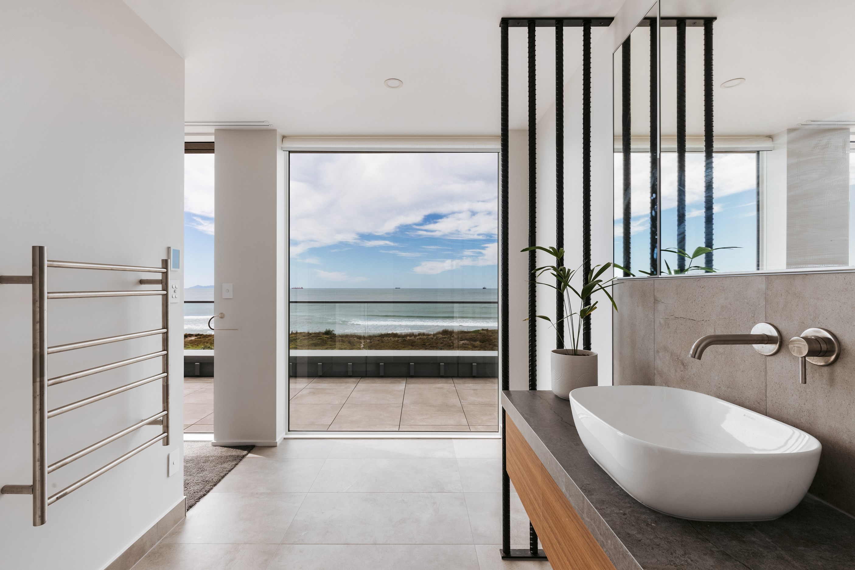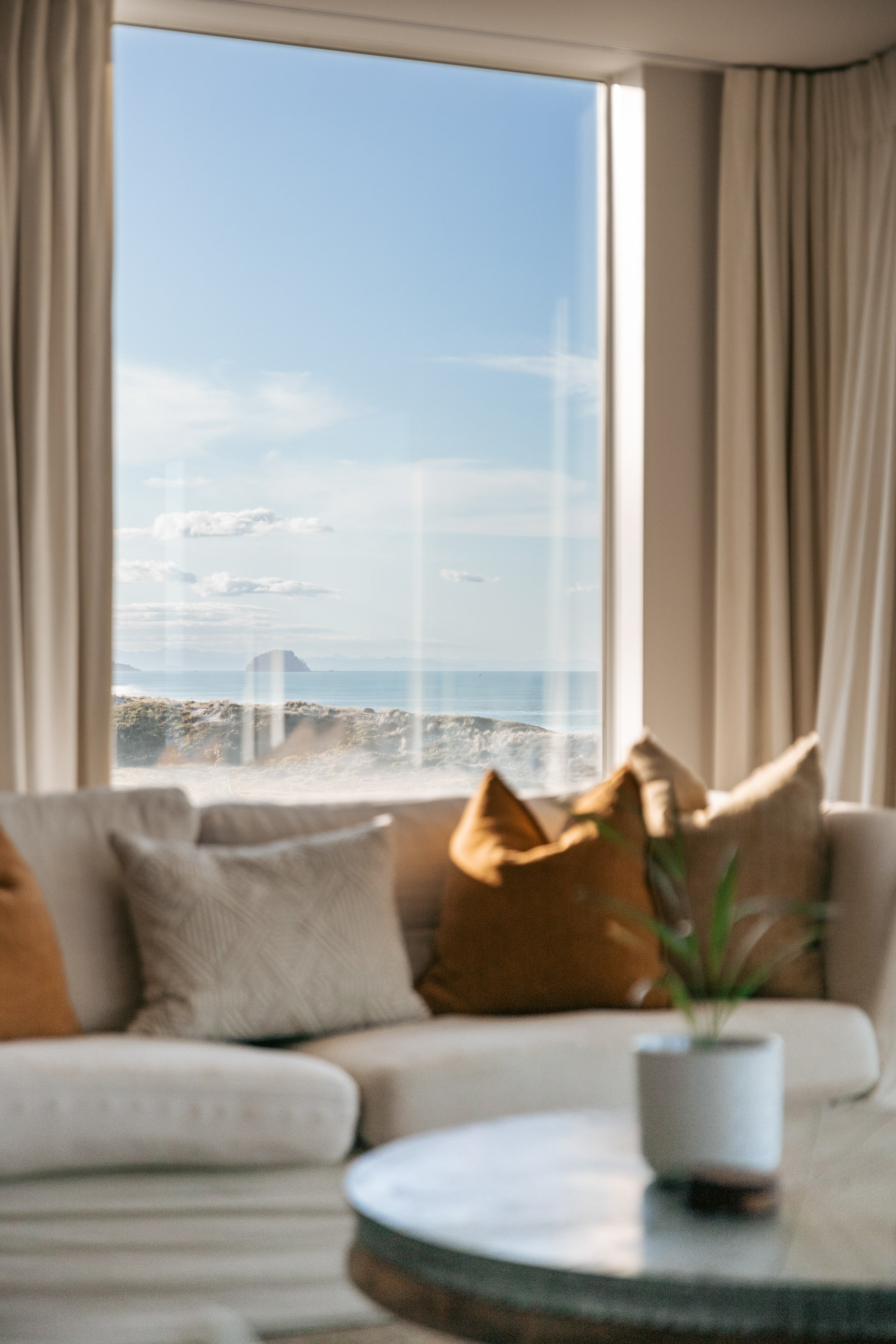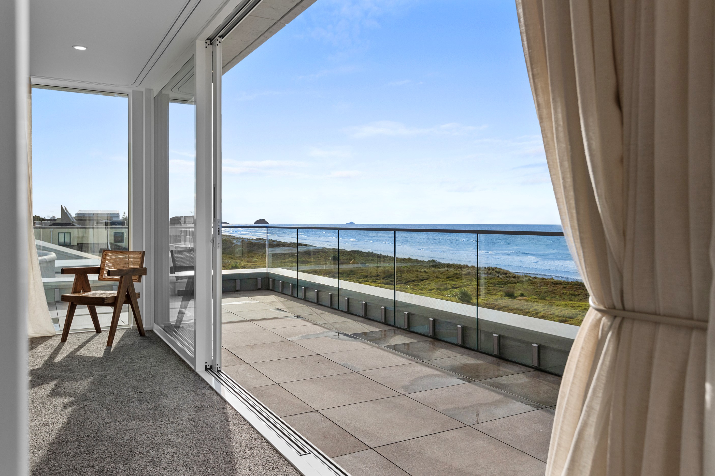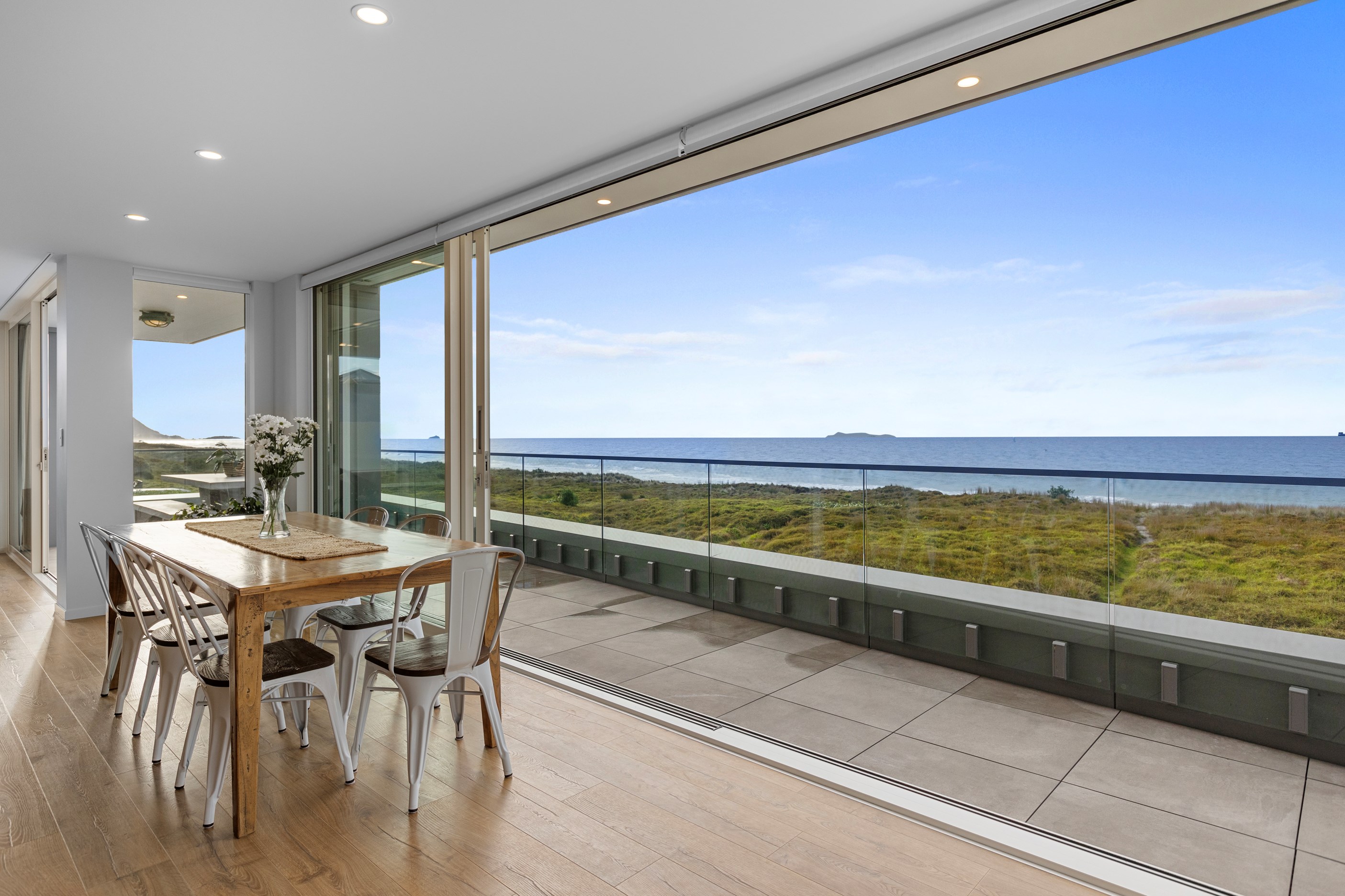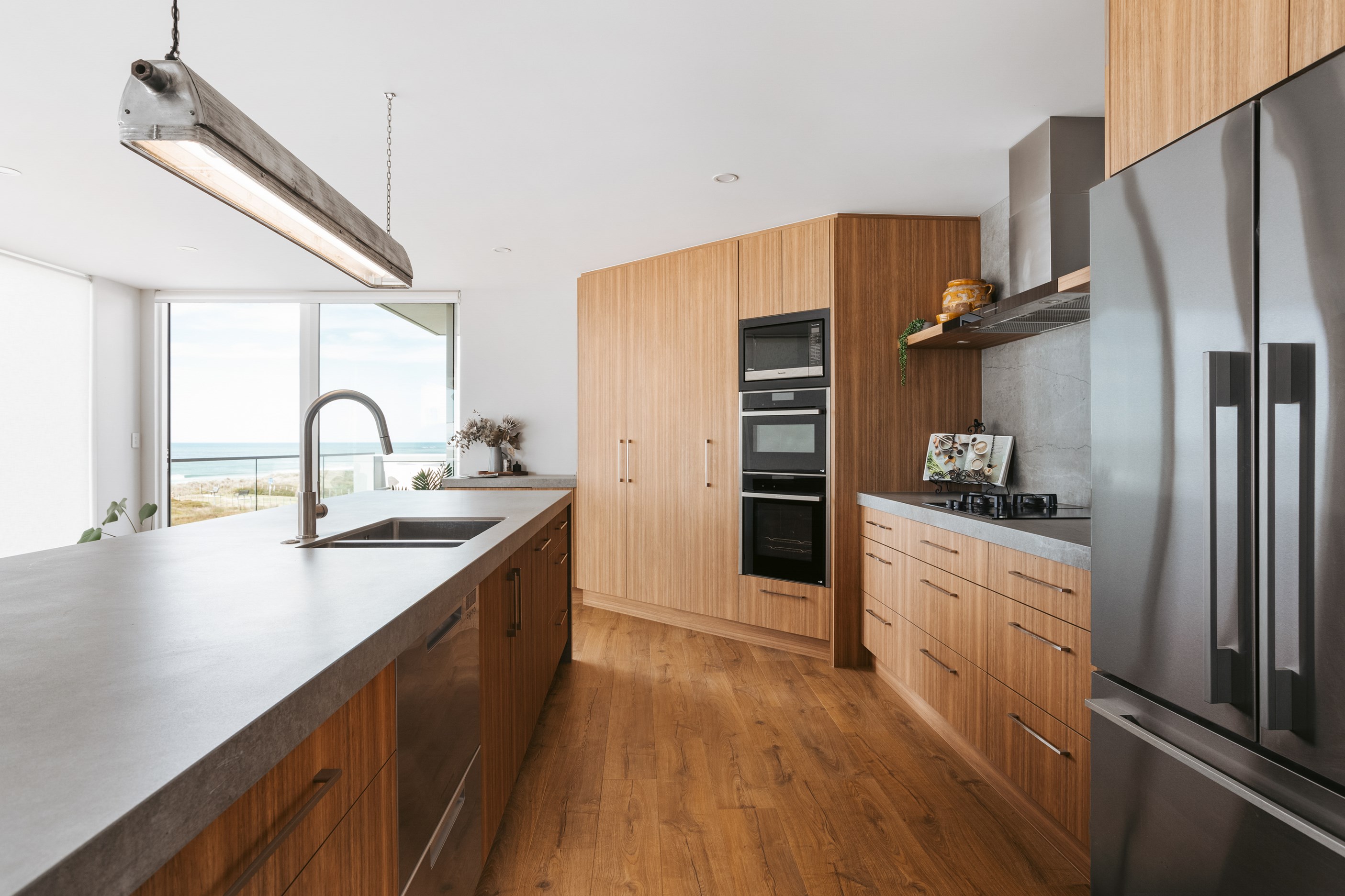 Nestling serenely among the sand dunes of Mount Maunganui beach, a high-end metamorphosis has breathed new life into a dated waterfront property that now stands as a testament to the power of restoration, craftsmanship and innovative design. The ambitious project has infused modern aesthetics into every facet of the residence, including reshaping the structure. A lowmaintenance concrete-plaster system, with the look of precast concrete panels, rejuvenates the exterior adding sophistication, robustness and timeless appeal. Vertical rolled-seam trays, arranged in a captivating pattern, add contrast and texture. Making the most of the panoramic coastal views, all interior spaces have been opened up for comfortable living, with swathes of glass doors allowing the indoors to seamlessly integrate with the outdoors and the ocean beyond.