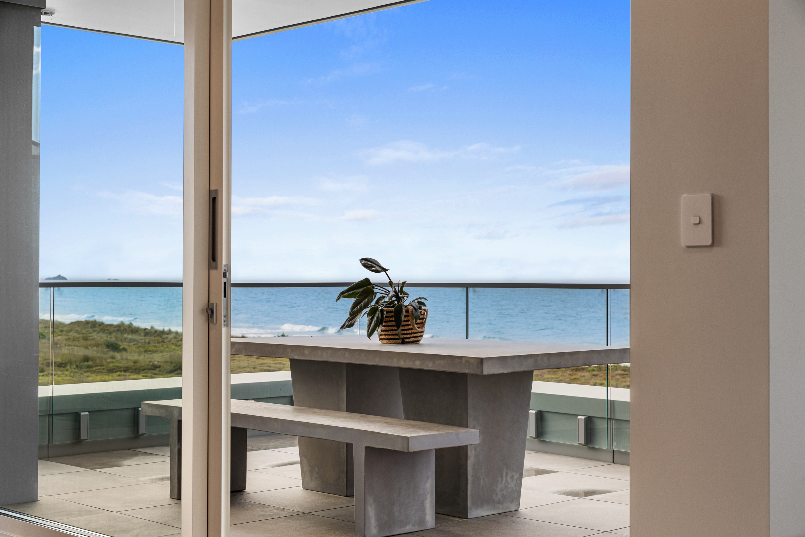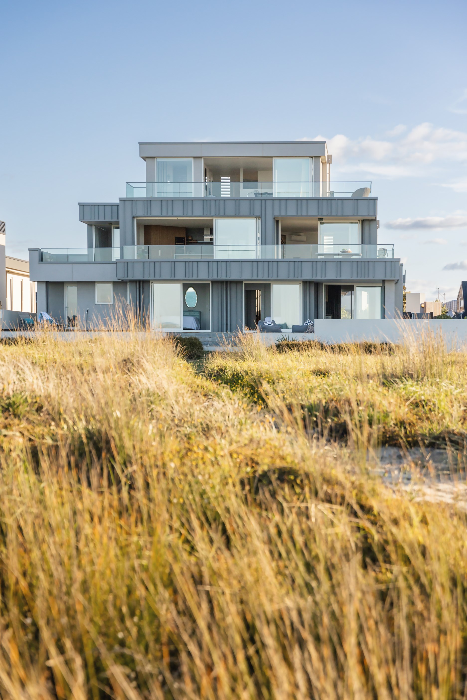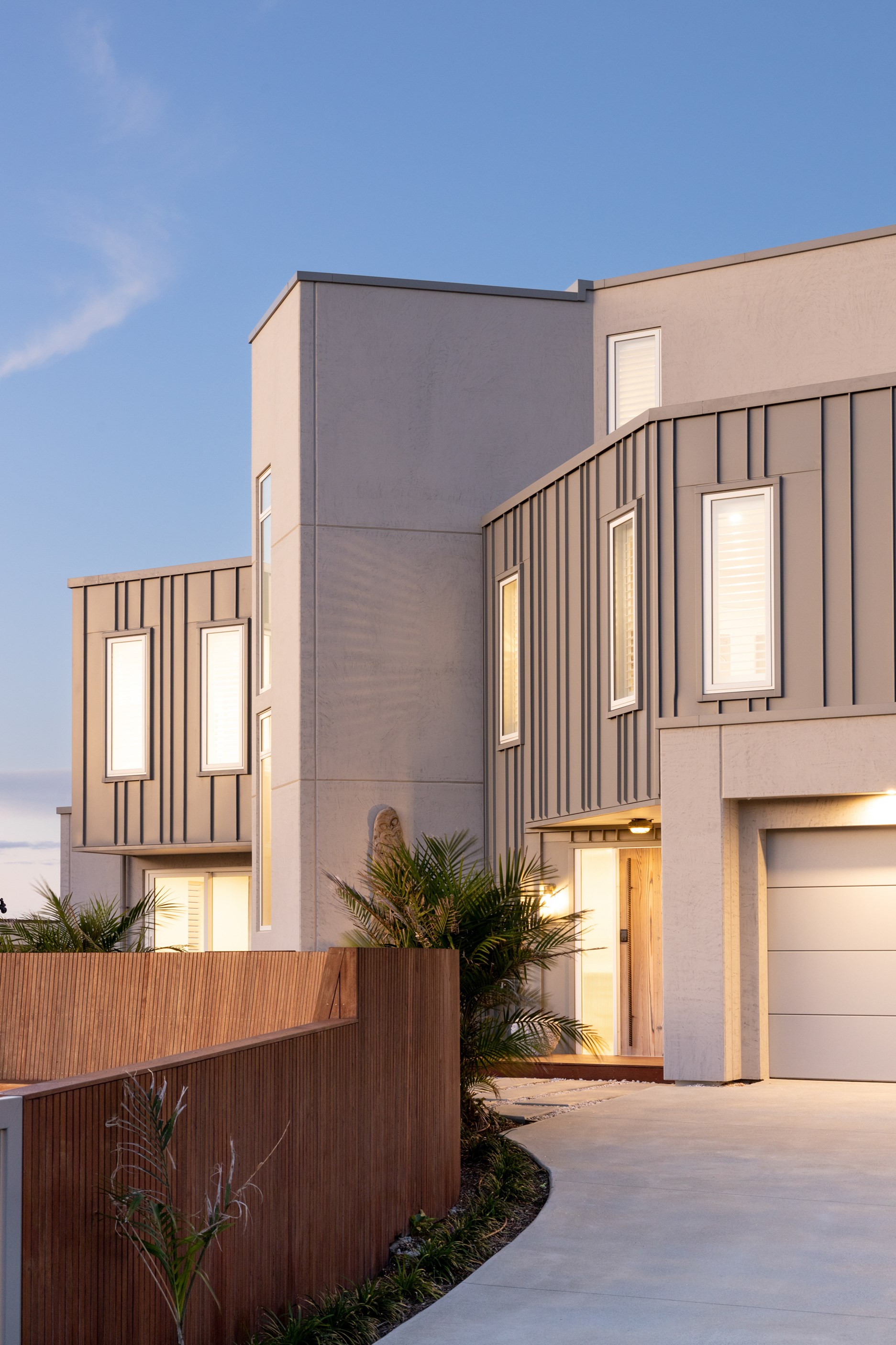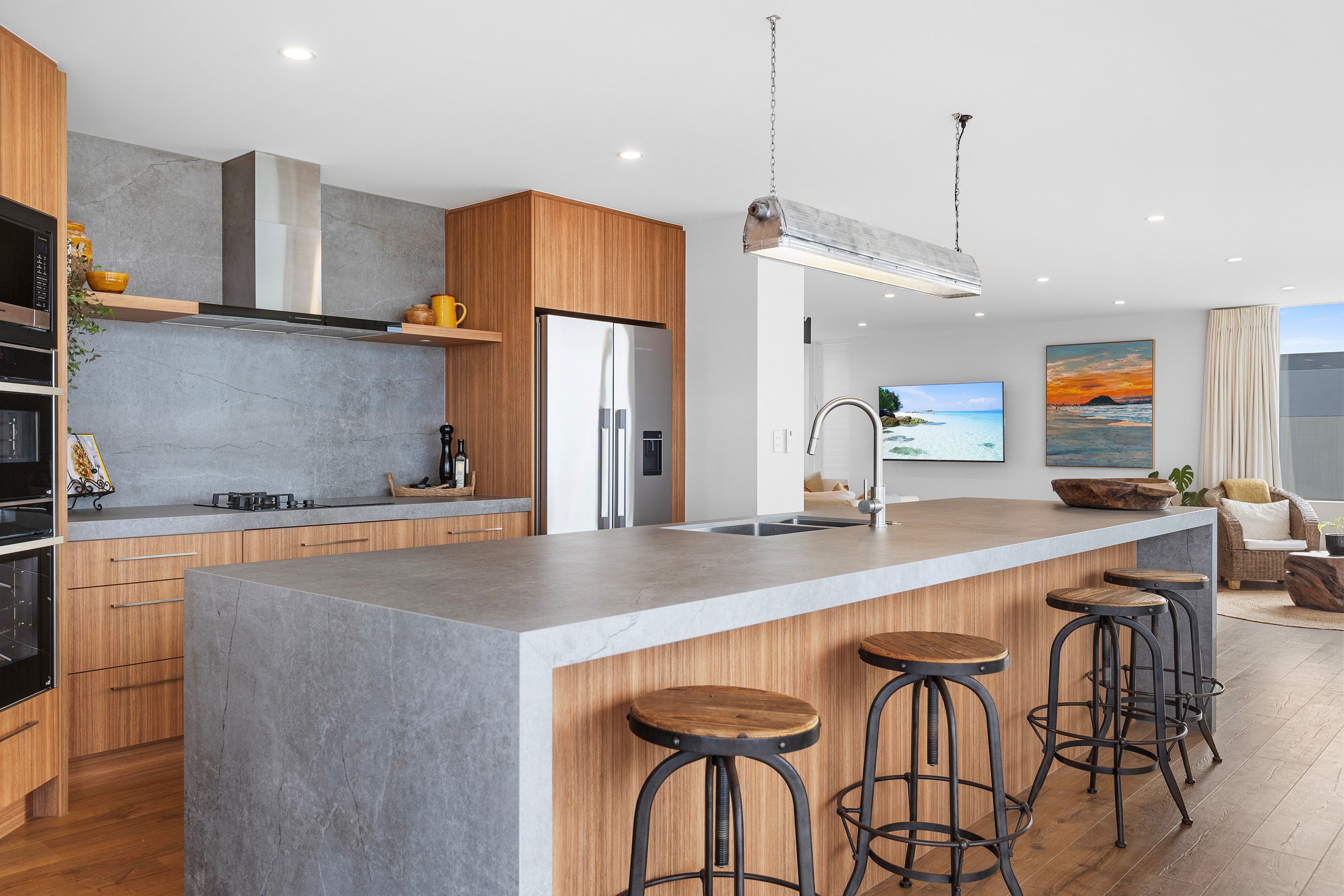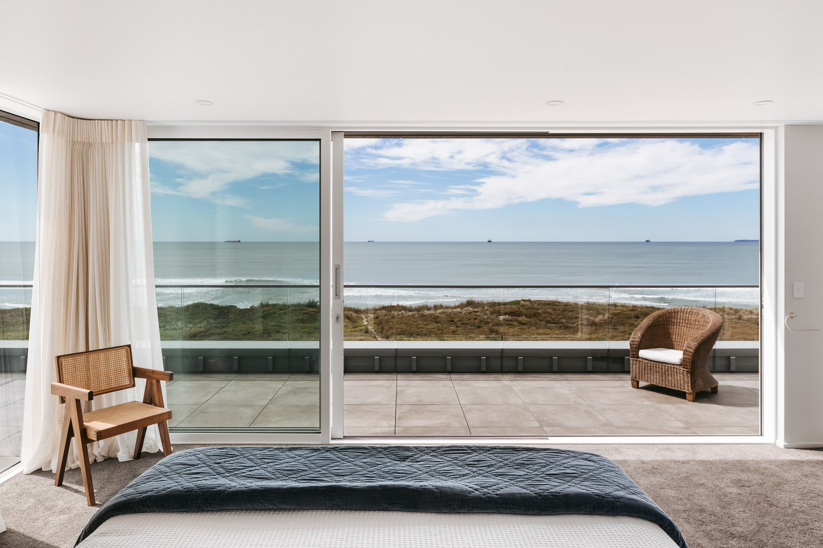 Nestling serenely among the sand dunes of Mount Maunganui beach, a high-end metamorphosis has breathed new life into a dated waterfront property that now stands as a testament to the power of restoration, craftsmanship and innovative design. The ambitious project has infused modern aesthetics into every facet of the residence, including reshaping the structure. A lowmaintenance concrete-plaster system, with the look of precast concrete panels, rejuvenates the exterior adding sophistication, robustness and timeless appeal. Vertical rolled-seam trays, arranged in a captivating pattern, add contrast and texture. Making the most of the panoramic coastal views, all interior spaces have been opened up for comfortable living, with swathes of glass doors allowing the indoors to seamlessly integrate with the outdoors and the ocean beyond.
