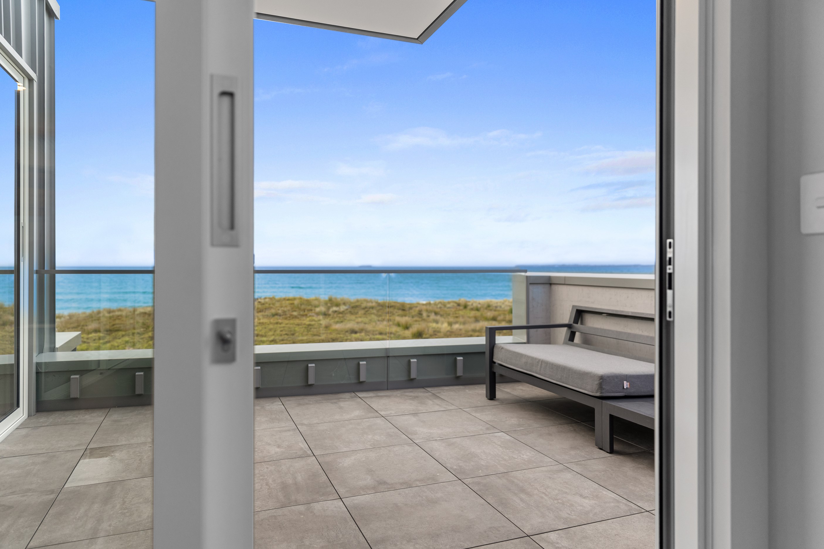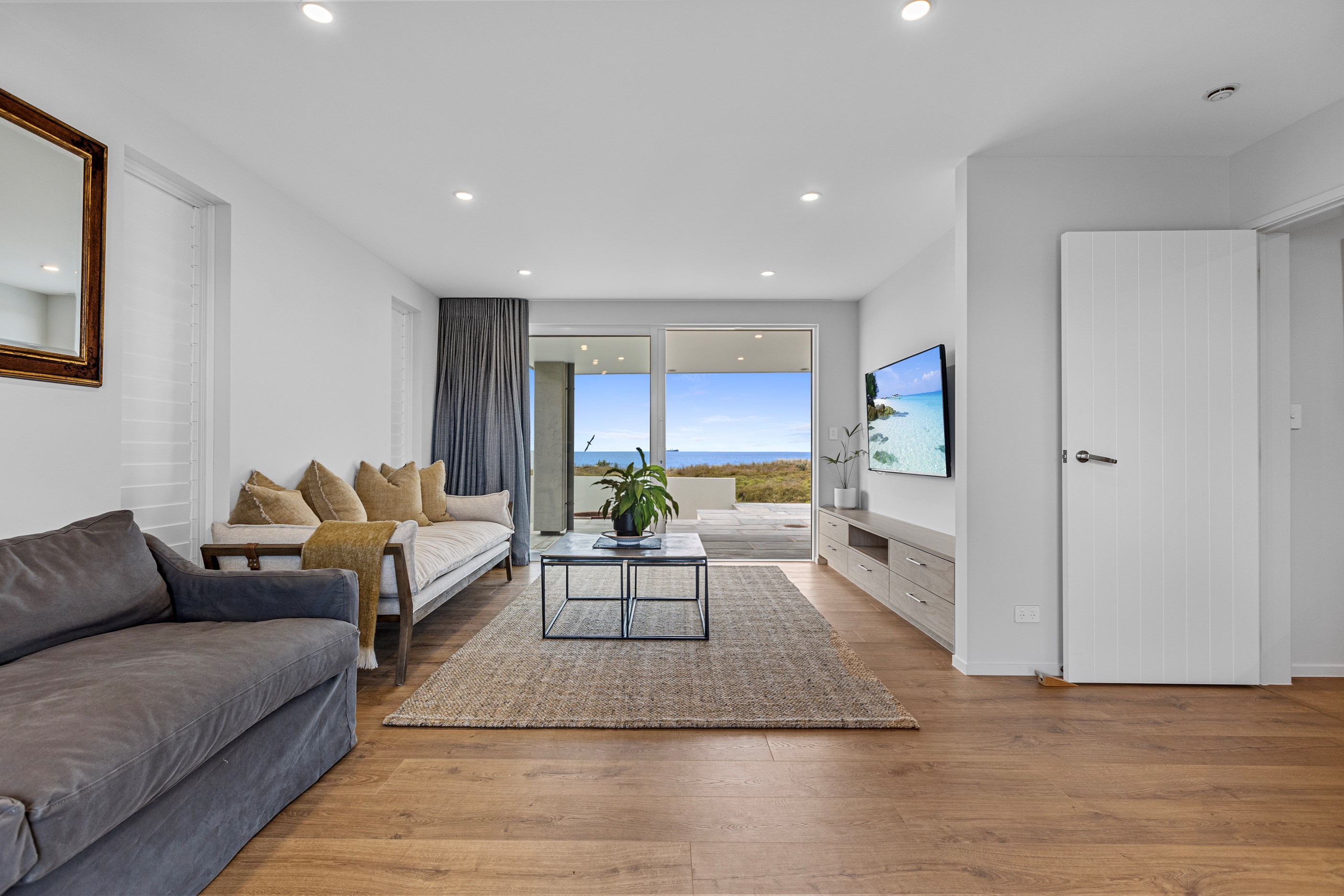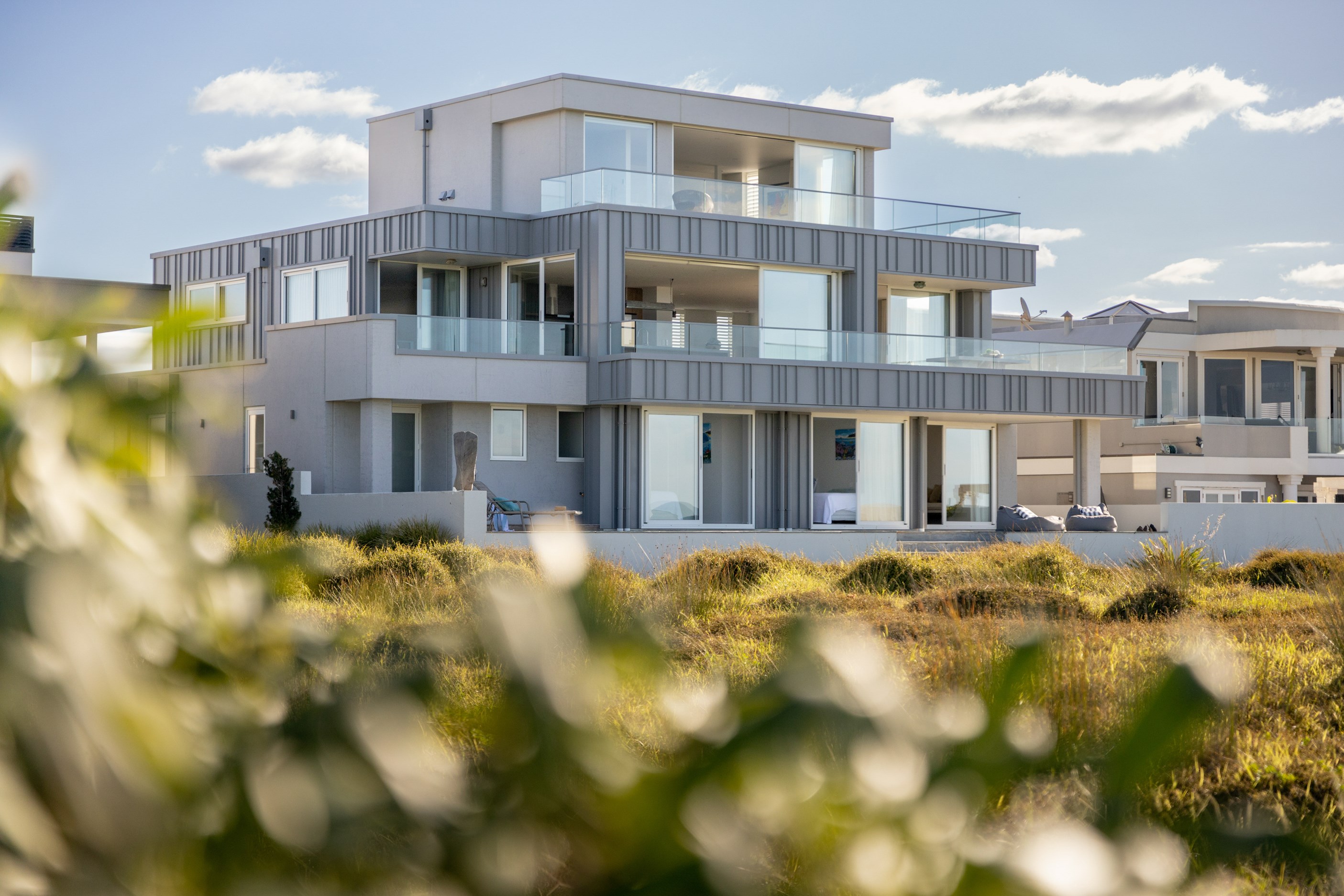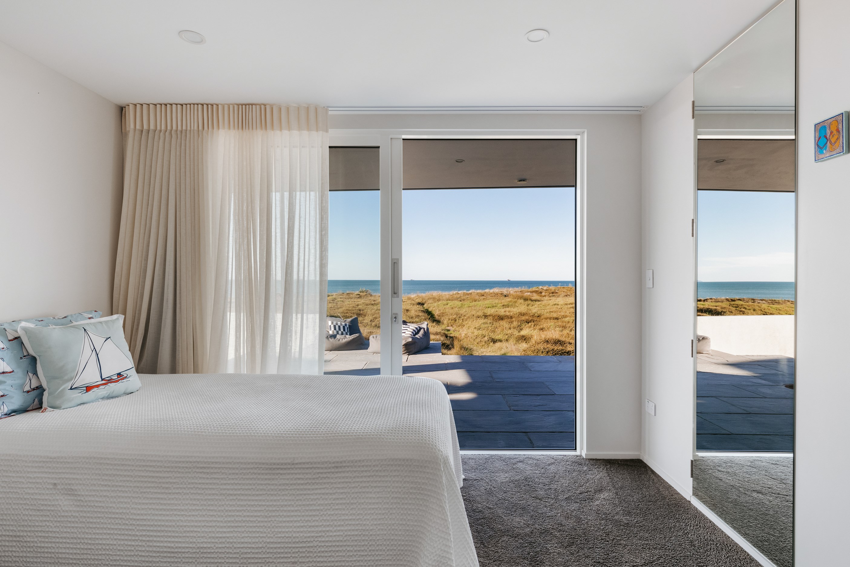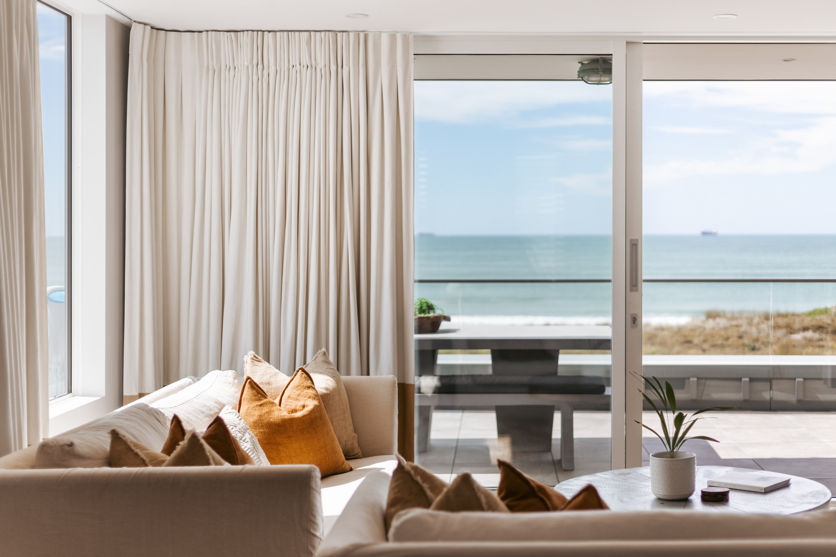 Nestling serenely among the sand dunes of Mount Maunganui beach, a high-end metamorphosis has breathed new life into a dated waterfront property that now stands as a testament to the power of restoration, craftsmanship and innovative design. The ambitious project has infused modern aesthetics into every facet of the residence, including reshaping the structure. A lowmaintenance concrete-plaster system, with the look of precast concrete panels, rejuvenates the exterior adding sophistication, robustness and timeless appeal. Vertical rolled-seam trays, arranged in a captivating pattern, add contrast and texture. Making the most of the panoramic coastal views, all interior spaces have been opened up for comfortable living, with swathes of glass doors allowing the indoors to seamlessly integrate with the outdoors and the ocean beyond.