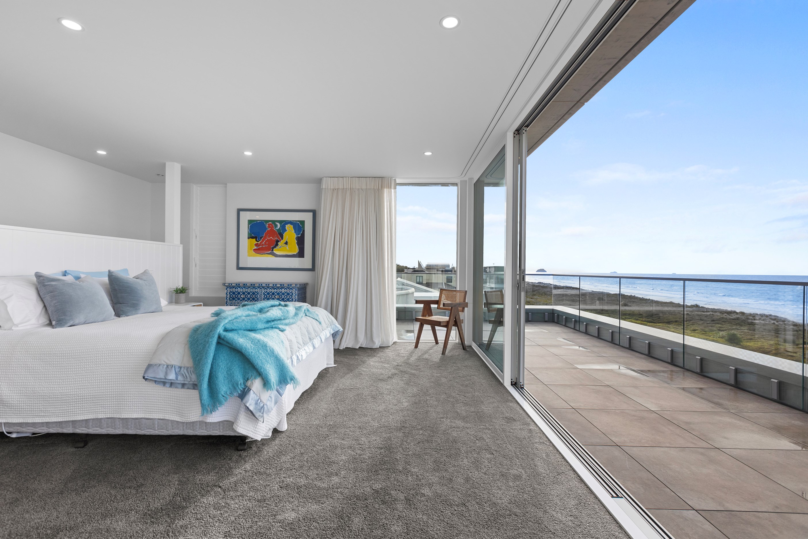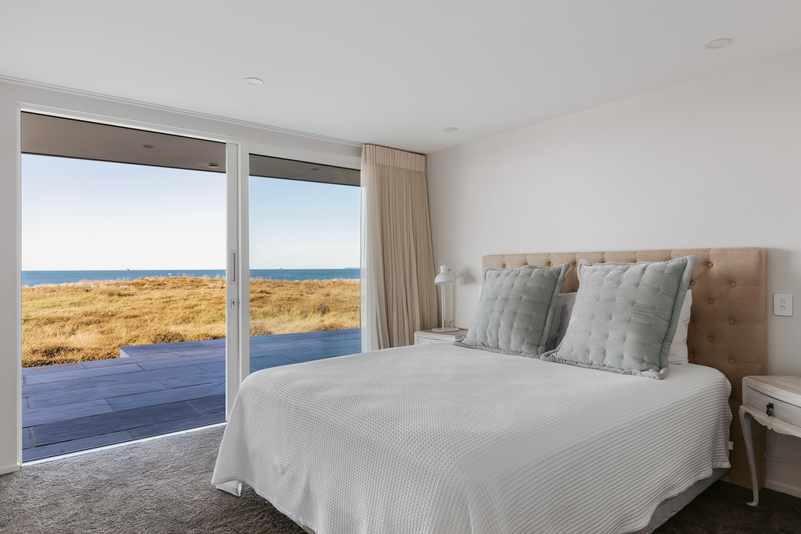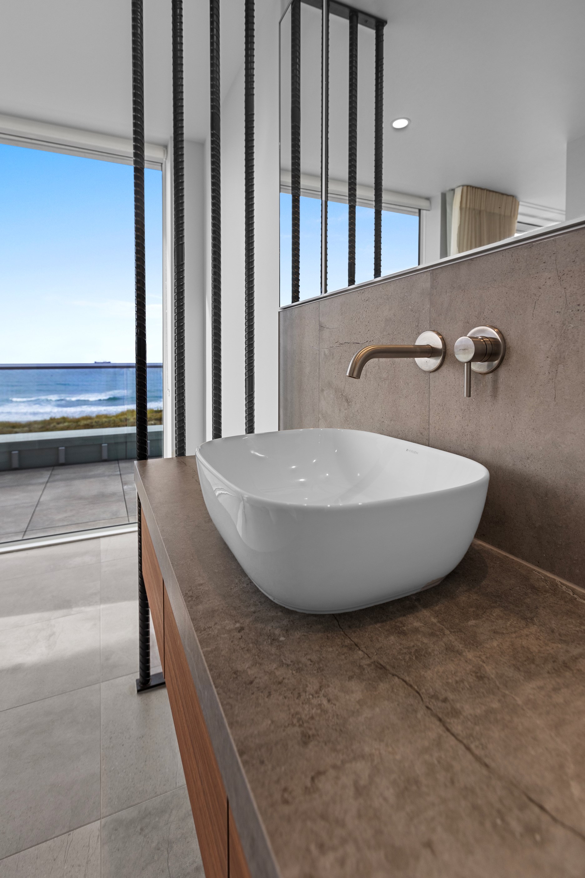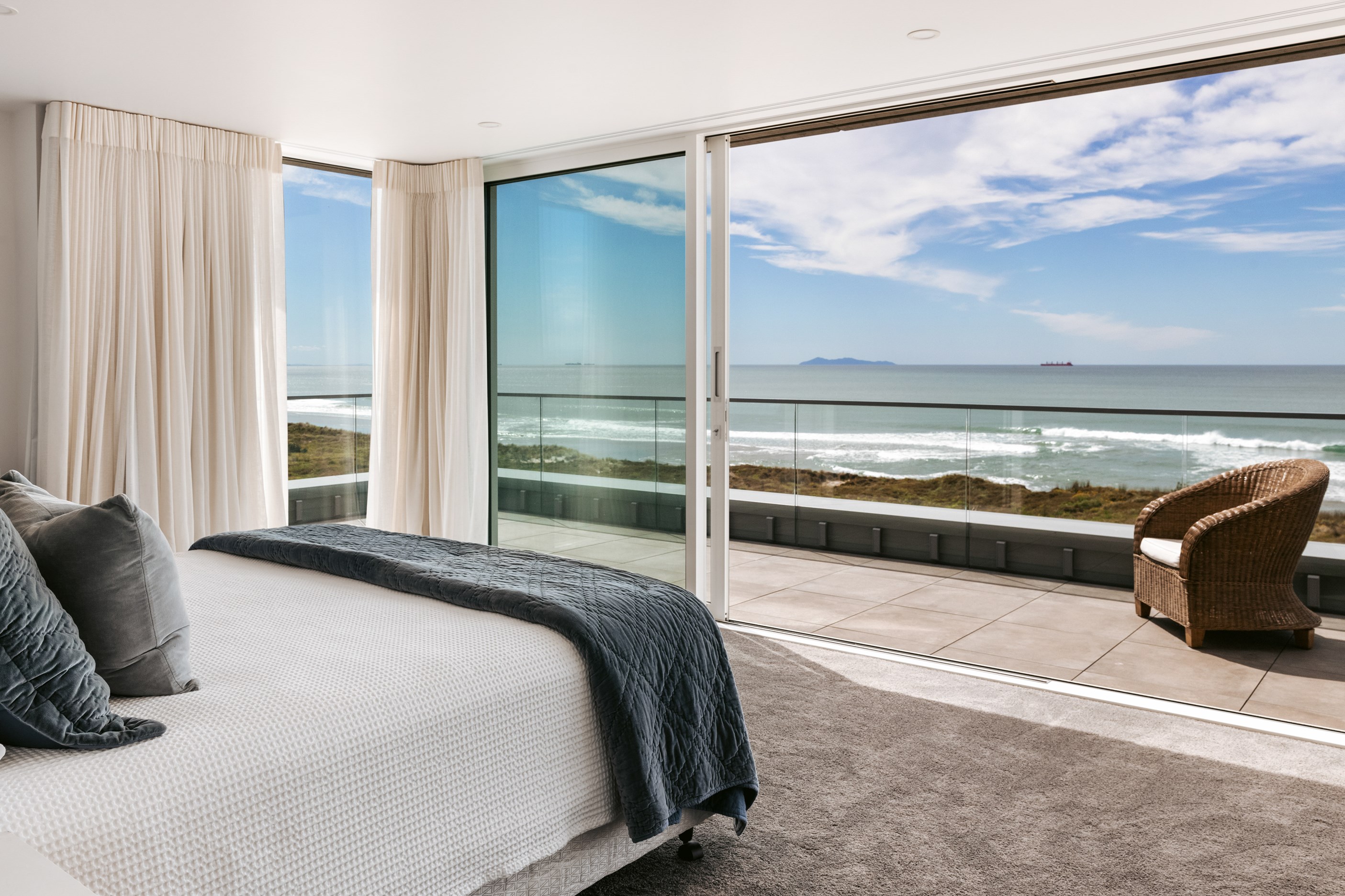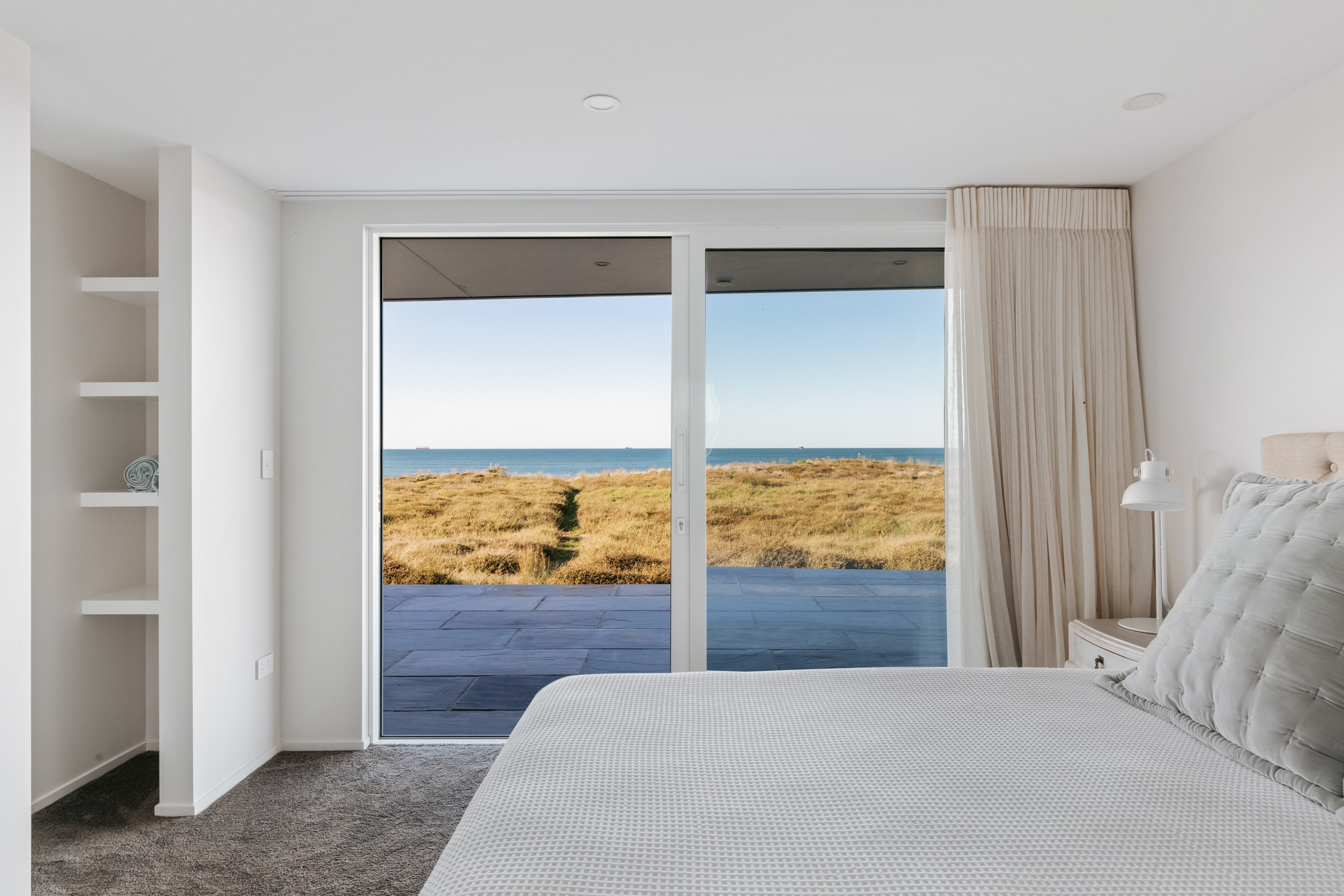 Nestling serenely among the sand dunes of Mount Maunganui beach, a high-end metamorphosis has breathed new life into a dated waterfront property that now stands as a testament to the power of restoration, craftsmanship and innovative design. The ambitious project has infused modern aesthetics into every facet of the residence, including reshaping the structure. A lowmaintenance concrete-plaster system, with the look of precast concrete panels, rejuvenates the exterior adding sophistication, robustness and timeless appeal. Vertical rolled-seam trays, arranged in a captivating pattern, add contrast and texture. Making the most of the panoramic coastal views, all interior spaces have been opened up for comfortable living, with swathes of glass doors allowing the indoors to seamlessly integrate with the outdoors and the ocean beyond.