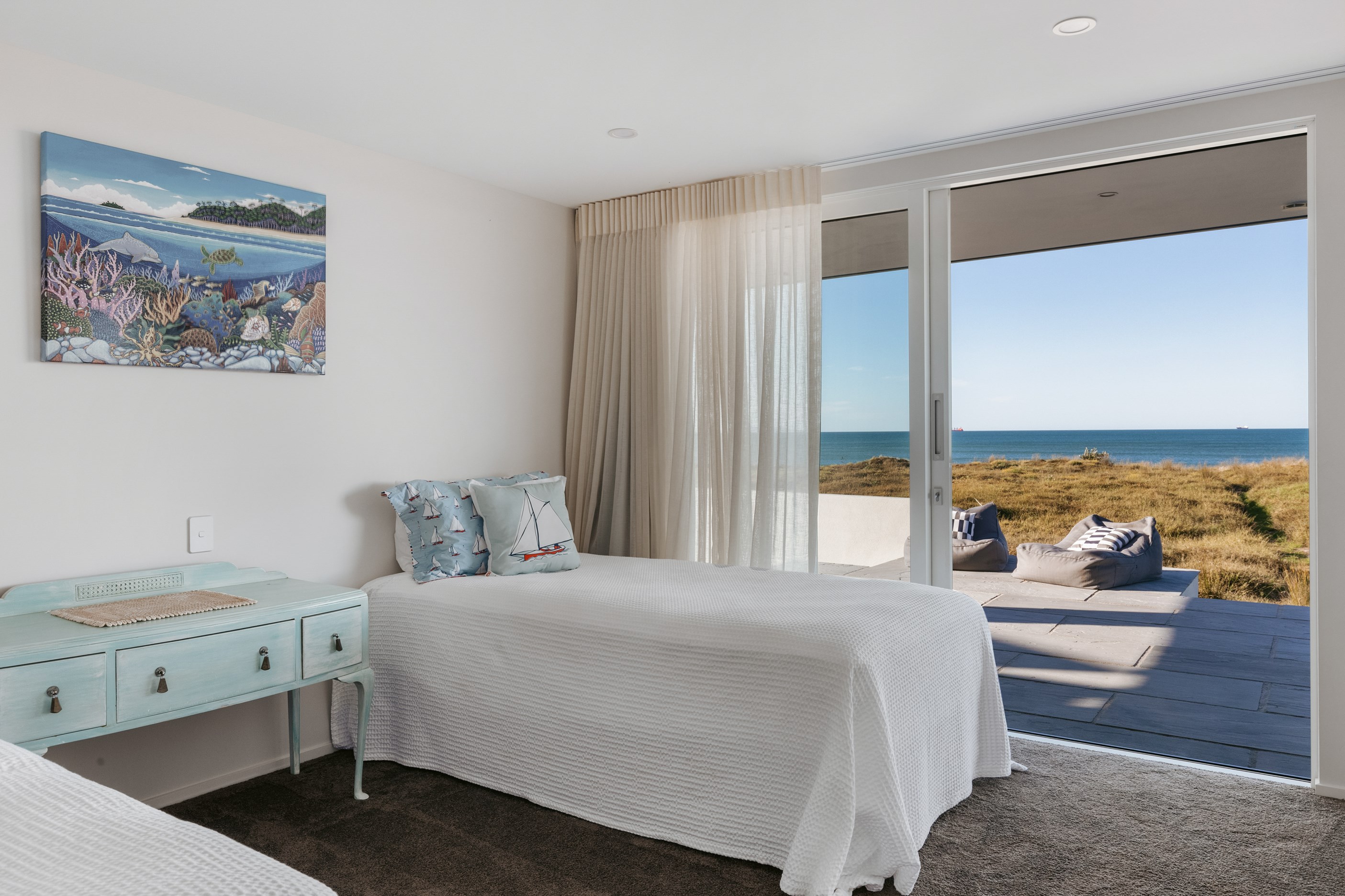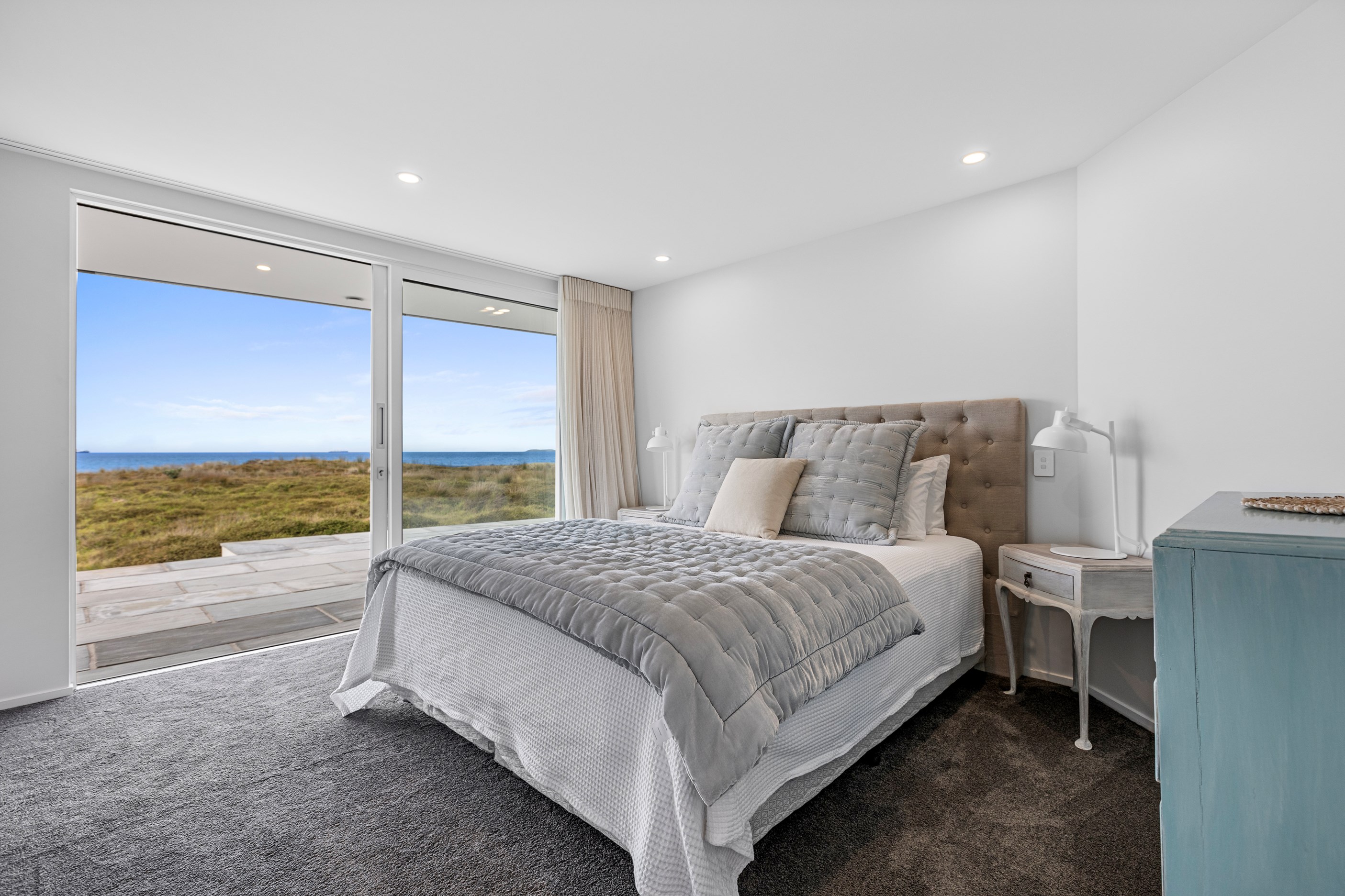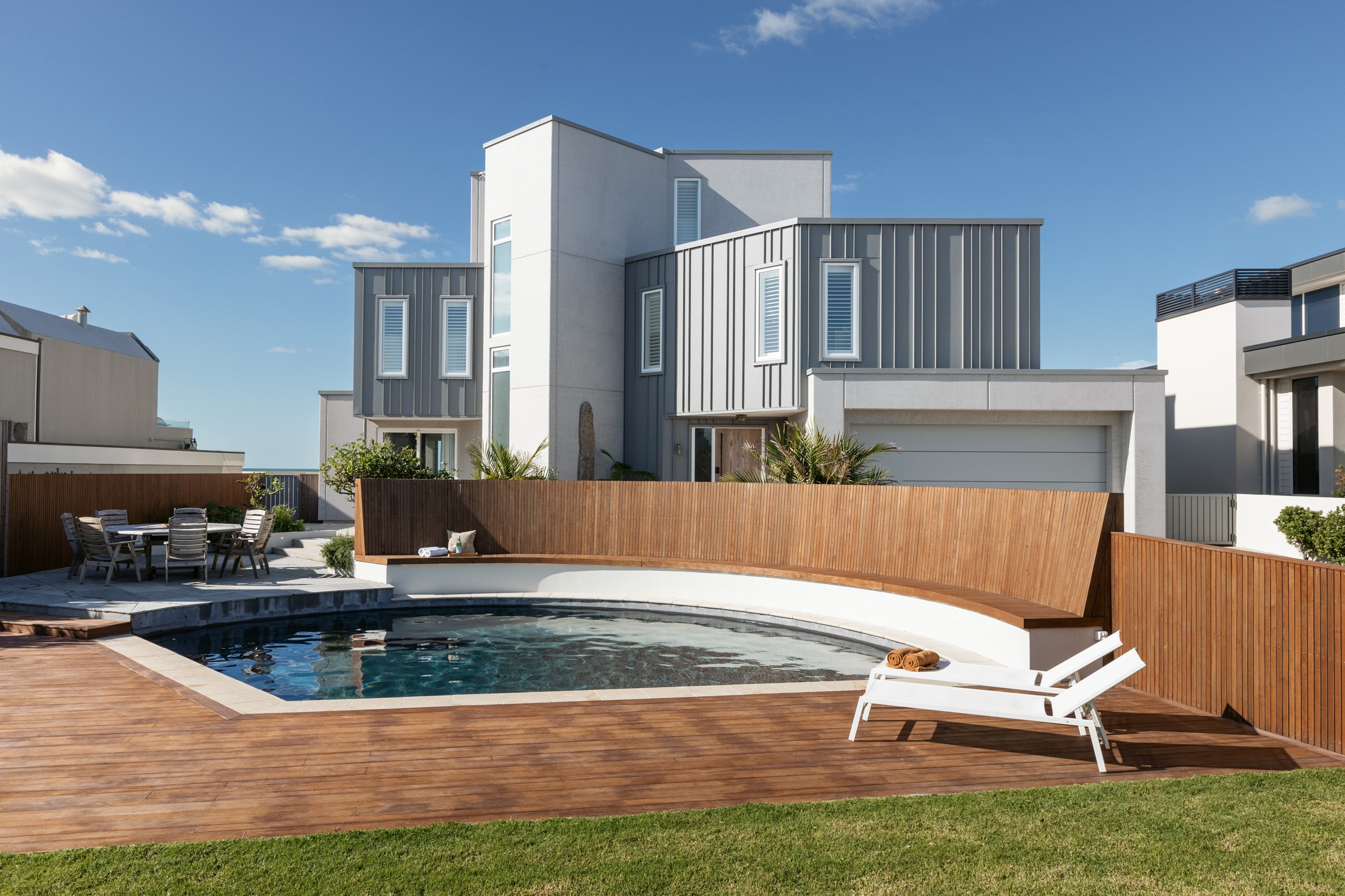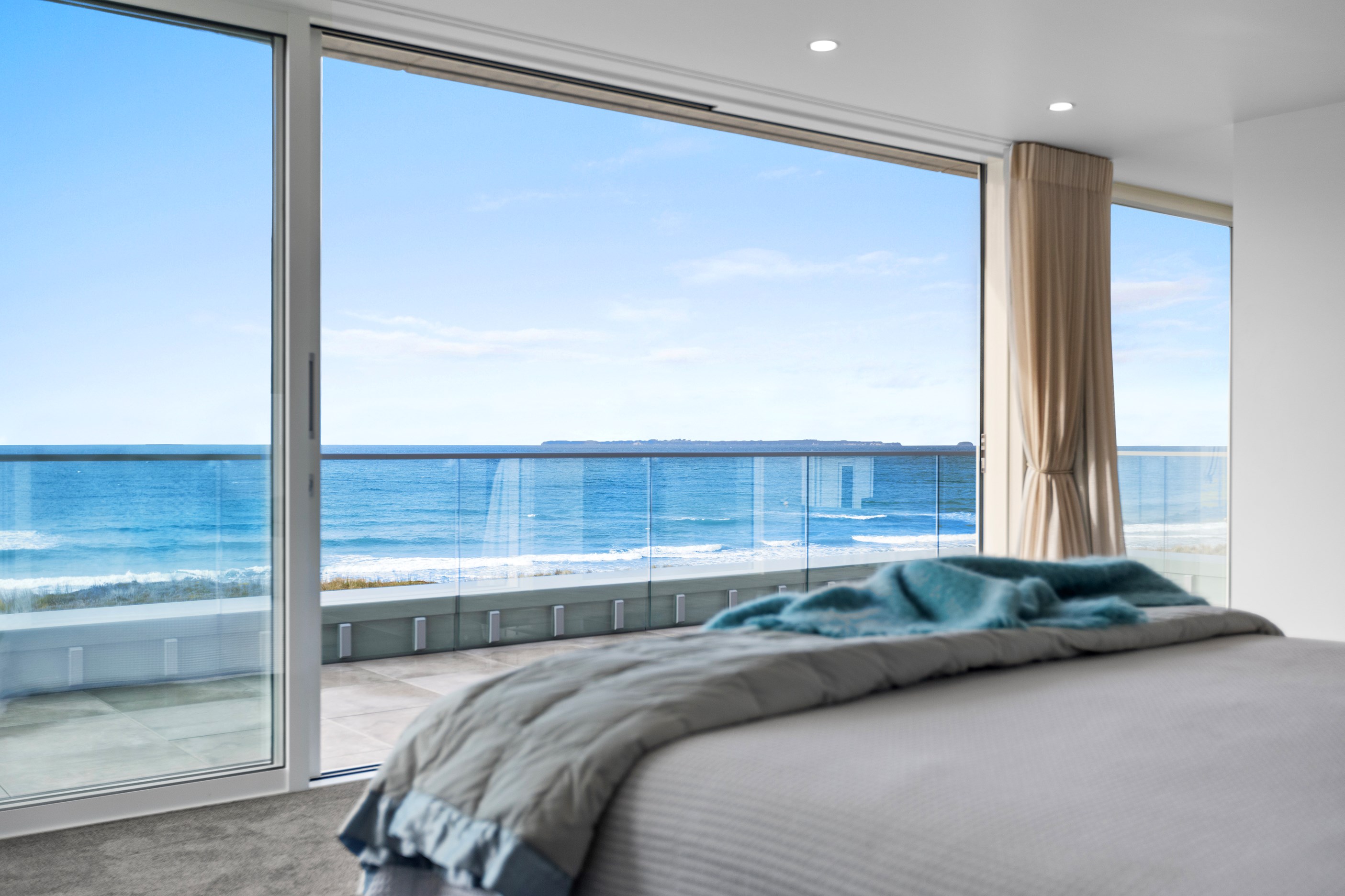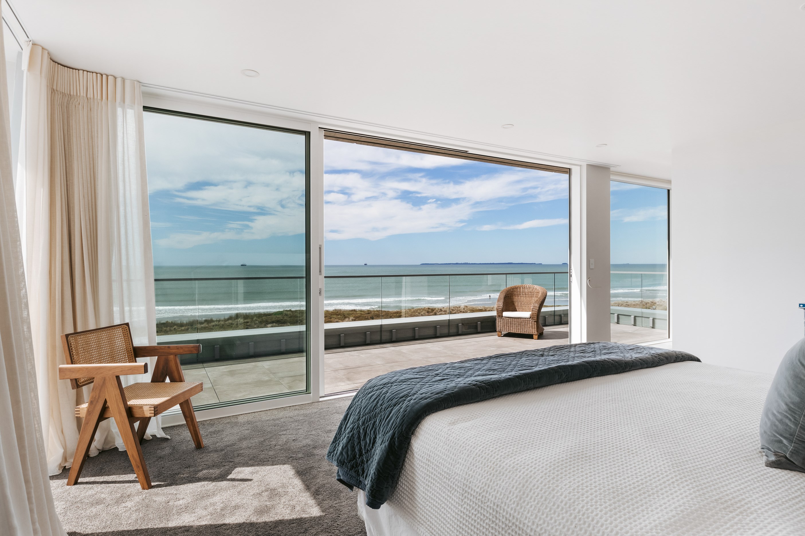 Nestling serenely among the sand dunes of Mount Maunganui beach, a high-end metamorphosis has breathed new life into a dated waterfront property that now stands as a testament to the power of restoration, craftsmanship and innovative design. The ambitious project has infused modern aesthetics into every facet of the residence, including reshaping the structure. A lowmaintenance concrete-plaster system, with the look of precast concrete panels, rejuvenates the exterior adding sophistication, robustness and timeless appeal. Vertical rolled-seam trays, arranged in a captivating pattern, add contrast and texture. Making the most of the panoramic coastal views, all interior spaces have been opened up for comfortable living, with swathes of glass doors allowing the indoors to seamlessly integrate with the outdoors and the ocean beyond.