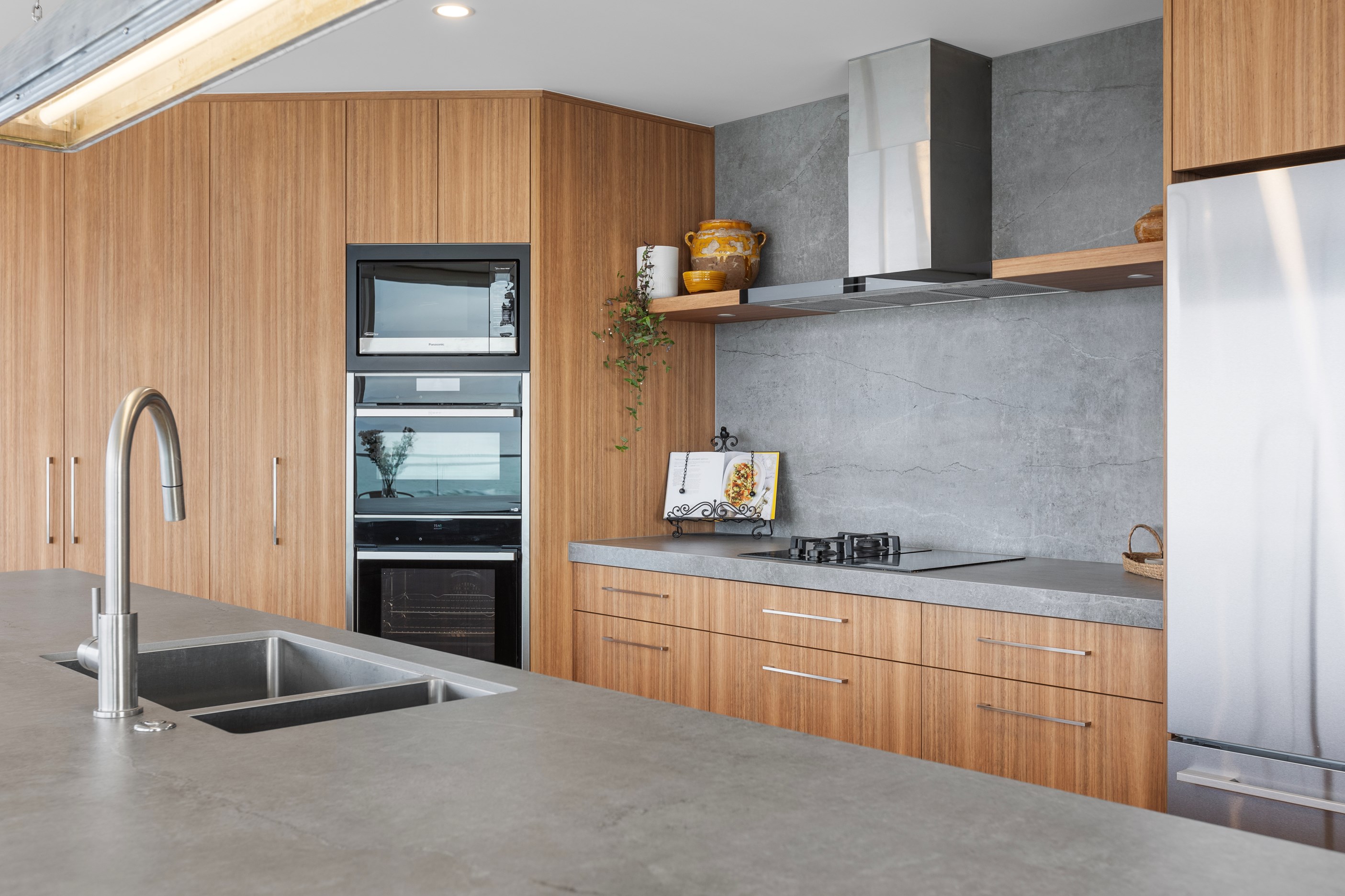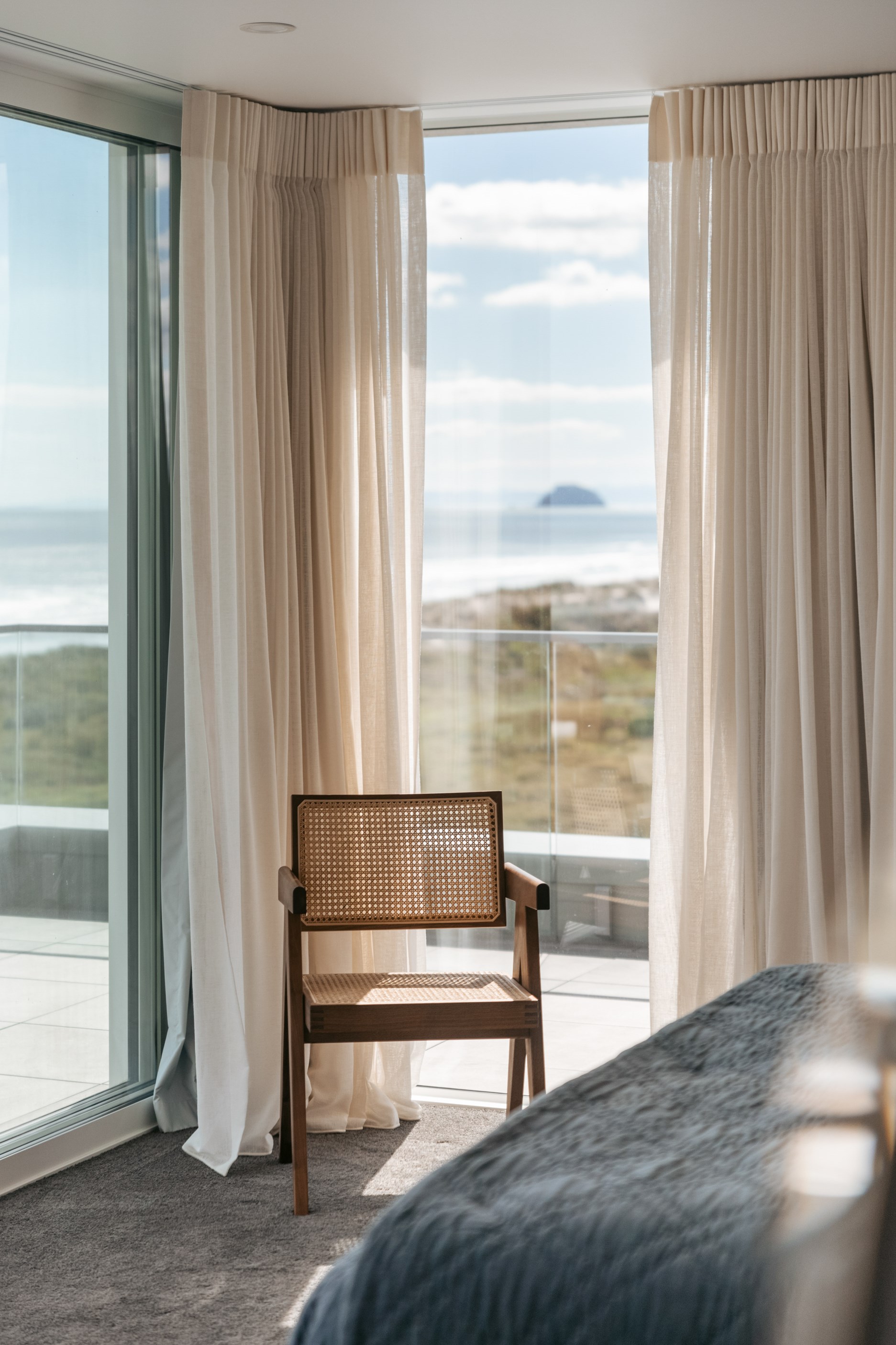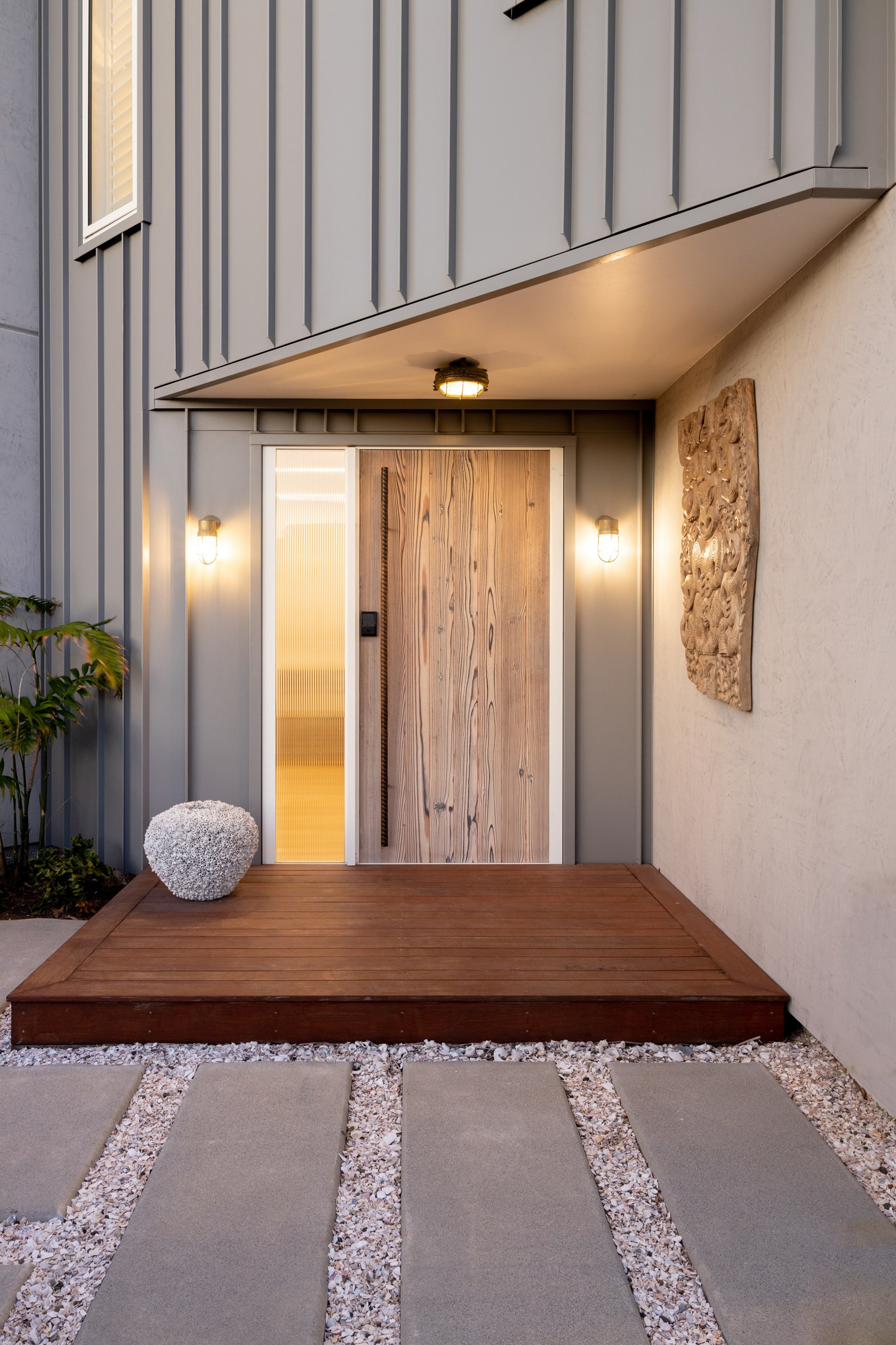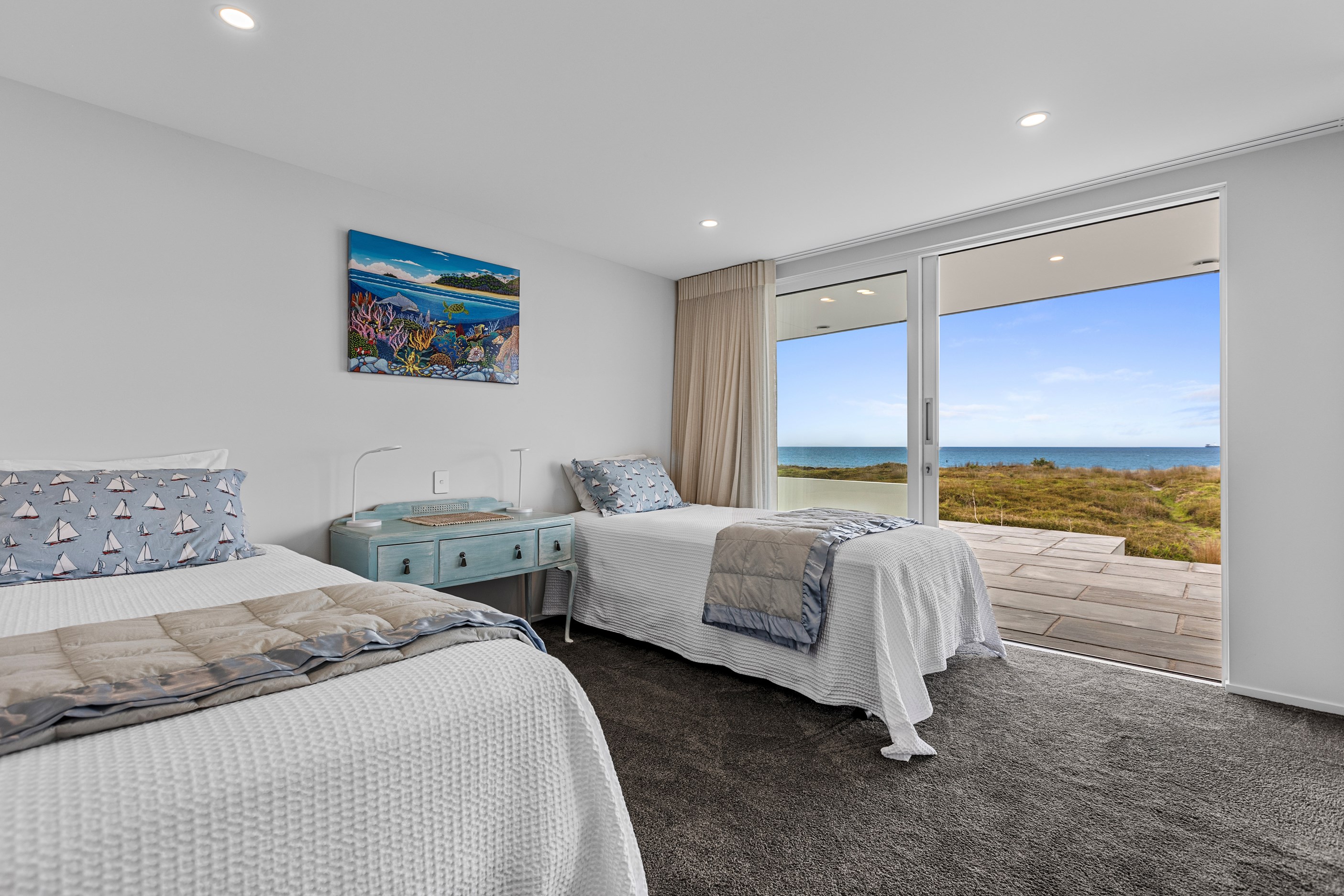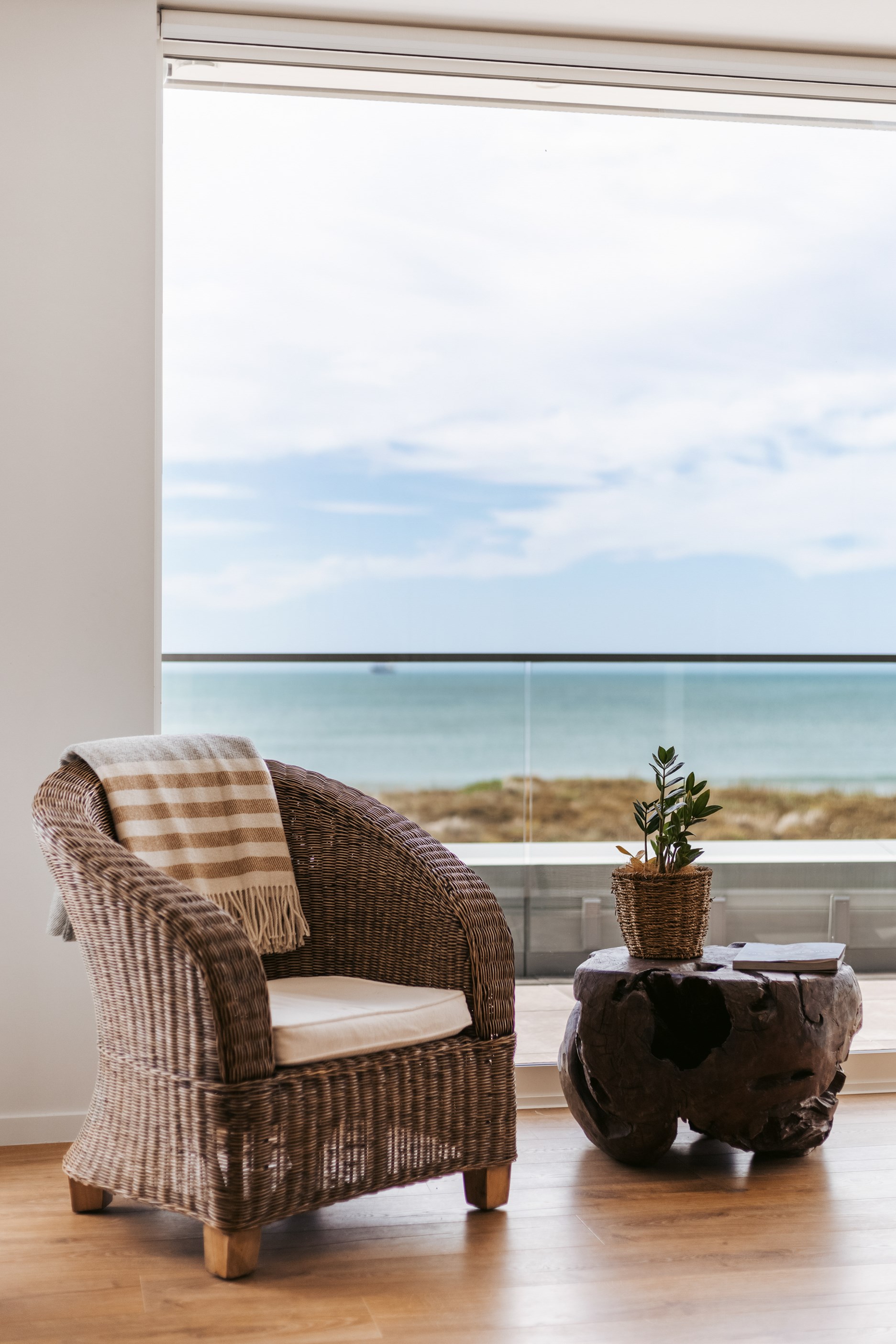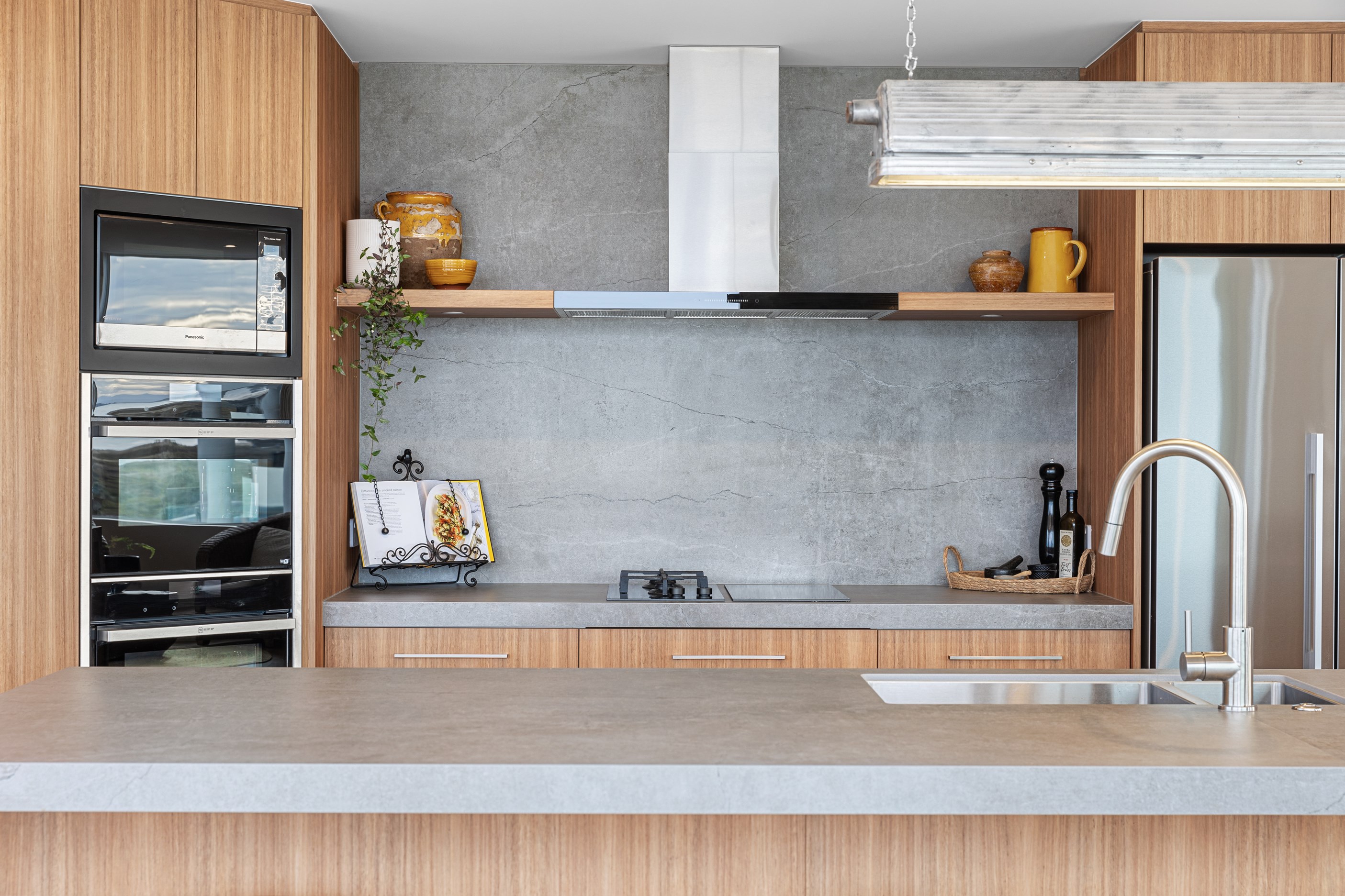 Nestling serenely among the sand dunes of Mount Maunganui beach, a high-end metamorphosis has breathed new life into a dated waterfront property that now stands as a testament to the power of restoration, craftsmanship and innovative design. The ambitious project has infused modern aesthetics into every facet of the residence, including reshaping the structure. A lowmaintenance concrete-plaster system, with the look of precast concrete panels, rejuvenates the exterior adding sophistication, robustness and timeless appeal. Vertical rolled-seam trays, arranged in a captivating pattern, add contrast and texture. Making the most of the panoramic coastal views, all interior spaces have been opened up for comfortable living, with swathes of glass doors allowing the indoors to seamlessly integrate with the outdoors and the ocean beyond.