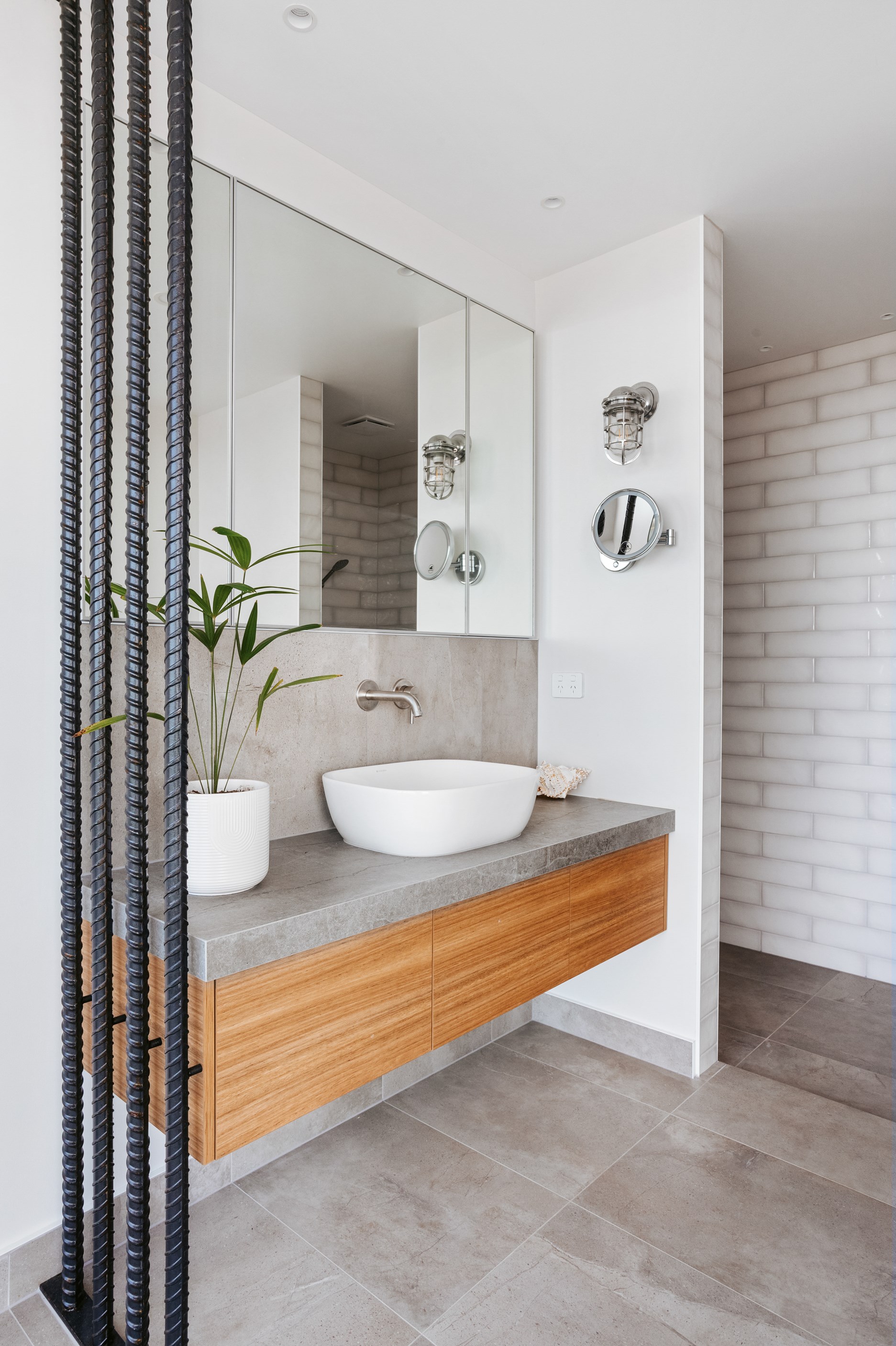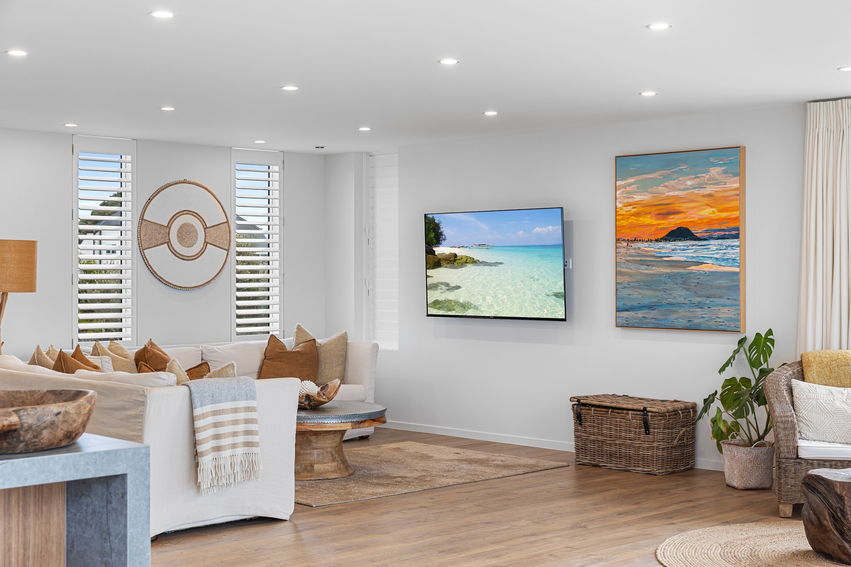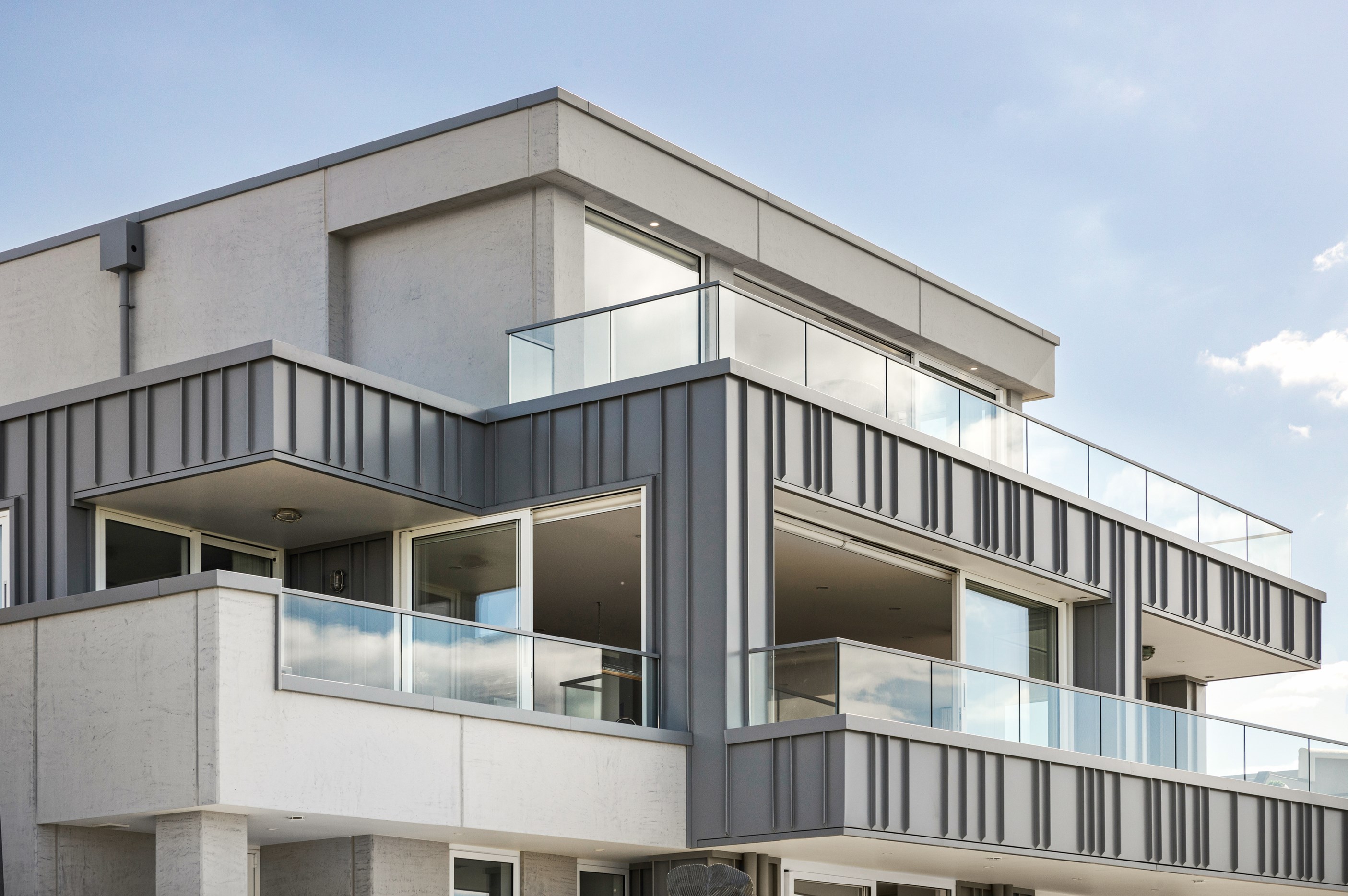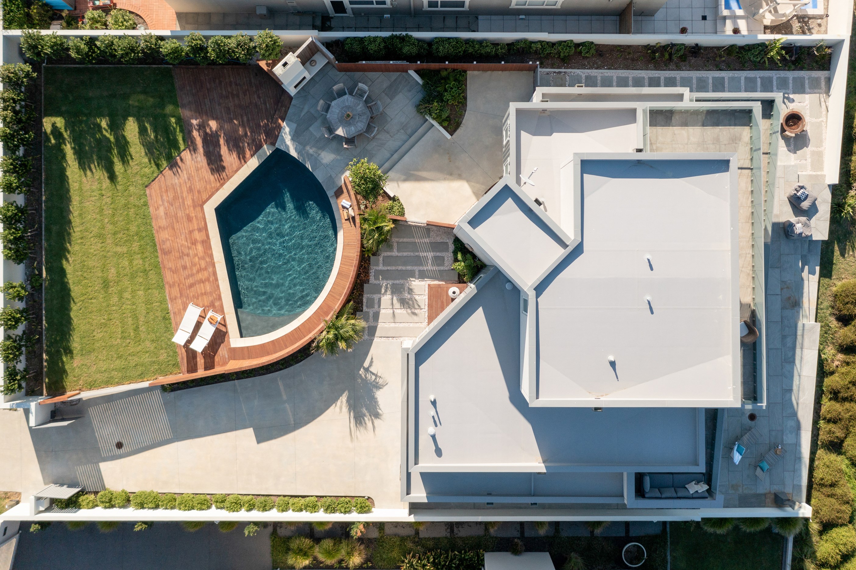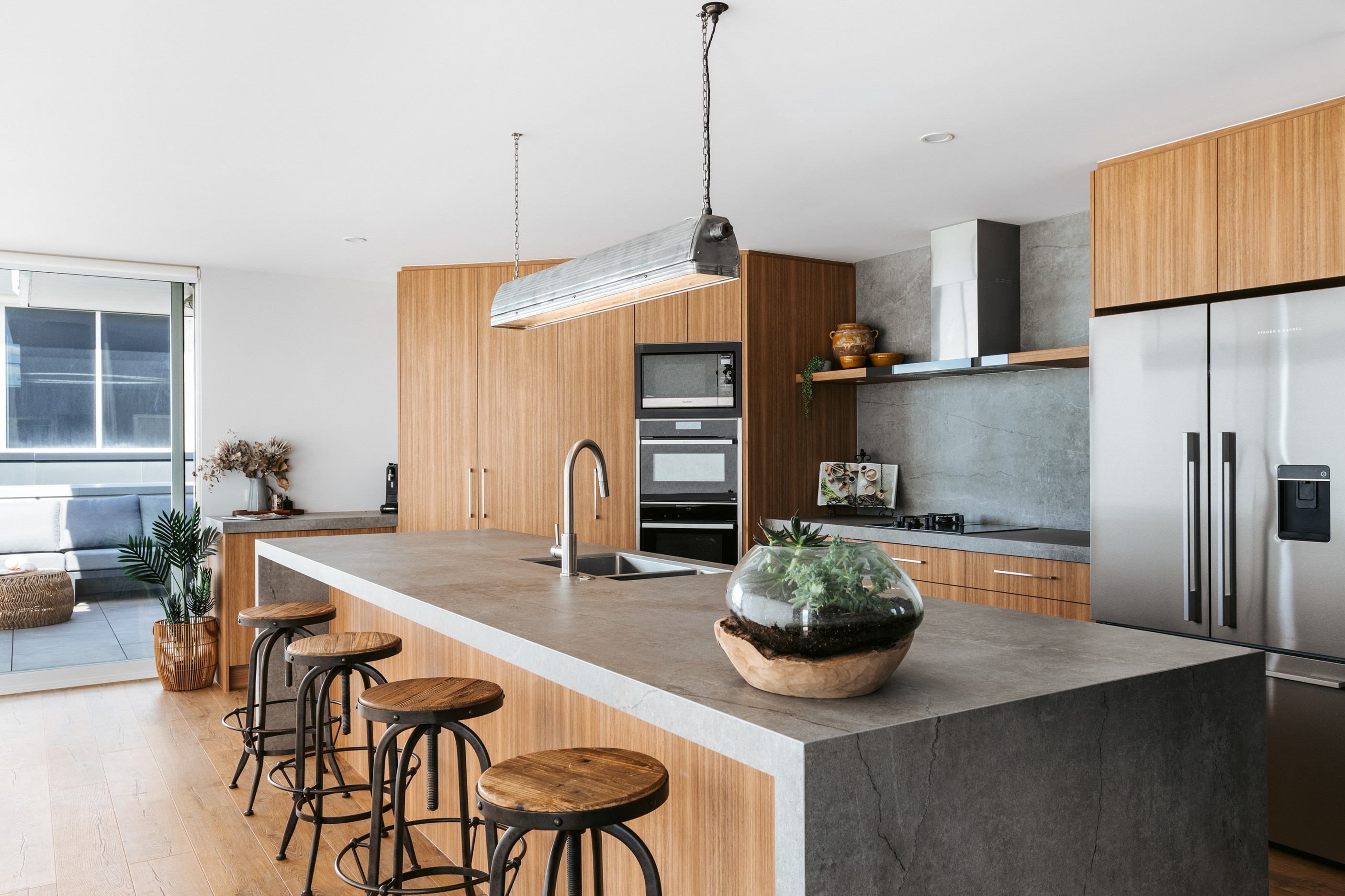 Nestling serenely among the sand dunes of Mount Maunganui beach, a high-end metamorphosis has breathed new life into a dated waterfront property that now stands as a testament to the power of restoration, craftsmanship and innovative design. The ambitious project has infused modern aesthetics into every facet of the residence, including reshaping the structure. A lowmaintenance concrete-plaster system, with the look of precast concrete panels, rejuvenates the exterior adding sophistication, robustness and timeless appeal. Vertical rolled-seam trays, arranged in a captivating pattern, add contrast and texture. Making the most of the panoramic coastal views, all interior spaces have been opened up for comfortable living, with swathes of glass doors allowing the indoors to seamlessly integrate with the outdoors and the ocean beyond.