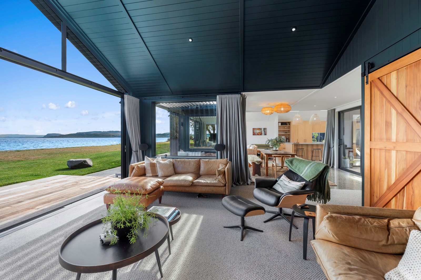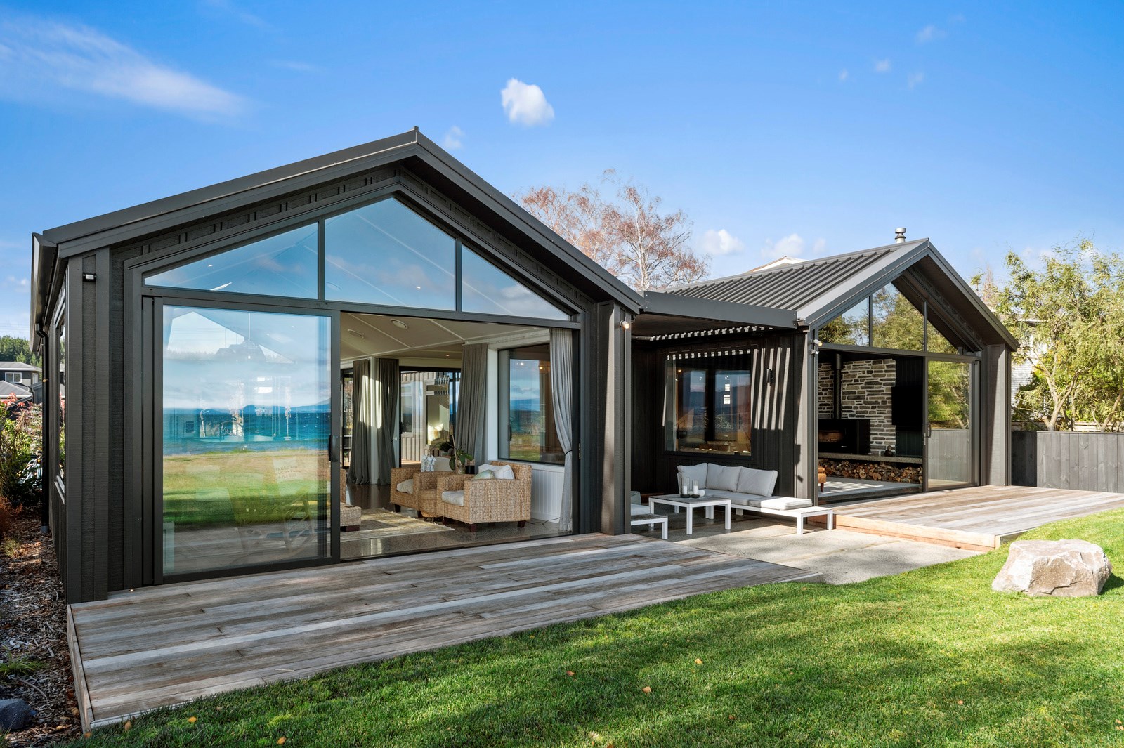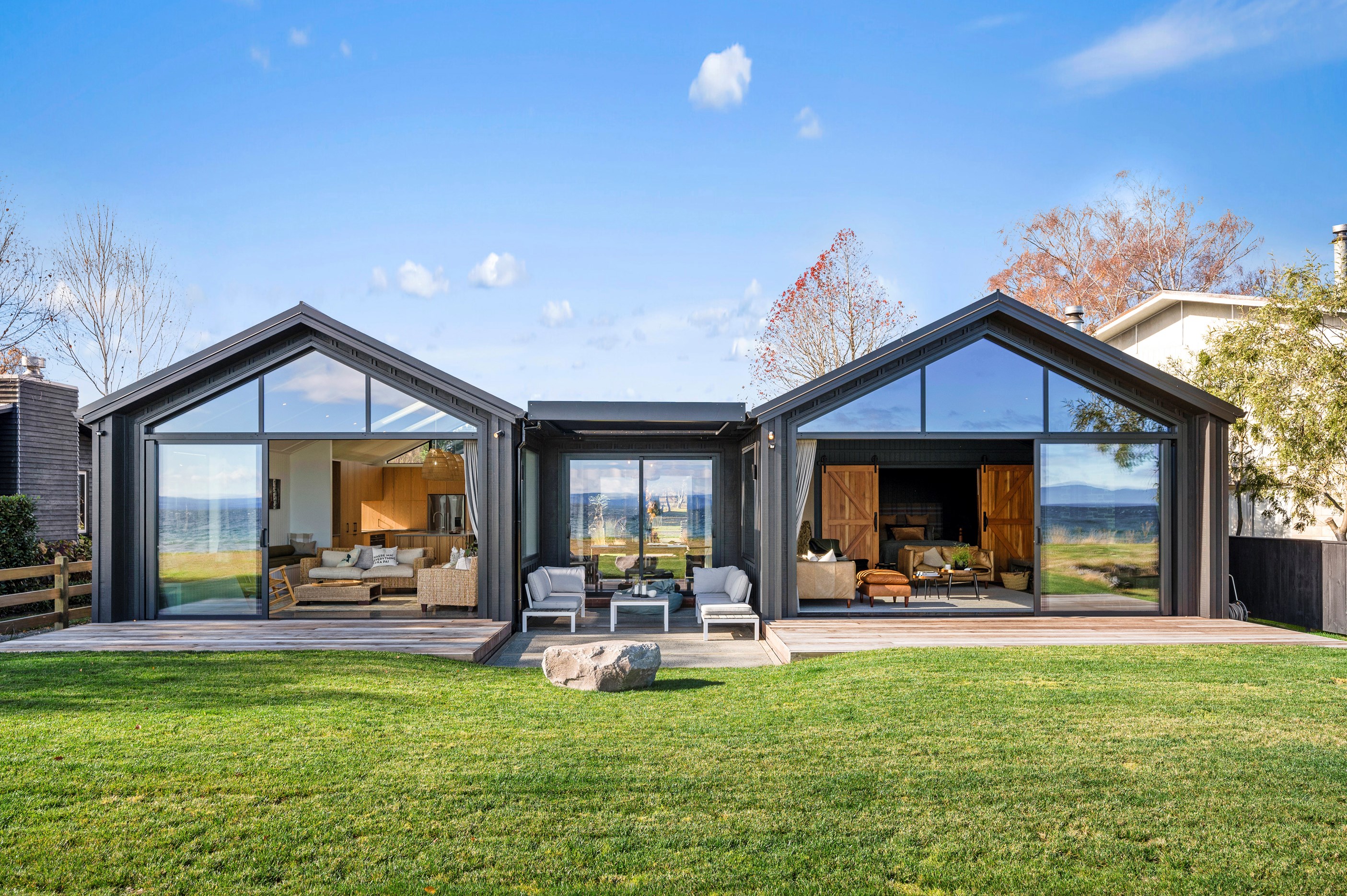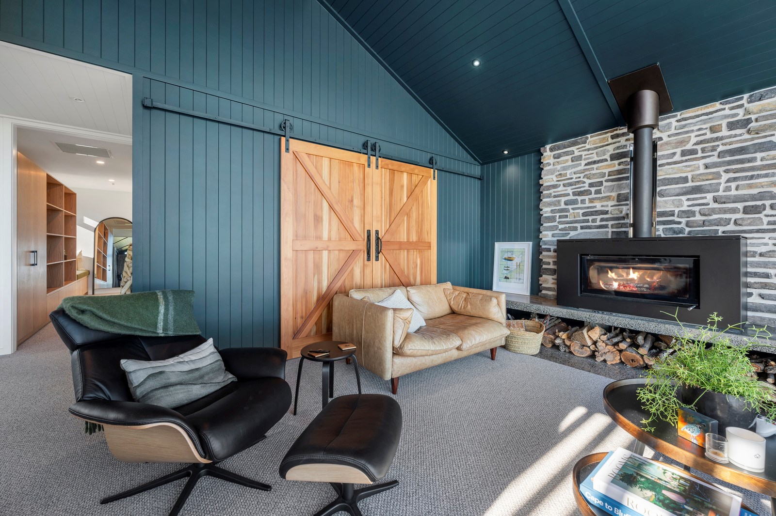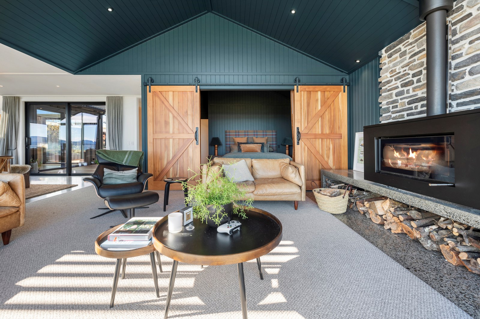 A lakefront section offering unparalleled water and mountain views and a slick designer house brimming with character features – does it get any better? It’s not every home that can marry clean lines in white and wood with rustic features such as a schist fireplace, barn-style sliding doors and dark tongue-and-groove-style walls, but this 276sqm house manages it with aplomb. It’s divine. The four-bedroom home, clad in board and batten, replaced an old house and is the culmination of the owners’ 15-year dream. The existing garage was retained for sentimental reasons and has been converted into a rumpus room for the kids.