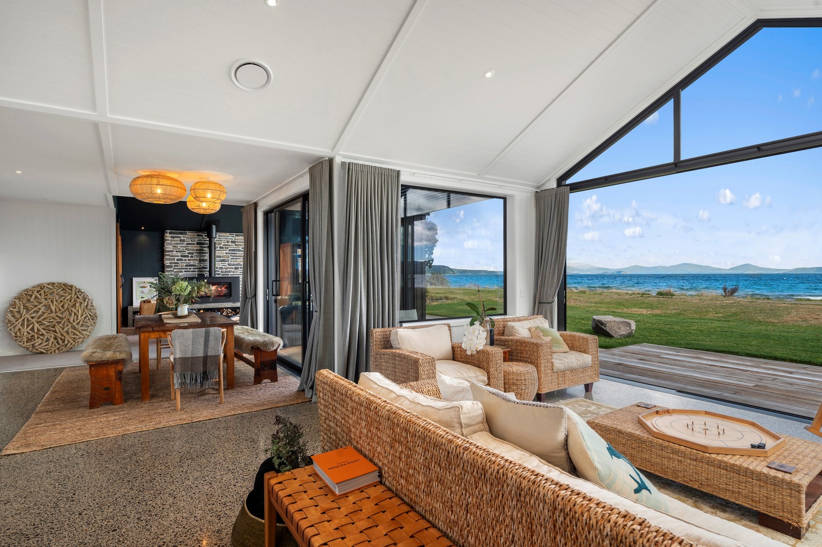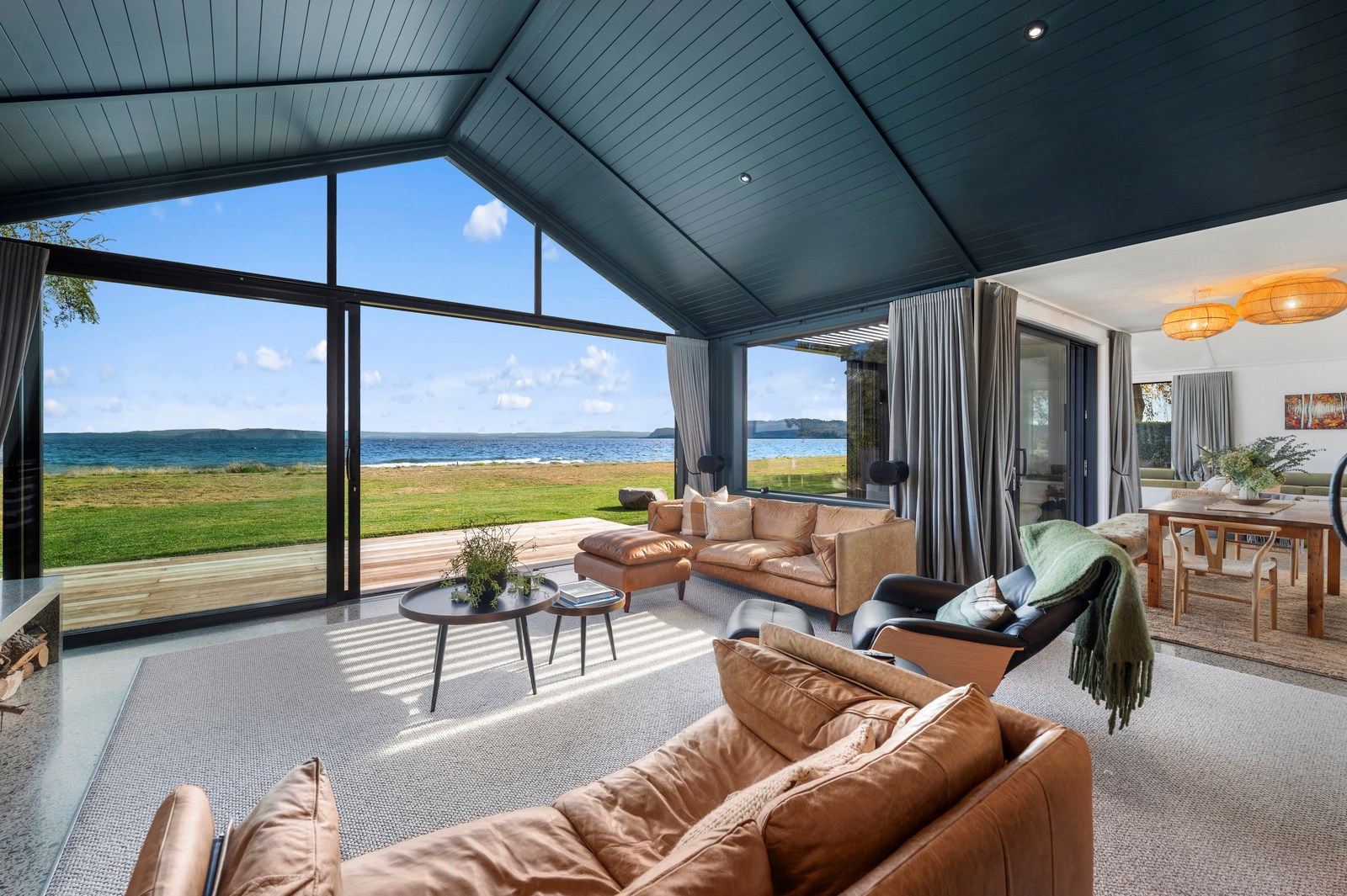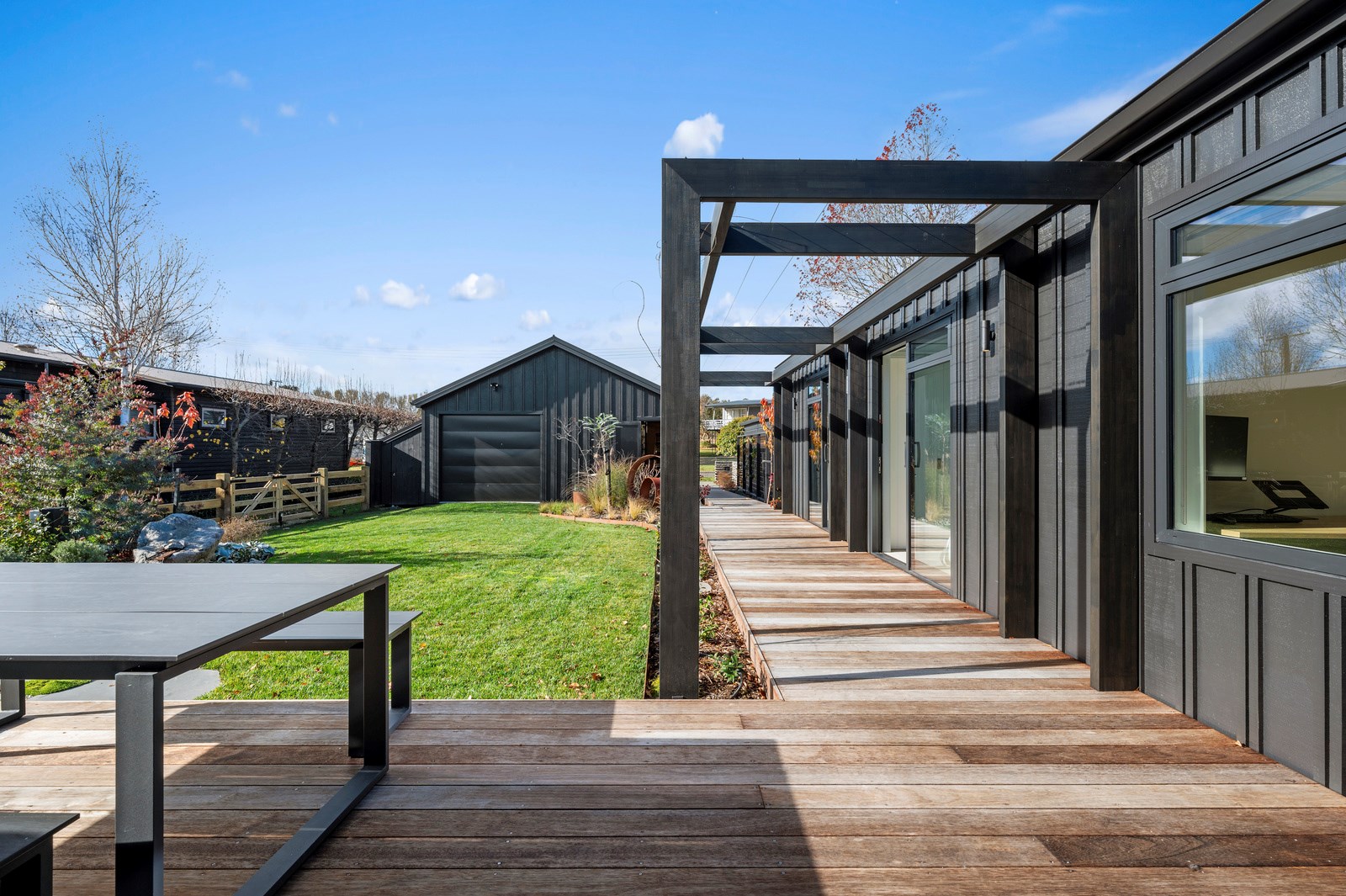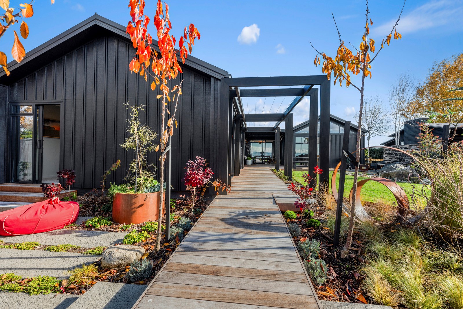 A lakefront section offering unparalleled water and mountain views and a slick designer house brimming with character features – does it get any better? It’s not every home that can marry clean lines in white and wood with rustic features such as a schist fireplace, barn-style sliding doors and dark tongue-and-groove-style walls, but this 276sqm house manages it with aplomb. It’s divine. The four-bedroom home, clad in board and batten, replaced an old house and is the culmination of the owners’ 15-year dream. The existing garage was retained for sentimental reasons and has been converted into a rumpus room for the kids.