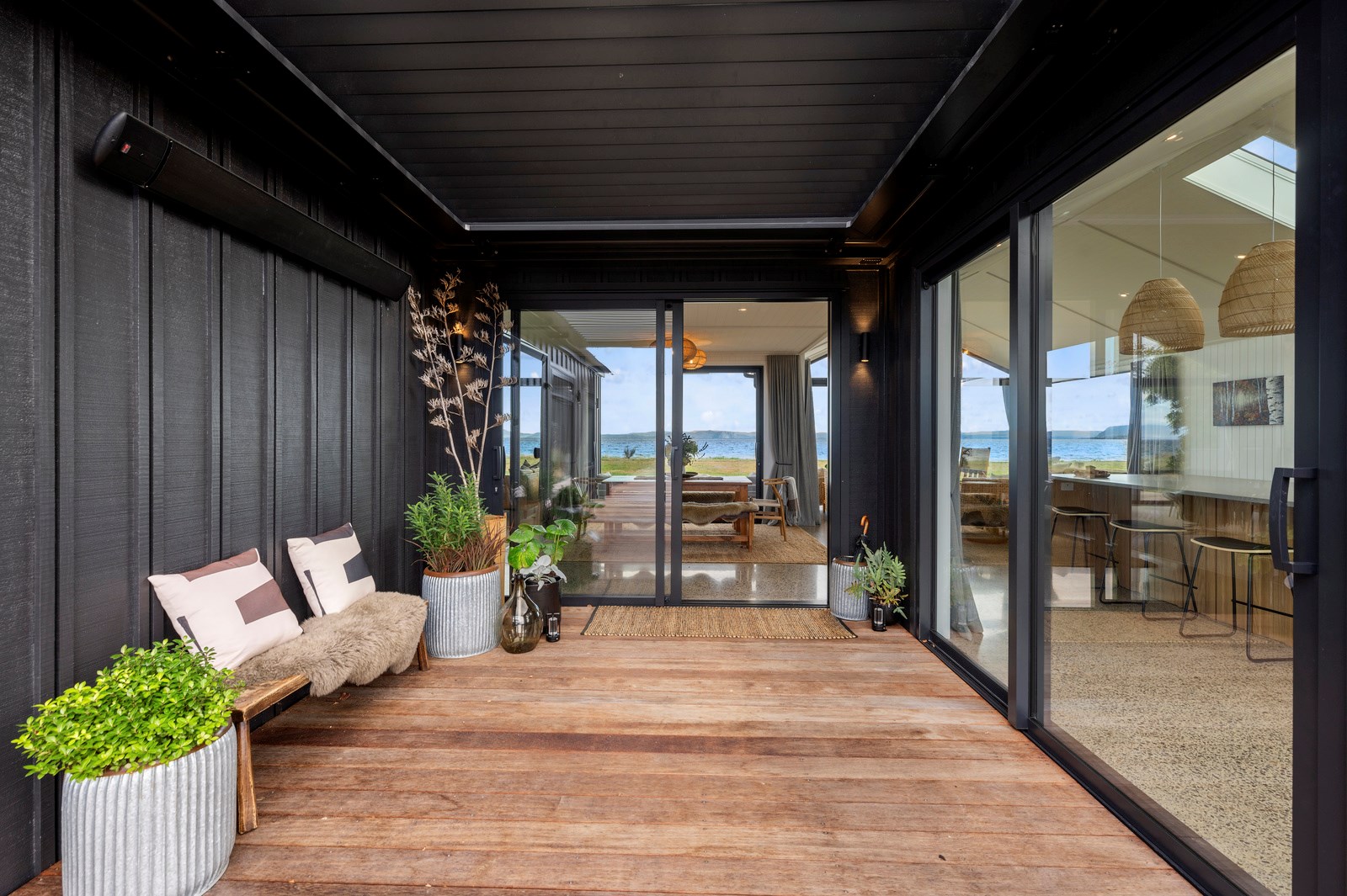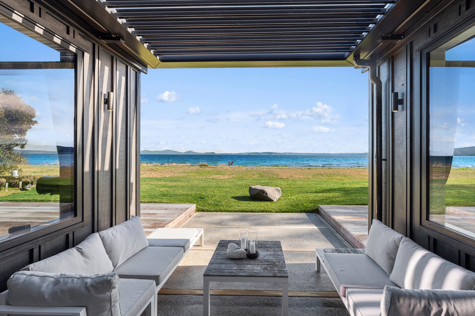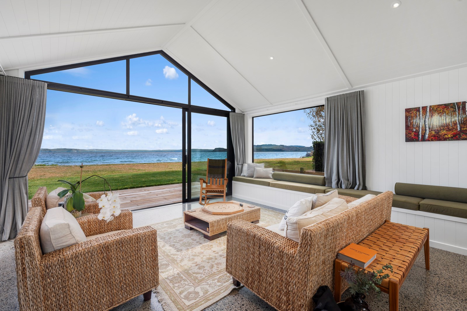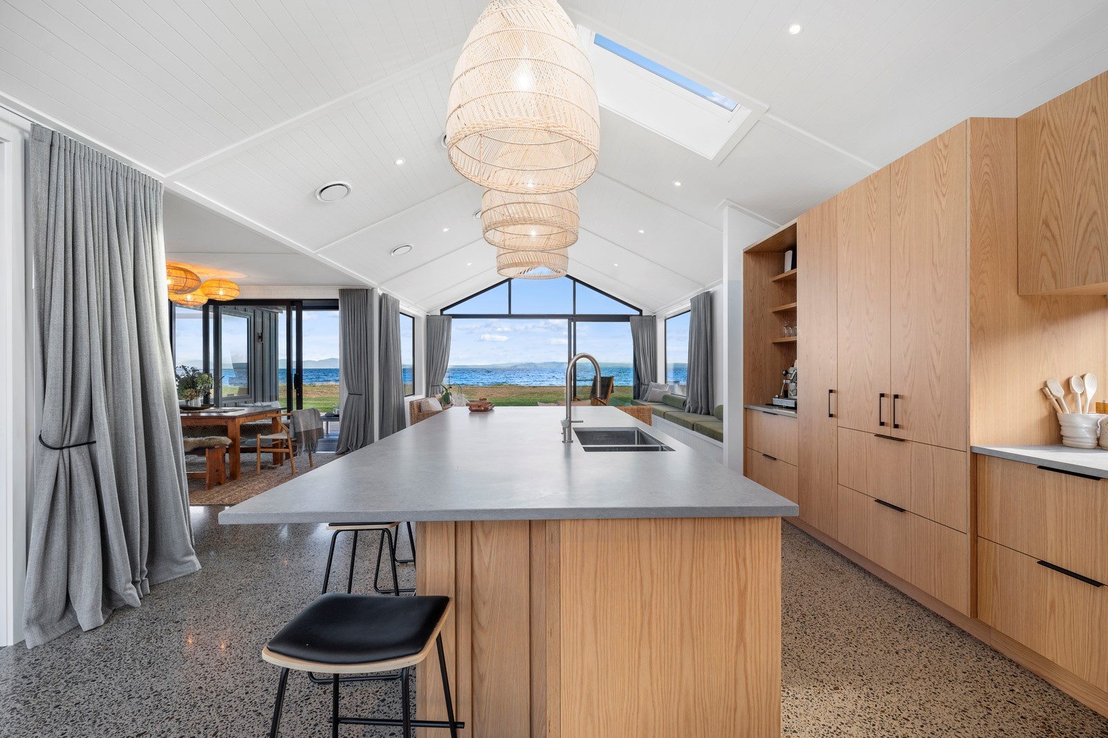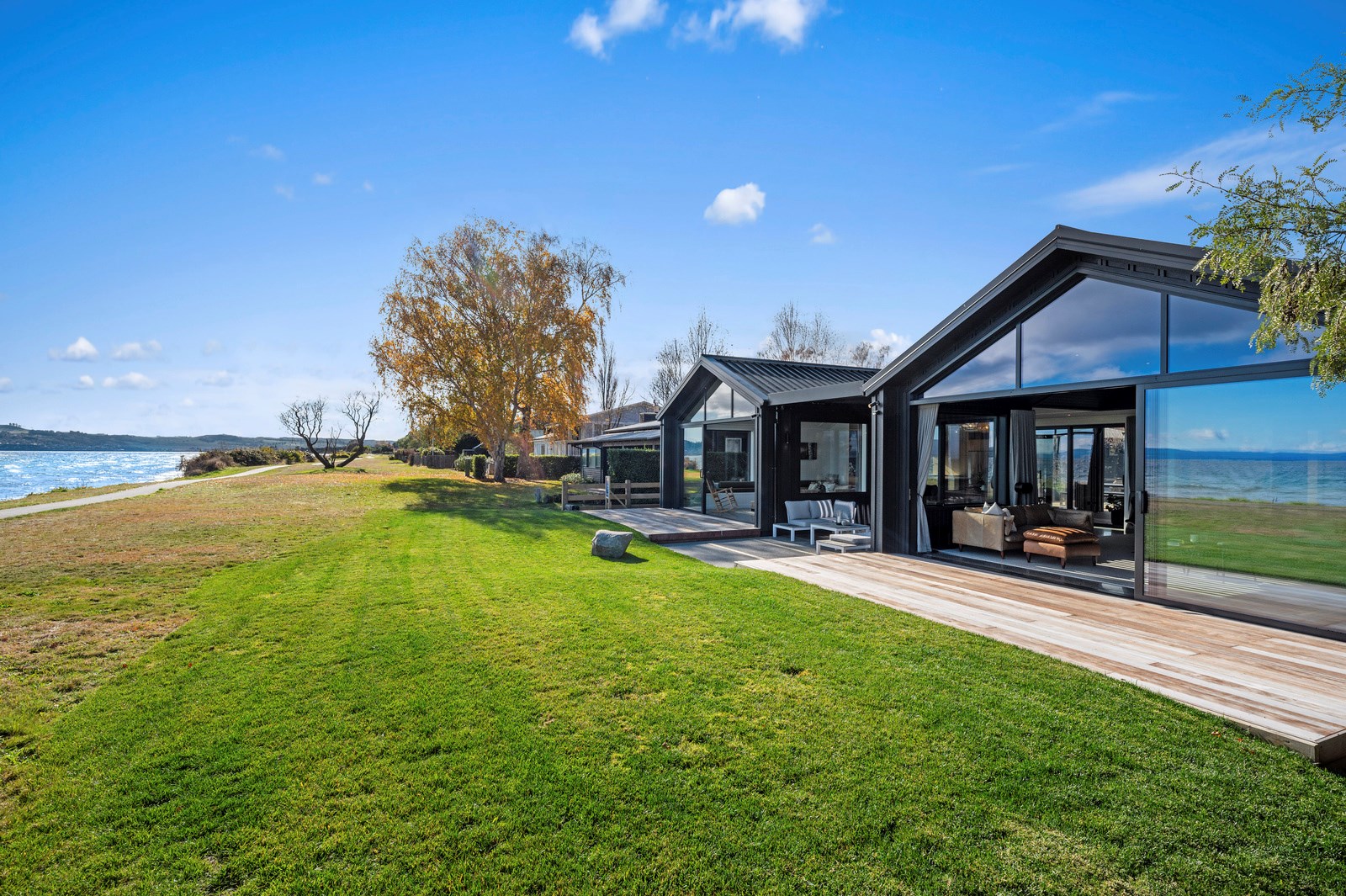 A lakefront section offering unparalleled water and mountain views and a slick designer house brimming with character features – does it get any better? It’s not every home that can marry clean lines in white and wood with rustic features such as a schist fireplace, barn-style sliding doors and dark tongue-and-groove-style walls, but this 276sqm house manages it with aplomb. It’s divine. The four-bedroom home, clad in board and batten, replaced an old house and is the culmination of the owners’ 15-year dream. The existing garage was retained for sentimental reasons and has been converted into a rumpus room for the kids.
