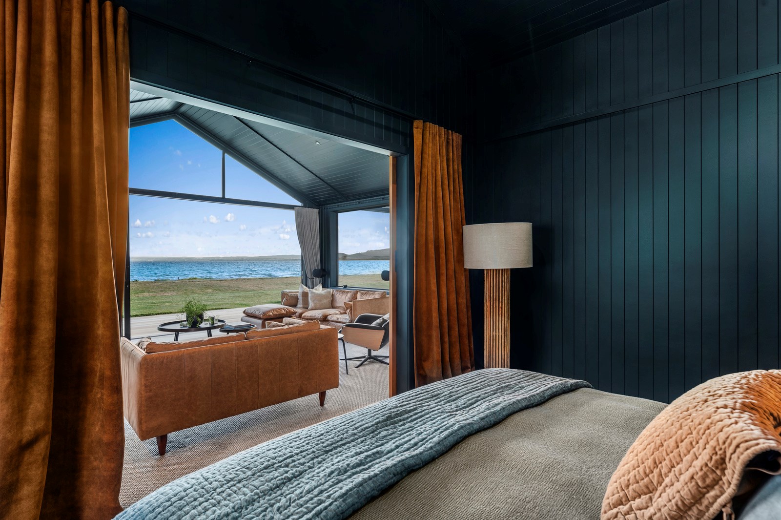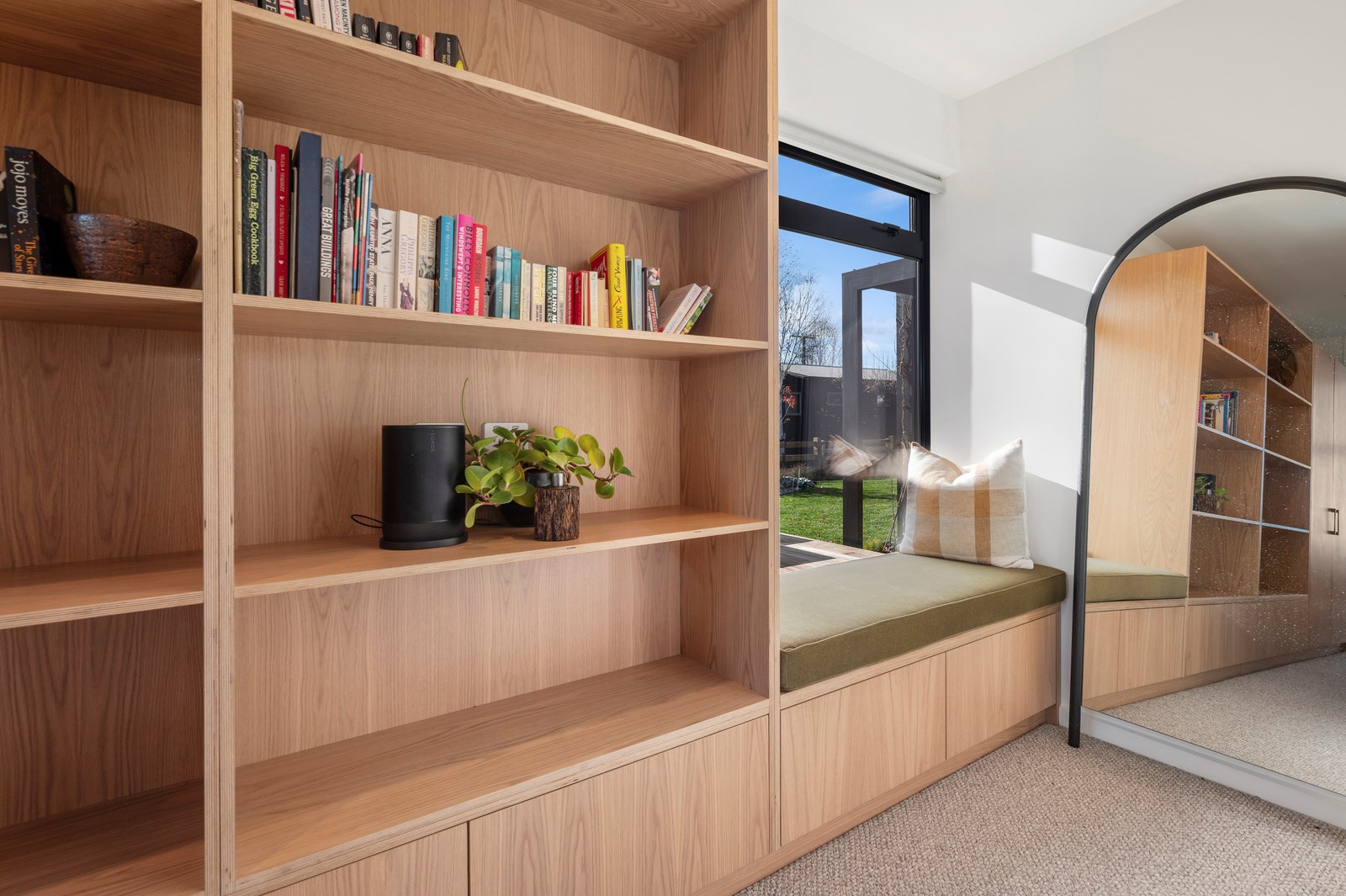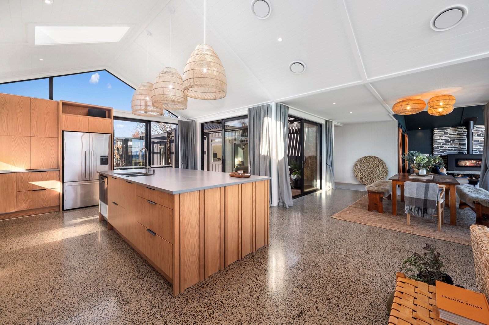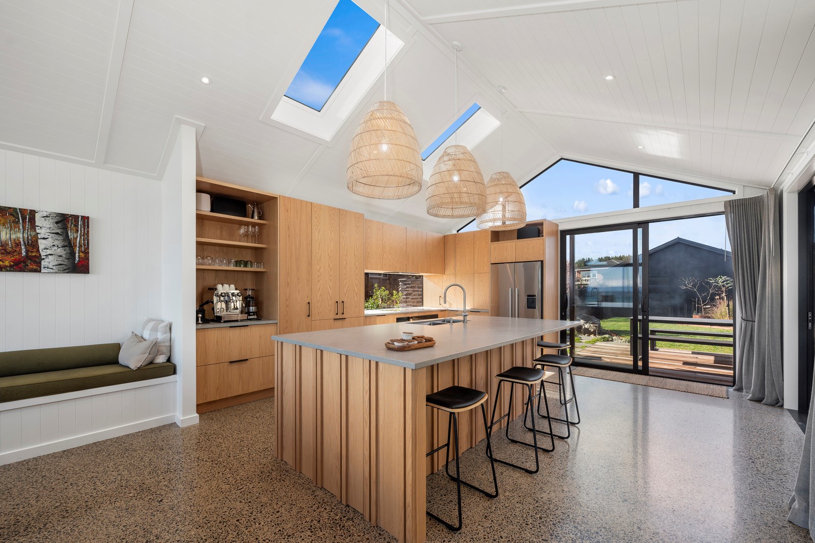 Back to those rooms that drink in lake views: in the kitchen and dining space, you’ll find polished-concrete floors, feature groove linings with batten detailing on the island, and blond ply cabinetry. Natural light pours in through skylights, clerestory windows and sliders that open to decks and vistas. While the rustic living space still opens to the great outdoors, it’s ideal for chilly nights when the owners can close the sliders, light the fire and cosy up. This character is repeated in the main bedroom, which is connected by double barn-style doors. Throw them open and lake views can be enjoyed from bed. The house also has a powder room, study, tiled bathroom, laundry and new garage. Despite issues such as a high water table, Built Spaces has crafted a jewel of a home the clients are over the moon with.
