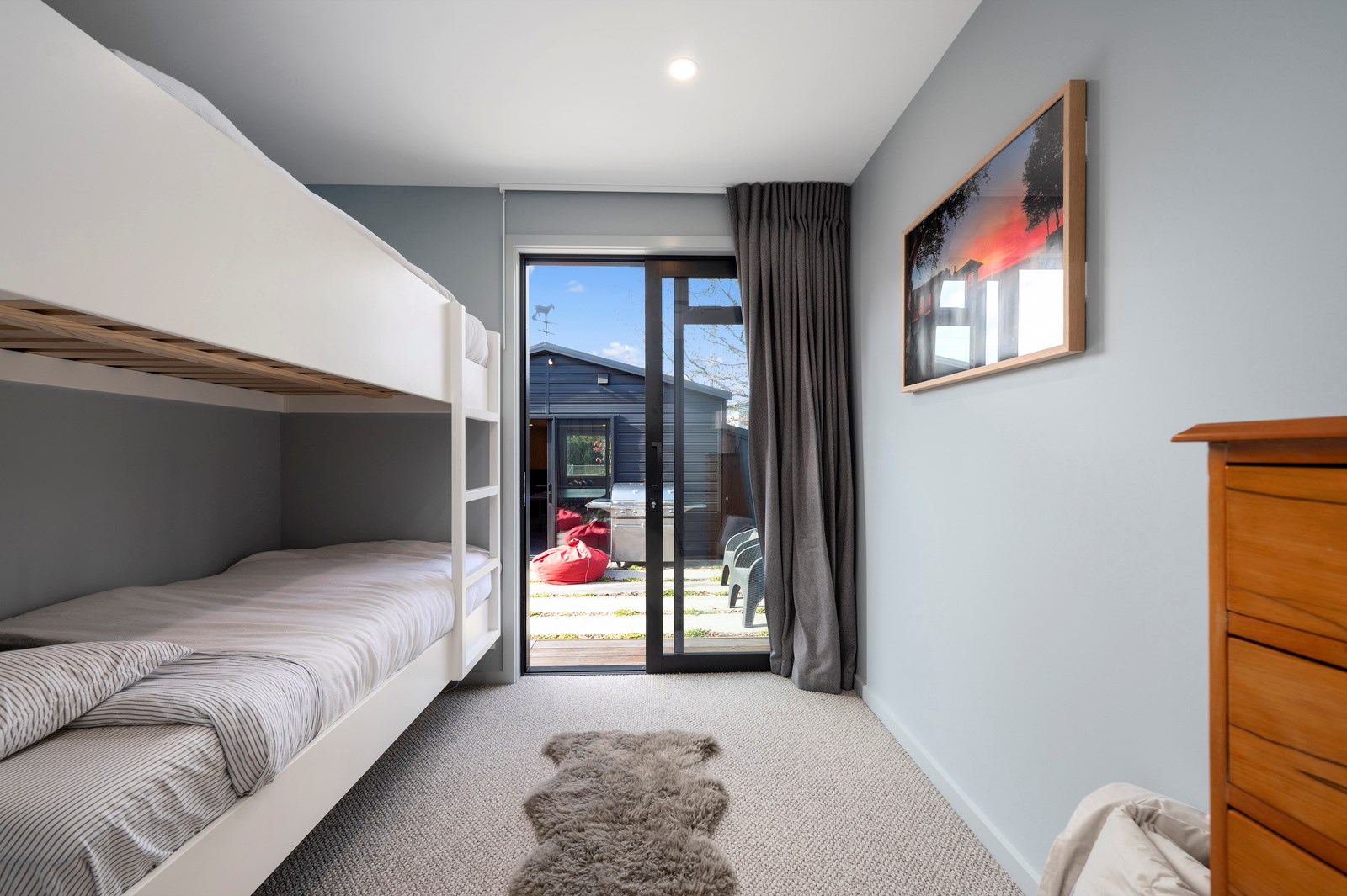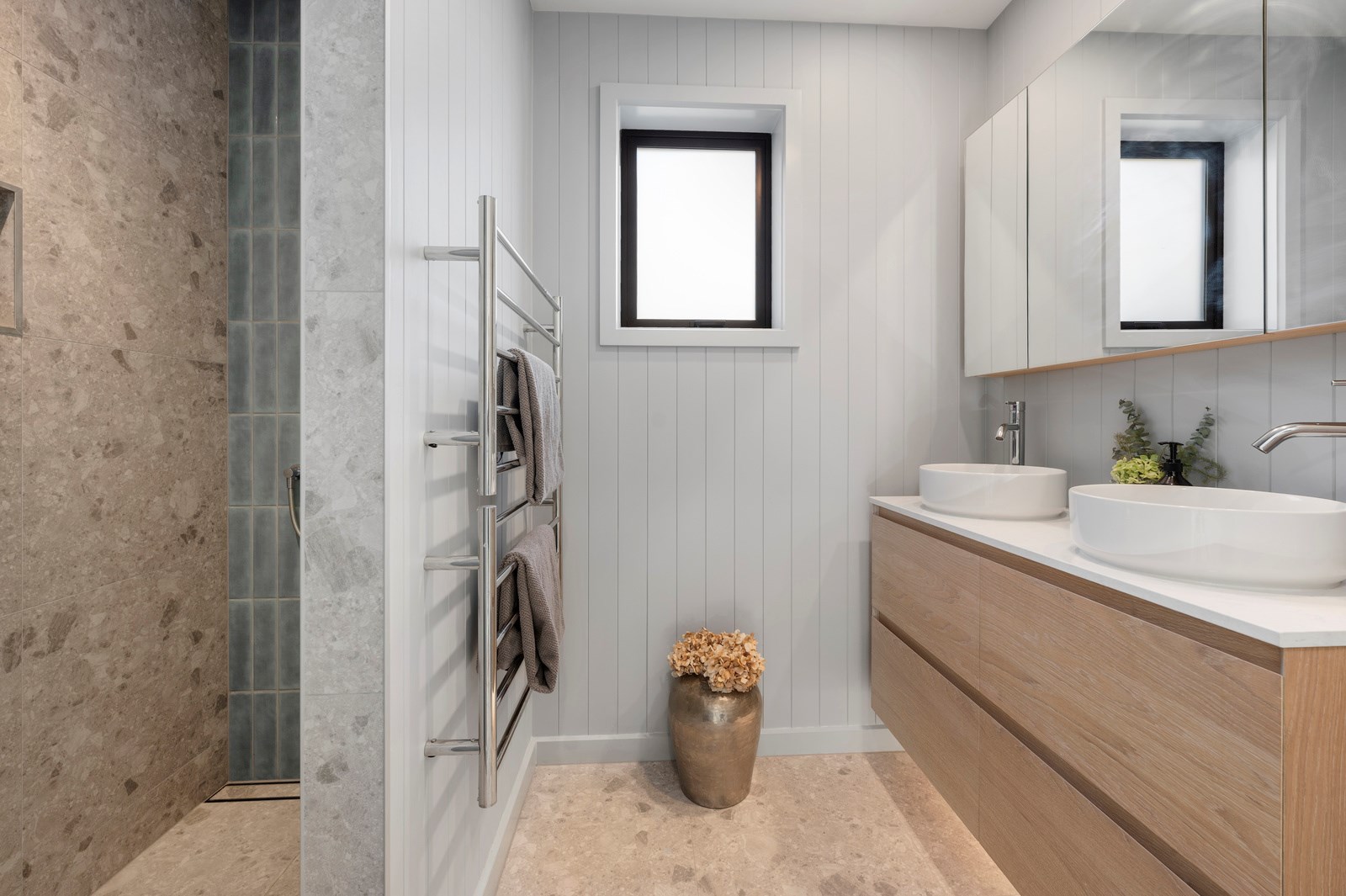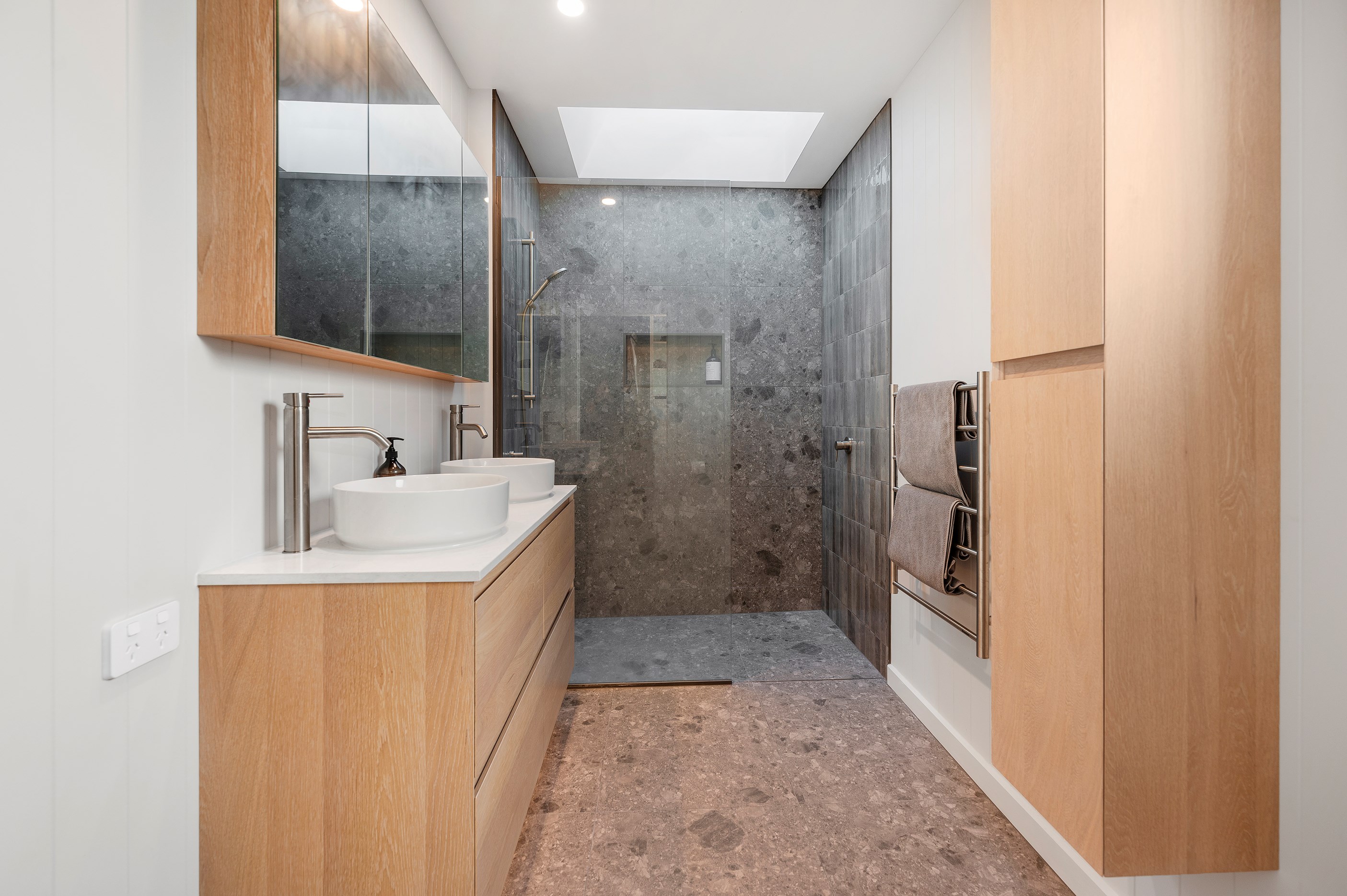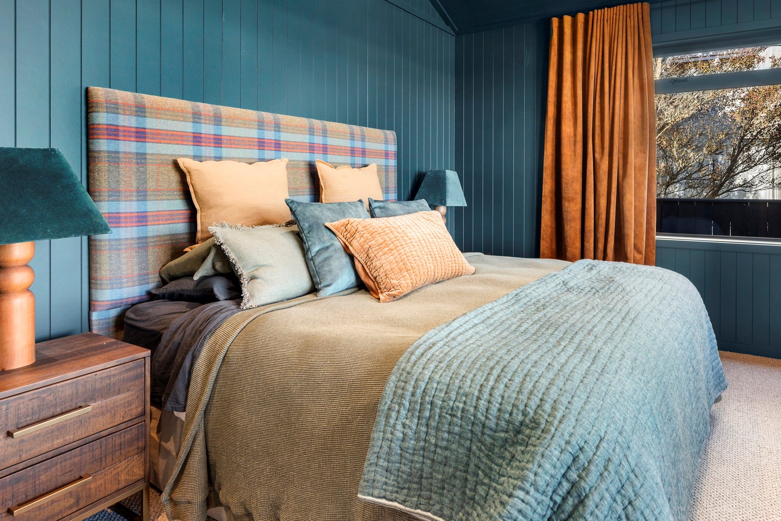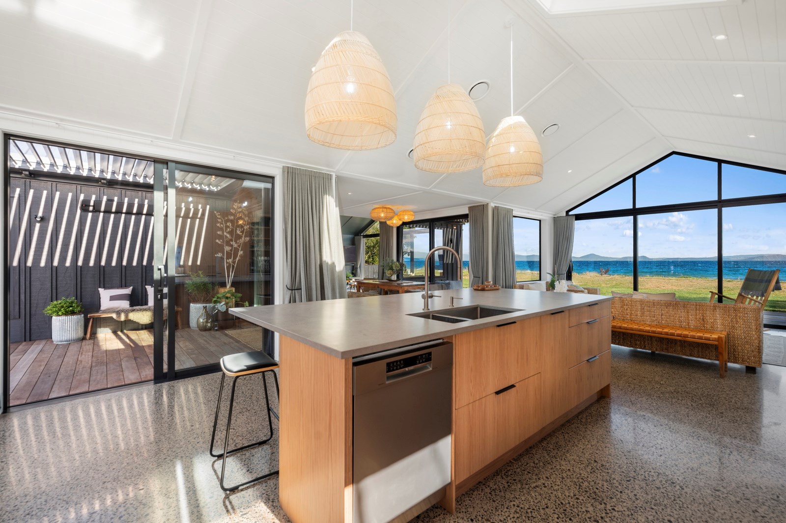 Back to those rooms that drink in lake views: in the kitchen and dining space, you’ll find polished-concrete floors, feature groove linings with batten detailing on the island, and blond ply cabinetry. Natural light pours in through skylights, clerestory windows and sliders that open to decks and vistas. While the rustic living space still opens to the great outdoors, it’s ideal for chilly nights when the owners can close the sliders, light the fire and cosy up. This character is repeated in the main bedroom, which is connected by double barn-style doors. Throw them open and lake views can be enjoyed from bed. The house also has a powder room, study, tiled bathroom, laundry and new garage. Despite issues such as a high water table, Built Spaces has crafted a jewel of a home the clients are over the moon with.