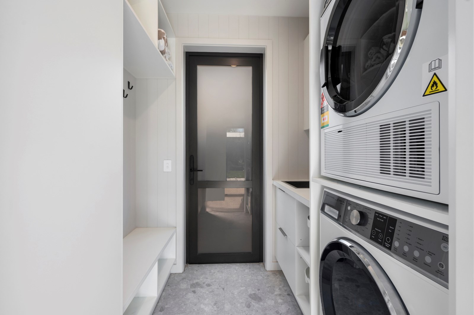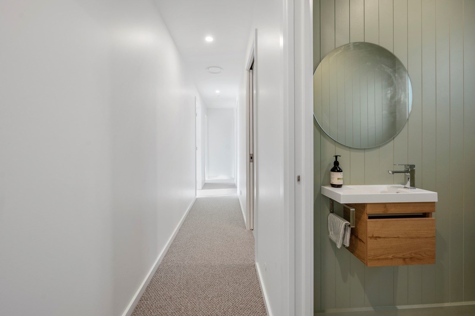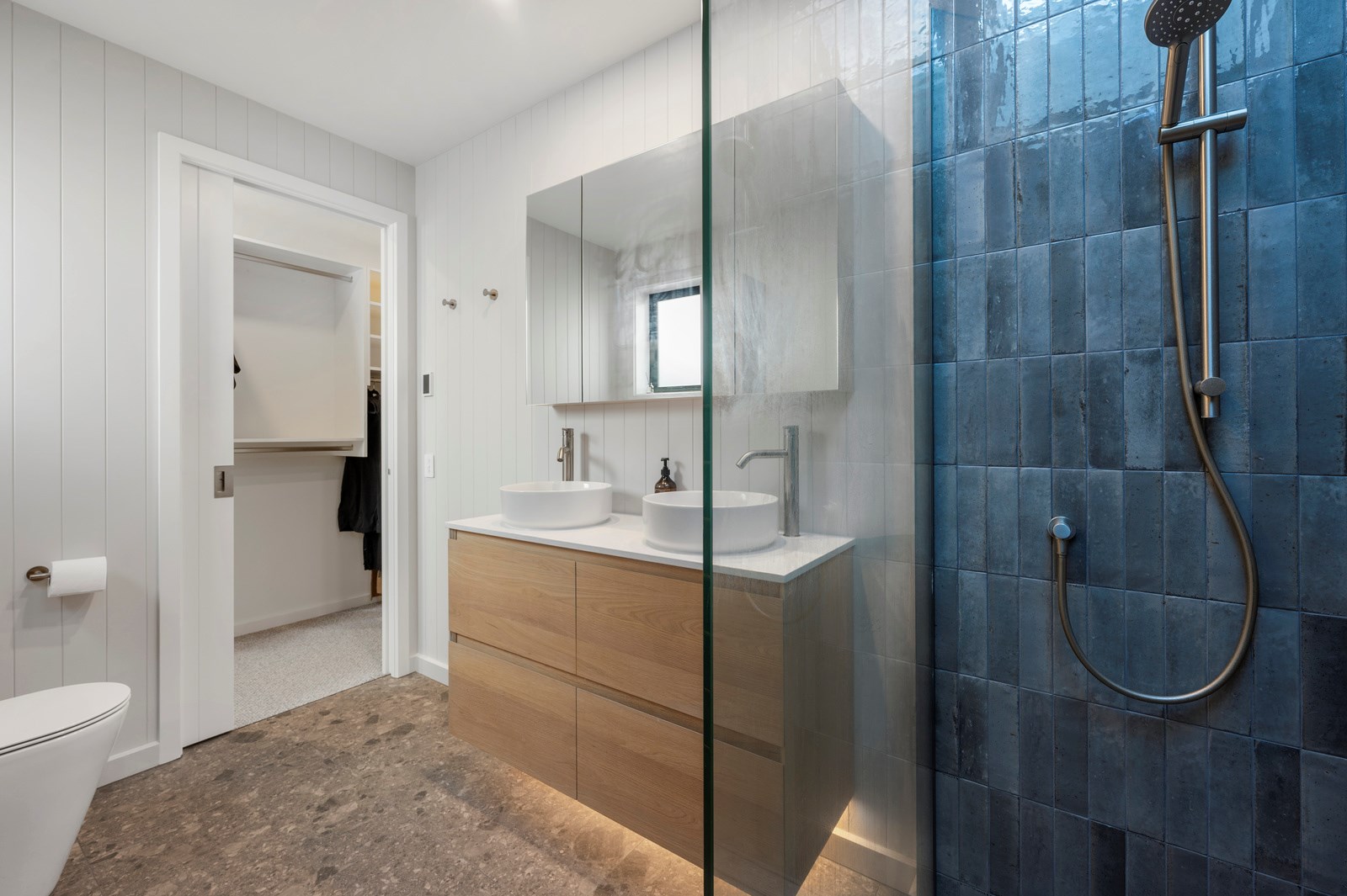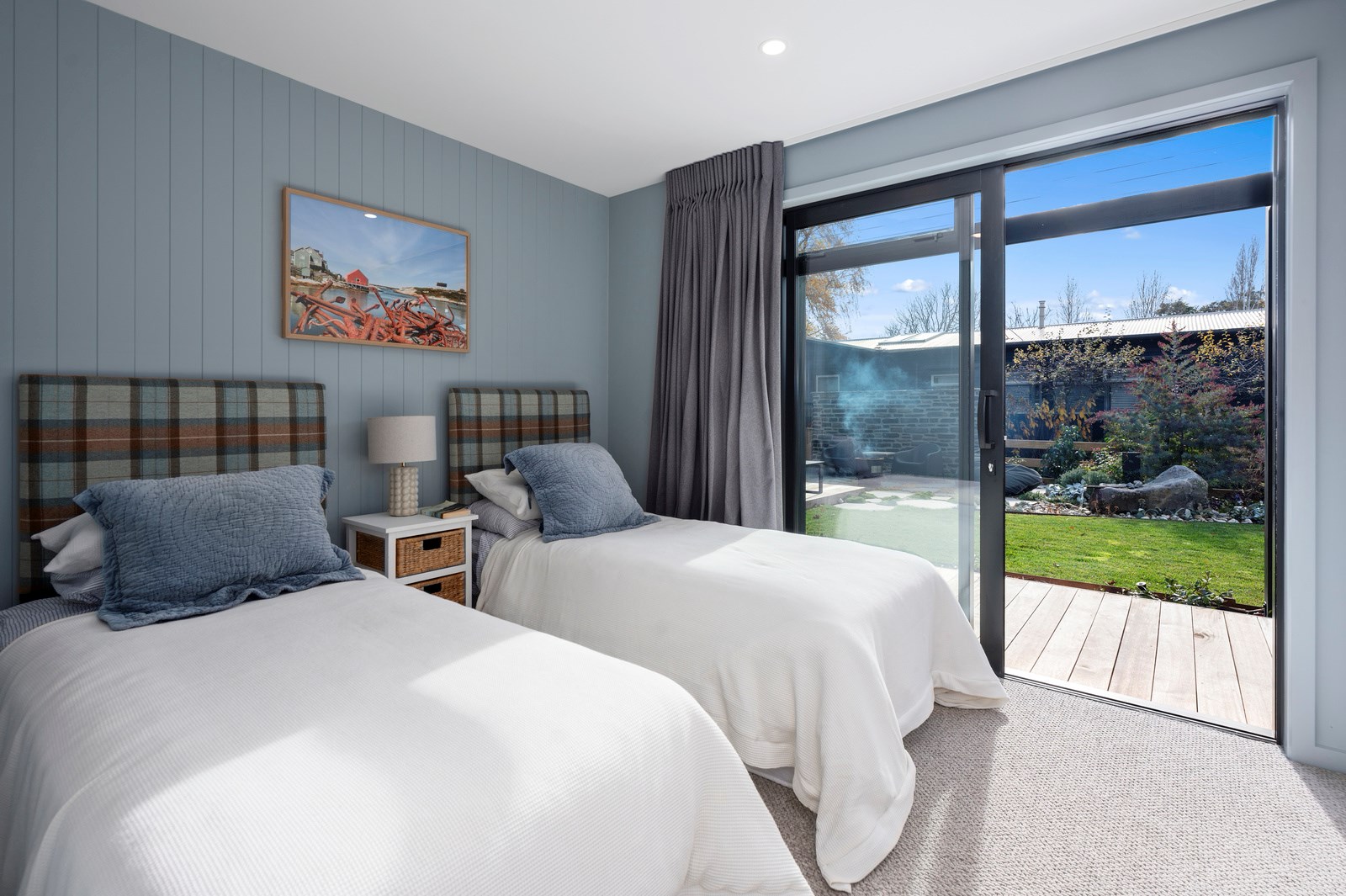 Back to those rooms that drink in lake views: in the kitchen and dining space, you’ll find polished-concrete floors, feature groove linings with batten detailing on the island, and blond ply cabinetry. Natural light pours in through skylights, clerestory windows and sliders that open to decks and vistas. While the rustic living space still opens to the great outdoors, it’s ideal for chilly nights when the owners can close the sliders, light the fire and cosy up. This character is repeated in the main bedroom, which is connected by double barn-style doors. Throw them open and lake views can be enjoyed from bed. The house also has a powder room, study, tiled bathroom, laundry and new garage. Despite issues such as a high water table, Built Spaces has crafted a jewel of a home the clients are over the moon with.