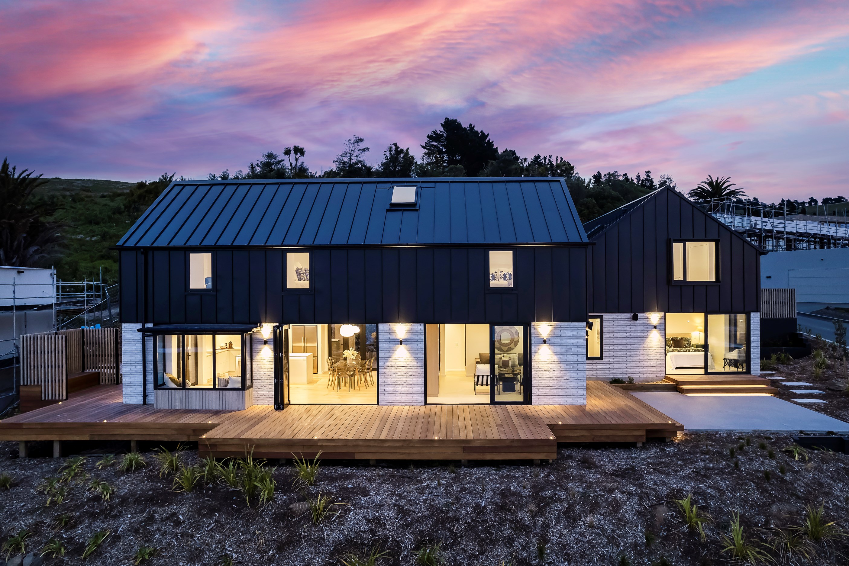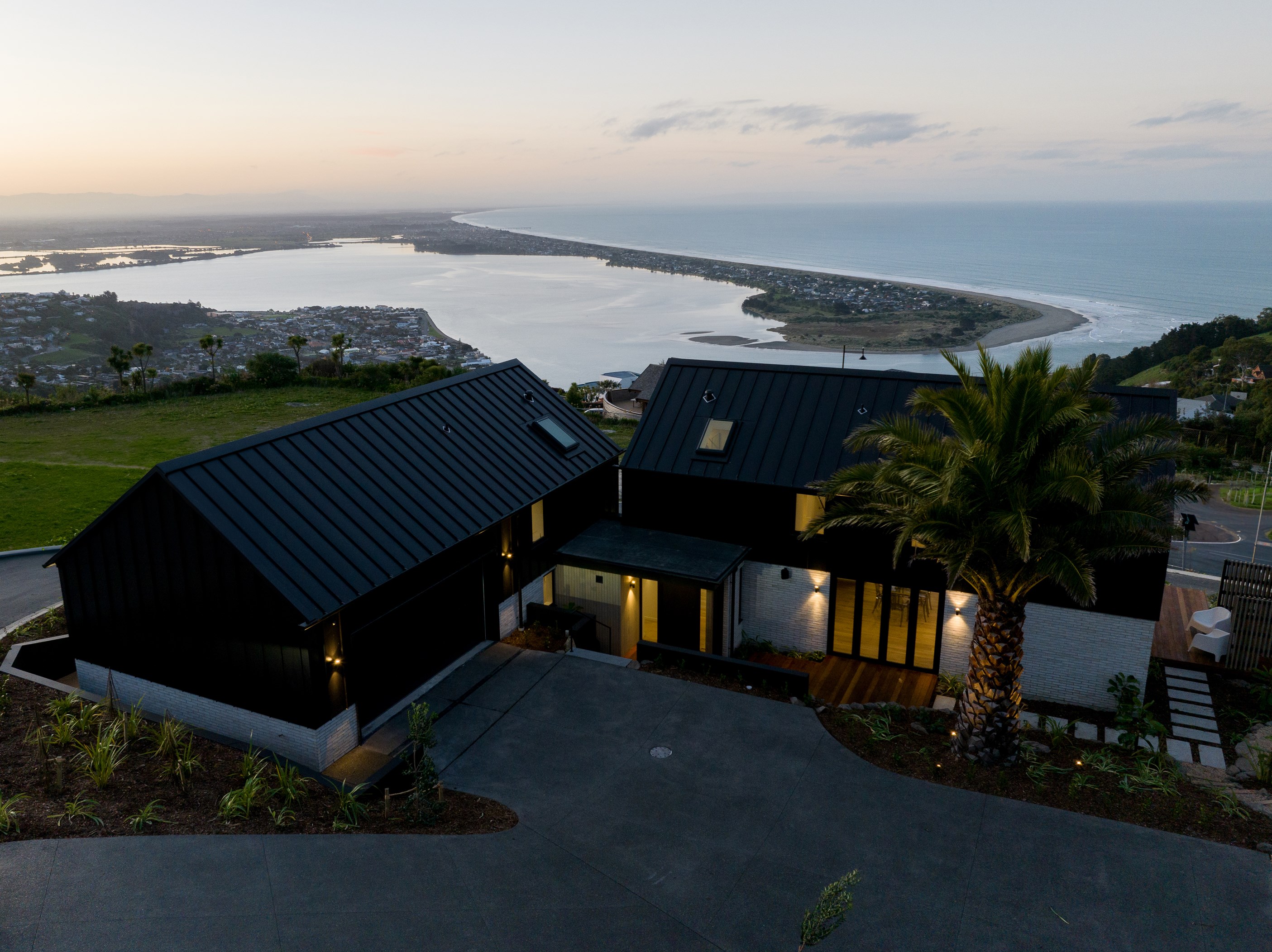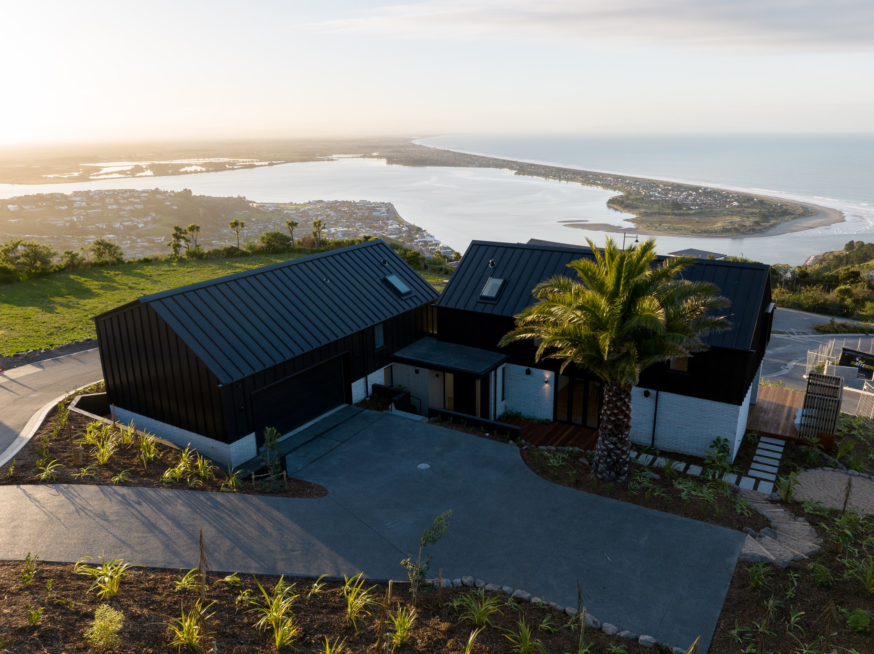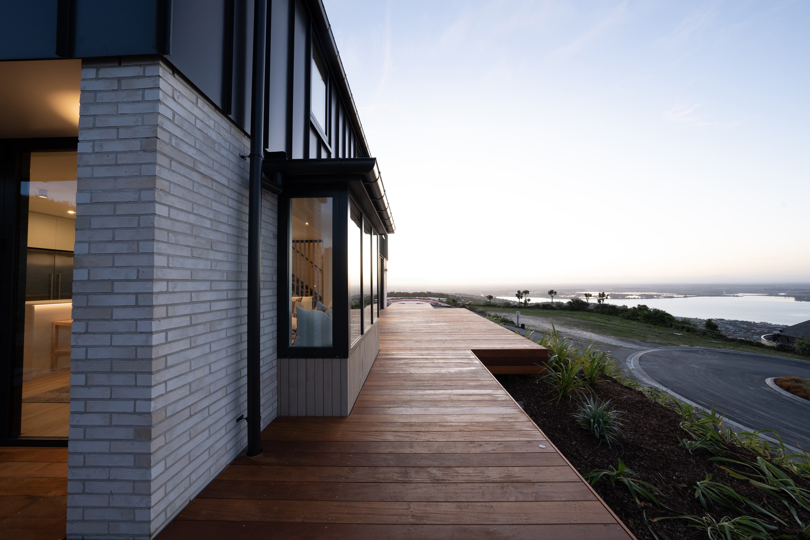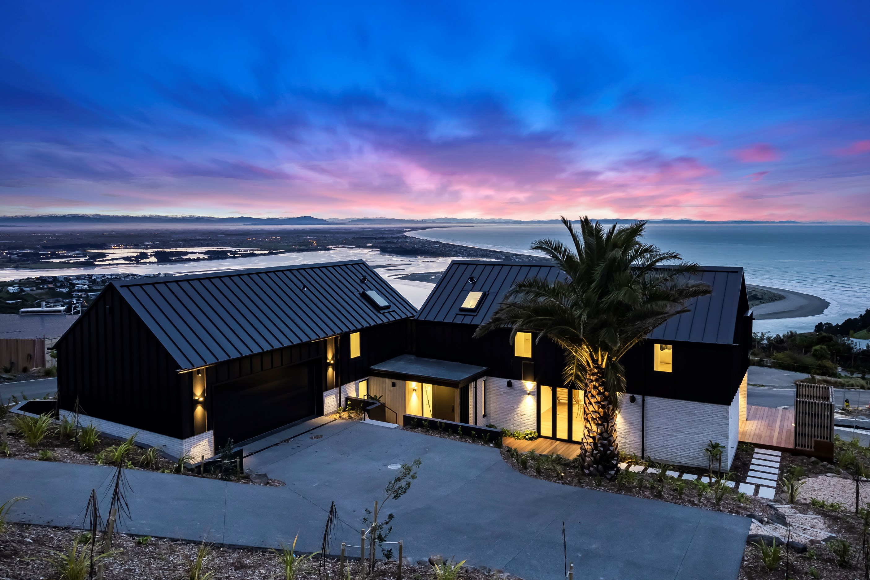 In this bold, high-spec home, two wings add up to twice the delight. Forming a right angle and clad in white brick veneer and dark metal, this five-bedroom house stands out for all the right reasons. From its elevated position, it also captures 180-degree views of sea and land, including the Southshore spit and the Kaikōura Ranges. Despite its grandstand view from high above Sumner, the house and its expansive decking is also sheltered from cool southerly winds. Doors that open straight onto decks, tucked-away patios and steps with up-lighting only add to the outdoor appeal.