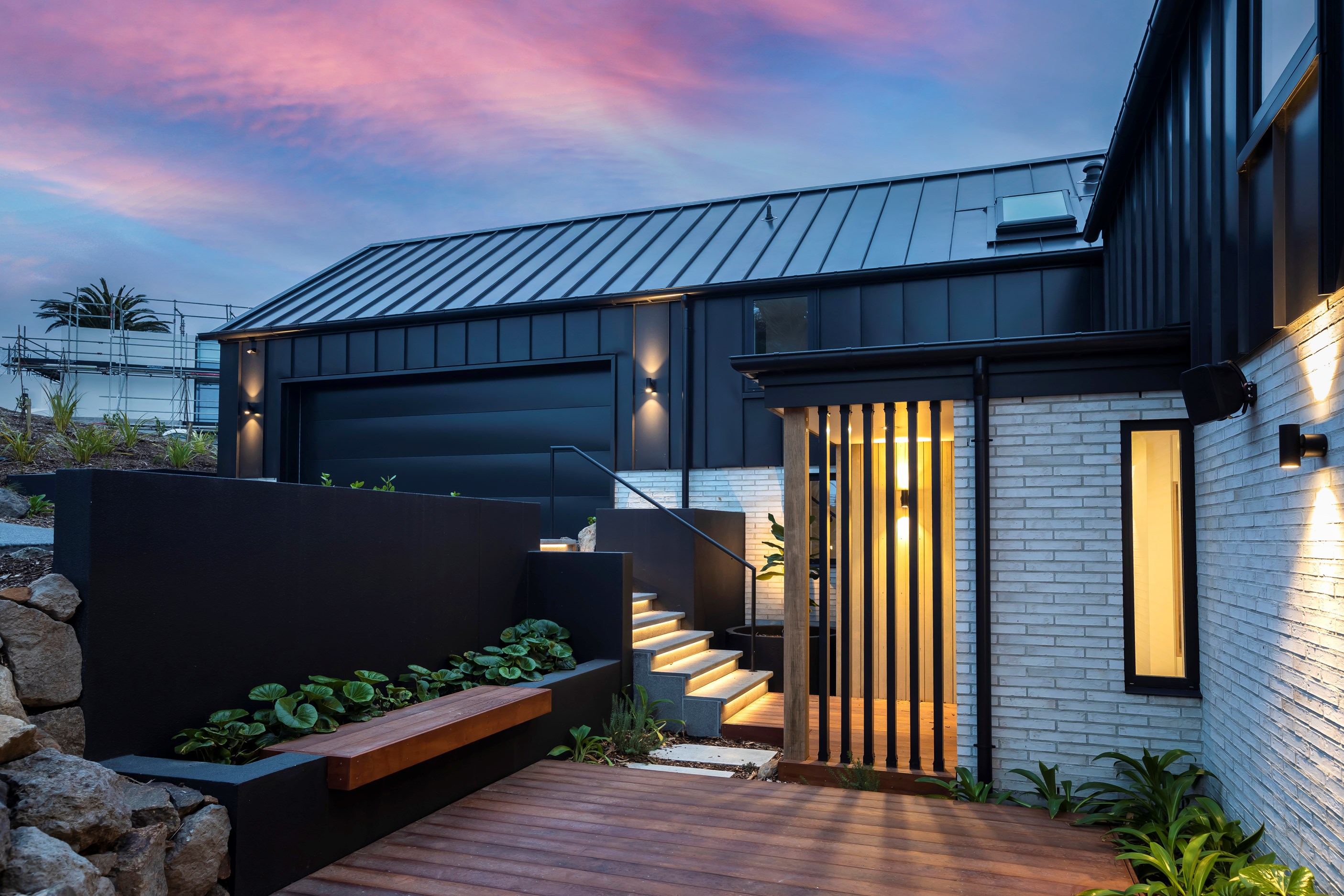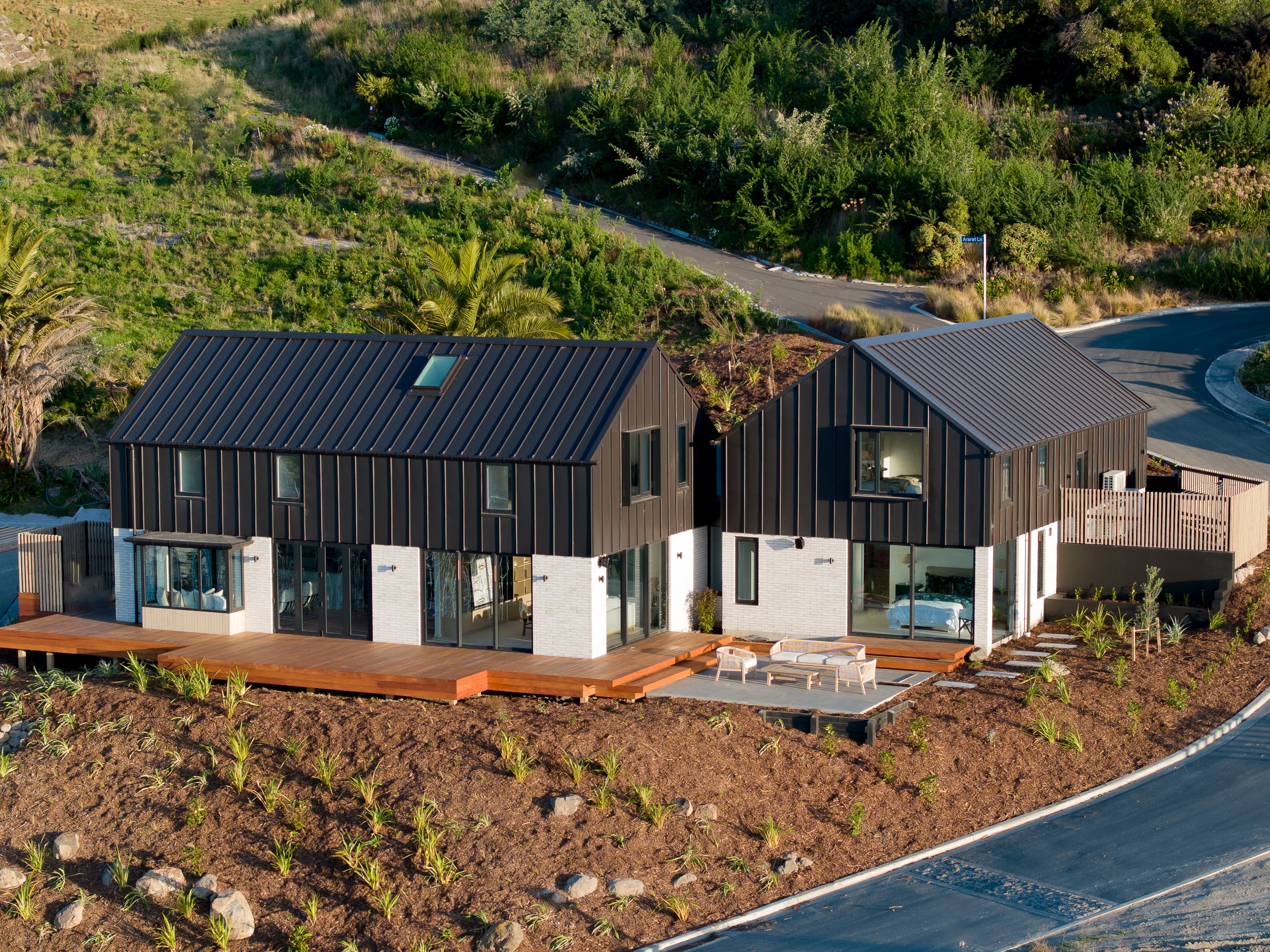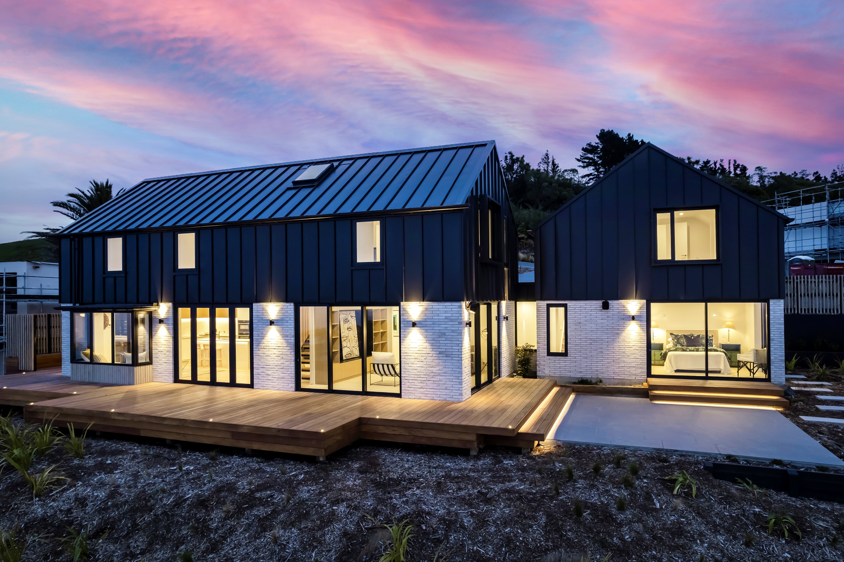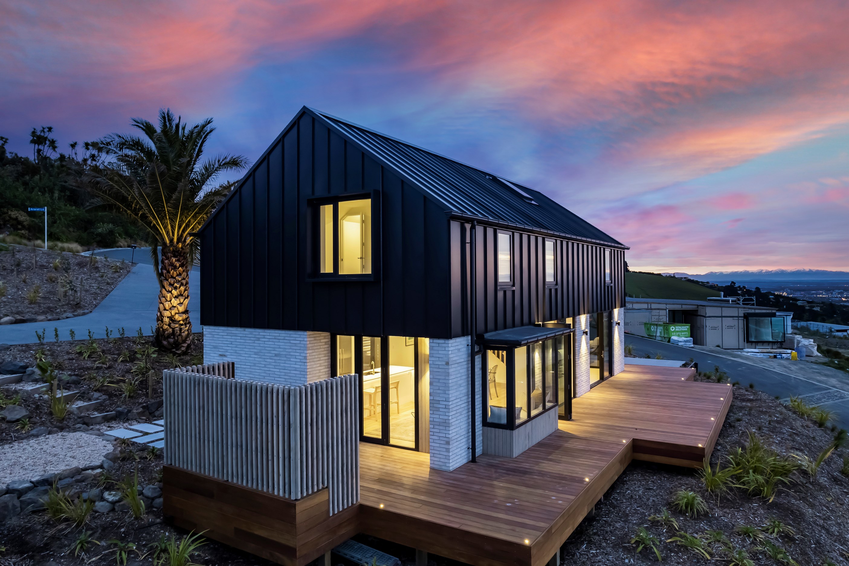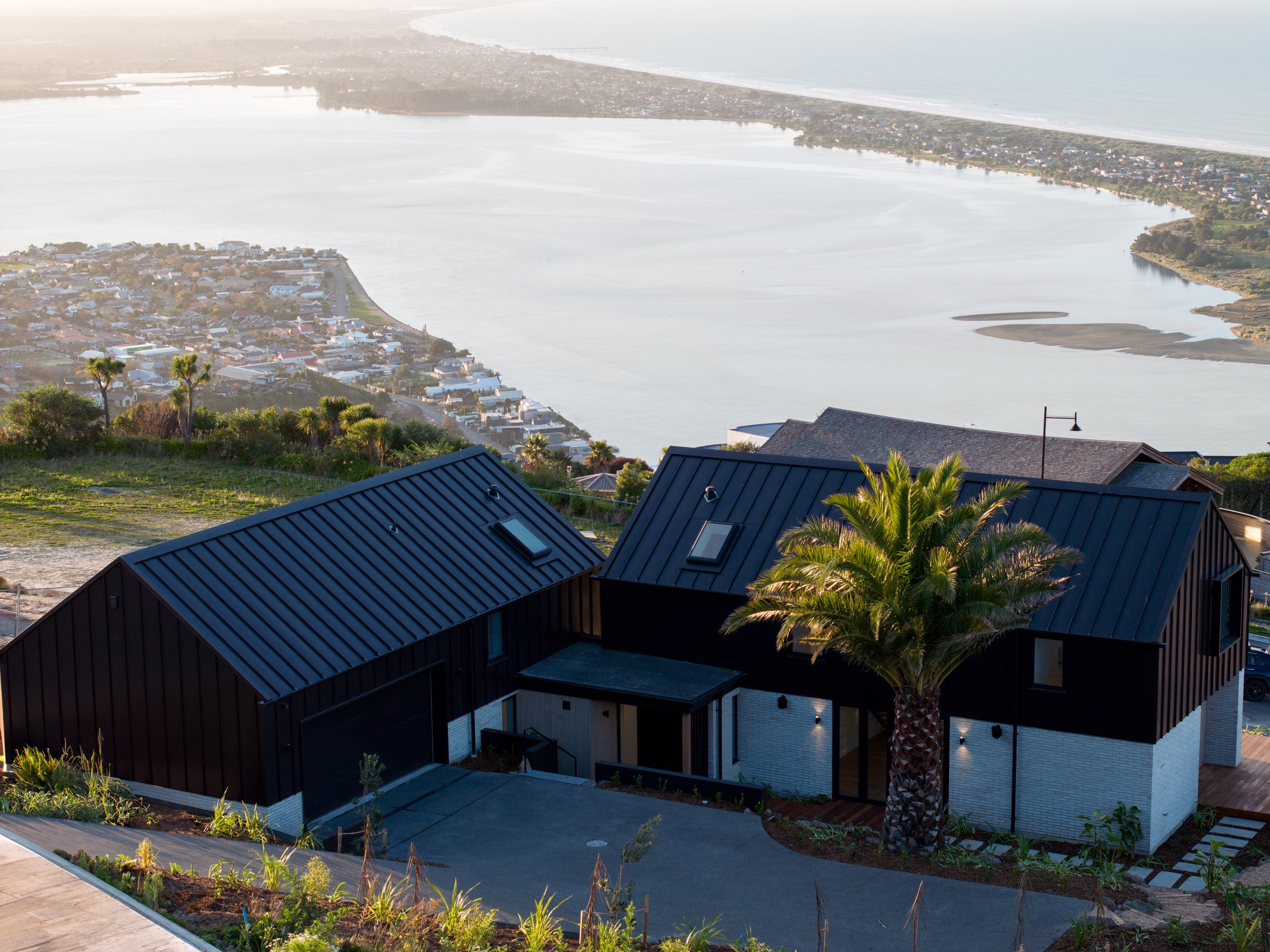 In this bold, high-spec home, two wings add up to twice the delight. Forming a right angle and clad in white brick veneer and dark metal, this five-bedroom house stands out for all the right reasons. From its elevated position, it also captures 180-degree views of sea and land, including the Southshore spit and the Kaikōura Ranges. Despite its grandstand view from high above Sumner, the house and its expansive decking is also sheltered from cool southerly winds. Doors that open straight onto decks, tucked-away patios and steps with up-lighting only add to the outdoor appeal.