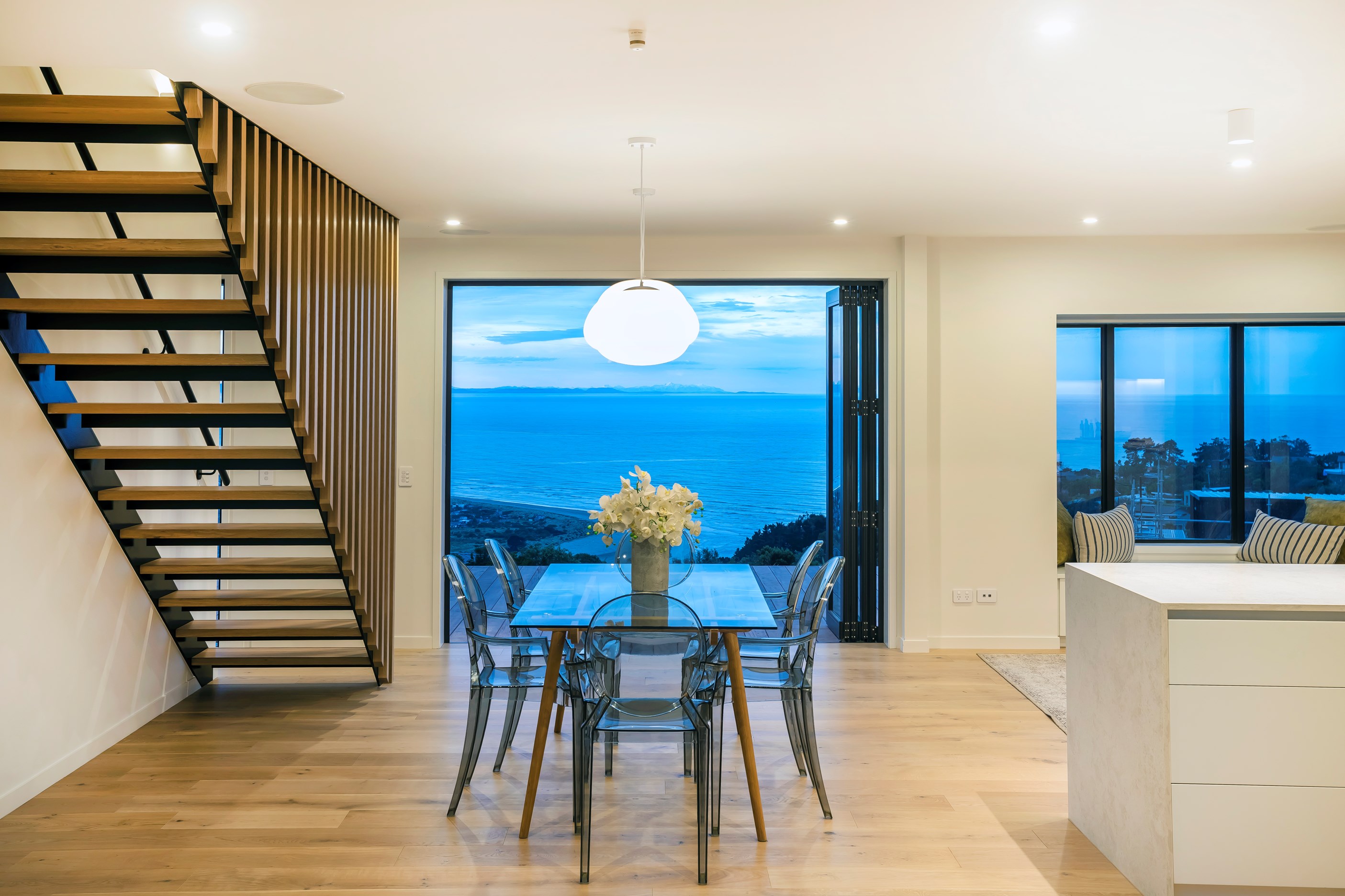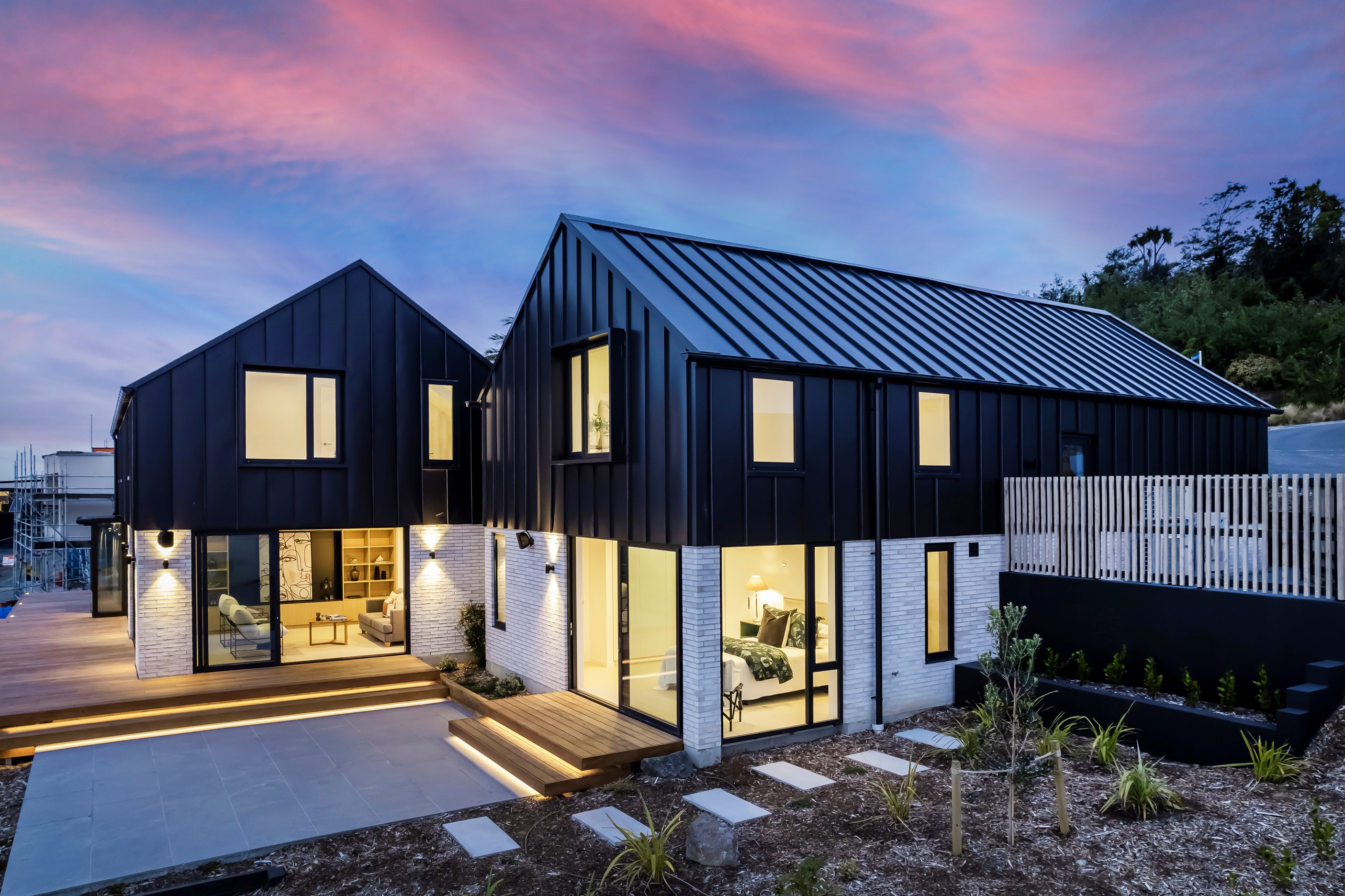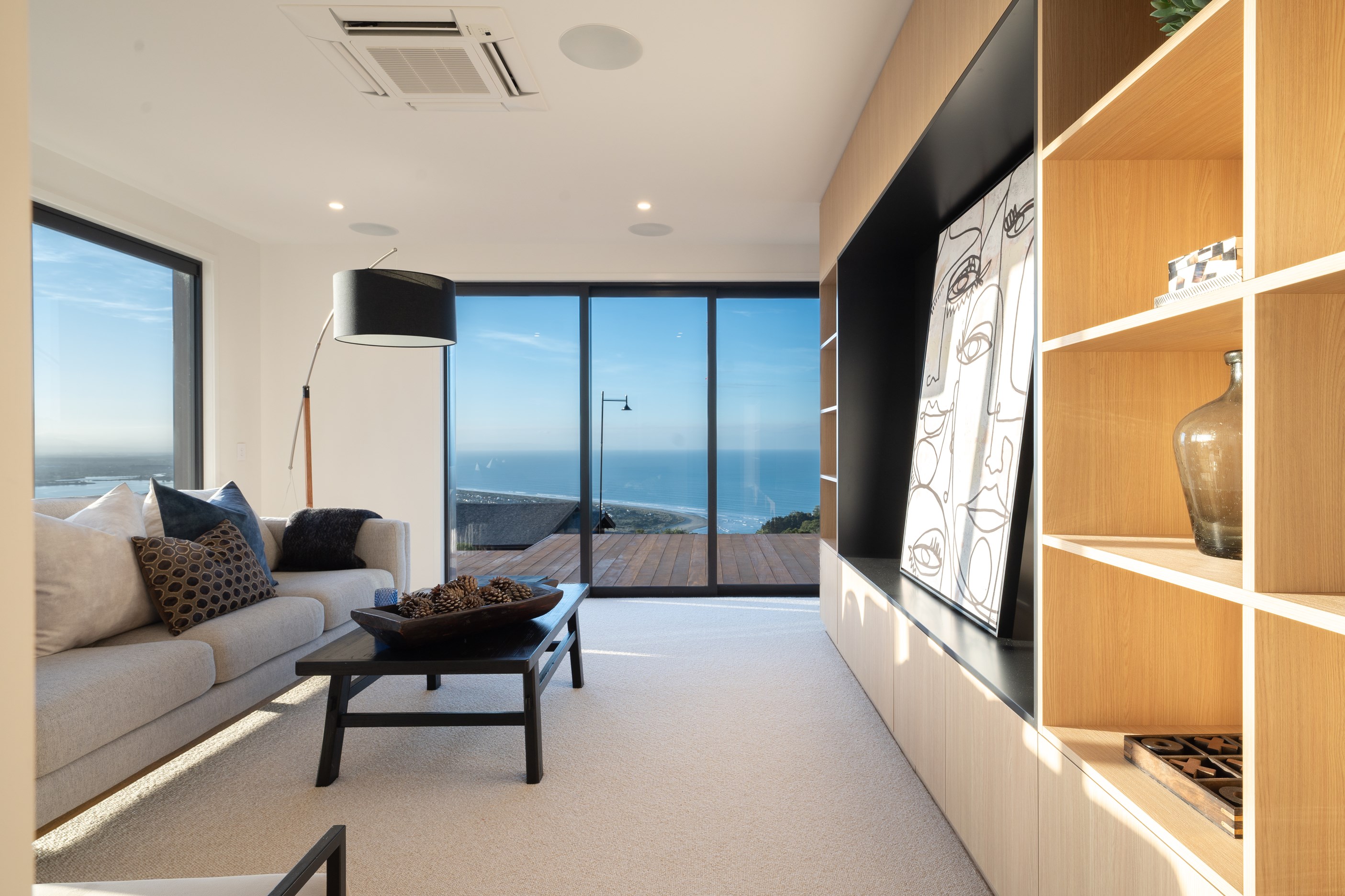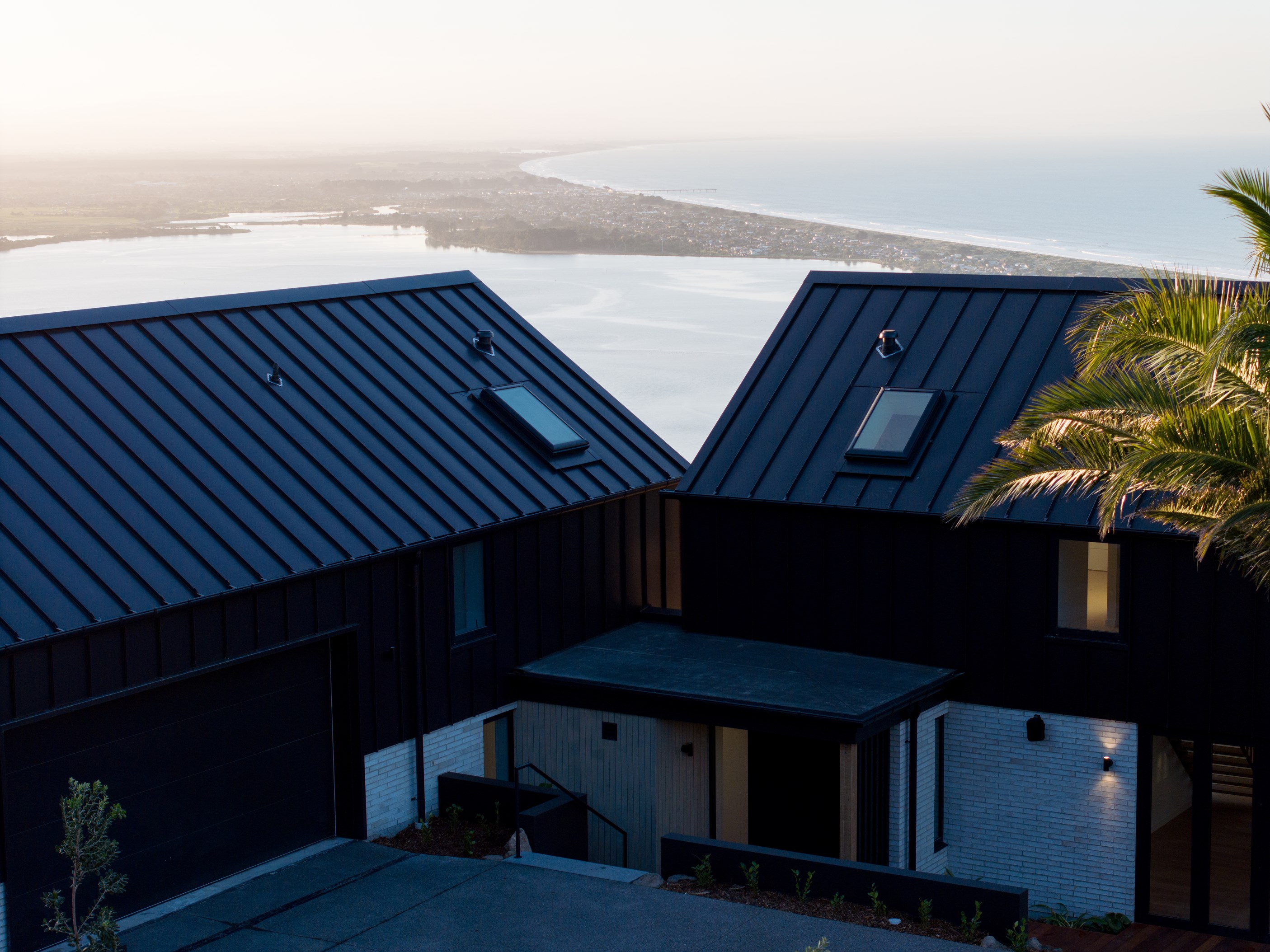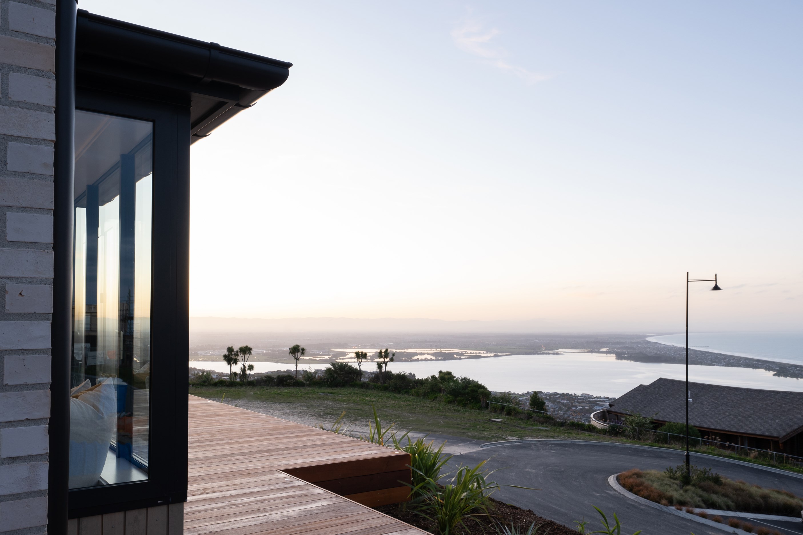 In this bold, high-spec home, two wings add up to twice the delight. Forming a right angle and clad in white brick veneer and dark metal, this five-bedroom house stands out for all the right reasons. From its elevated position, it also captures 180-degree views of sea and land, including the Southshore spit and the Kaikōura Ranges. Despite its grandstand view from high above Sumner, the house and its expansive decking is also sheltered from cool southerly winds. Doors that open straight onto decks, tucked-away patios and steps with up-lighting only add to the outdoor appeal.