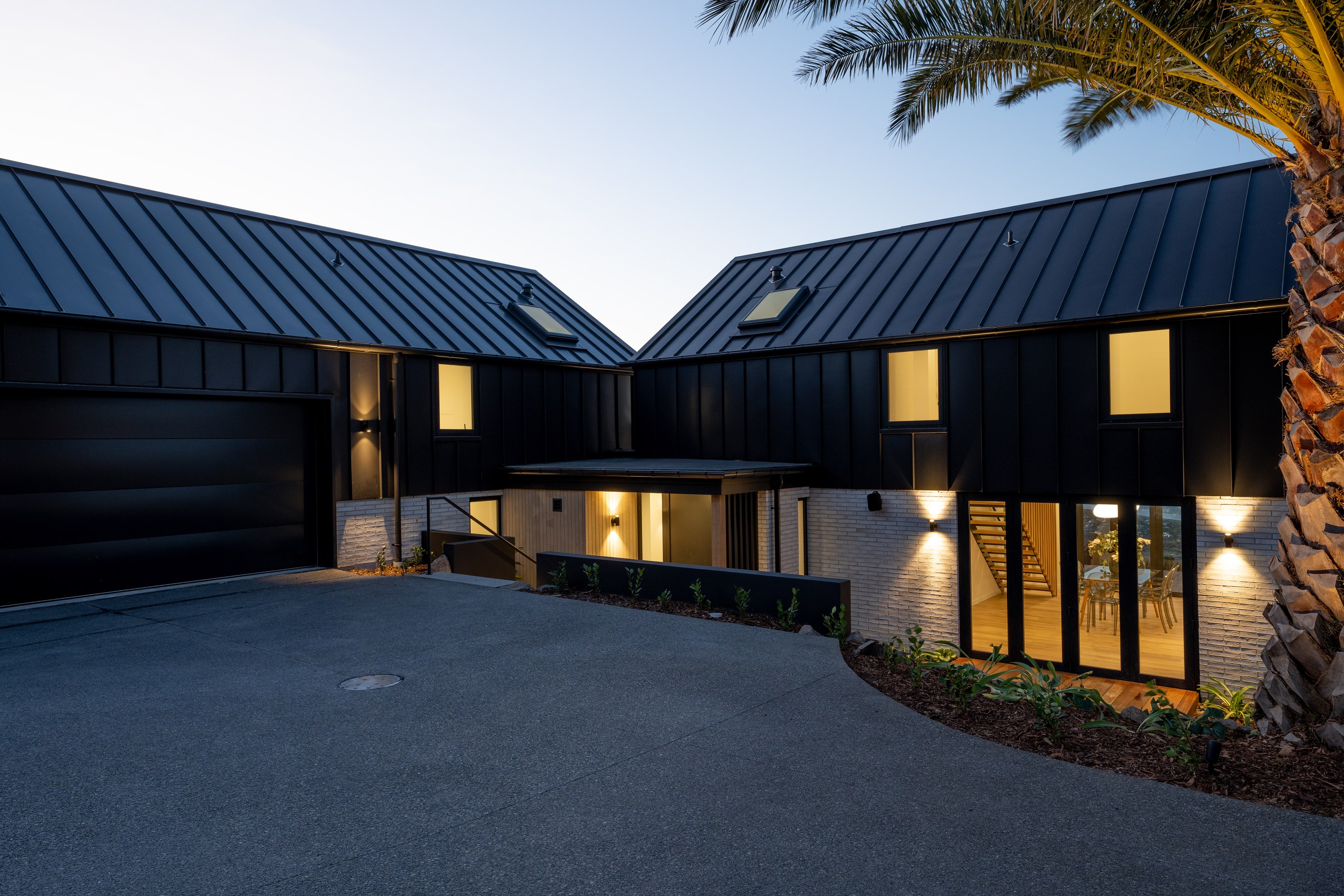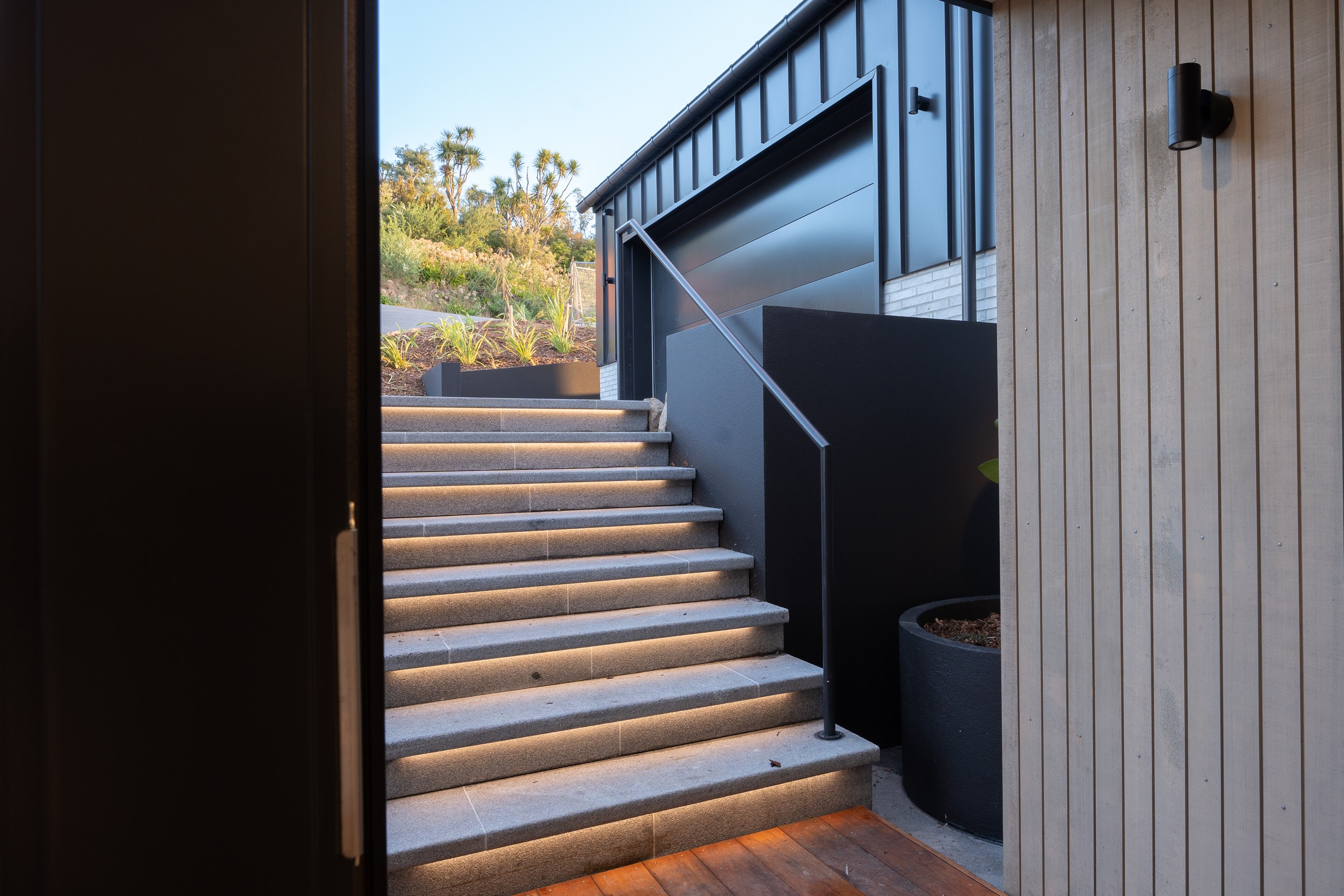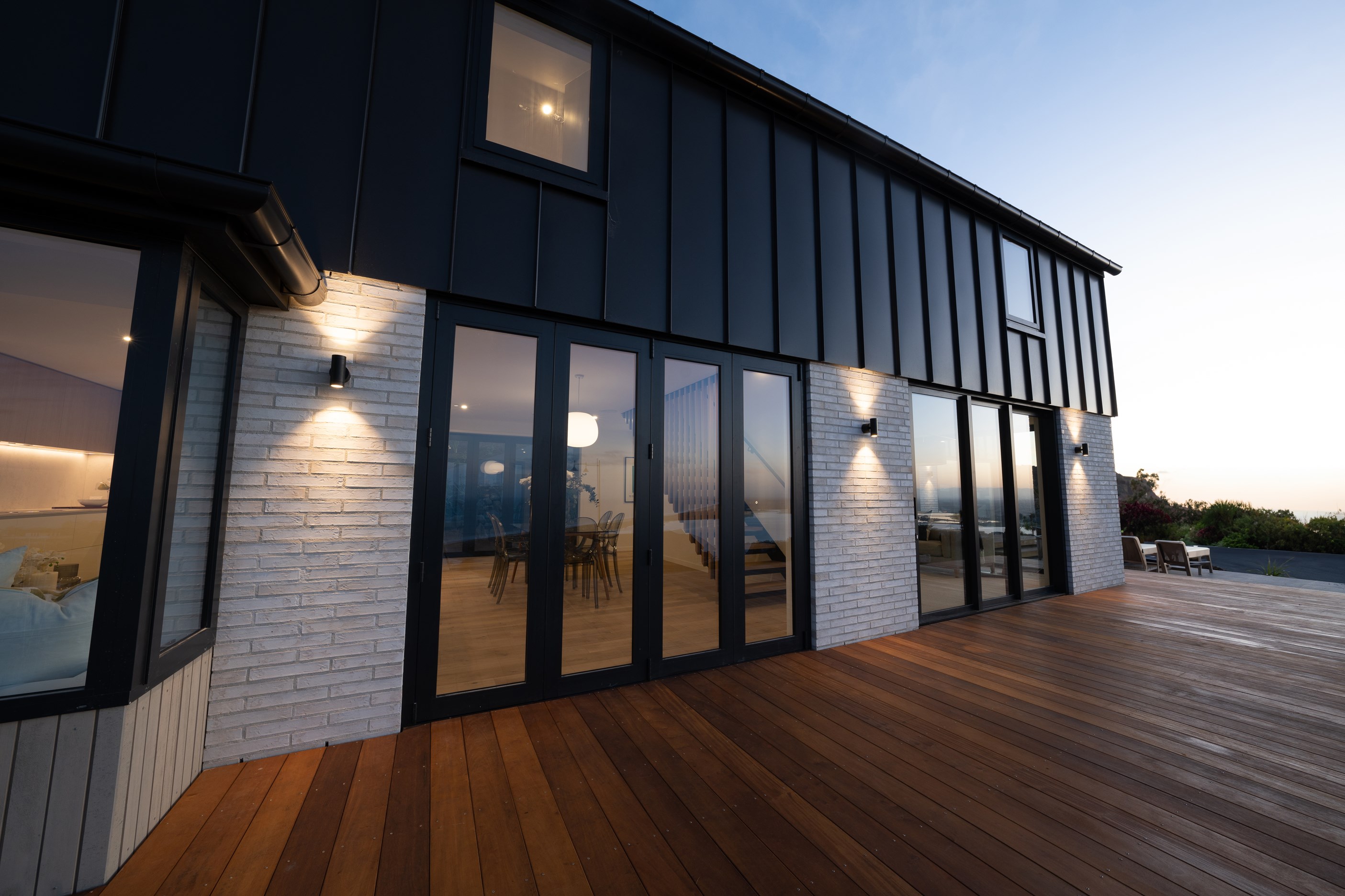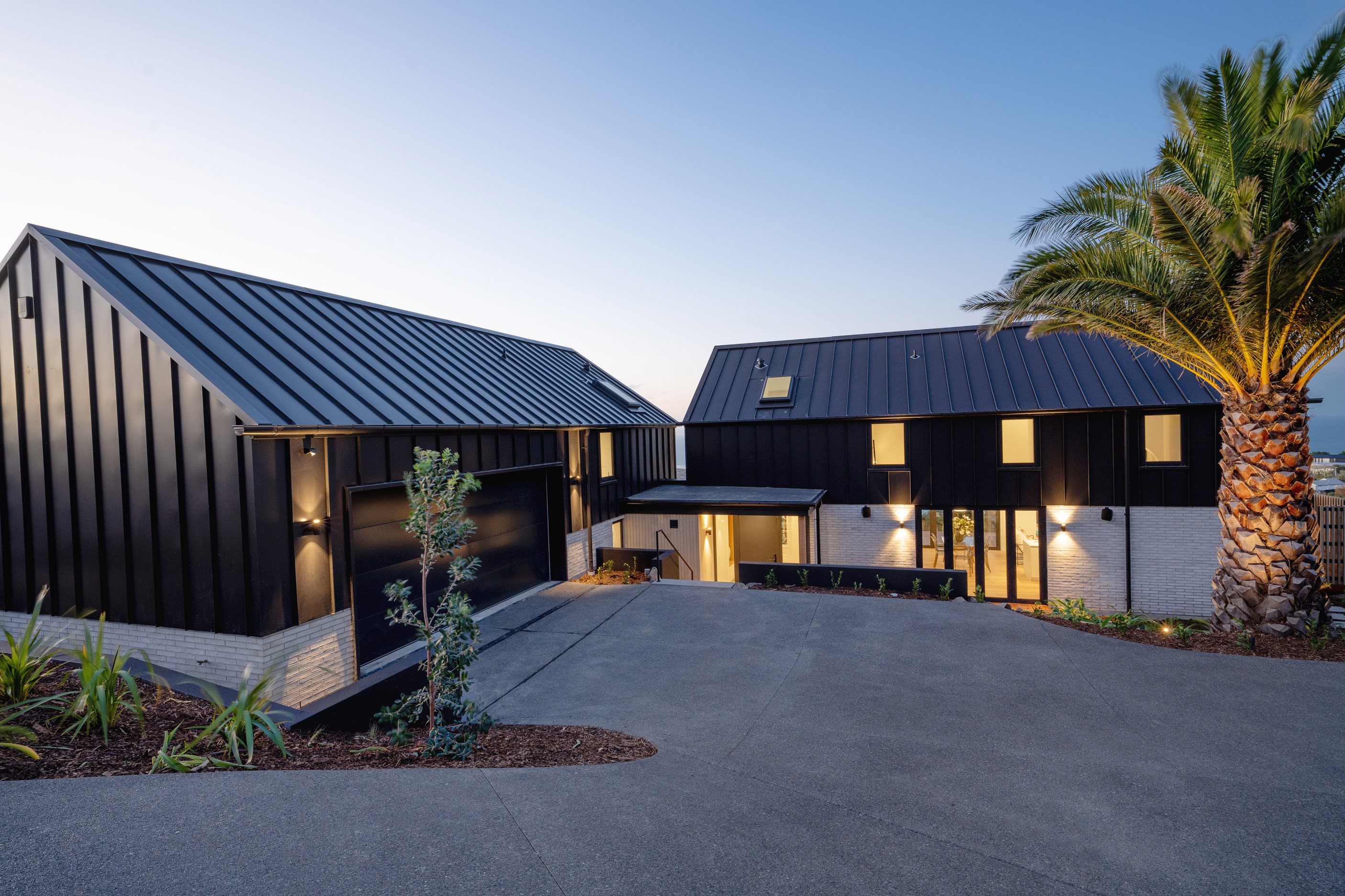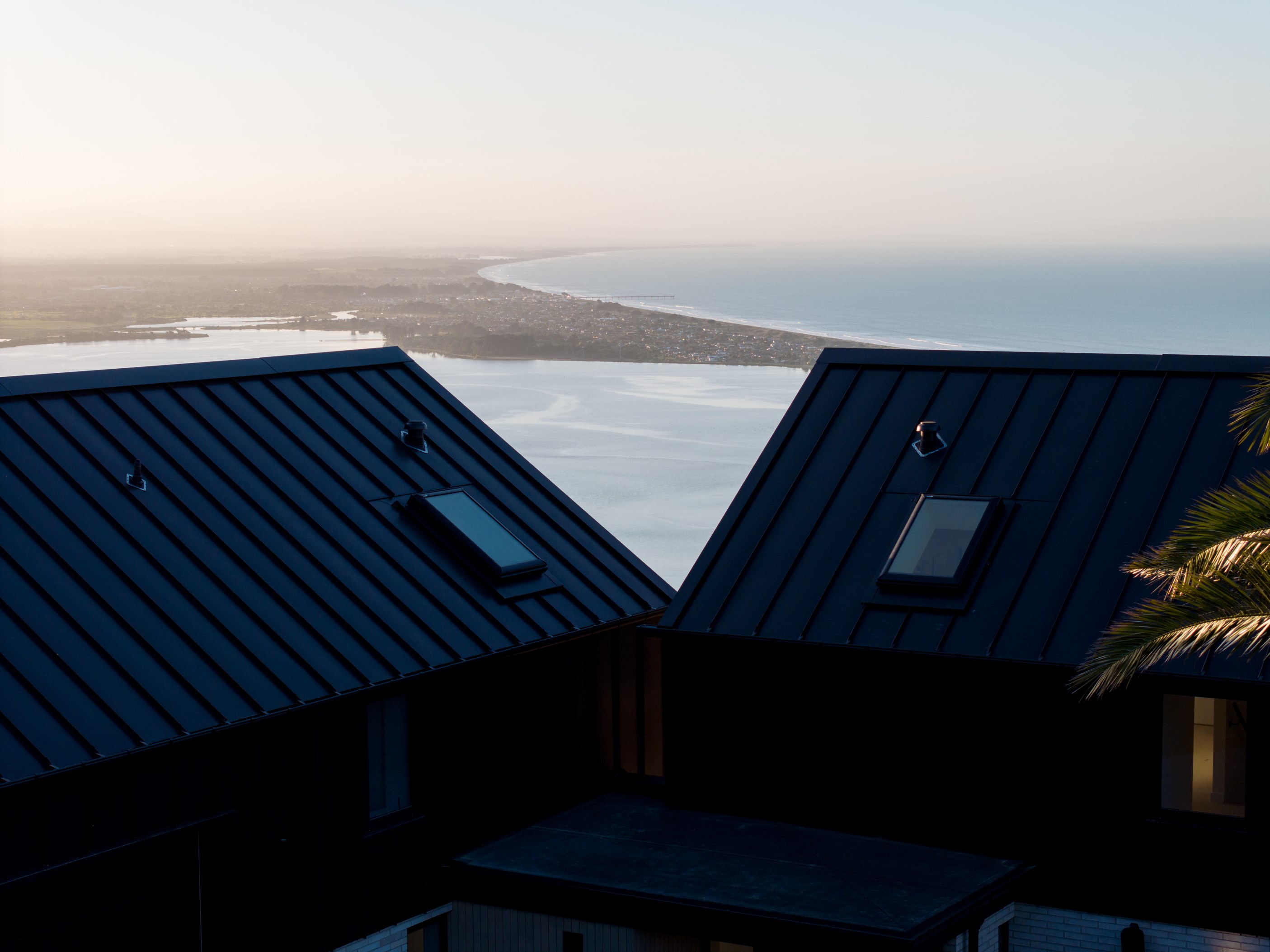 In this bold, high-spec home, two wings add up to twice the delight. Forming a right angle and clad in white brick veneer and dark metal, this five-bedroom house stands out for all the right reasons. From its elevated position, it also captures 180-degree views of sea and land, including the Southshore spit and the Kaikōura Ranges. Despite its grandstand view from high above Sumner, the house and its expansive decking is also sheltered from cool southerly winds. Doors that open straight onto decks, tucked-away patios and steps with up-lighting only add to the outdoor appeal.