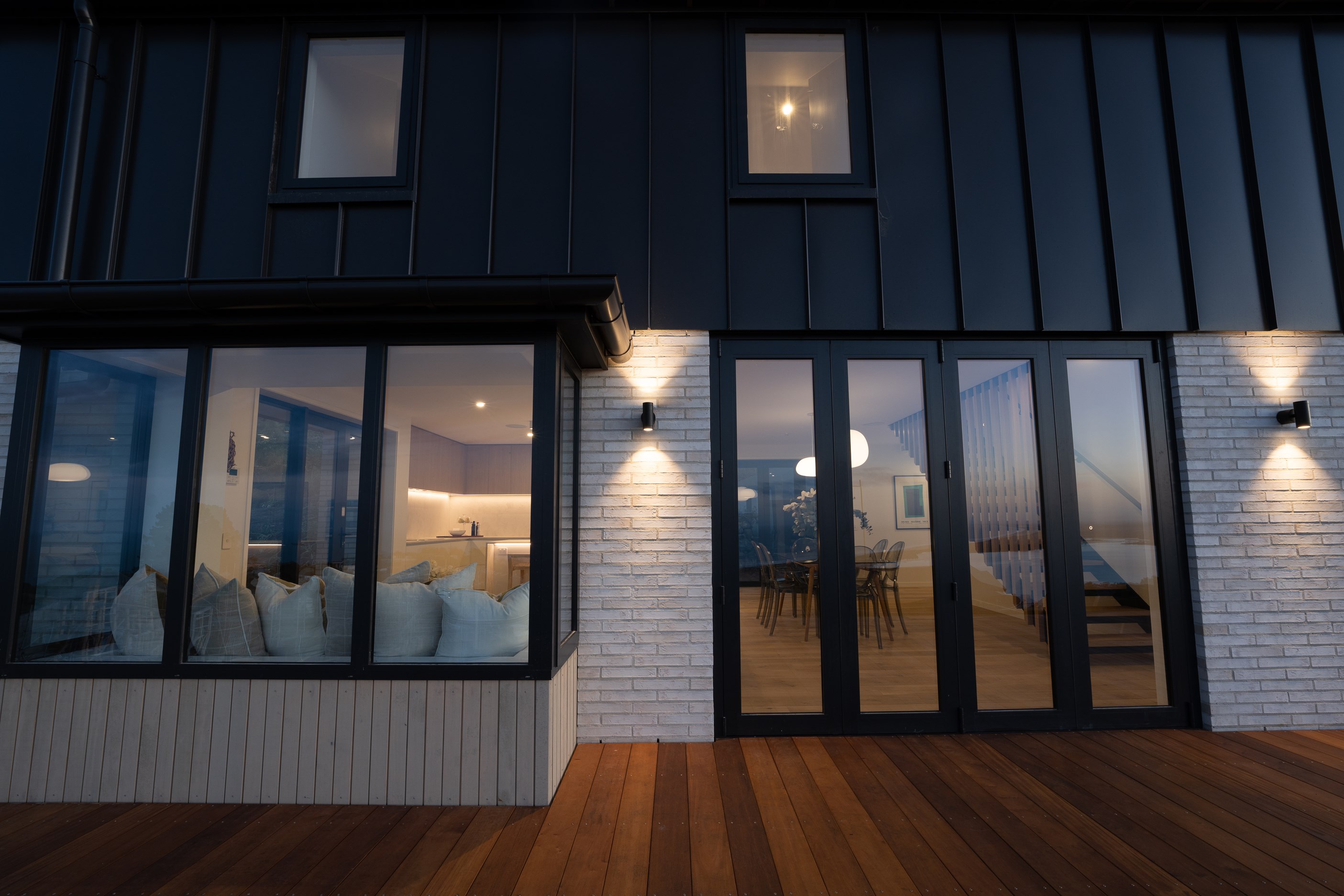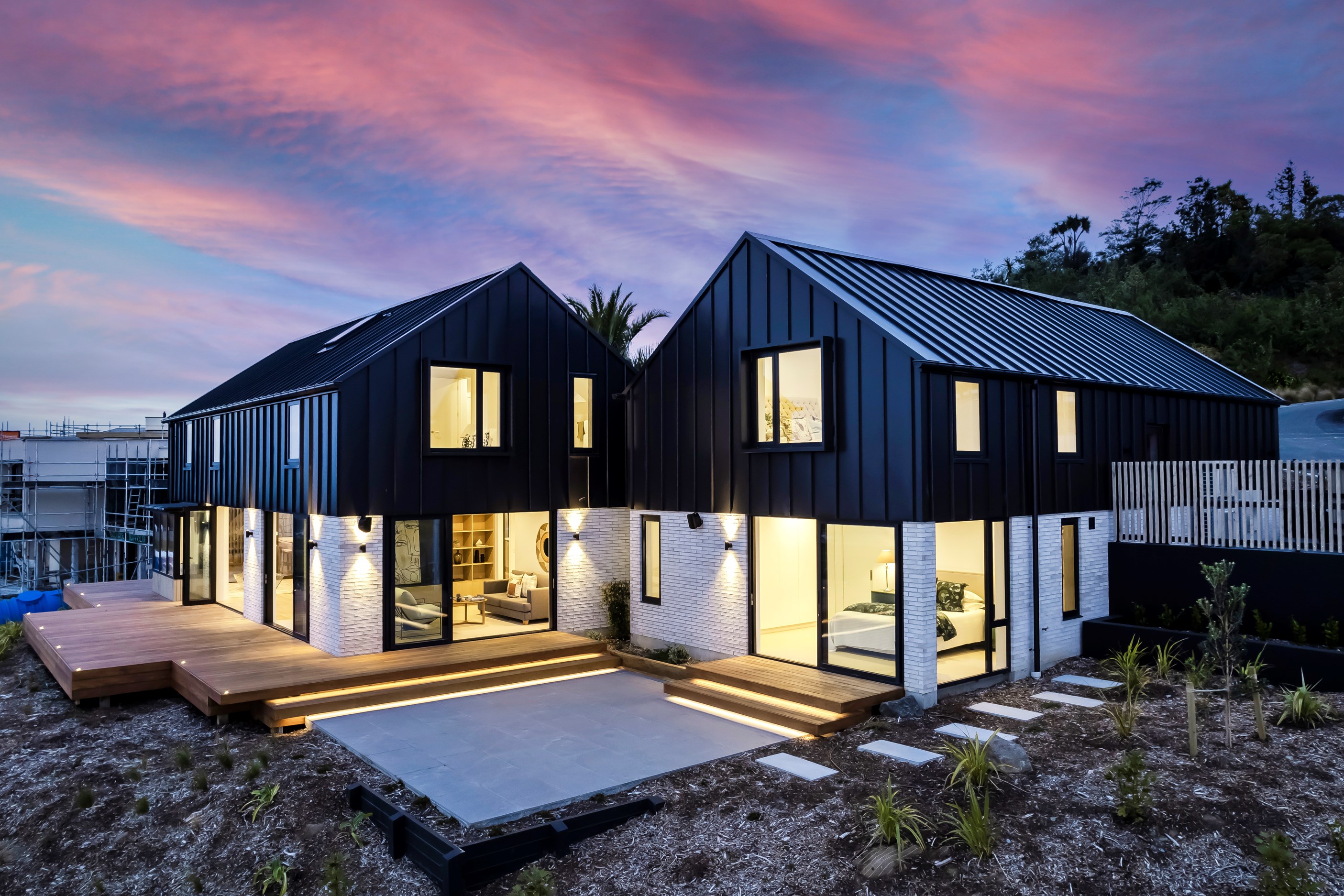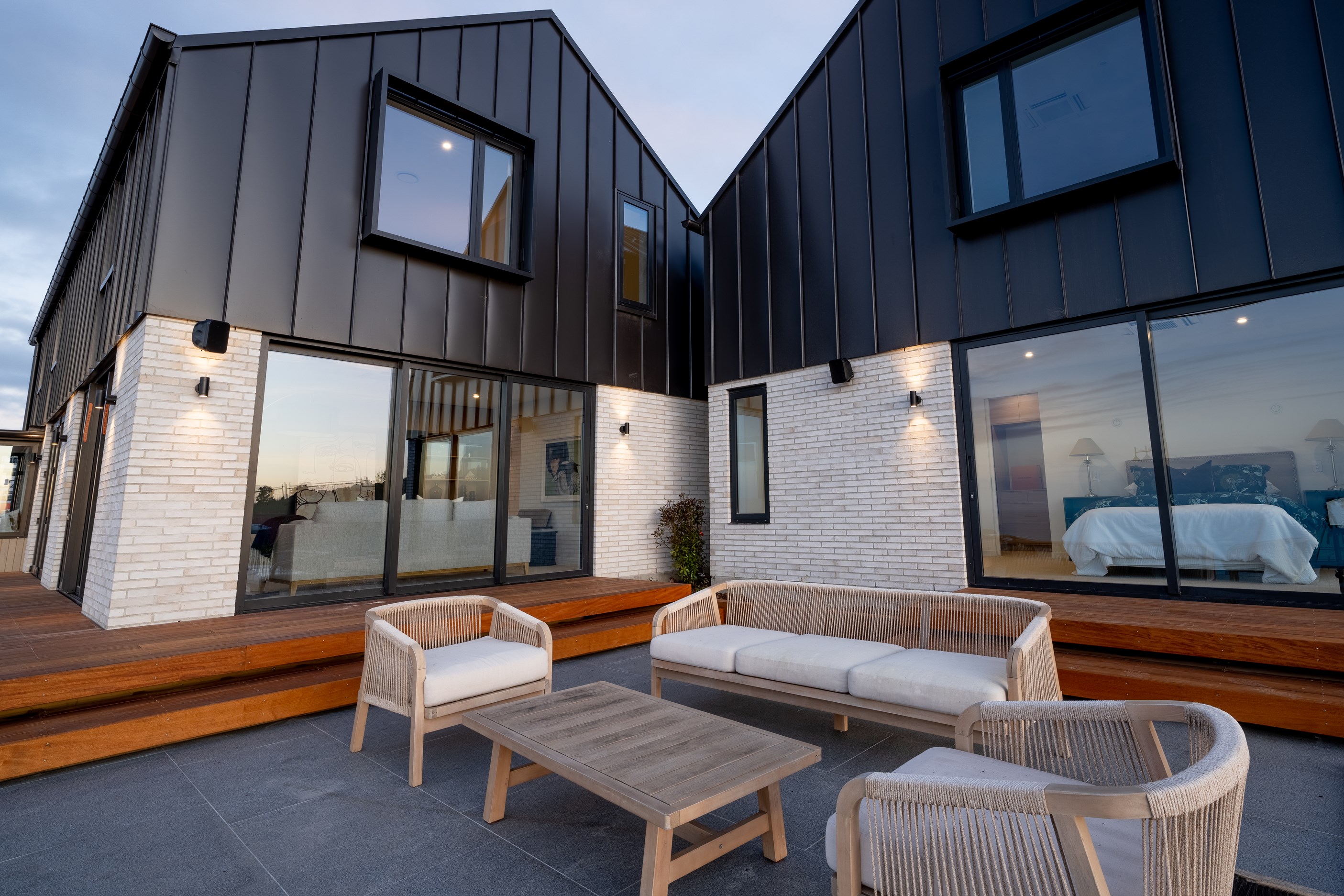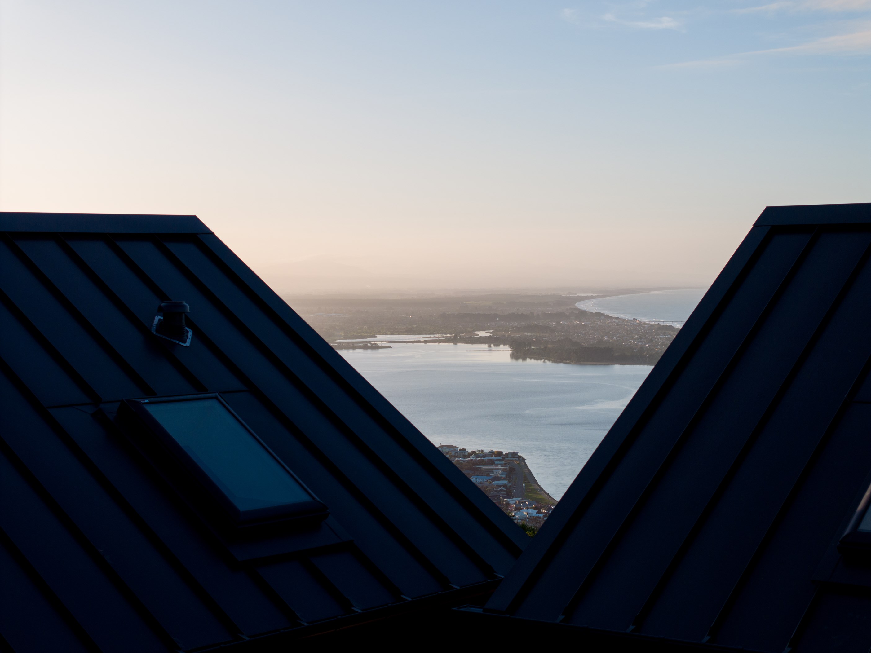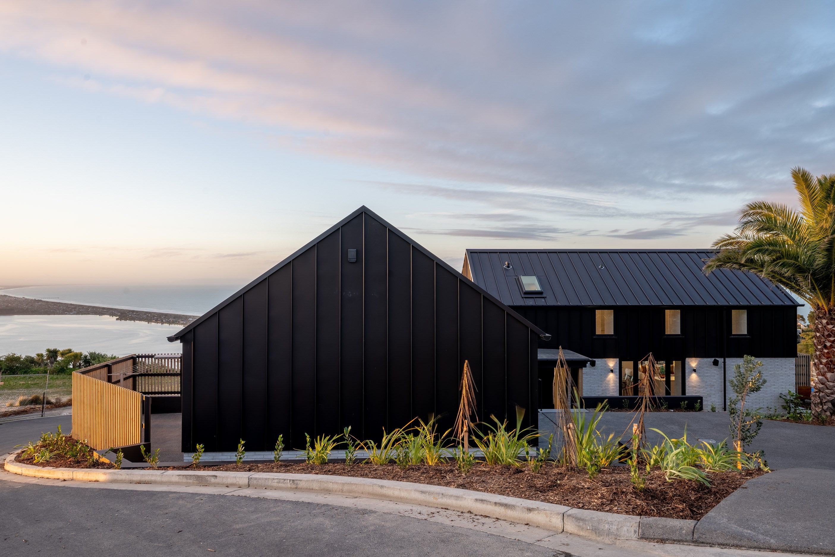 In this bold, high-spec home, two wings add up to twice the delight. Forming a right angle and clad in white brick veneer and dark metal, this five-bedroom house stands out for all the right reasons. From its elevated position, it also captures 180-degree views of sea and land, including the Southshore spit and the Kaikōura Ranges. Despite its grandstand view from high above Sumner, the house and its expansive decking is also sheltered from cool southerly winds. Doors that open straight onto decks, tucked-away patios and steps with up-lighting only add to the outdoor appeal.
