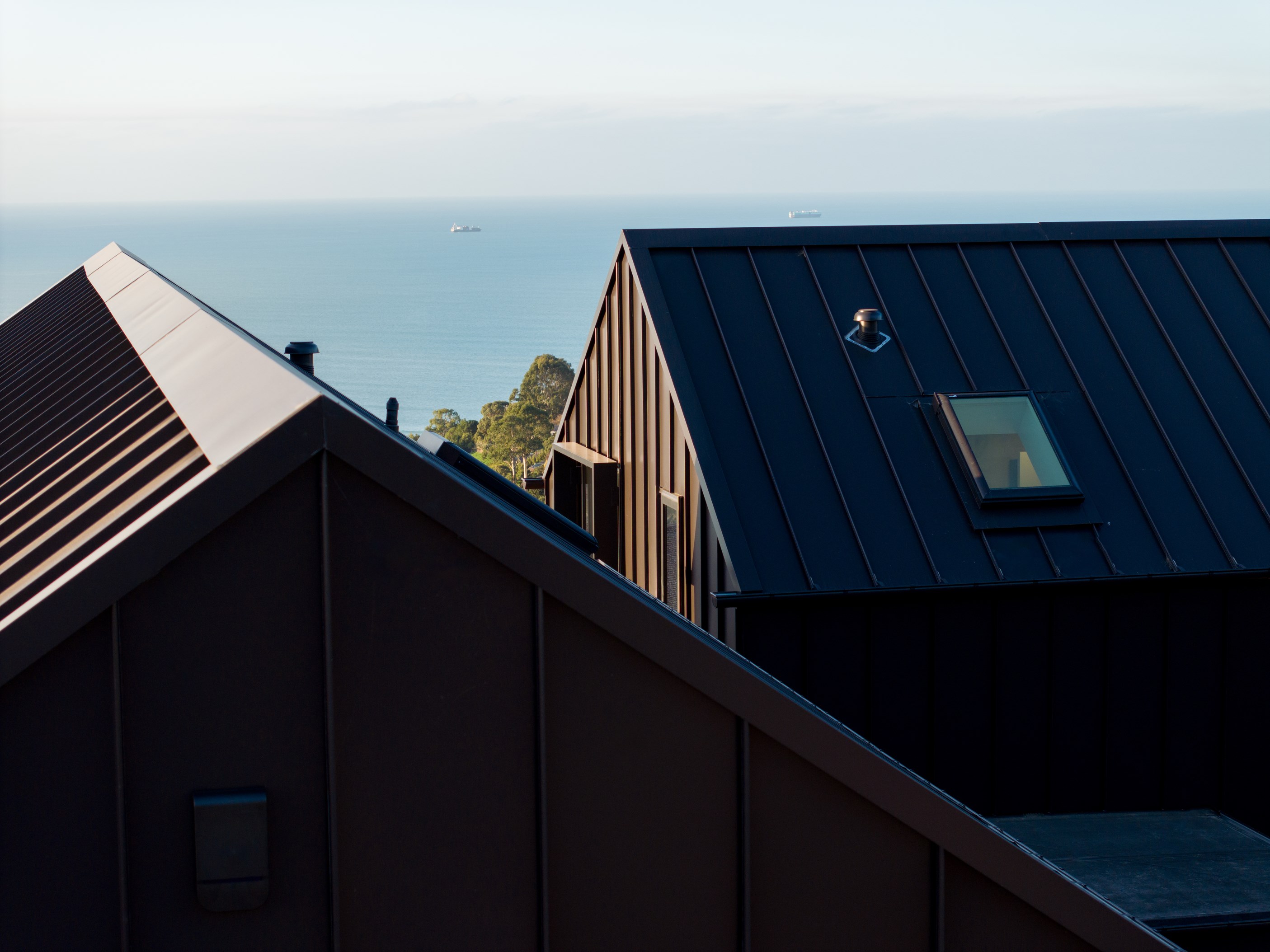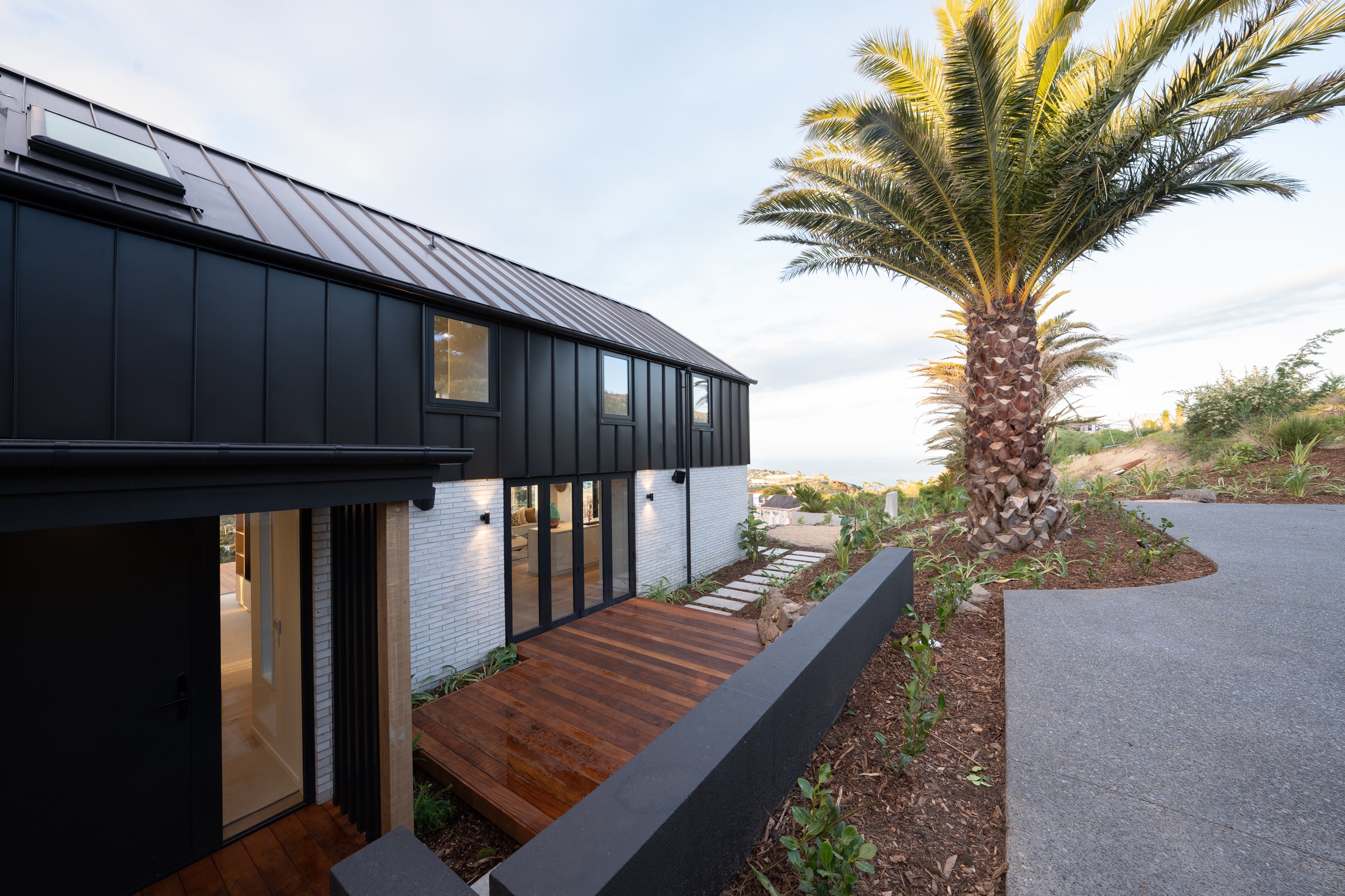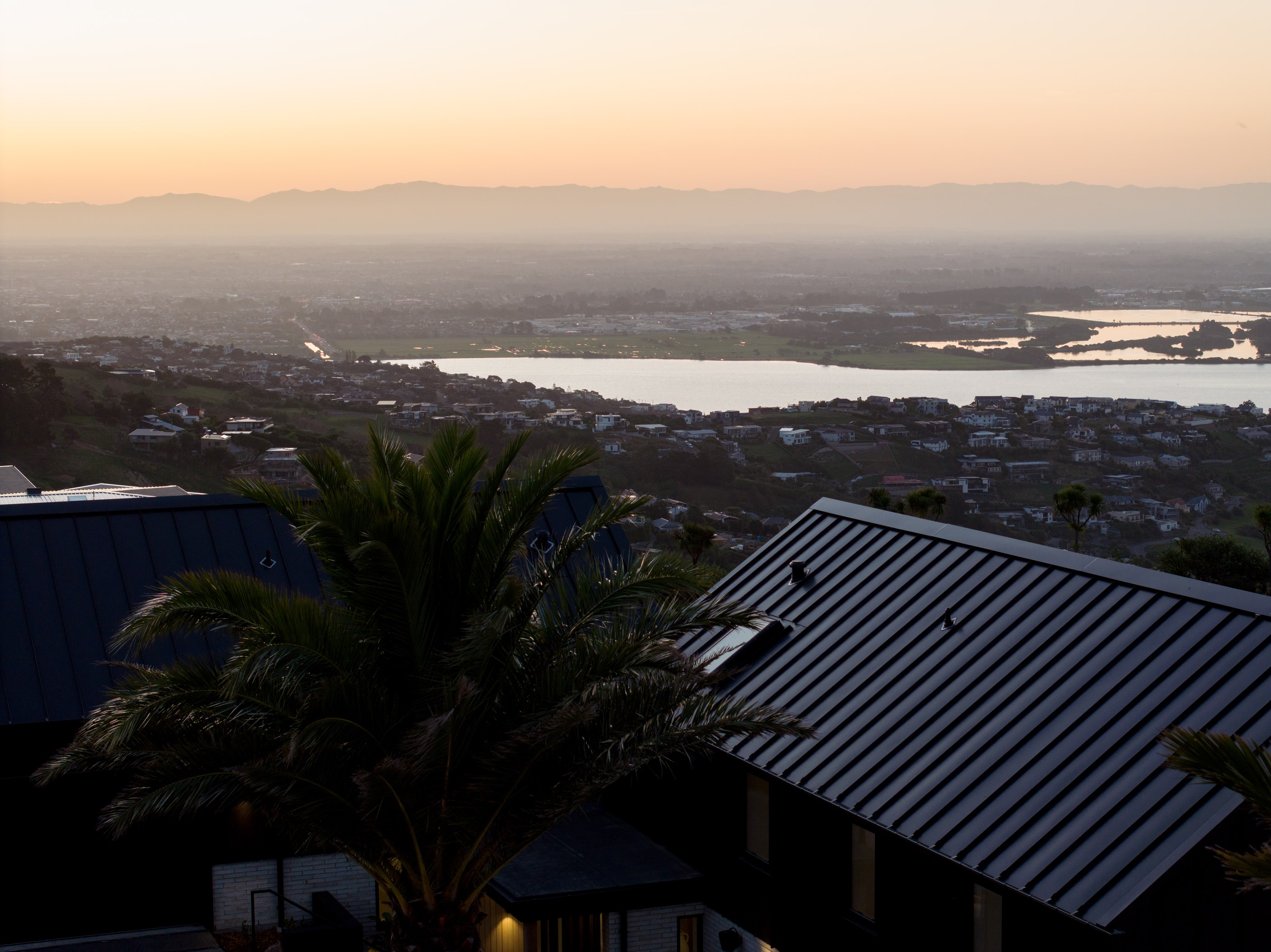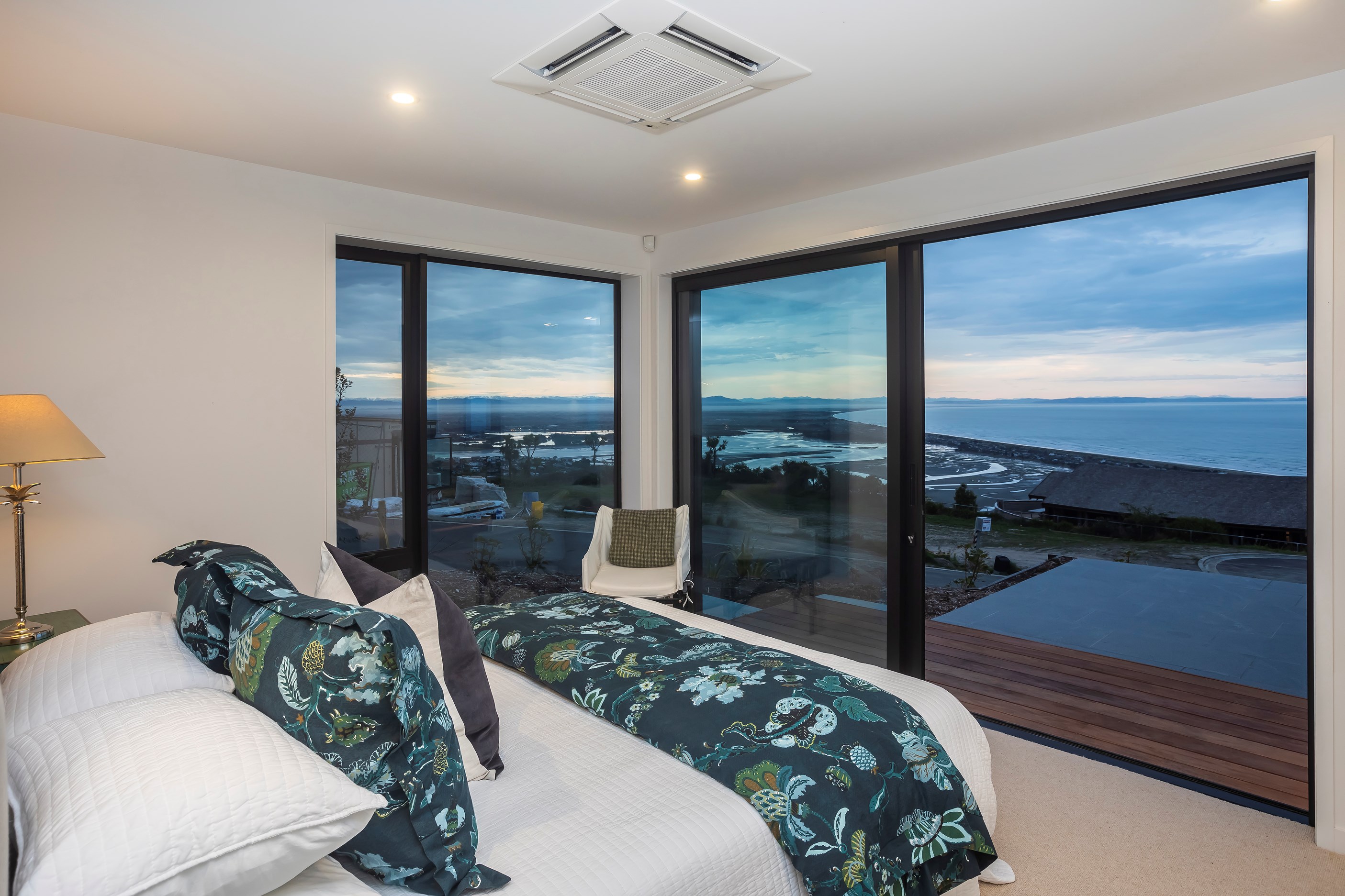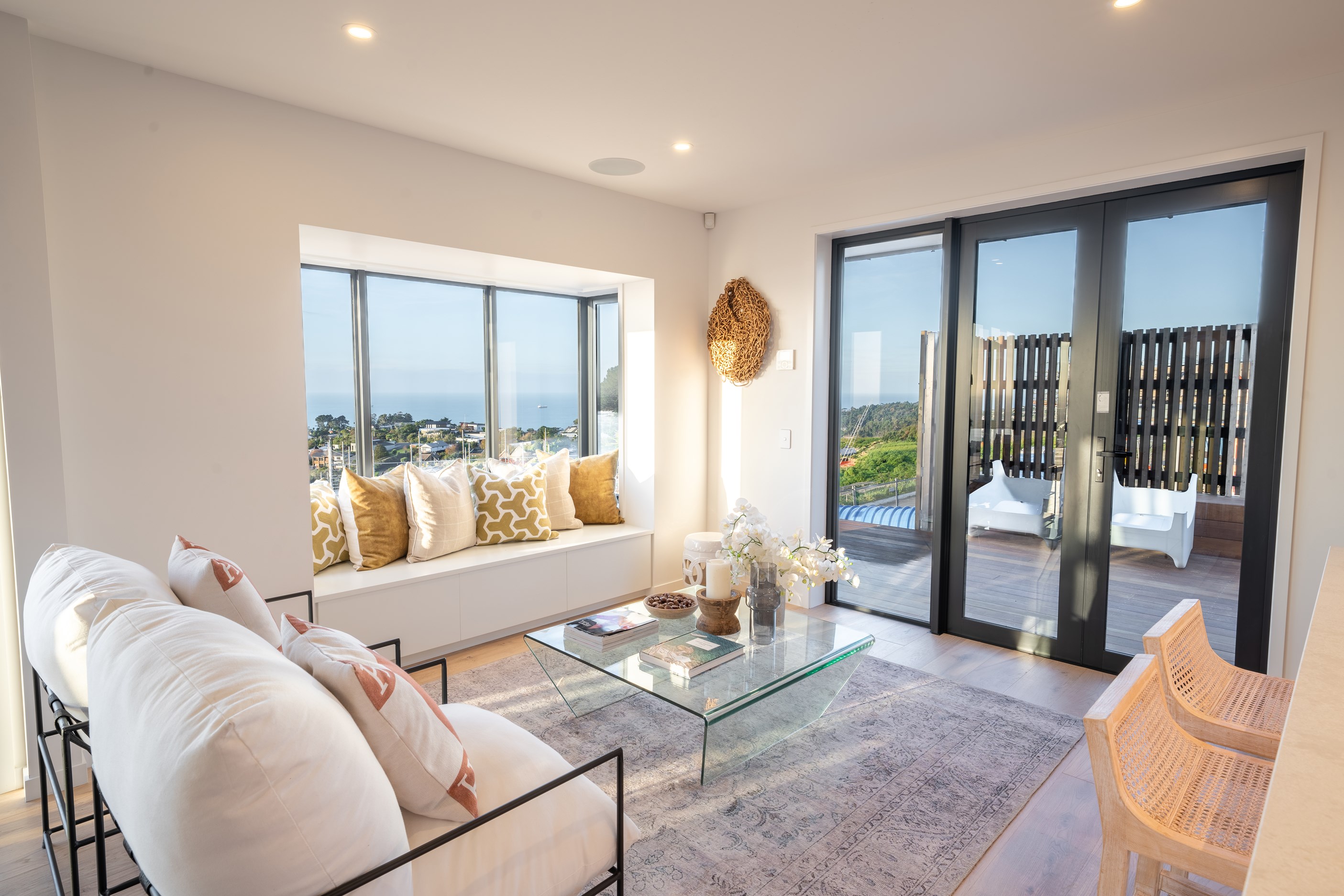 In this bold, high-spec home, two wings add up to twice the delight. Forming a right angle and clad in white brick veneer and dark metal, this five-bedroom house stands out for all the right reasons. From its elevated position, it also captures 180-degree views of sea and land, including the Southshore spit and the Kaikōura Ranges. Despite its grandstand view from high above Sumner, the house and its expansive decking is also sheltered from cool southerly winds. Doors that open straight onto decks, tucked-away patios and steps with up-lighting only add to the outdoor appeal.
