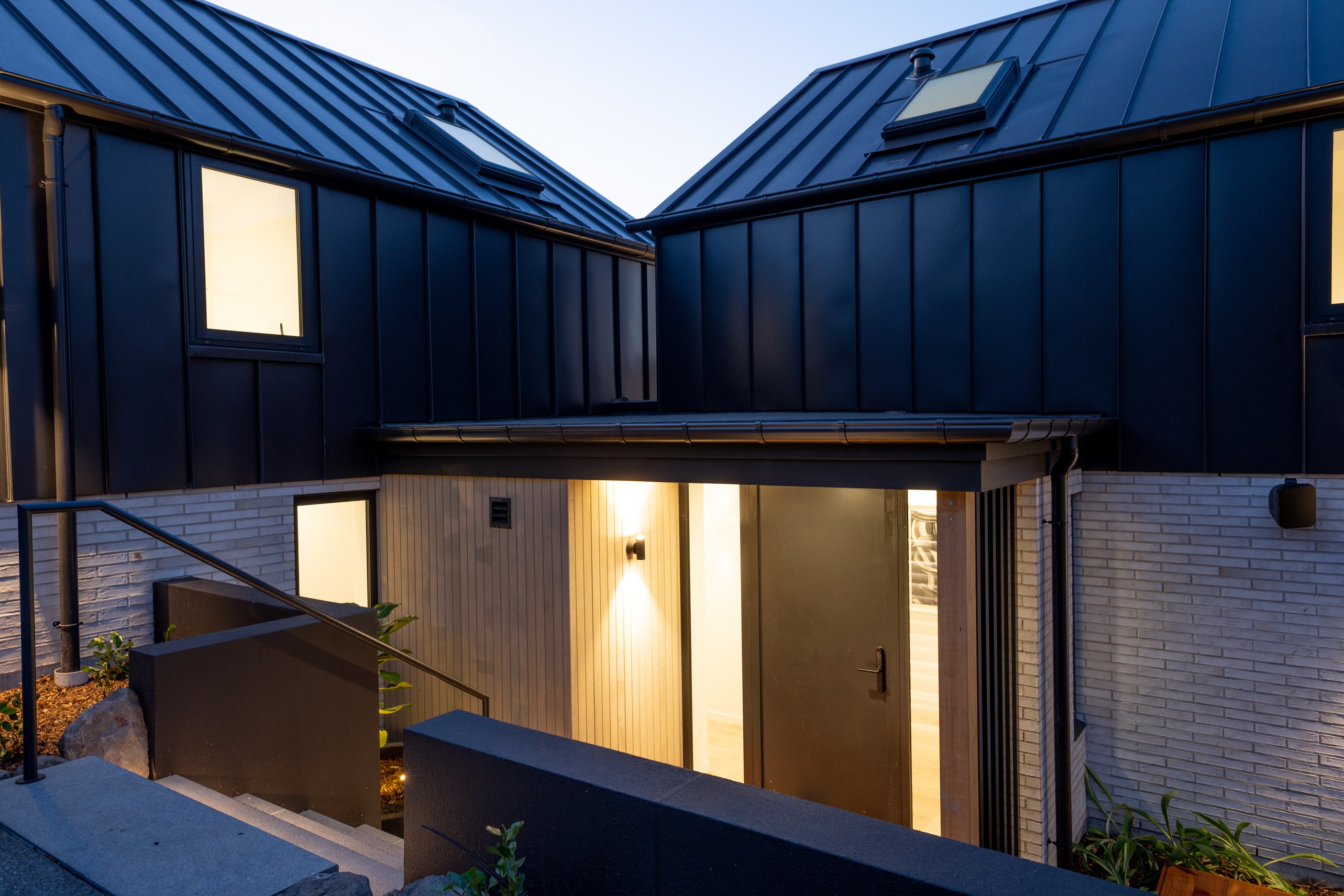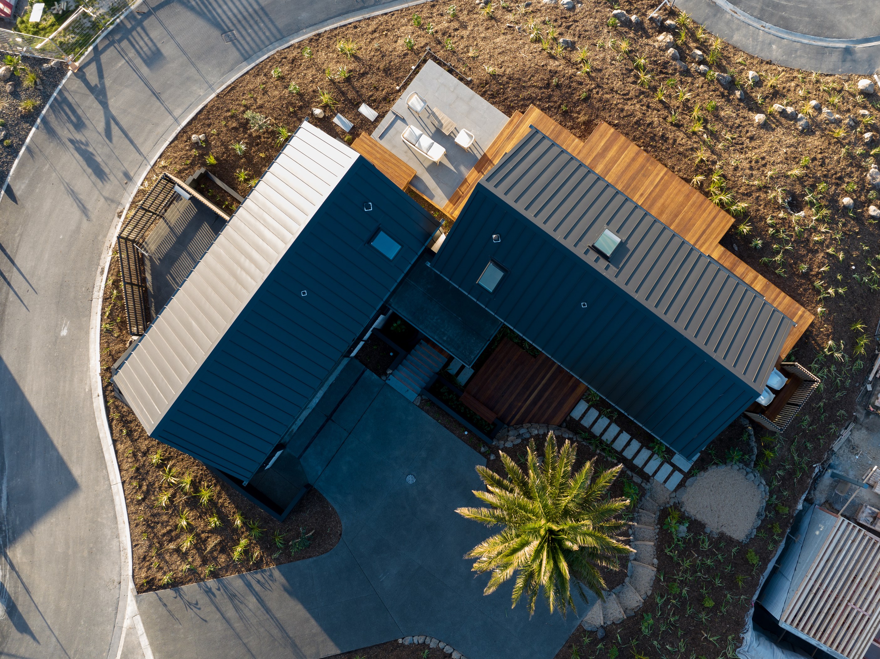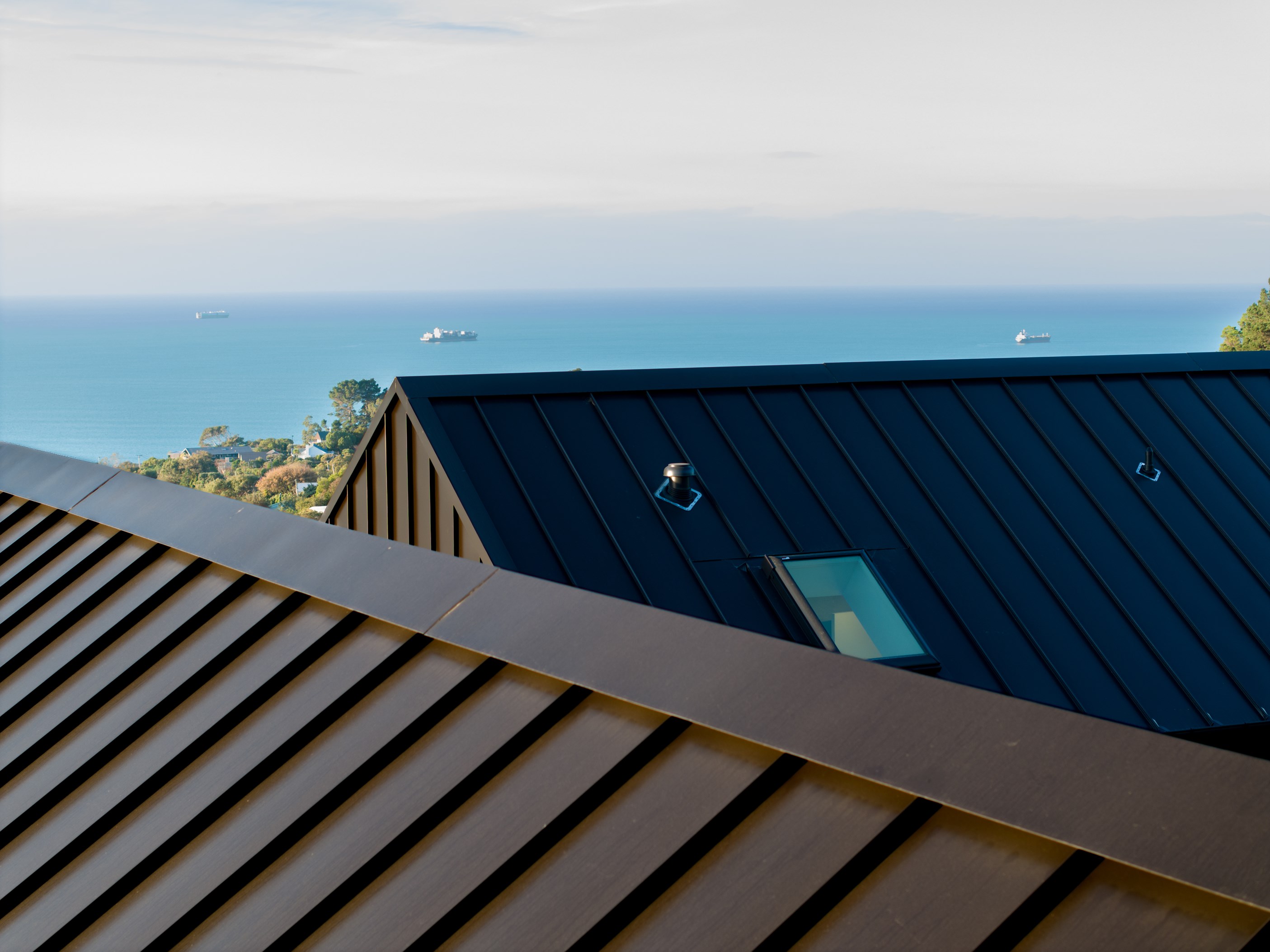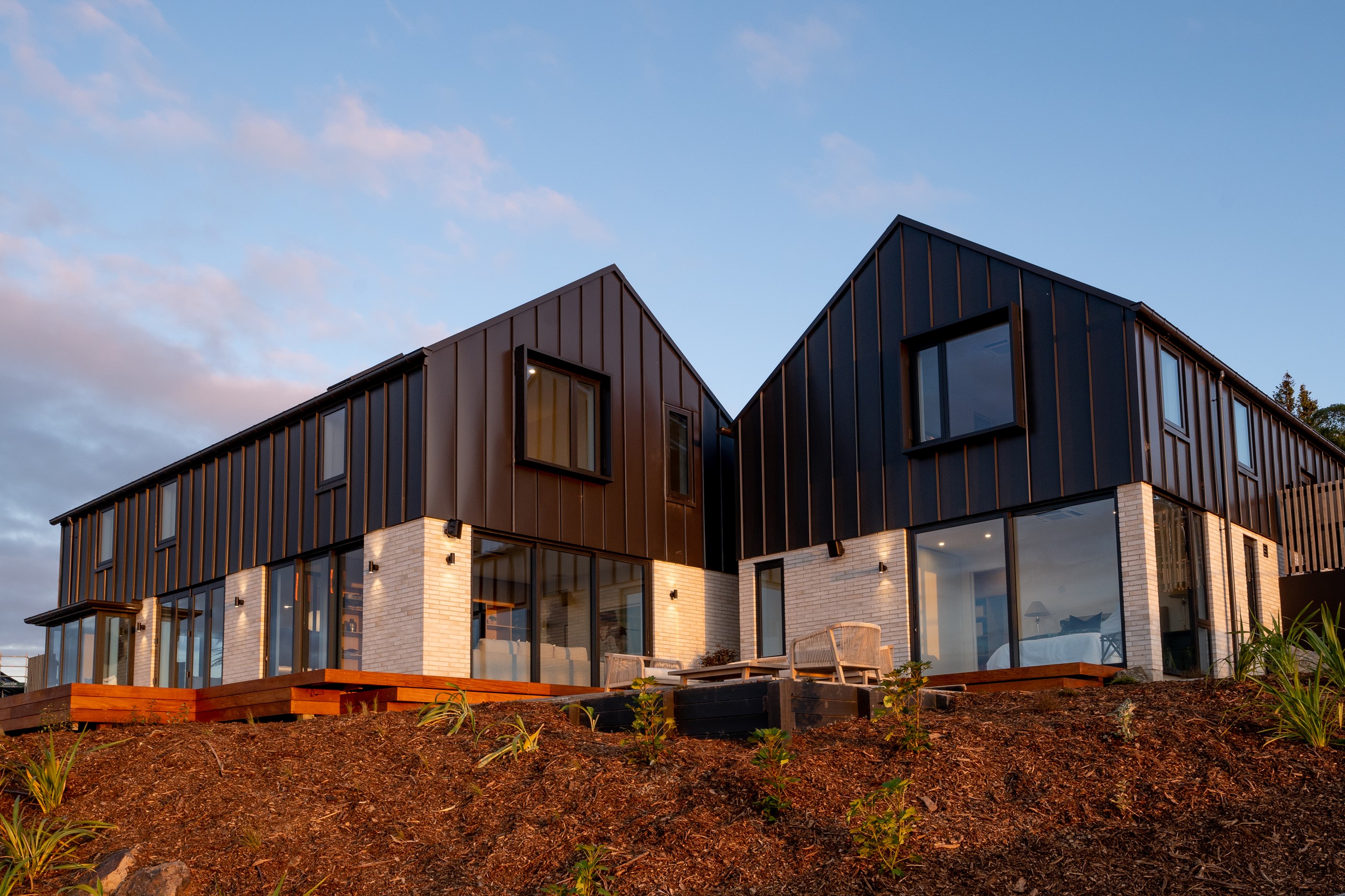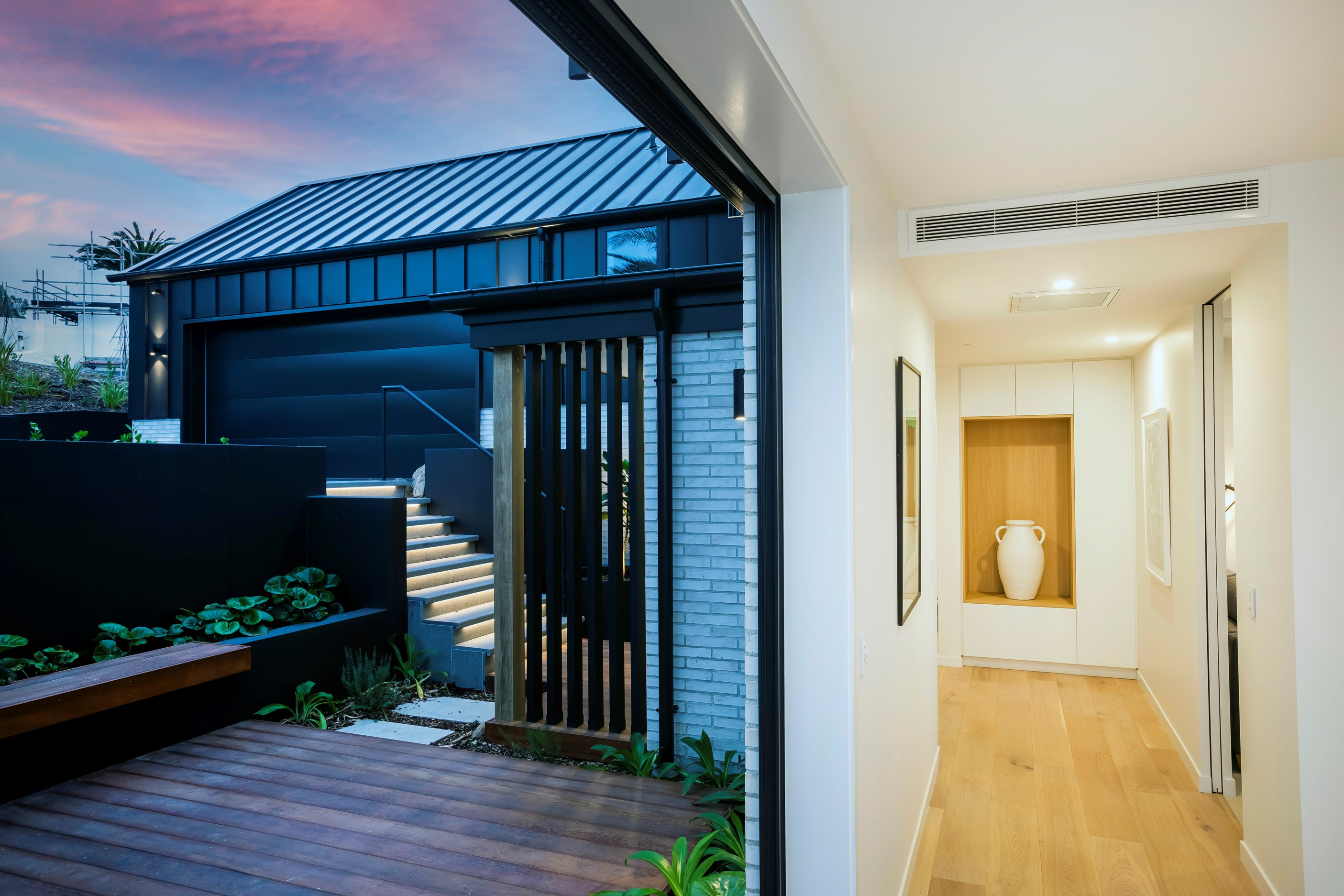 In this bold, high-spec home, two wings add up to twice the delight. Forming a right angle and clad in white brick veneer and dark metal, this five-bedroom house stands out for all the right reasons. From its elevated position, it also captures 180-degree views of sea and land, including the Southshore spit and the Kaikōura Ranges. Despite its grandstand view from high above Sumner, the house and its expansive decking is also sheltered from cool southerly winds. Doors that open straight onto decks, tucked-away patios and steps with up-lighting only add to the outdoor appeal.
