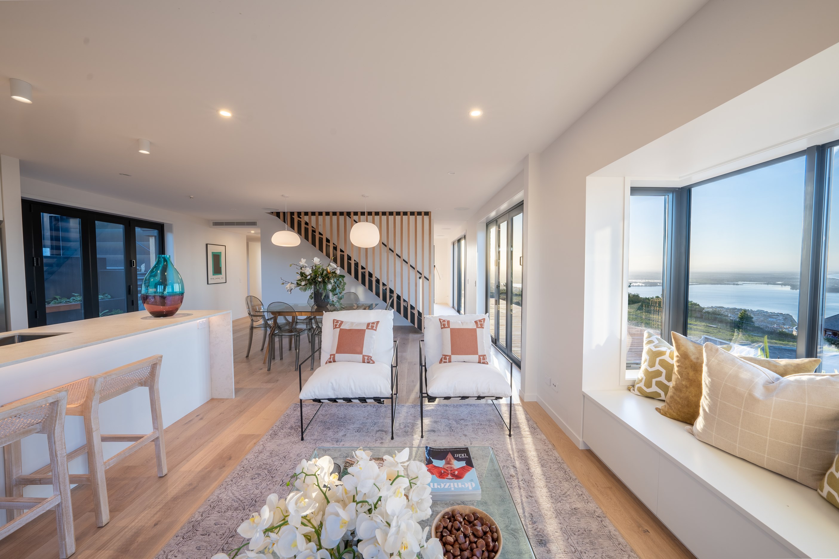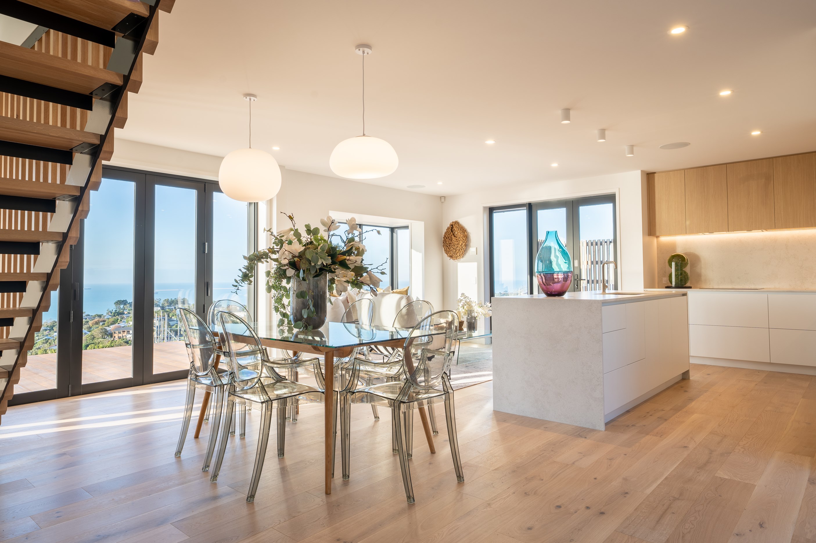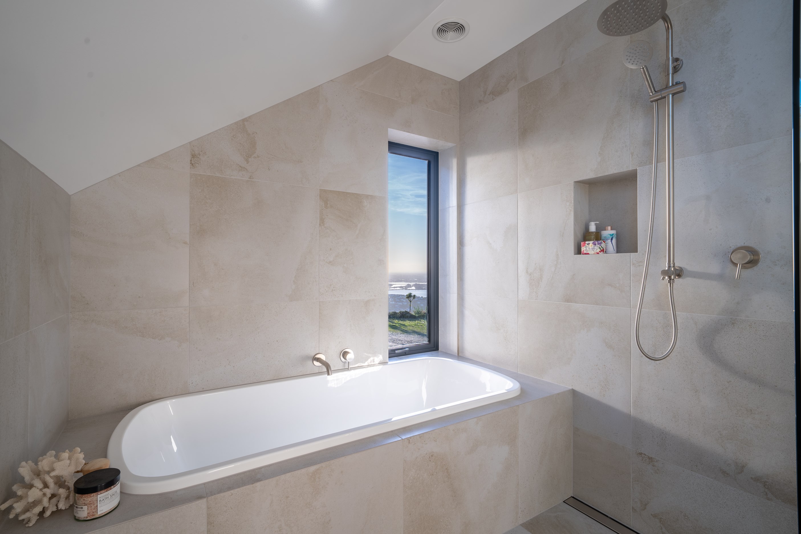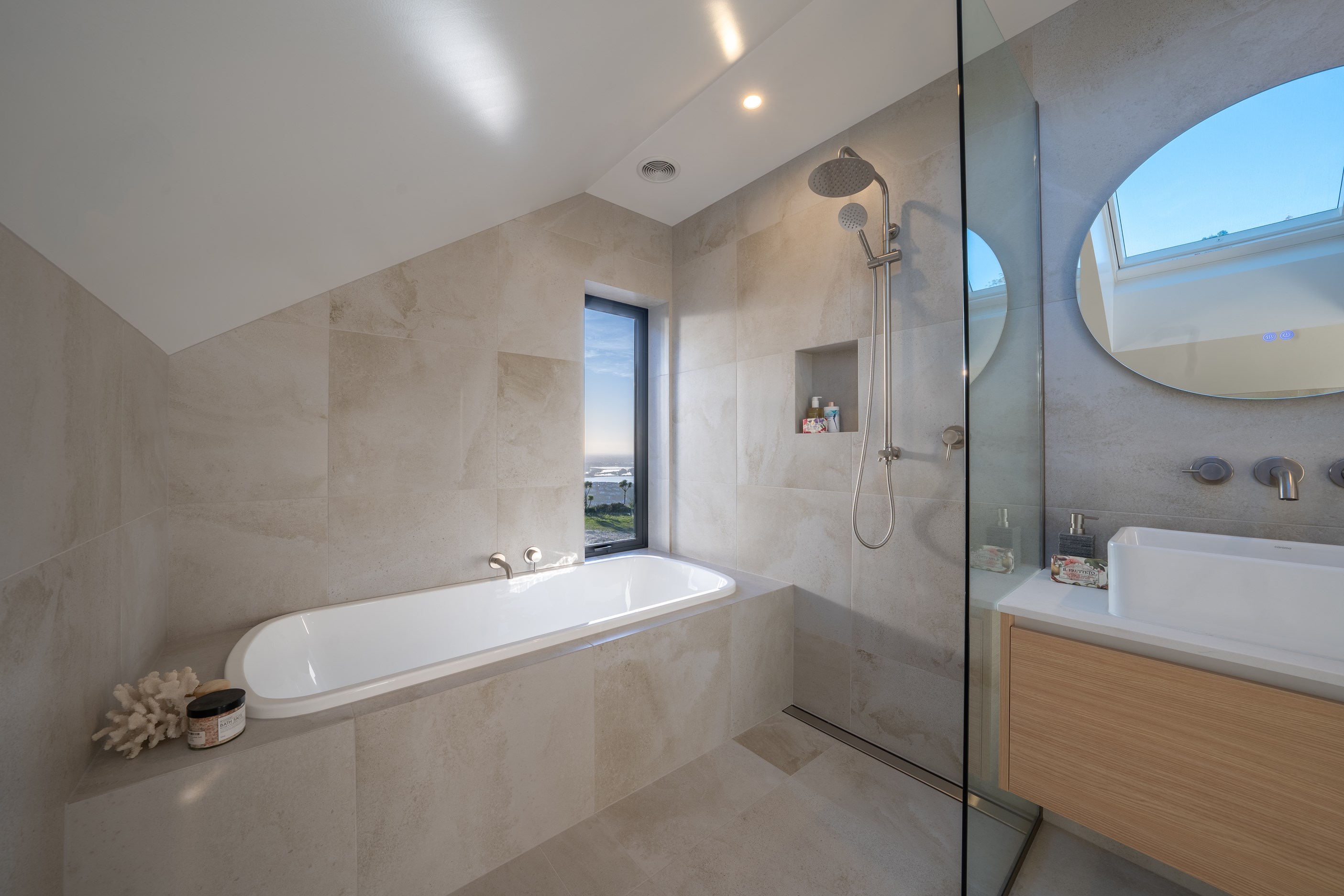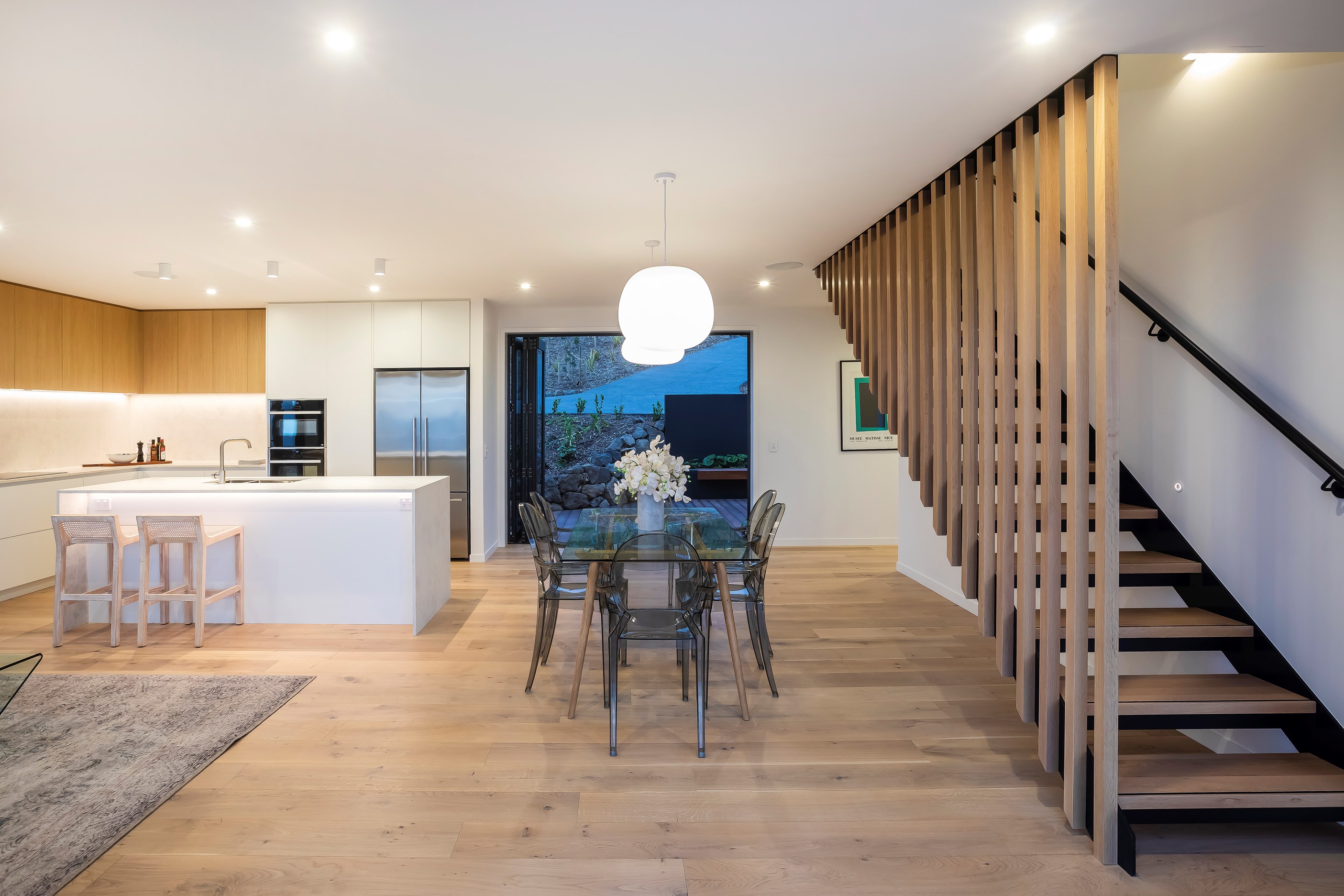 Clean lines and neutral tones are hallmarks of the interior and the overall vibe is light and beachy in style. It’s utterly chic and does not diminish from nature’s works of art outside. That’s not to say it’s devoid of highlights – the white-and-wood kitchen is a stand-out feature, as is the oak-and-steel staircase. The three bathrooms are tiled and luxurious. On the lower floor you’ll find an open-plan kitchen, dining and living space that flows onto a terrace, a separate sitting room and the main bedroom with ensuite. Head up those stylish stairs and you’ll find three bedrooms and a bathroom. Above the double garage and accessed by another staircase is a guest suite and vast attic storage space. All that’s left for the owners to do is to soak in what nature and Blair Ward Construction have served up.