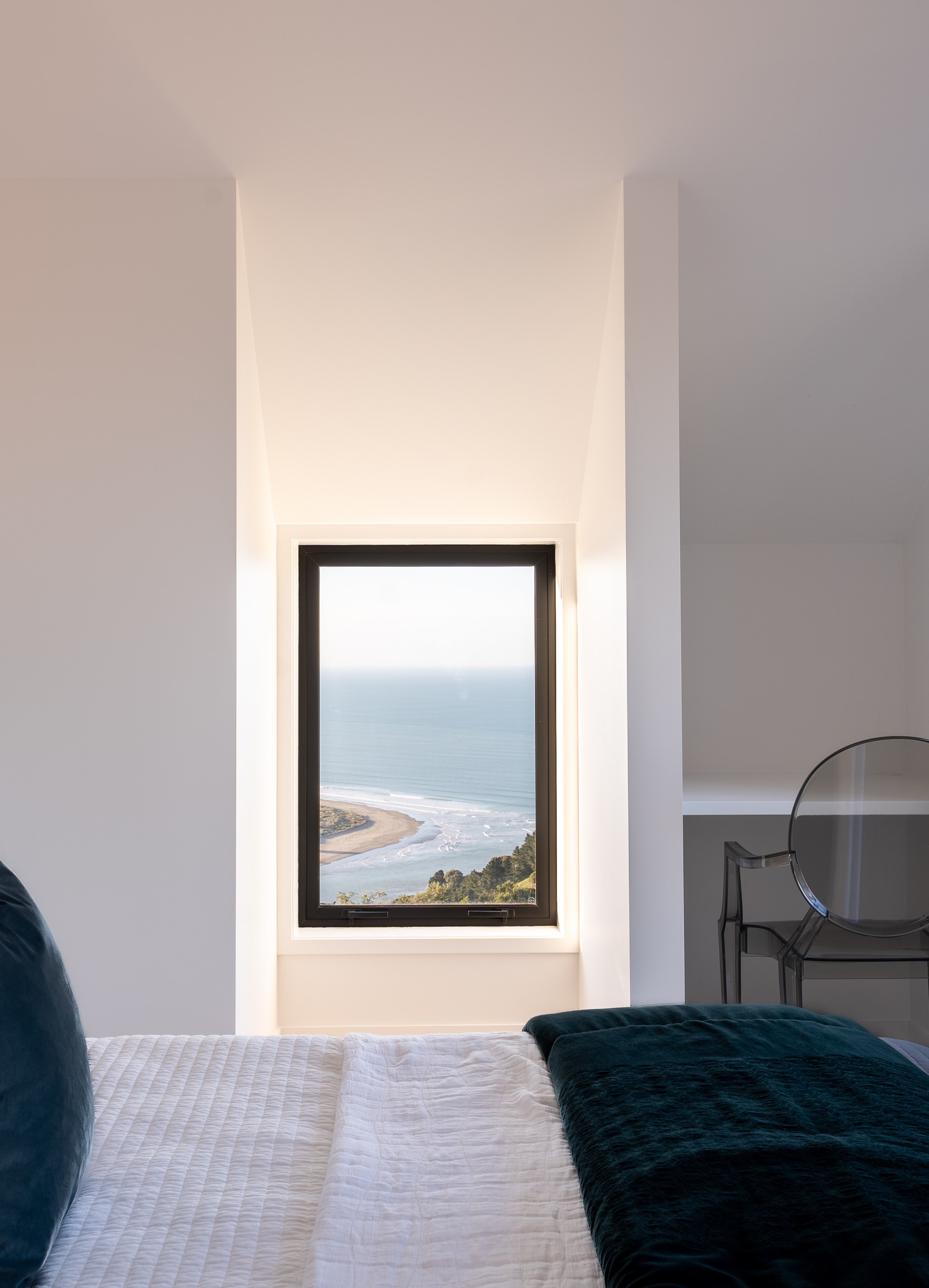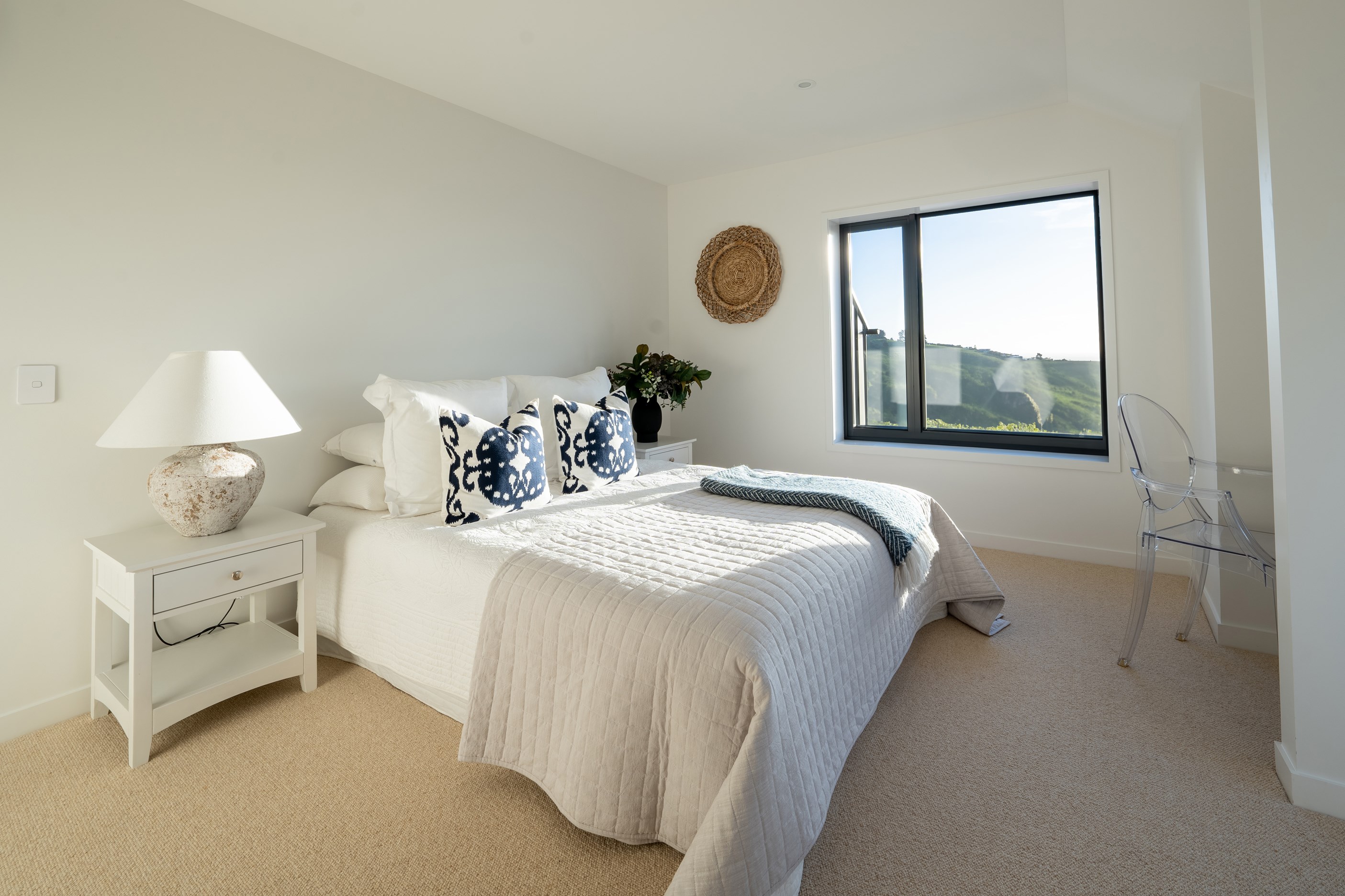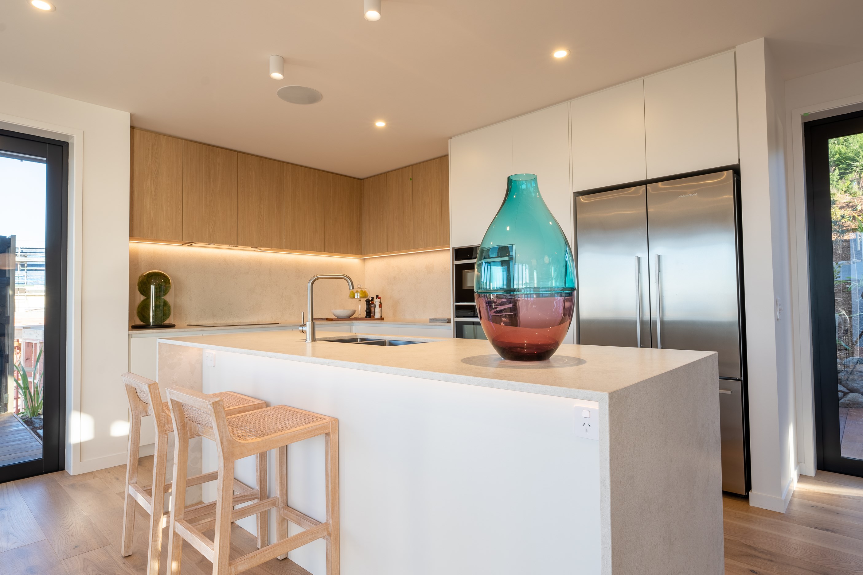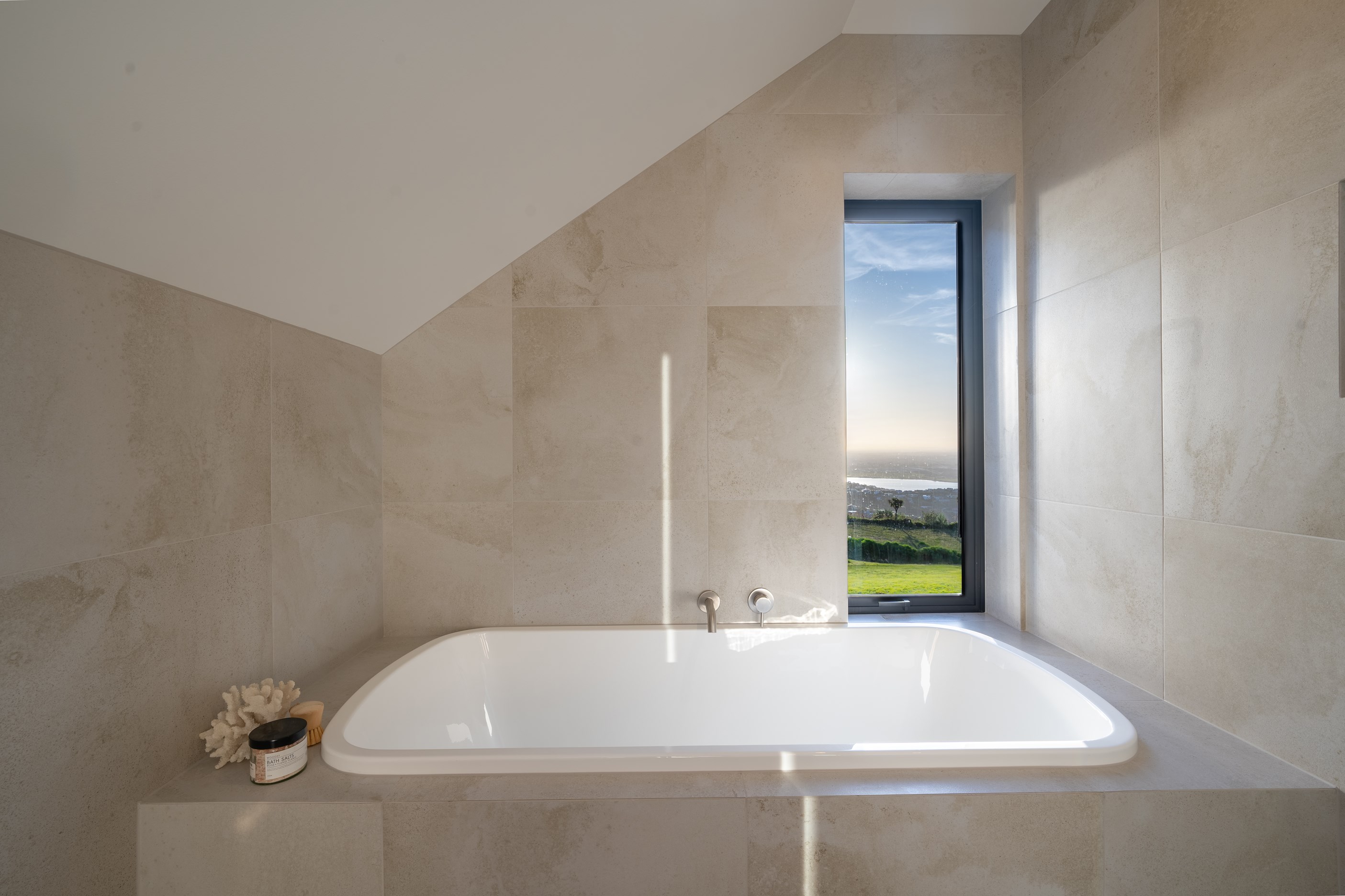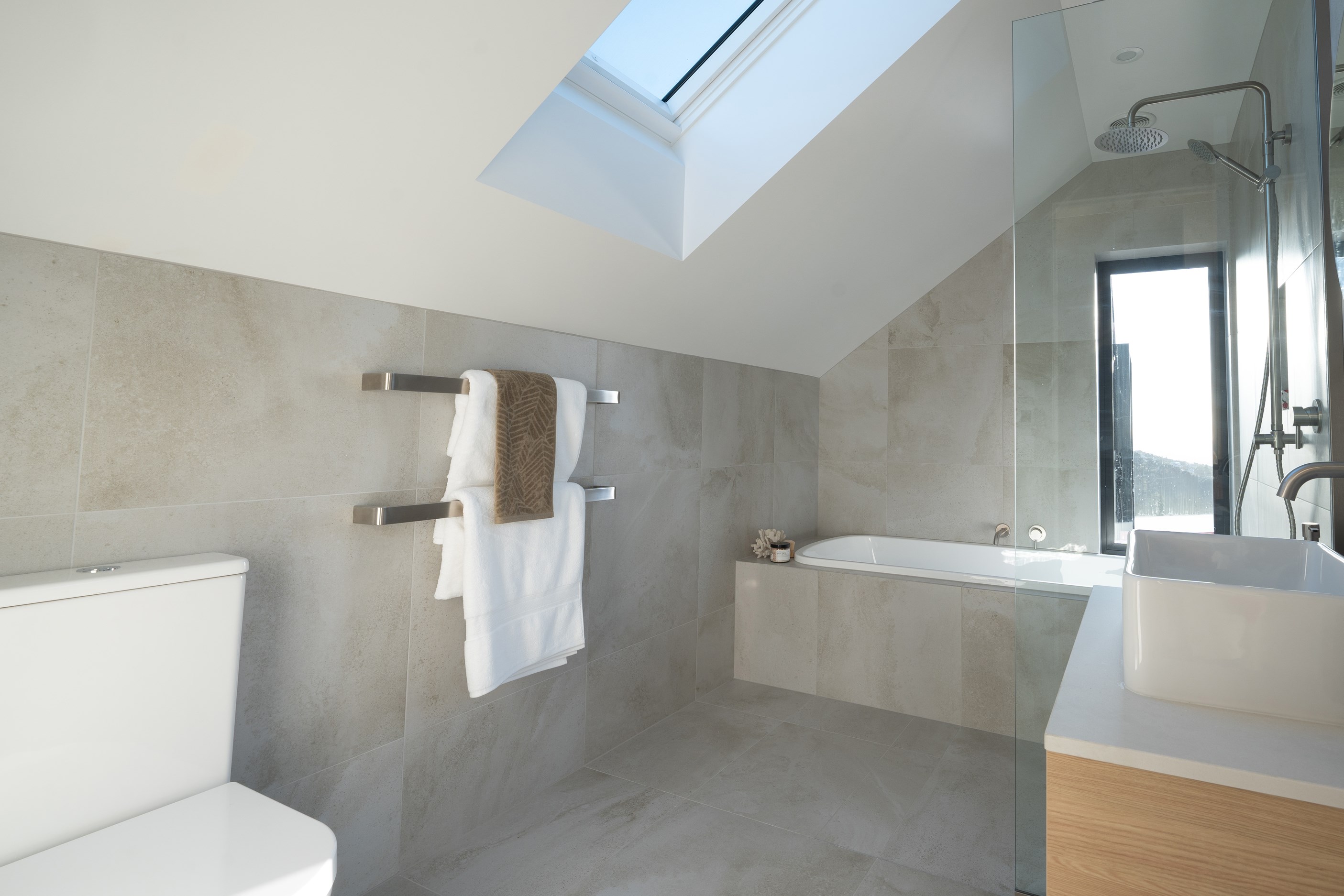 Clean lines and neutral tones are hallmarks of the interior and the overall vibe is light and beachy in style. It’s utterly chic and does not diminish from nature’s works of art outside. That’s not to say it’s devoid of highlights – the white-and-wood kitchen is a stand-out feature, as is the oak-and-steel staircase. The three bathrooms are tiled and luxurious. On the lower floor you’ll find an open-plan kitchen, dining and living space that flows onto a terrace, a separate sitting room and the main bedroom with ensuite. Head up those stylish stairs and you’ll find three bedrooms and a bathroom. Above the double garage and accessed by another staircase is a guest suite and vast attic storage space. All that’s left for the owners to do is to soak in what nature and Blair Ward Construction have served up.