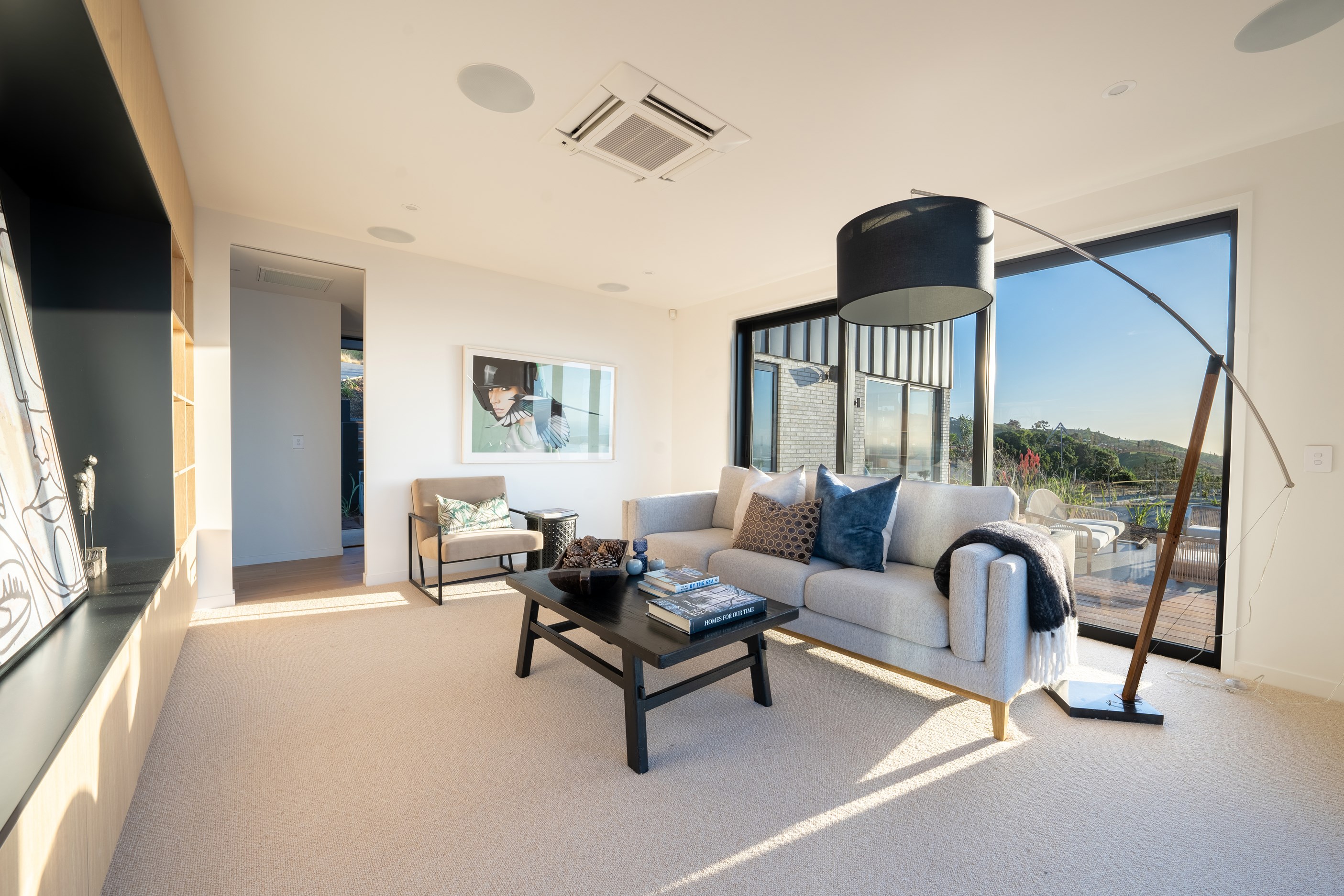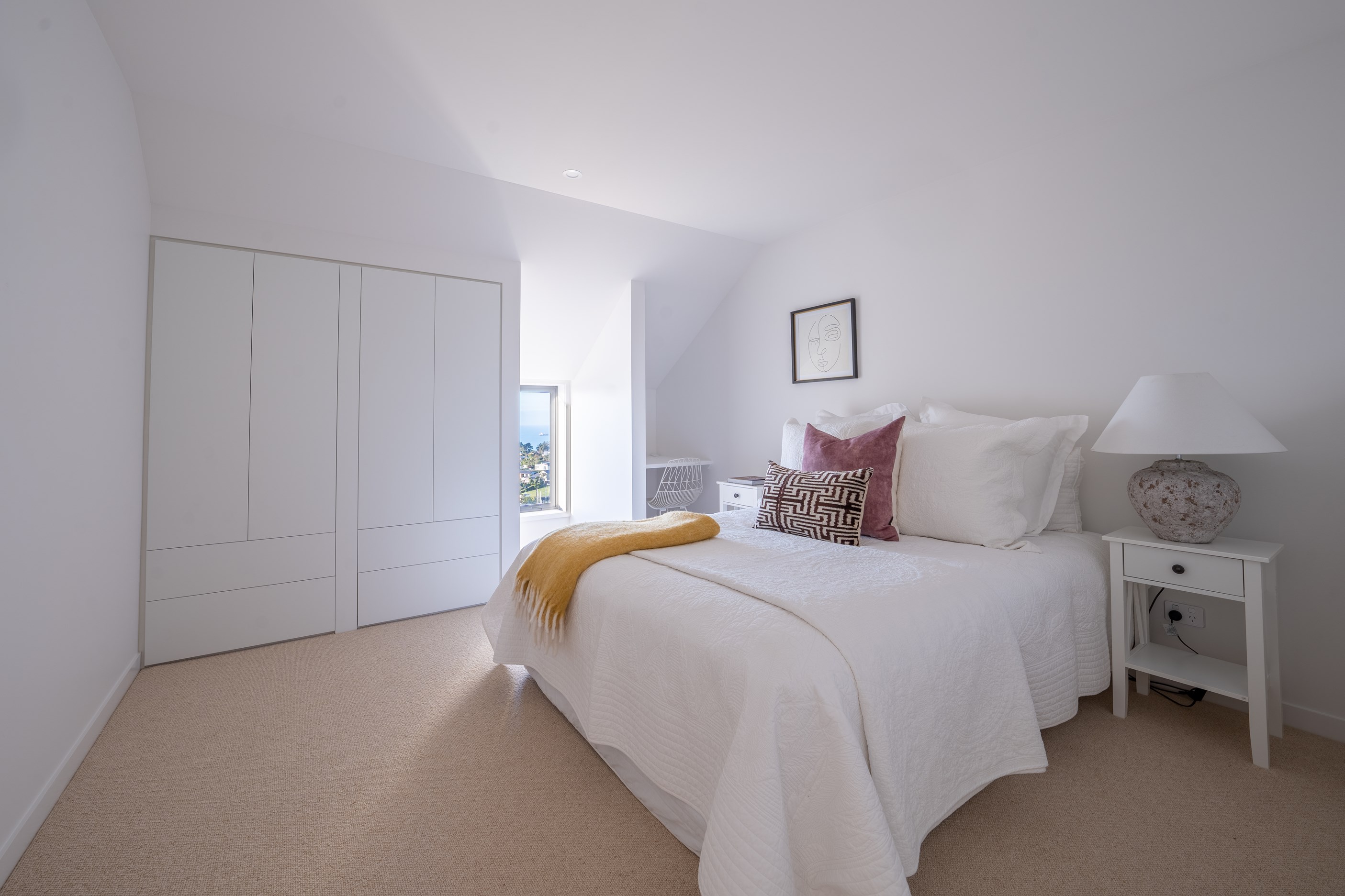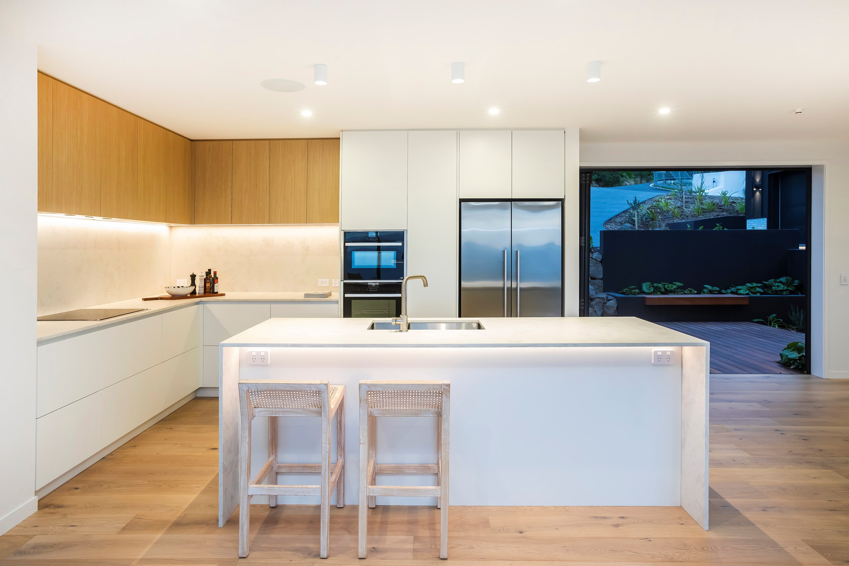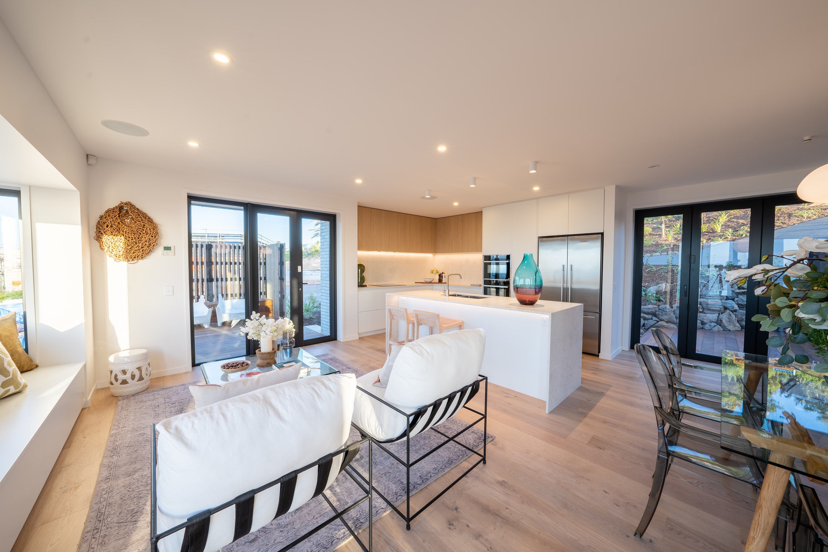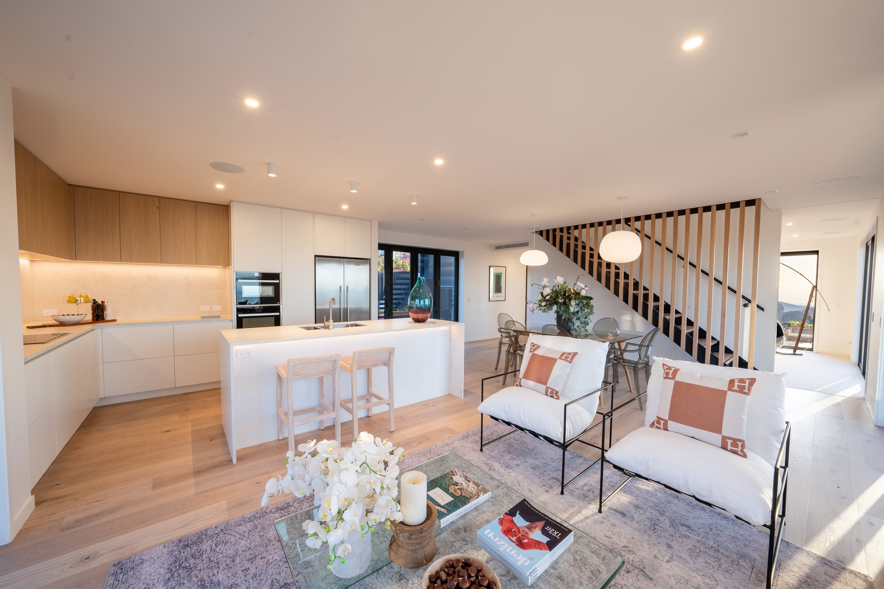 Clean lines and neutral tones are hallmarks of the interior and the overall vibe is light and beachy in style. It’s utterly chic and does not diminish from nature’s works of art outside. That’s not to say it’s devoid of highlights – the white-and-wood kitchen is a stand-out feature, as is the oak-and-steel staircase. The three bathrooms are tiled and luxurious. On the lower floor you’ll find an open-plan kitchen, dining and living space that flows onto a terrace, a separate sitting room and the main bedroom with ensuite. Head up those stylish stairs and you’ll find three bedrooms and a bathroom. Above the double garage and accessed by another staircase is a guest suite and vast attic storage space. All that’s left for the owners to do is to soak in what nature and Blair Ward Construction have served up.