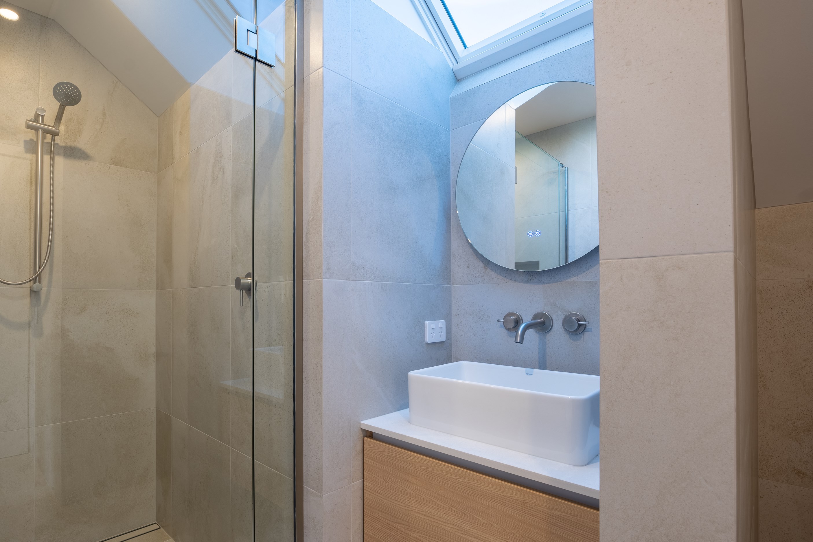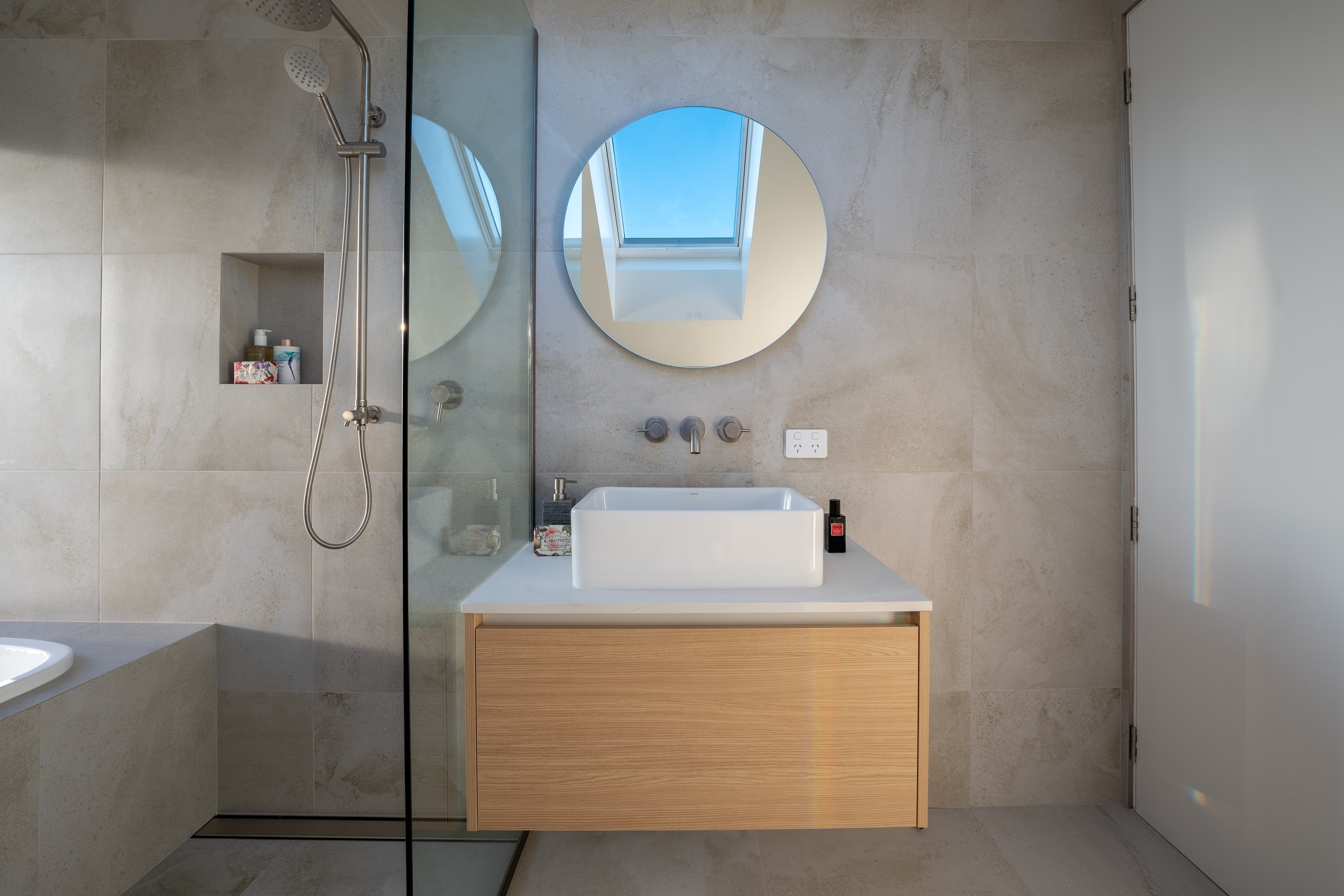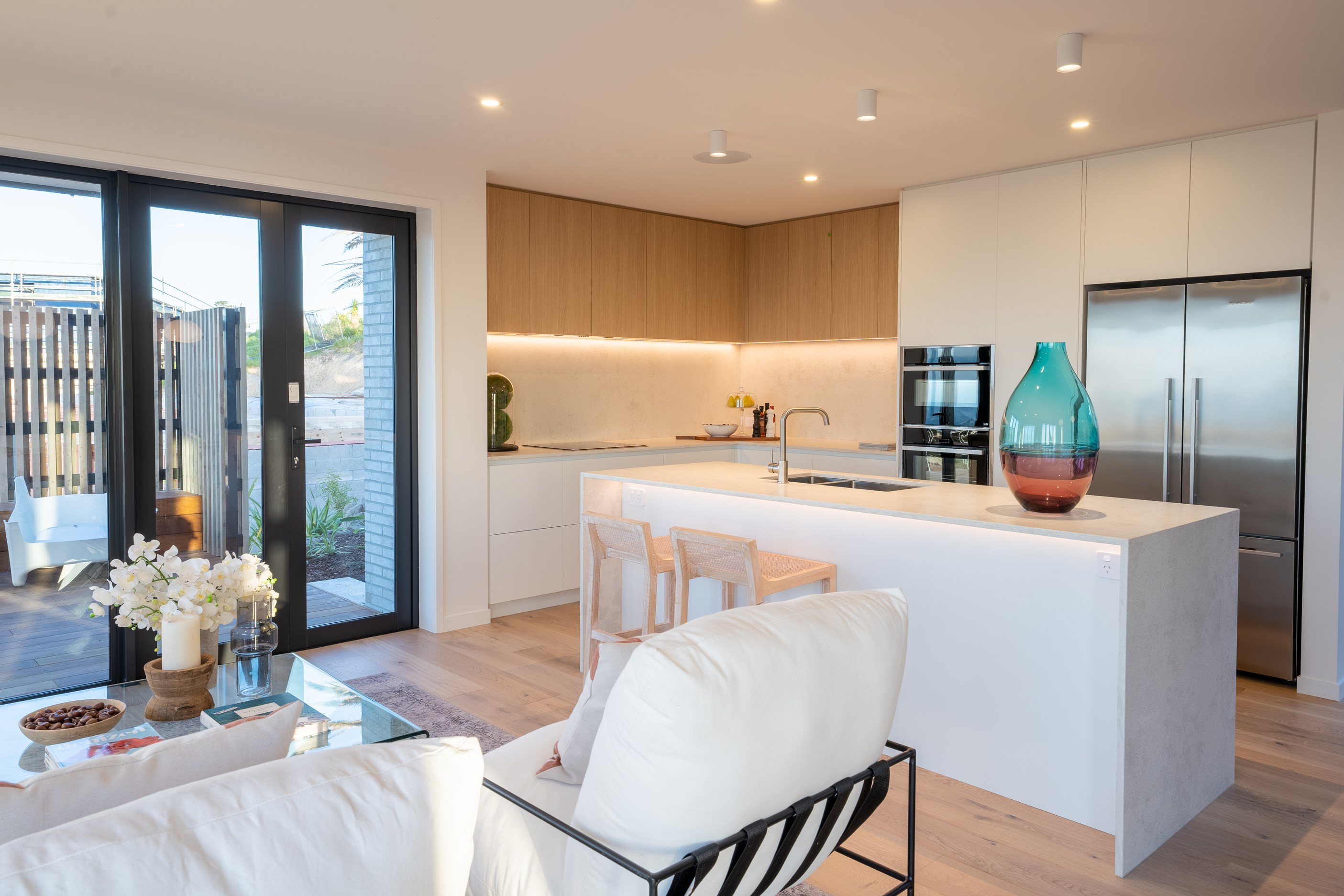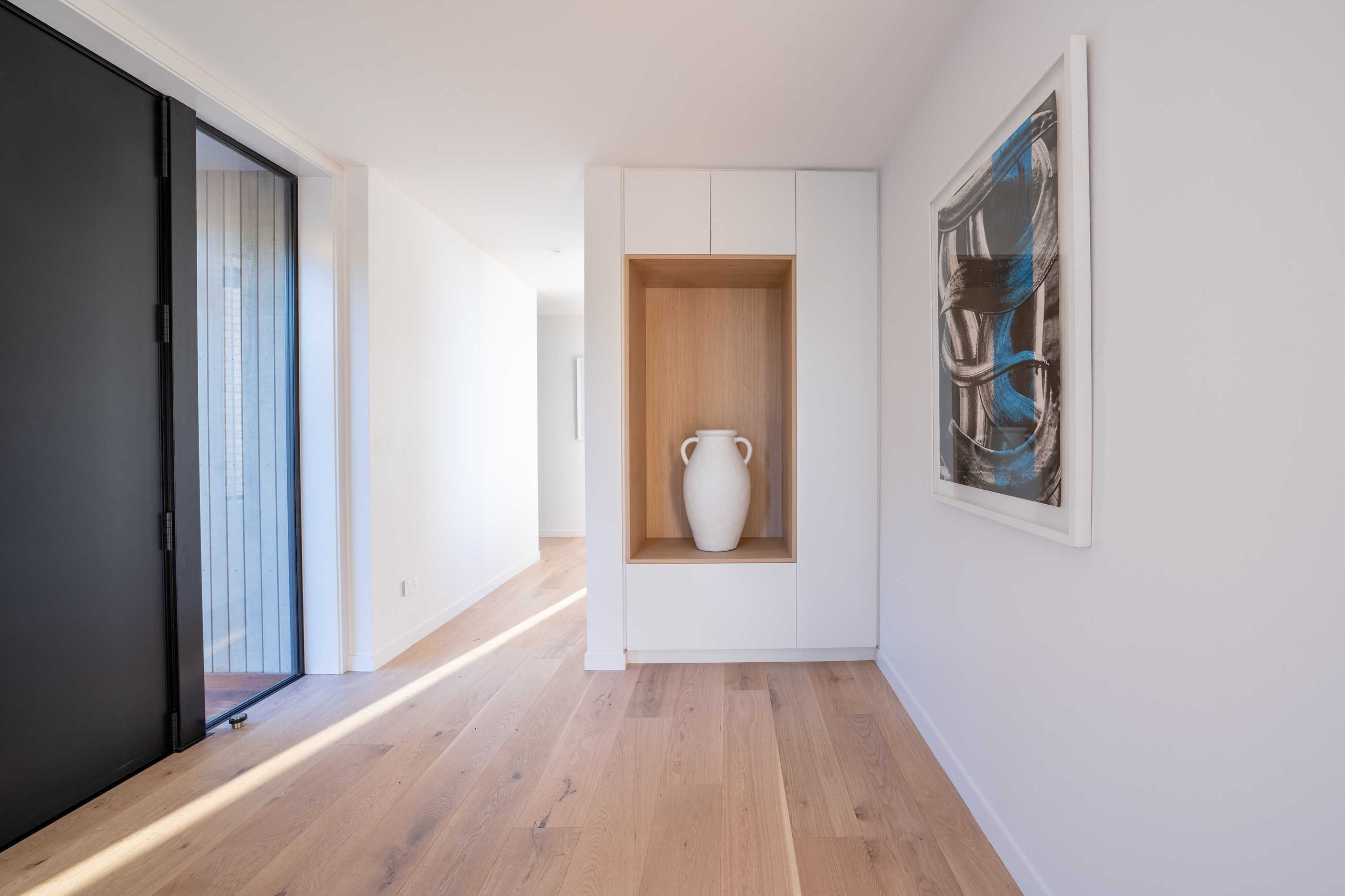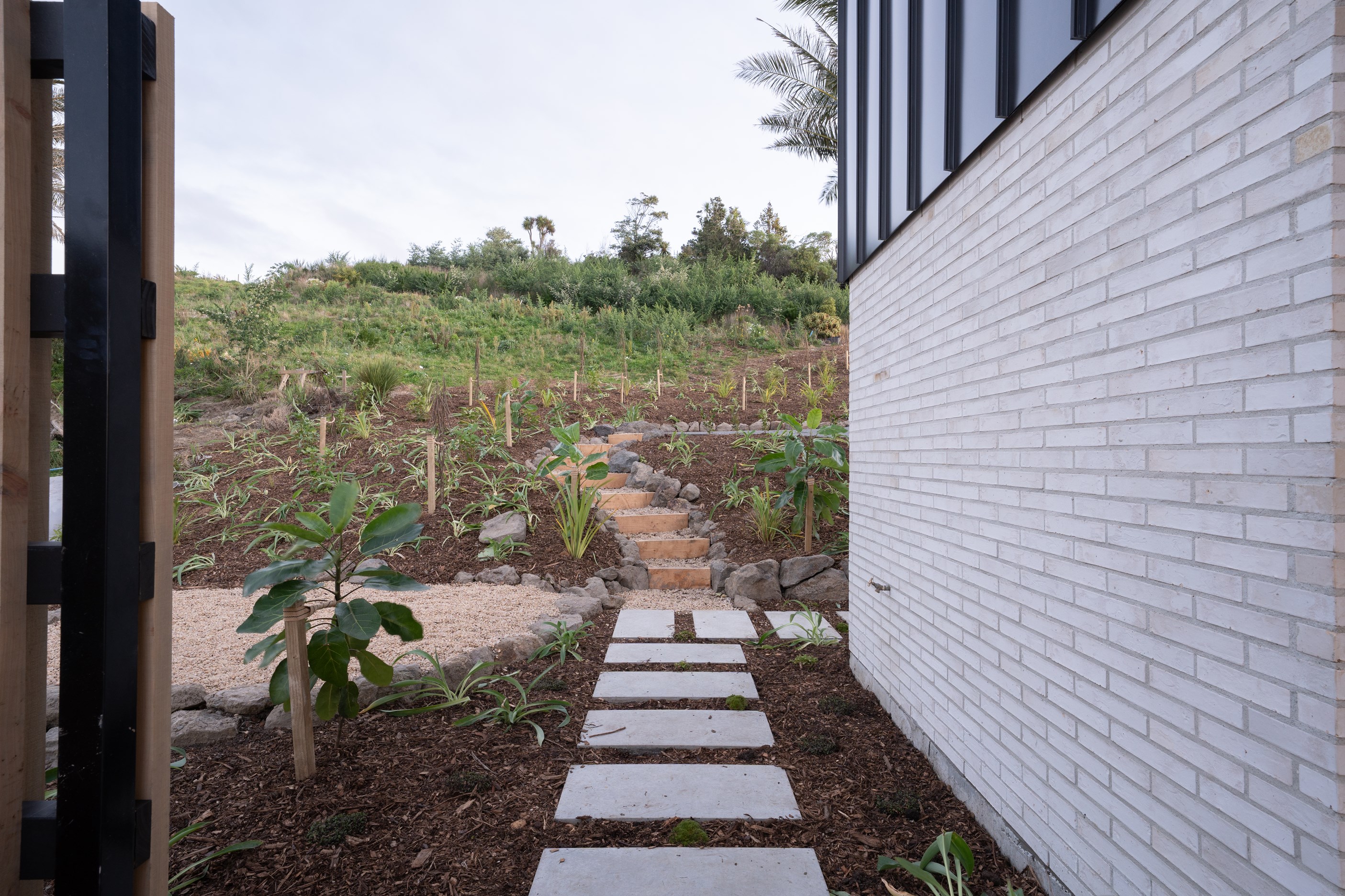Clean lines and neutral tones are hallmarks of the interior and the overall vibe is light and beachy in style. It’s utterly chic and does not diminish from nature’s works of art outside. That’s not to say it’s devoid of highlights – the white-and-wood kitchen is a stand-out feature, as is the oak-and-steel staircase. The three bathrooms are tiled and luxurious. On the lower floor you’ll find an open-plan kitchen, dining and living space that flows onto a terrace, a separate sitting room and the main bedroom with ensuite. Head up those stylish stairs and you’ll find three bedrooms and a bathroom. Above the double garage and accessed by another staircase is a guest suite and vast attic storage space. All that’s left for the owners to do is to soak in what nature and Blair Ward Construction have served up.