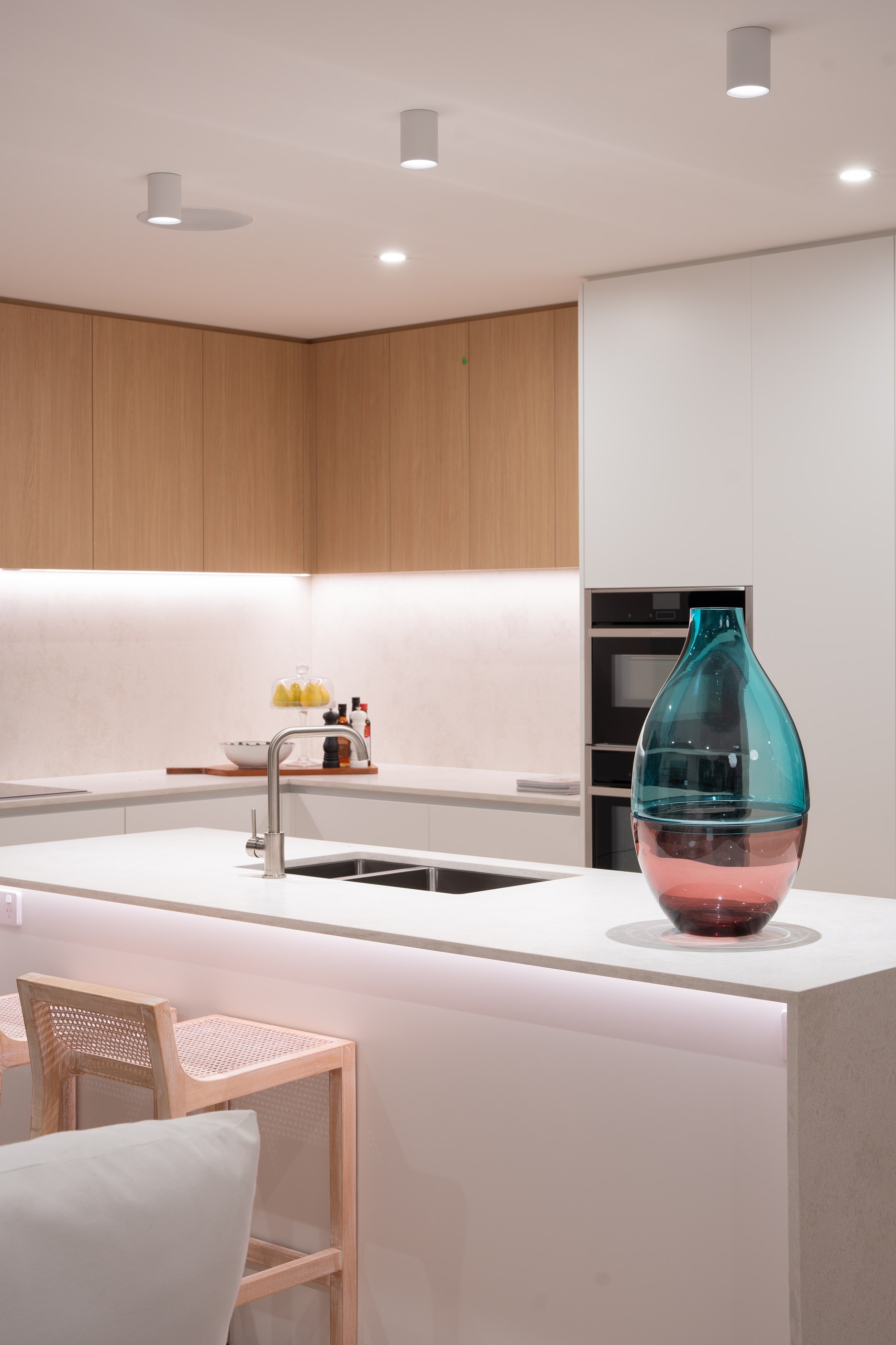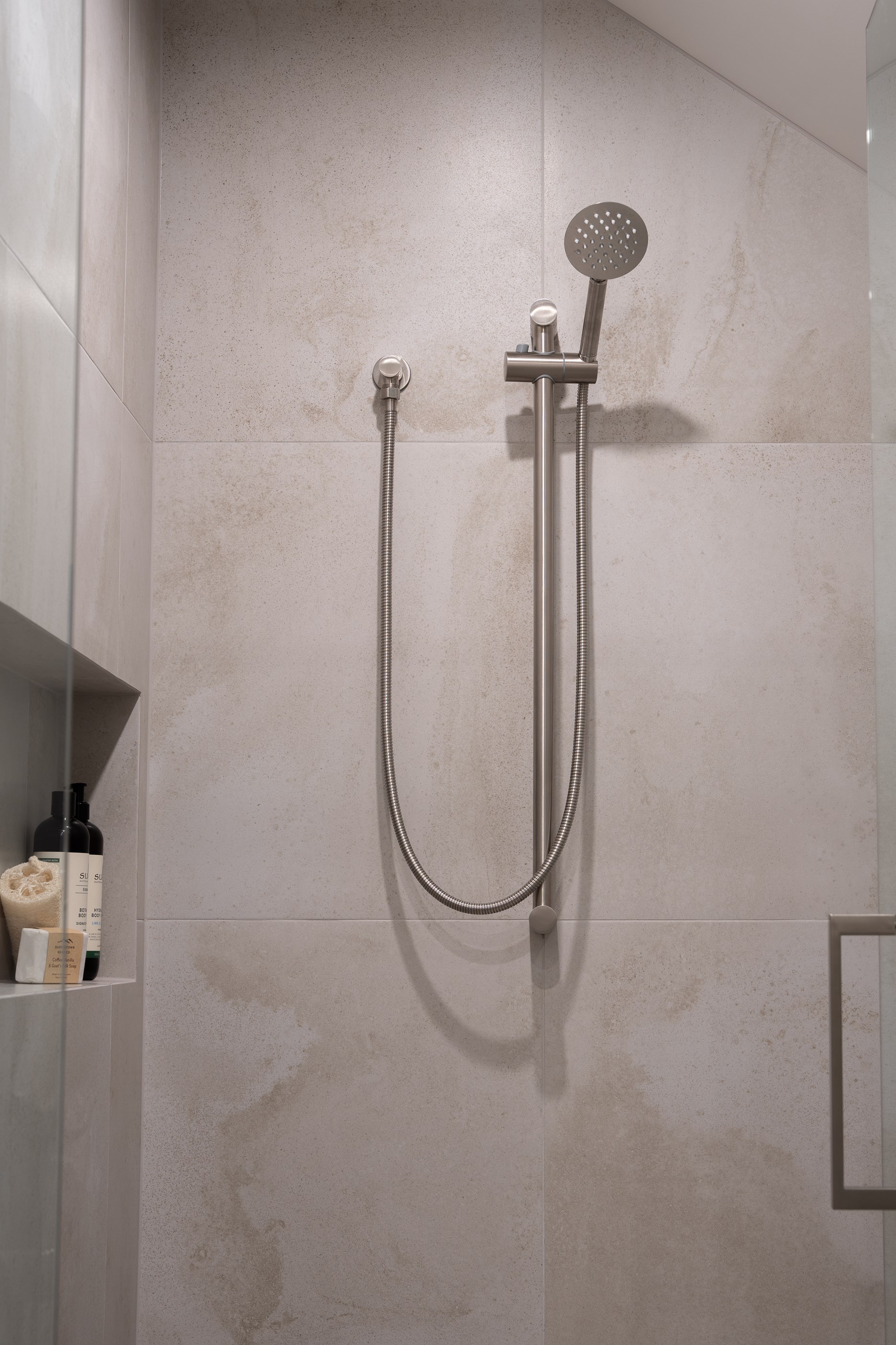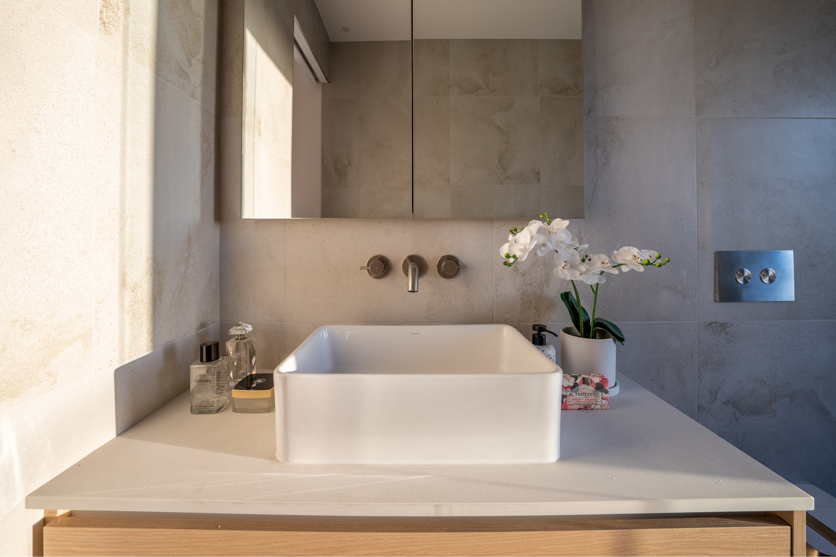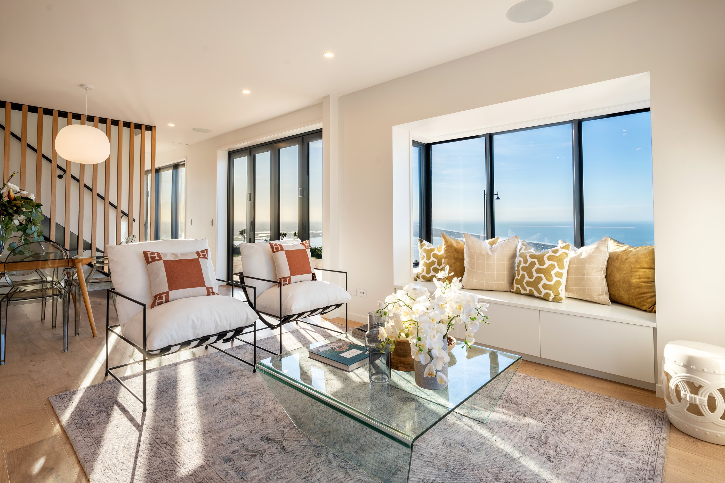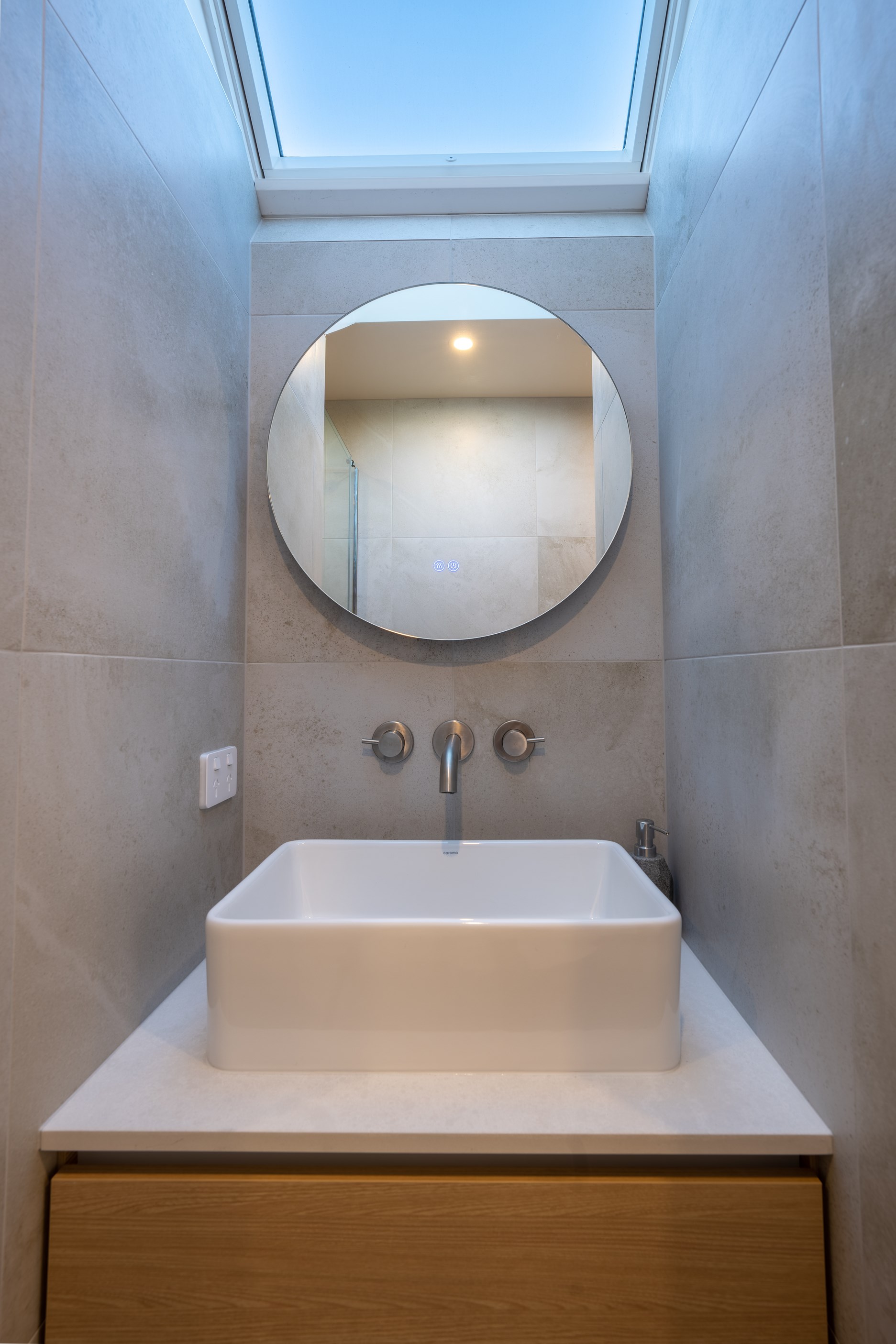 Clean lines and neutral tones are hallmarks of the interior and the overall vibe is light and beachy in style. It’s utterly chic and does not diminish from nature’s works of art outside. That’s not to say it’s devoid of highlights – the white-and-wood kitchen is a stand-out feature, as is the oak-and-steel staircase. The three bathrooms are tiled and luxurious. On the lower floor you’ll find an open-plan kitchen, dining and living space that flows onto a terrace, a separate sitting room and the main bedroom with ensuite. Head up those stylish stairs and you’ll find three bedrooms and a bathroom. Above the double garage and accessed by another staircase is a guest suite and vast attic storage space. All that’s left for the owners to do is to soak in what nature and Blair Ward Construction have served up.