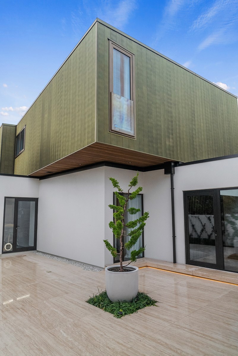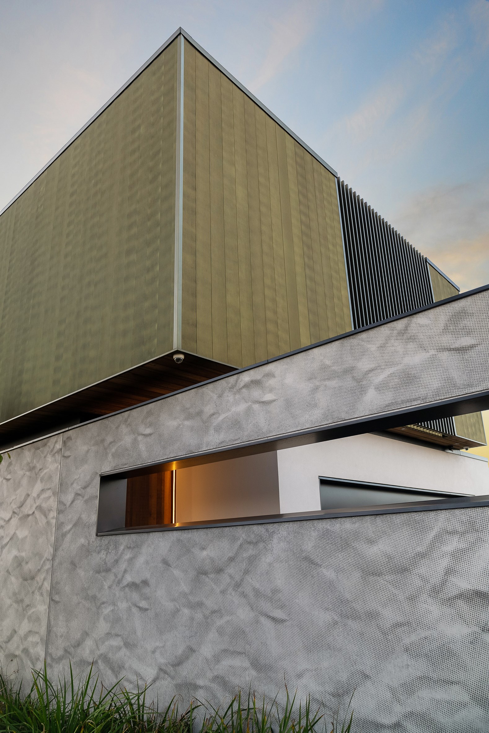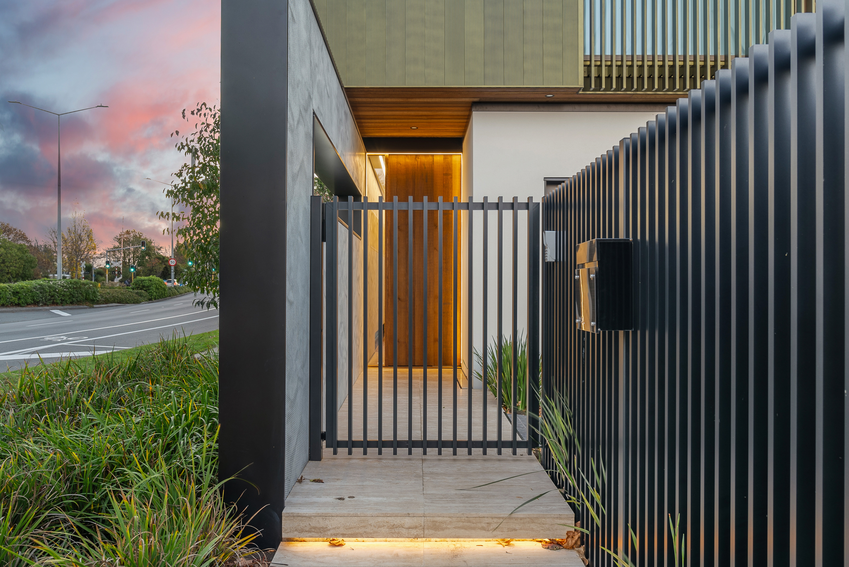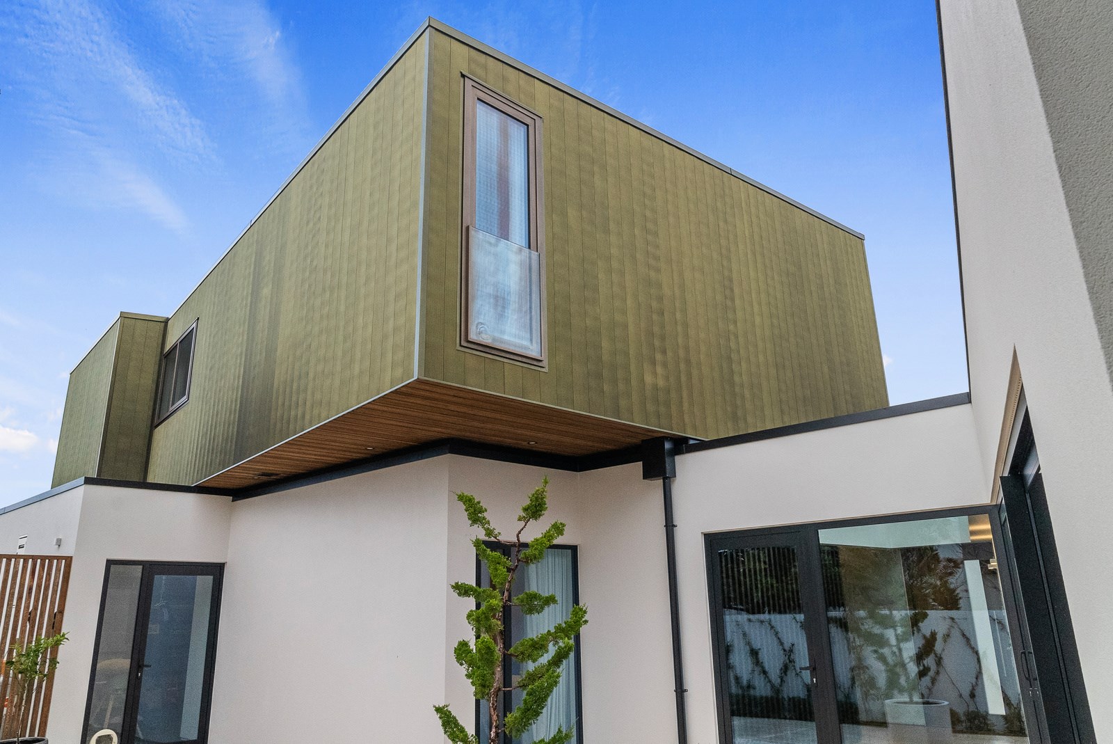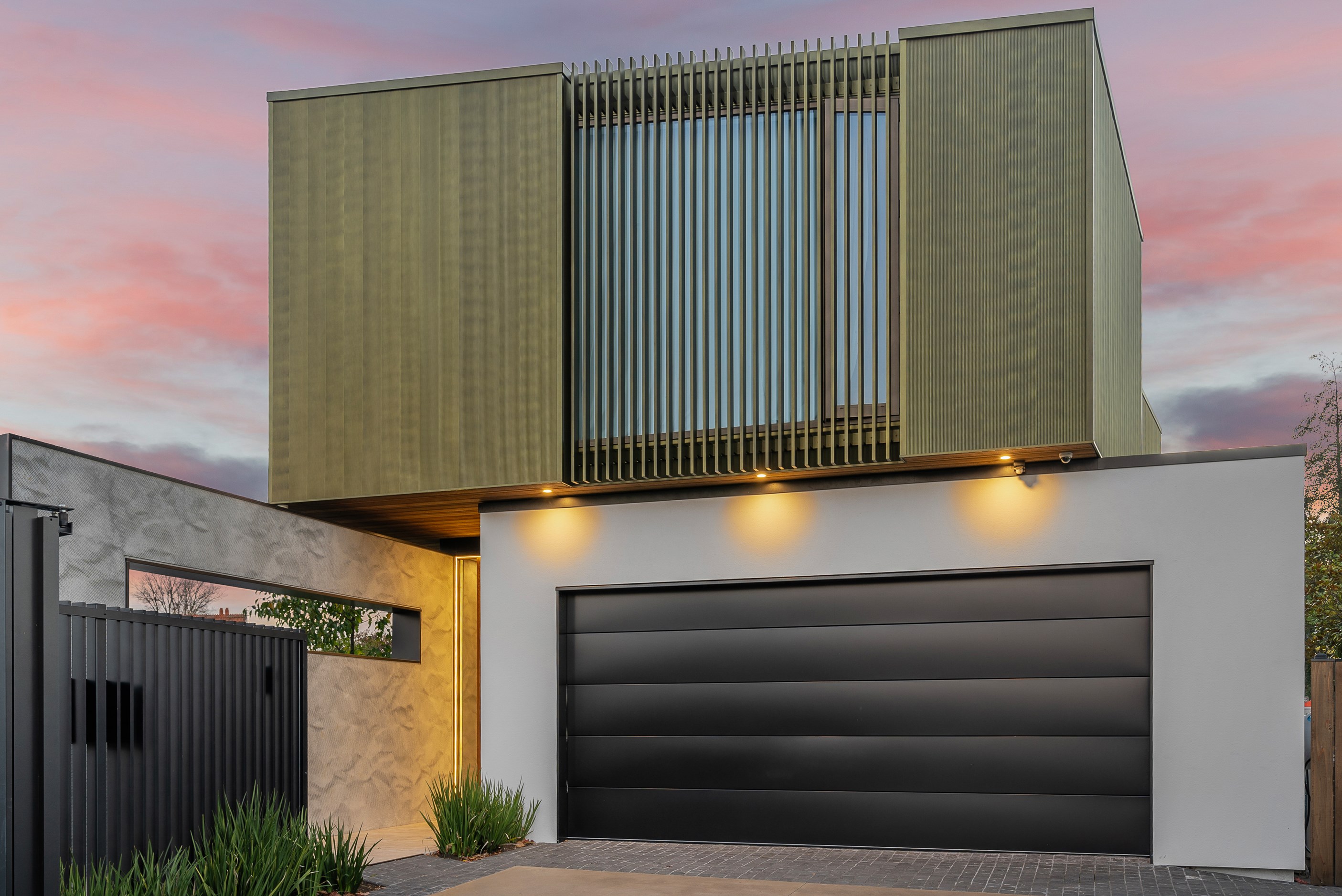 This show-stopping home is full of innovative surprises and design features, starting with its striking street appeal. The exterior has Nu-wall cladding, its shimmering green-gold hue changing in the sunlight. Graphic precast panels cast a 3D effect, creating a feature wall that brings a dynamic look to the lower level. This clever panel doubles as a fence that insulates the house from road noise. Elsewhere tasteful touches have been integrated into every room, the layout ensuring a restful sense of being and flow.