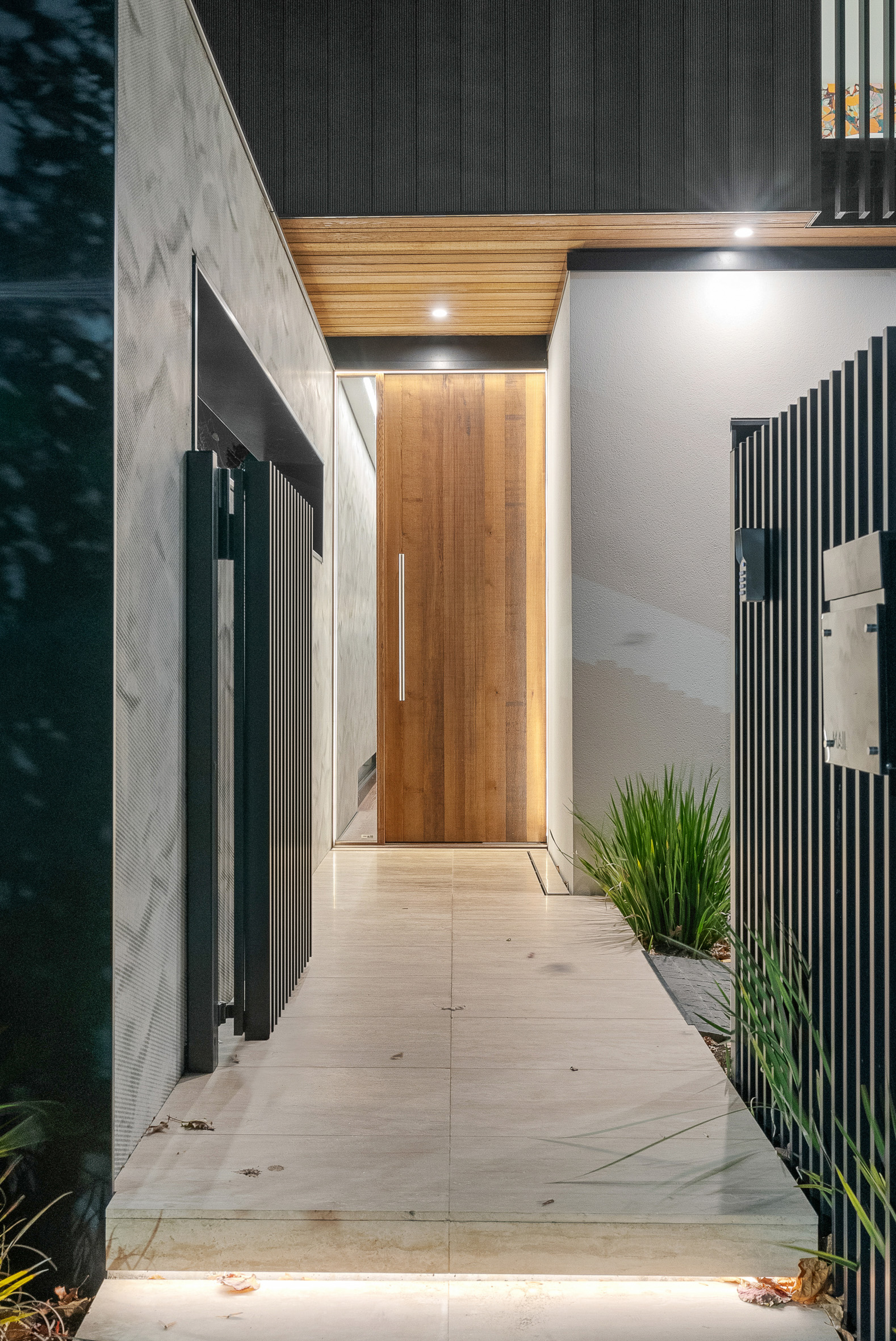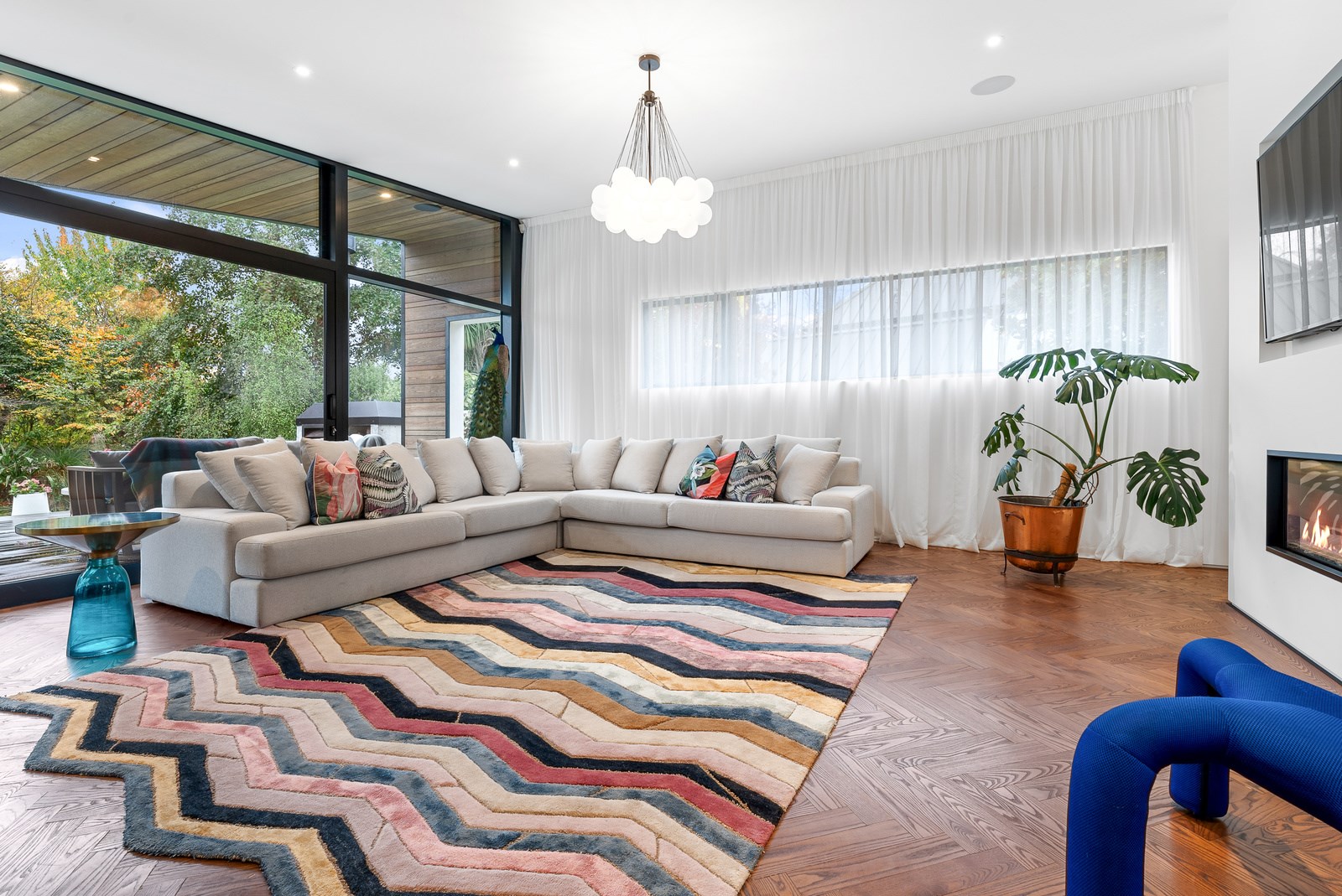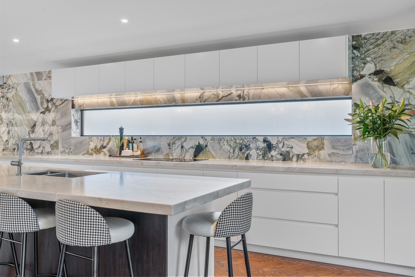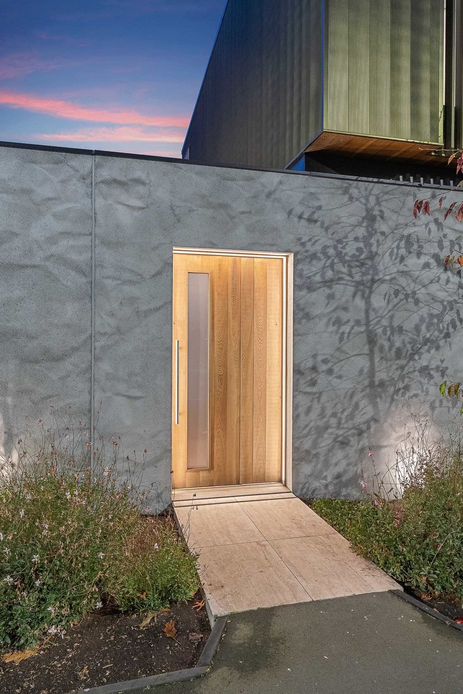 This show-stopping home is full of innovative surprises and design features, starting with its striking street appeal. The exterior has Nu-wall cladding, its shimmering green-gold hue changing in the sunlight. Graphic precast panels cast a 3D effect, creating a feature wall that brings a dynamic look to the lower level. This clever panel doubles as a fence that insulates the house from road noise. Elsewhere tasteful touches have been integrated into every room, the layout ensuring a restful sense of being and flow.