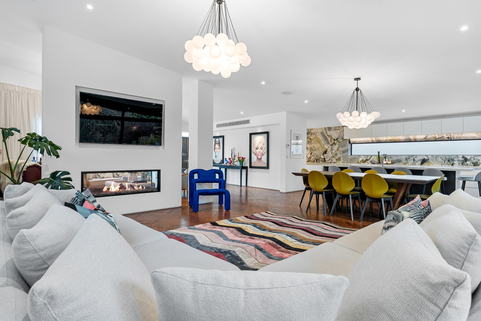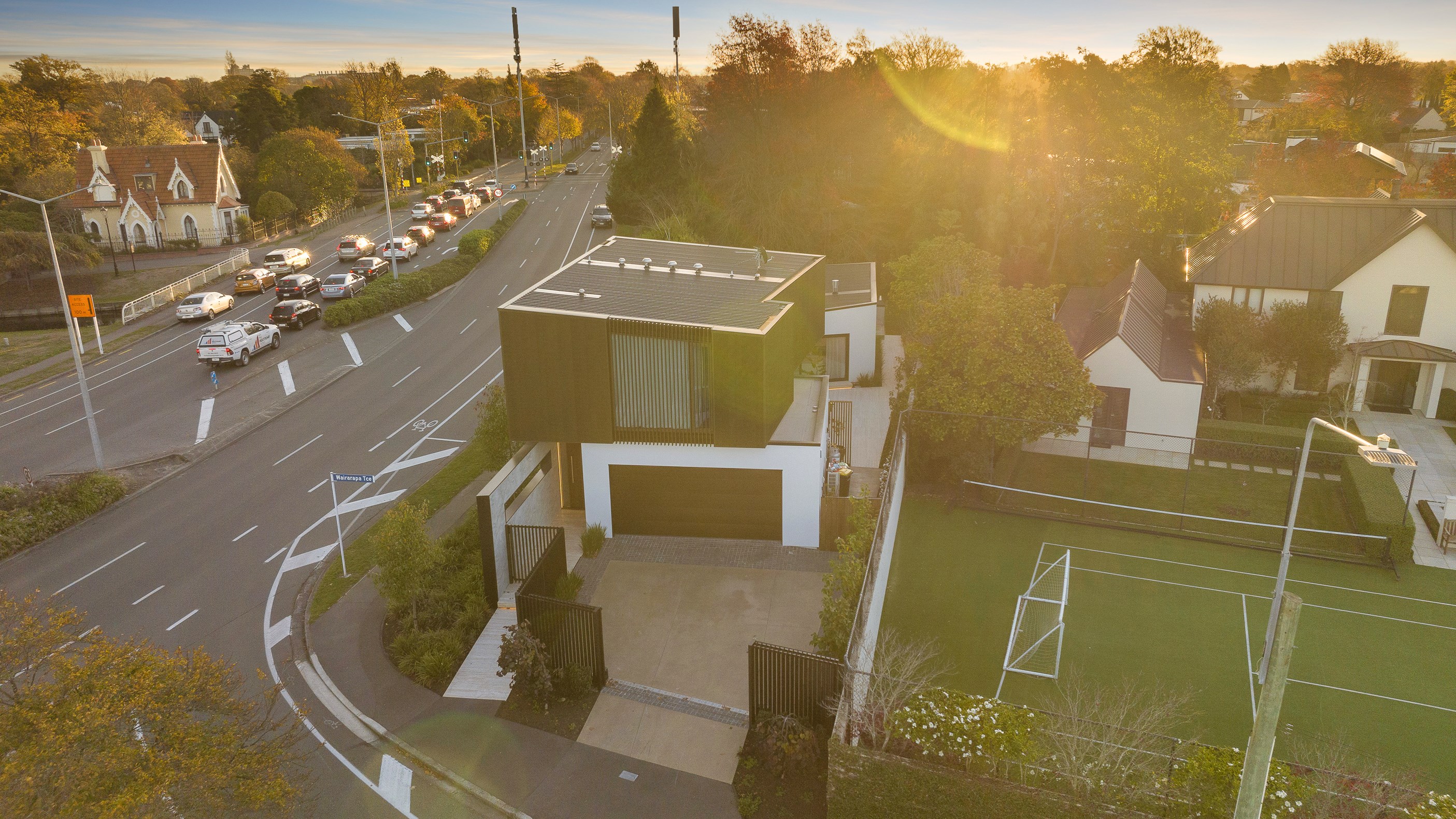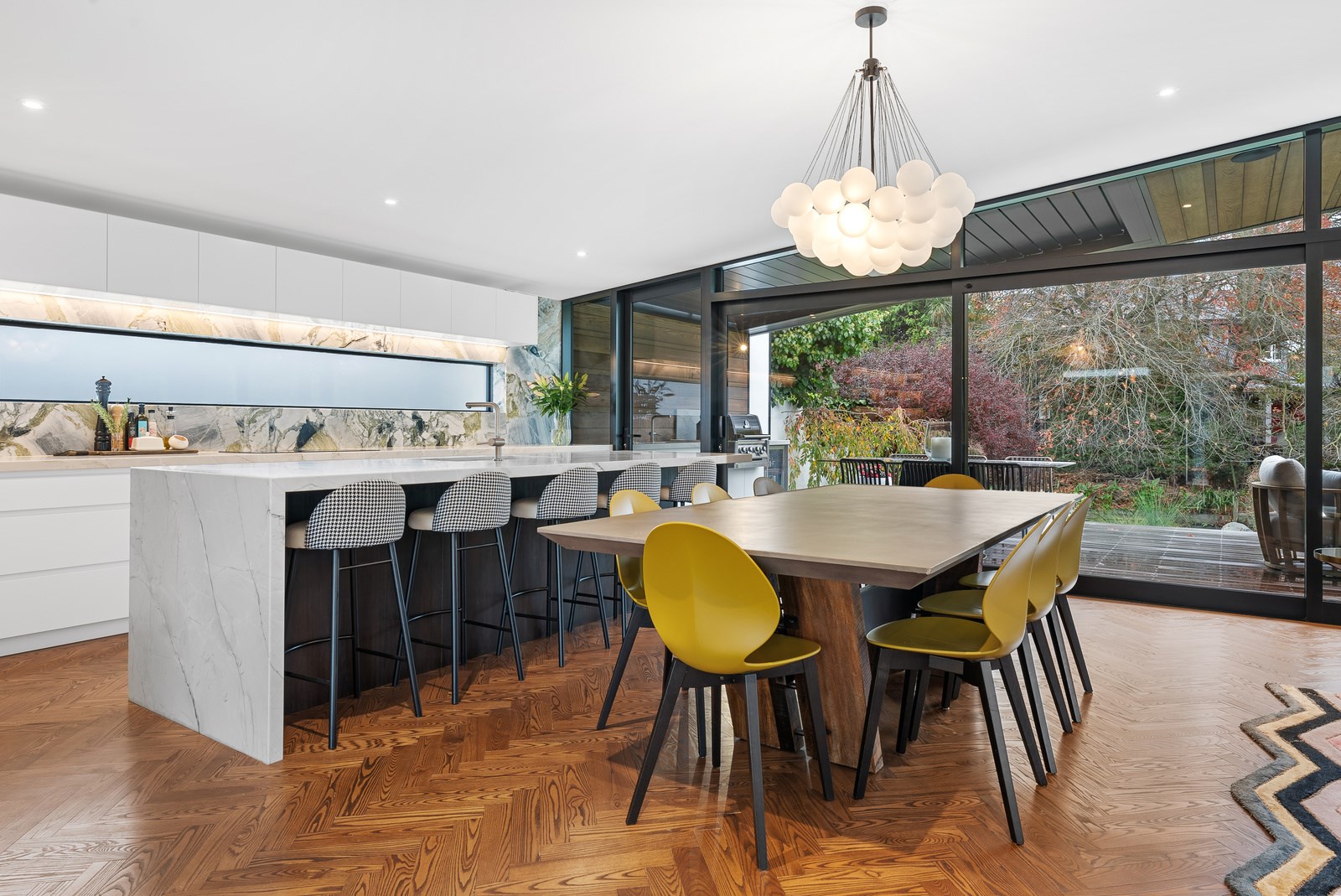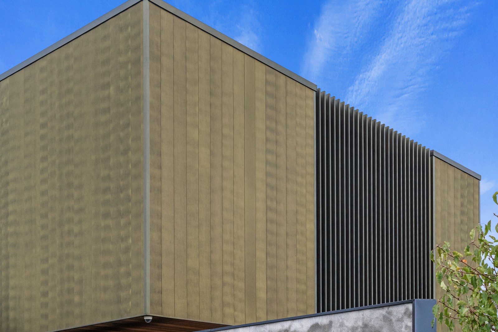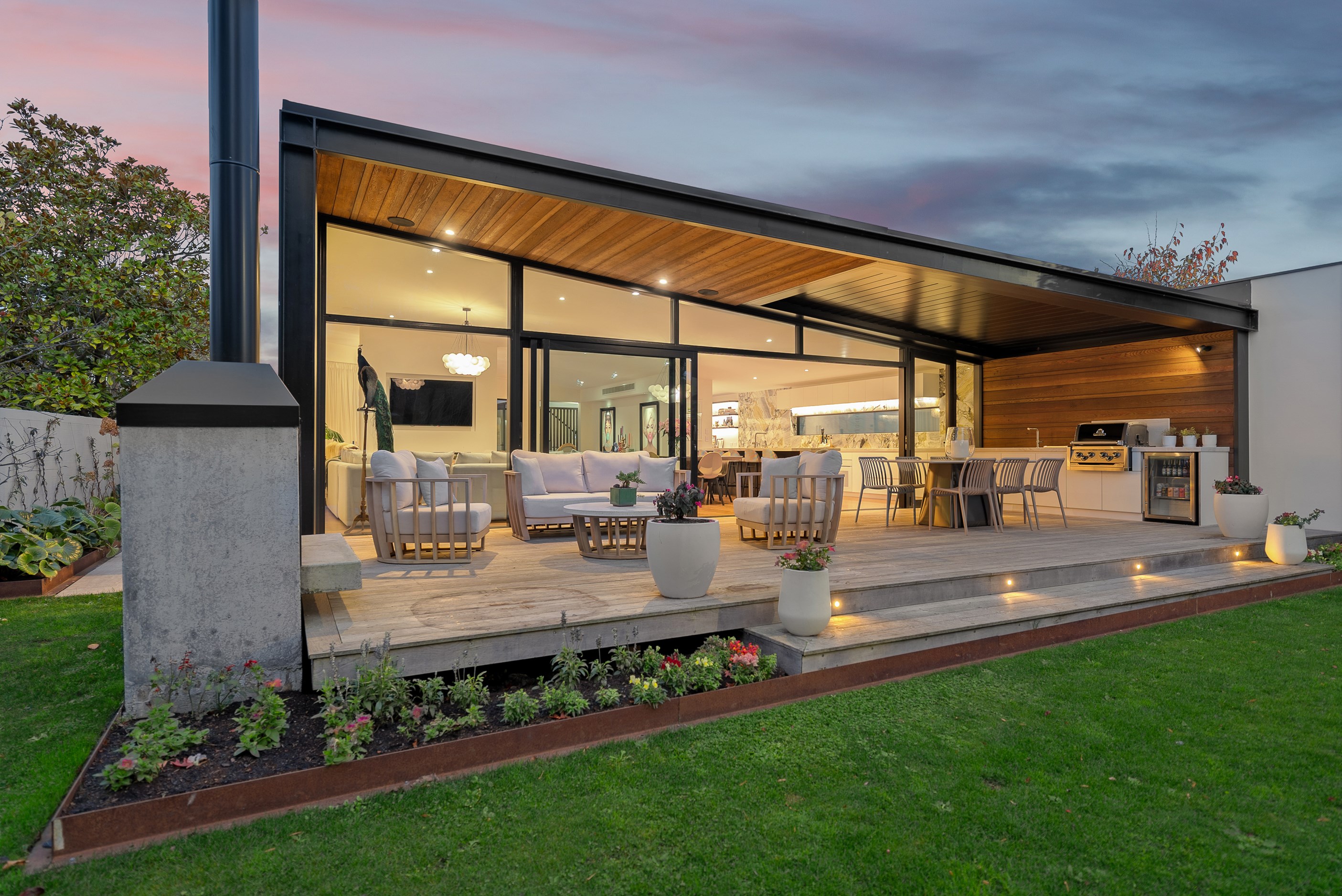 This show-stopping home is full of innovative surprises and design features, starting with its striking street appeal. The exterior has Nu-wall cladding, its shimmering green-gold hue changing in the sunlight. Graphic precast panels cast a 3D effect, creating a feature wall that brings a dynamic look to the lower level. This clever panel doubles as a fence that insulates the house from road noise. Elsewhere tasteful touches have been integrated into every room, the layout ensuring a restful sense of being and flow.