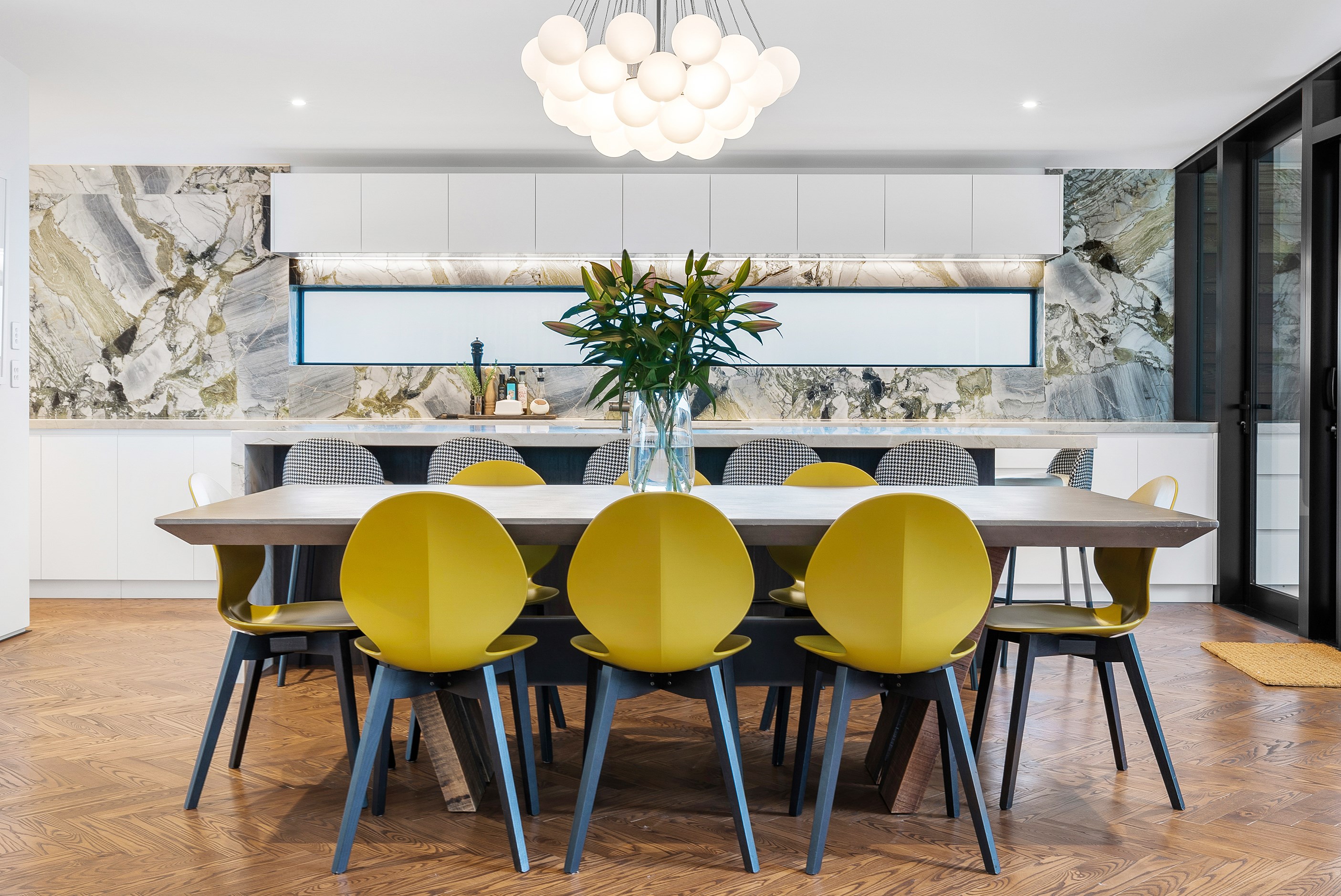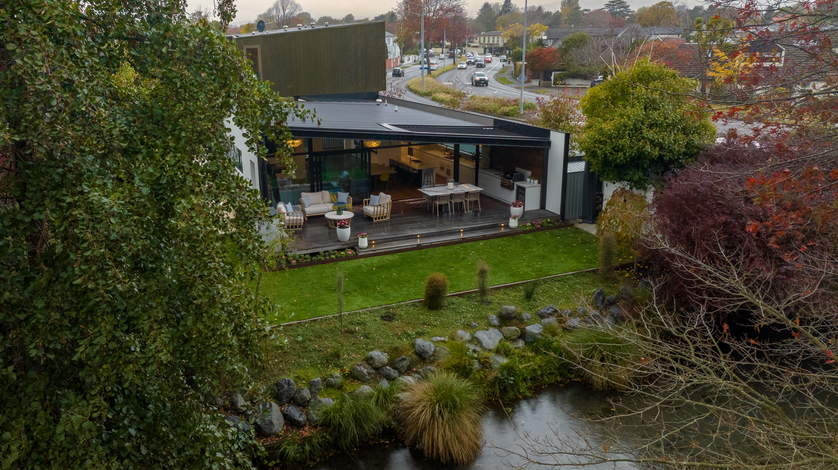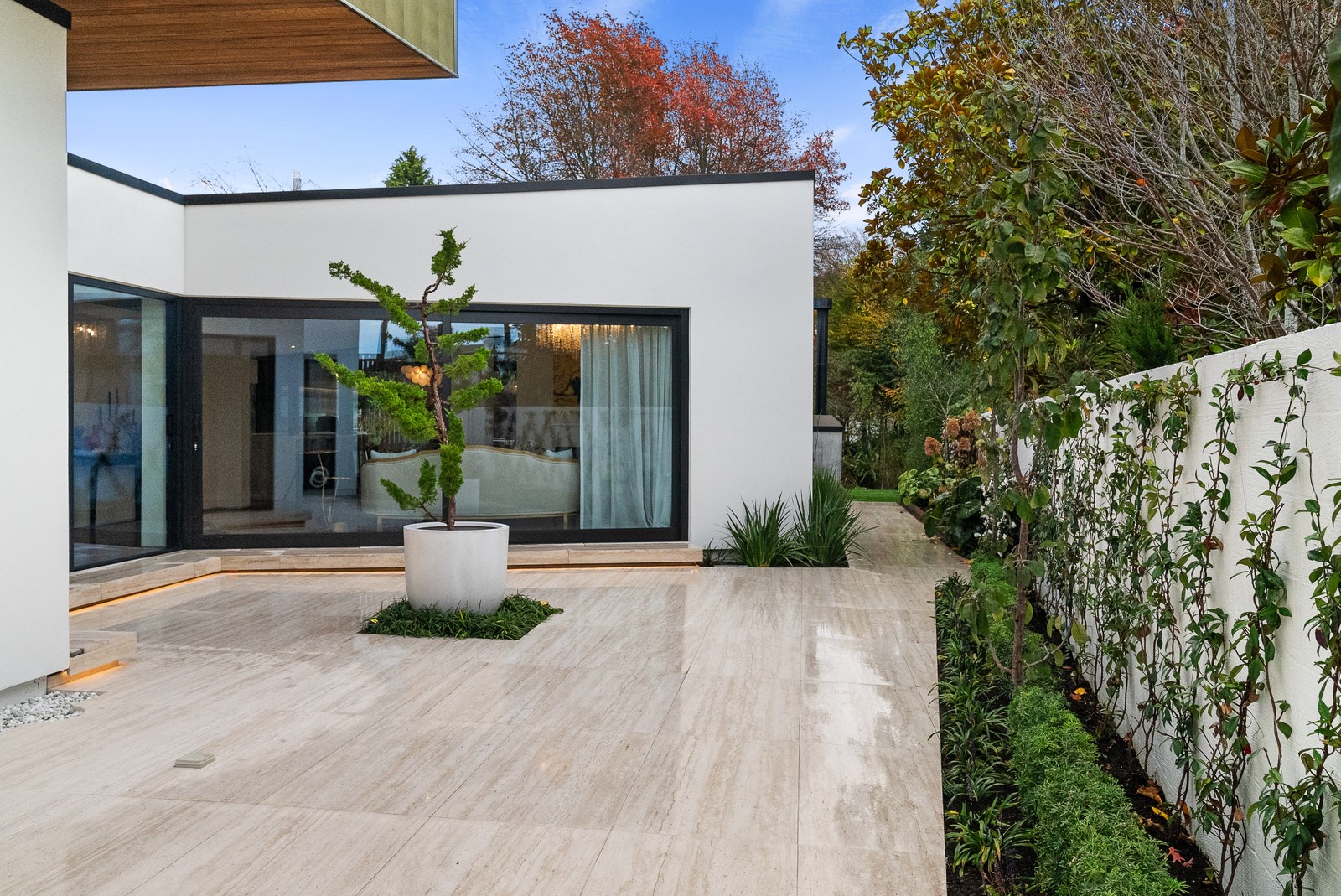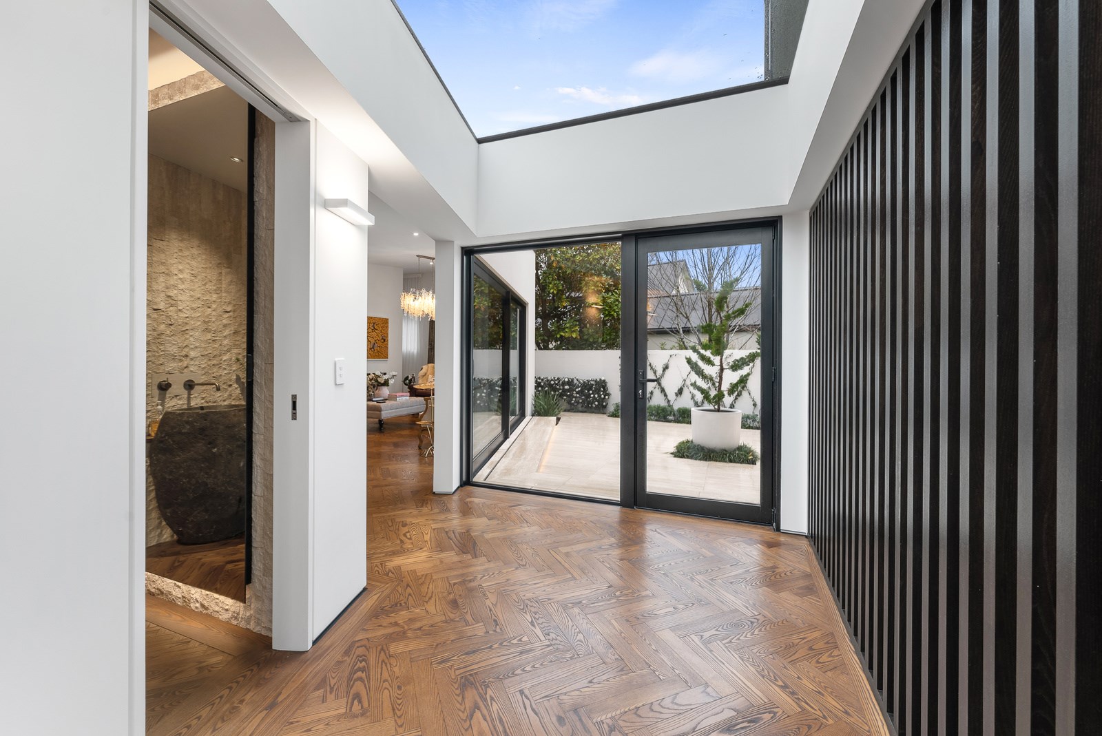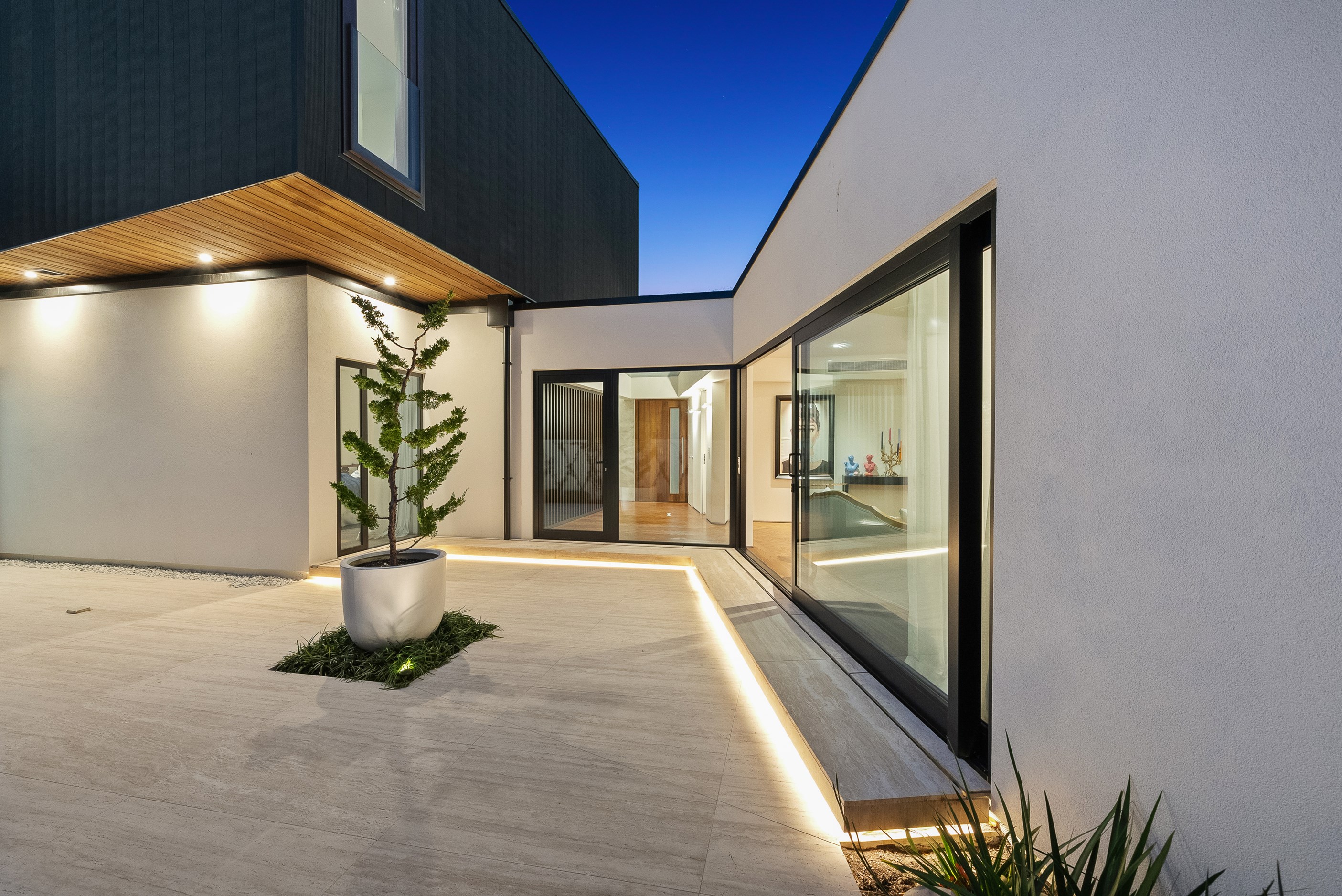 This show-stopping home is full of innovative surprises and design features, starting with its striking street appeal. The exterior has Nu-wall cladding, its shimmering green-gold hue changing in the sunlight. Graphic precast panels cast a 3D effect, creating a feature wall that brings a dynamic look to the lower level. This clever panel doubles as a fence that insulates the house from road noise. Elsewhere tasteful touches have been integrated into every room, the layout ensuring a restful sense of being and flow.
