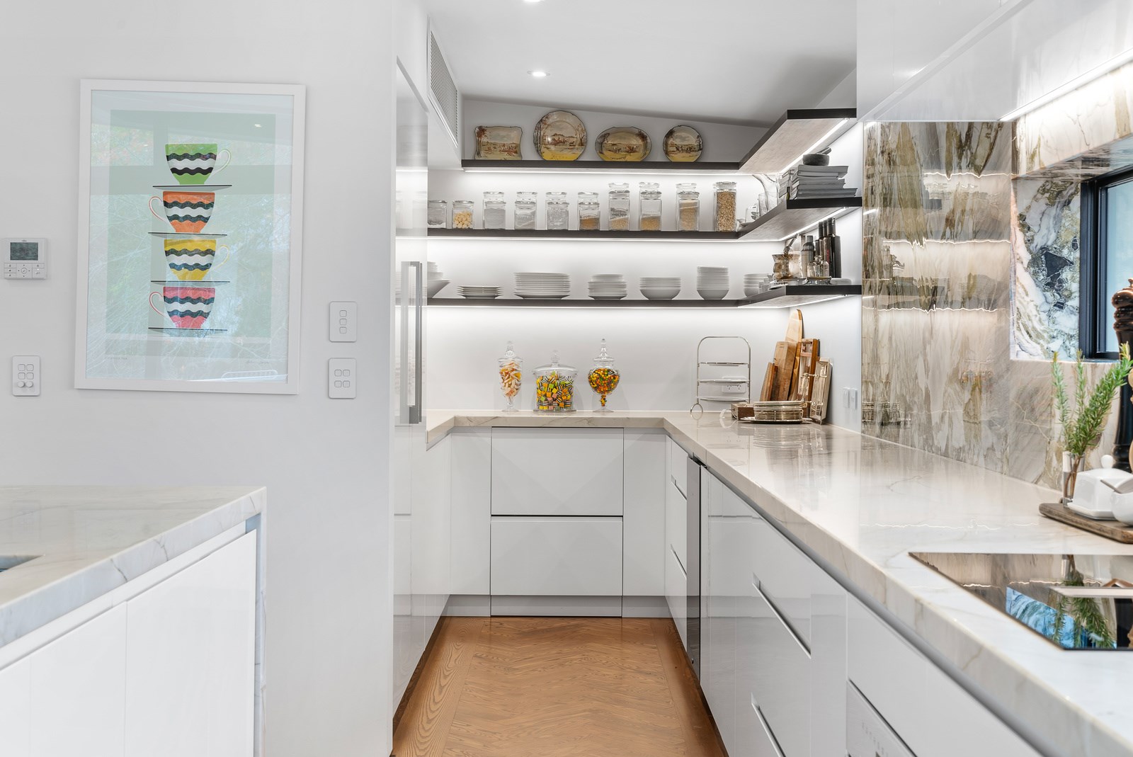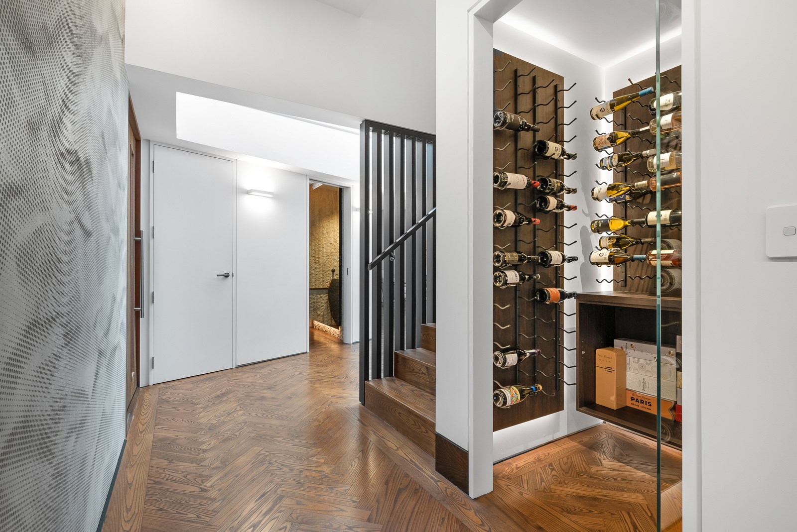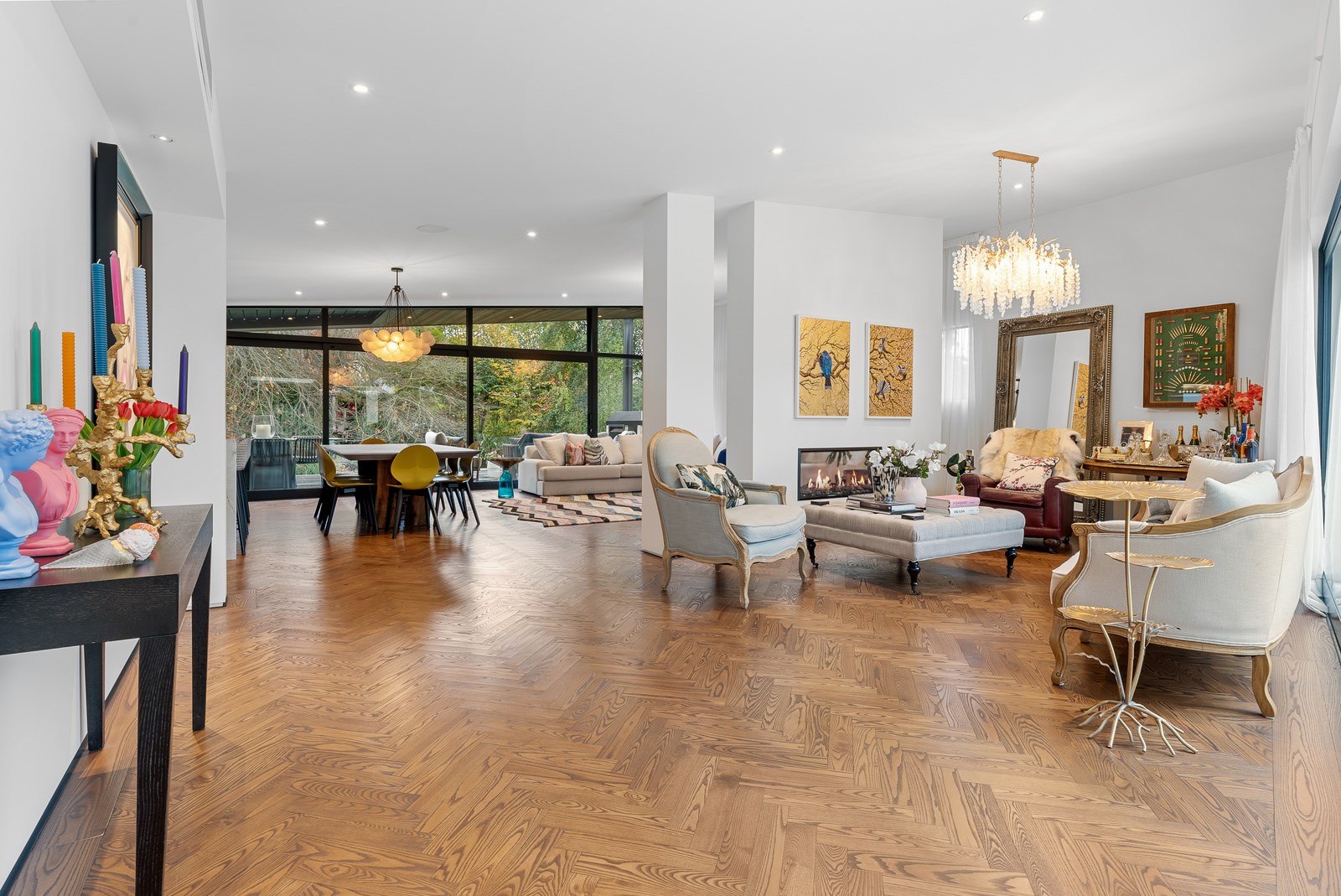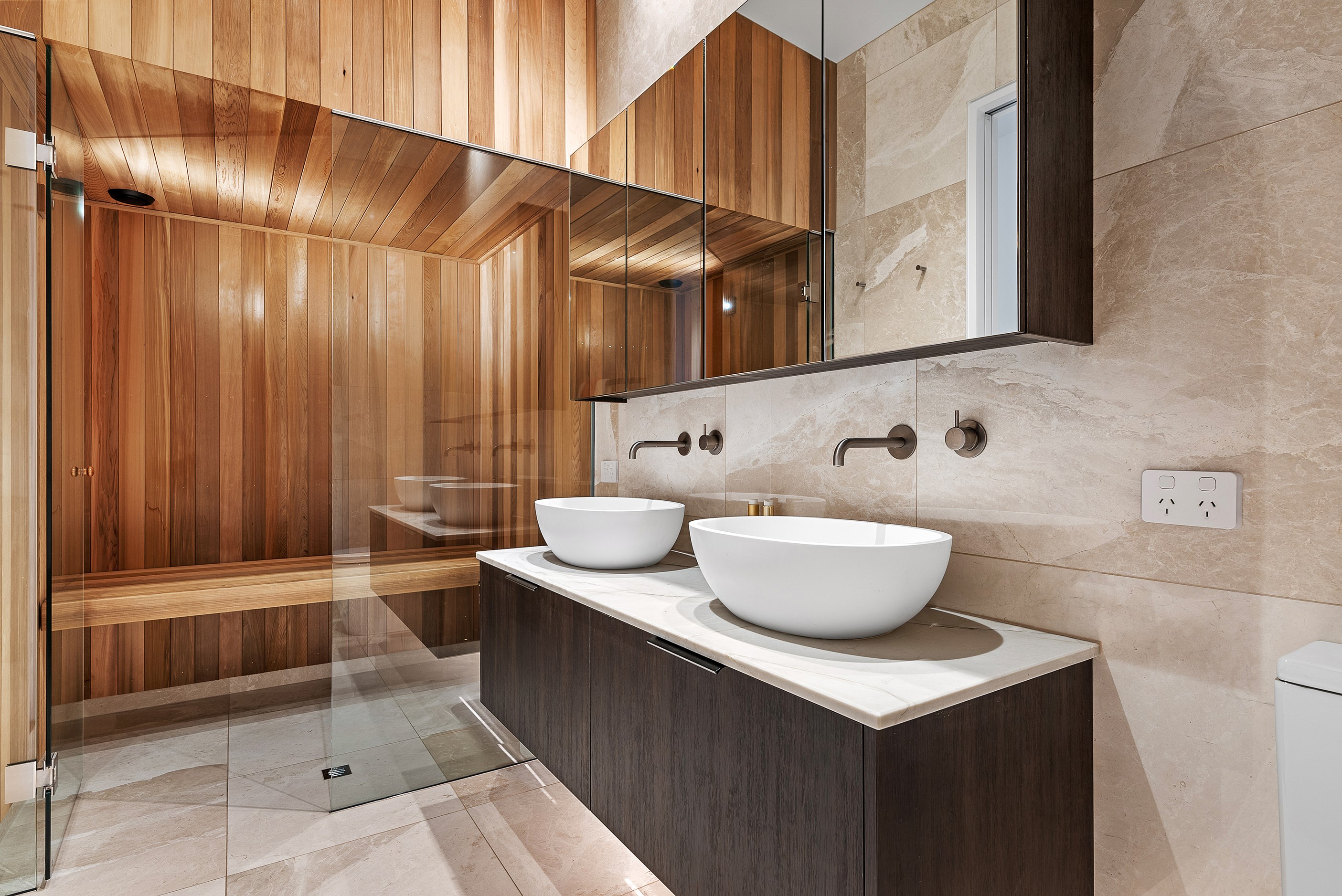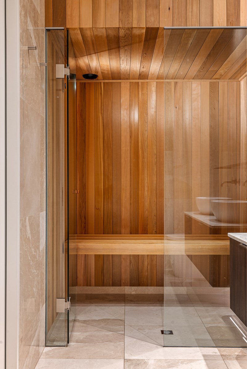 The downstairs open-plan living areas spill onto the outdoor living, with a built-in outdoor kitchen barbecue area with louvre roof and outdoor fire, opening it up for year-round use. Established trees and a stream provide lovely views and privacy. The exquisite kitchen has solid American Ash herringbone floors, generous quartzite benchtops and an eye-catching marble splashback. The powder room has split-faced travertine walls and a granite boulder sink. A hall skylight overlooks a beautifully landscaped courtyard, and there’s a wine cellar in the main hallway with back-lighting. All four of the bedrooms, including the guest suite on the lower level, have ensuites, the main ensuite boasting a cedar sauna. This home is a truly luxurious retreat.