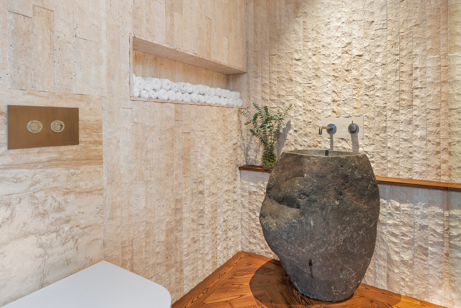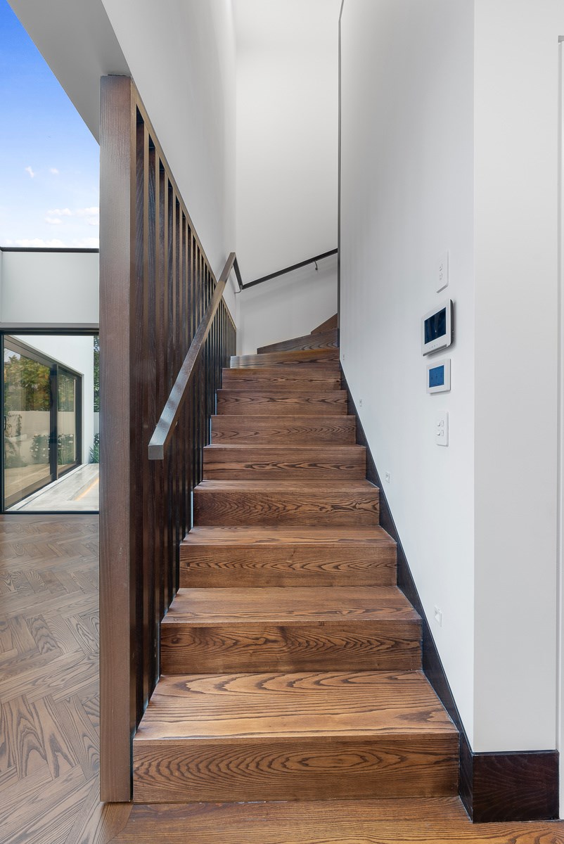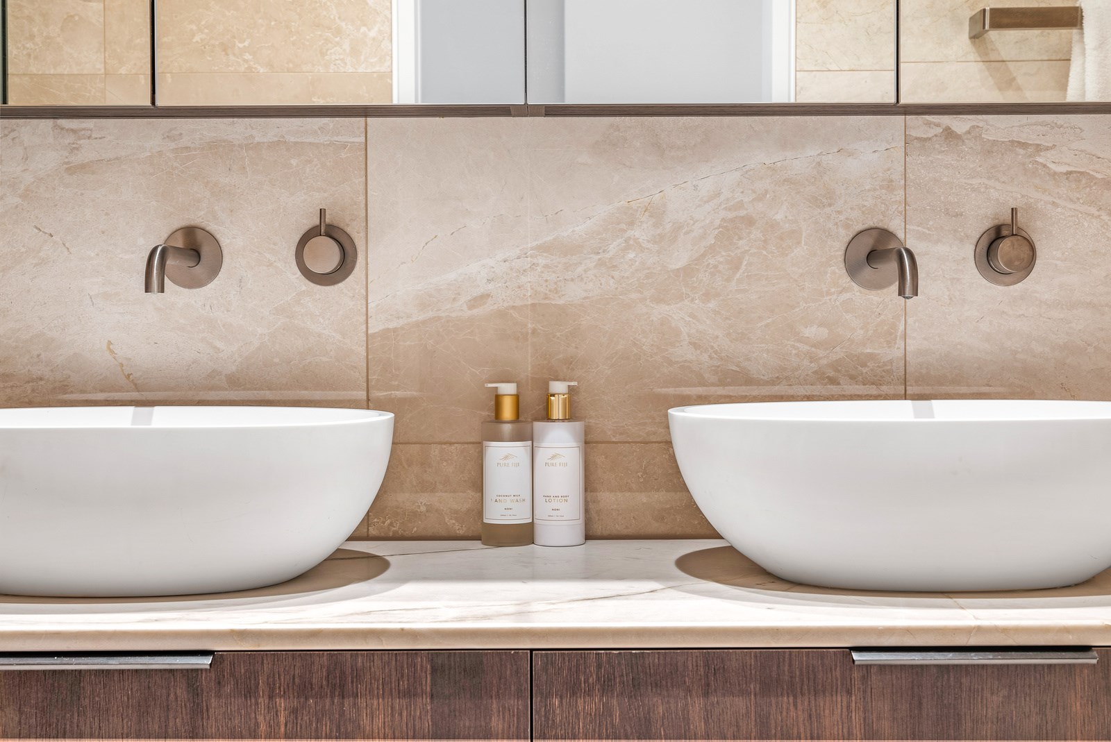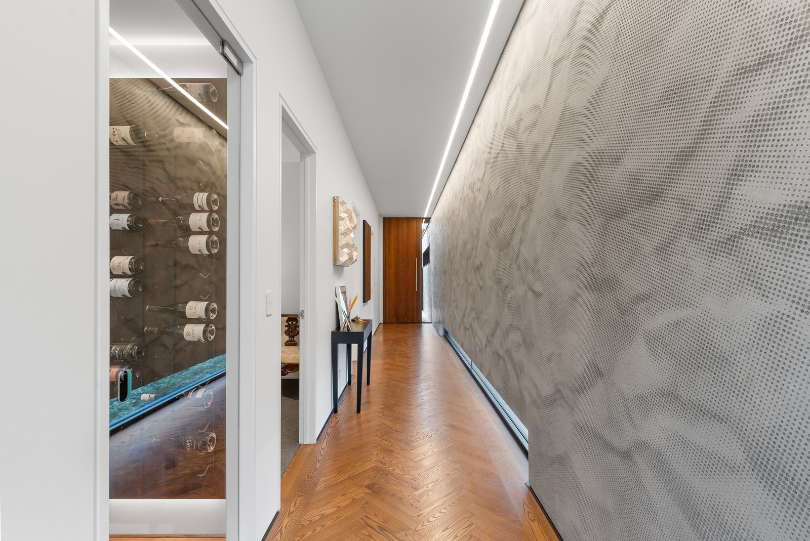 The downstairs open-plan living areas spill onto the outdoor living, with a built-in outdoor kitchen barbecue area with louvre roof and outdoor fire, opening it up for year-round use. Established trees and a stream provide lovely views and privacy. The exquisite kitchen has solid American Ash herringbone floors, generous quartzite benchtops and an eye-catching marble splashback. The powder room has split-faced travertine walls and a granite boulder sink. A hall skylight overlooks a beautifully landscaped courtyard, and there’s a wine cellar in the main hallway with back-lighting. All four of the bedrooms, including the guest suite on the lower level, have ensuites, the main ensuite boasting a cedar sauna. This home is a truly luxurious retreat.