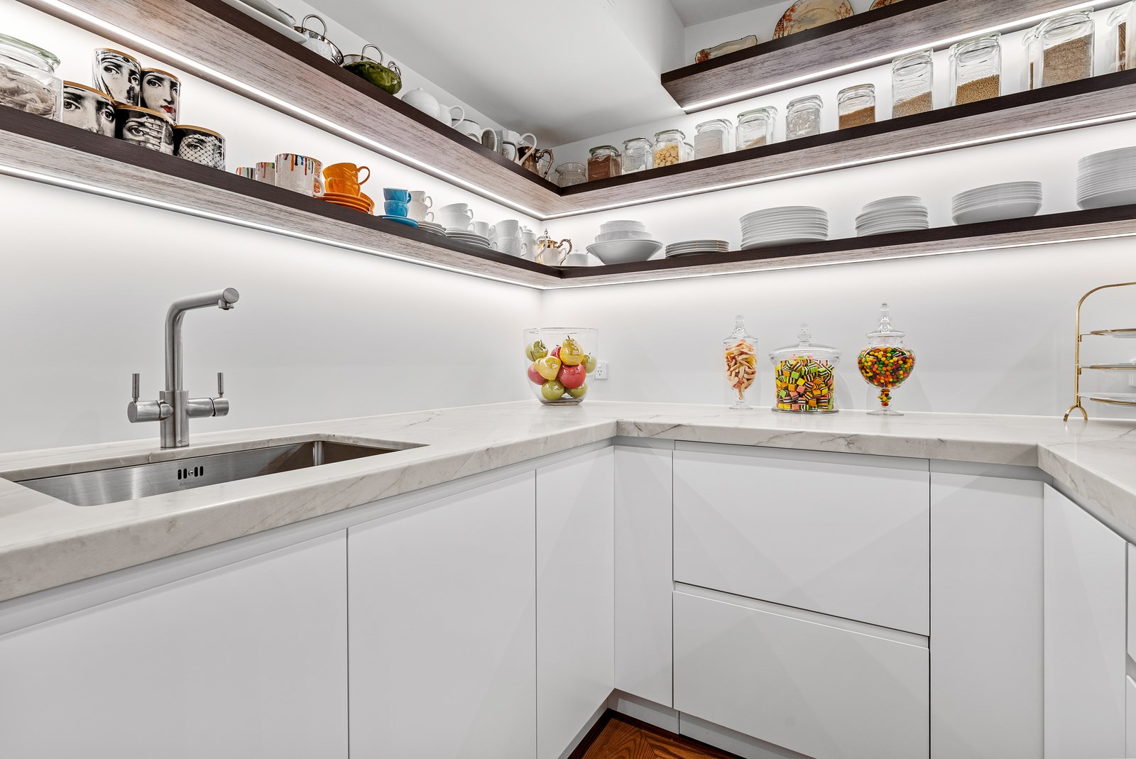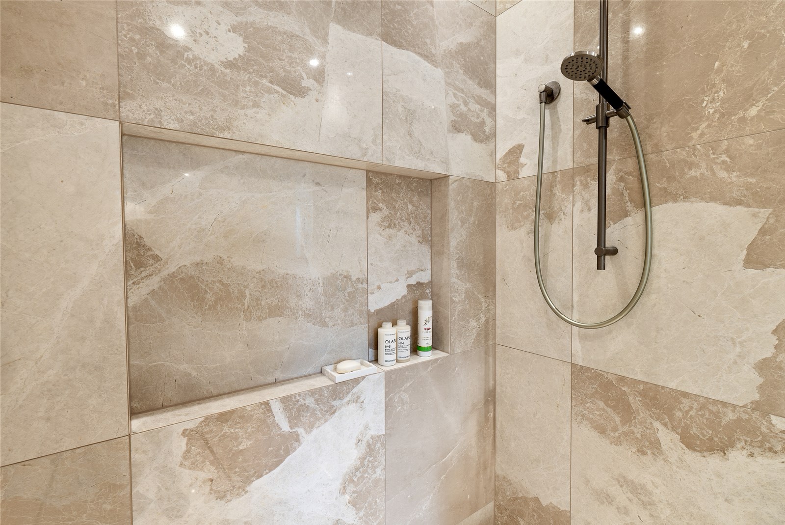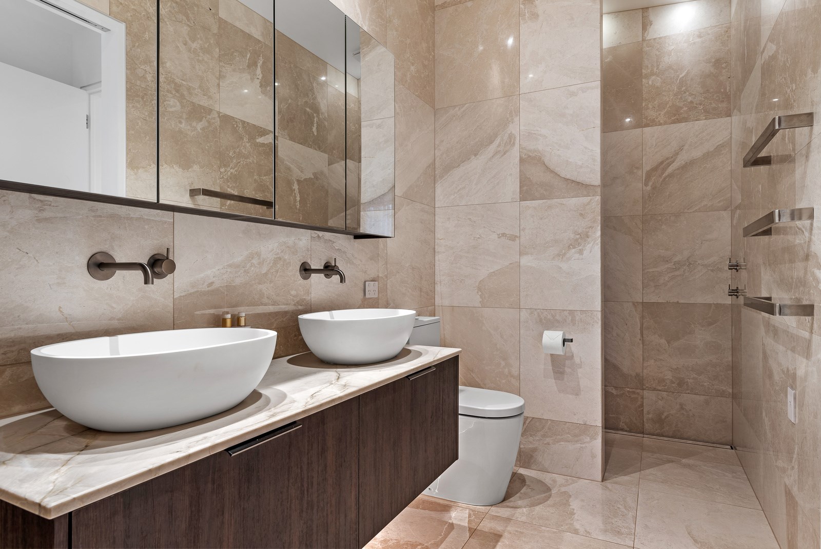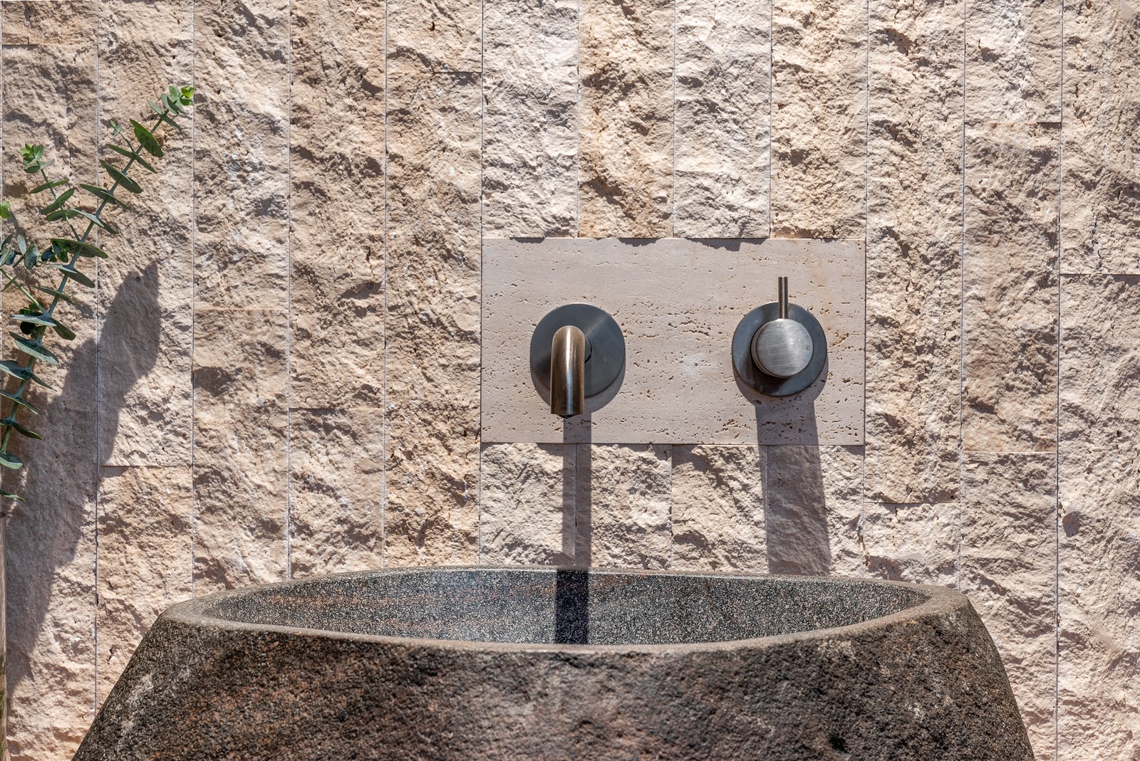 The downstairs open-plan living areas spill onto the outdoor living, with a built-in outdoor kitchen barbecue area with louvre roof and outdoor fire, opening it up for year-round use. Established trees and a stream provide lovely views and privacy. The exquisite kitchen has solid American Ash herringbone floors, generous quartzite benchtops and an eye-catching marble splashback. The powder room has split-faced travertine walls and a granite boulder sink. A hall skylight overlooks a beautifully landscaped courtyard, and there’s a wine cellar in the main hallway with back-lighting. All four of the bedrooms, including the guest suite on the lower level, have ensuites, the main ensuite boasting a cedar sauna. This home is a truly luxurious retreat.