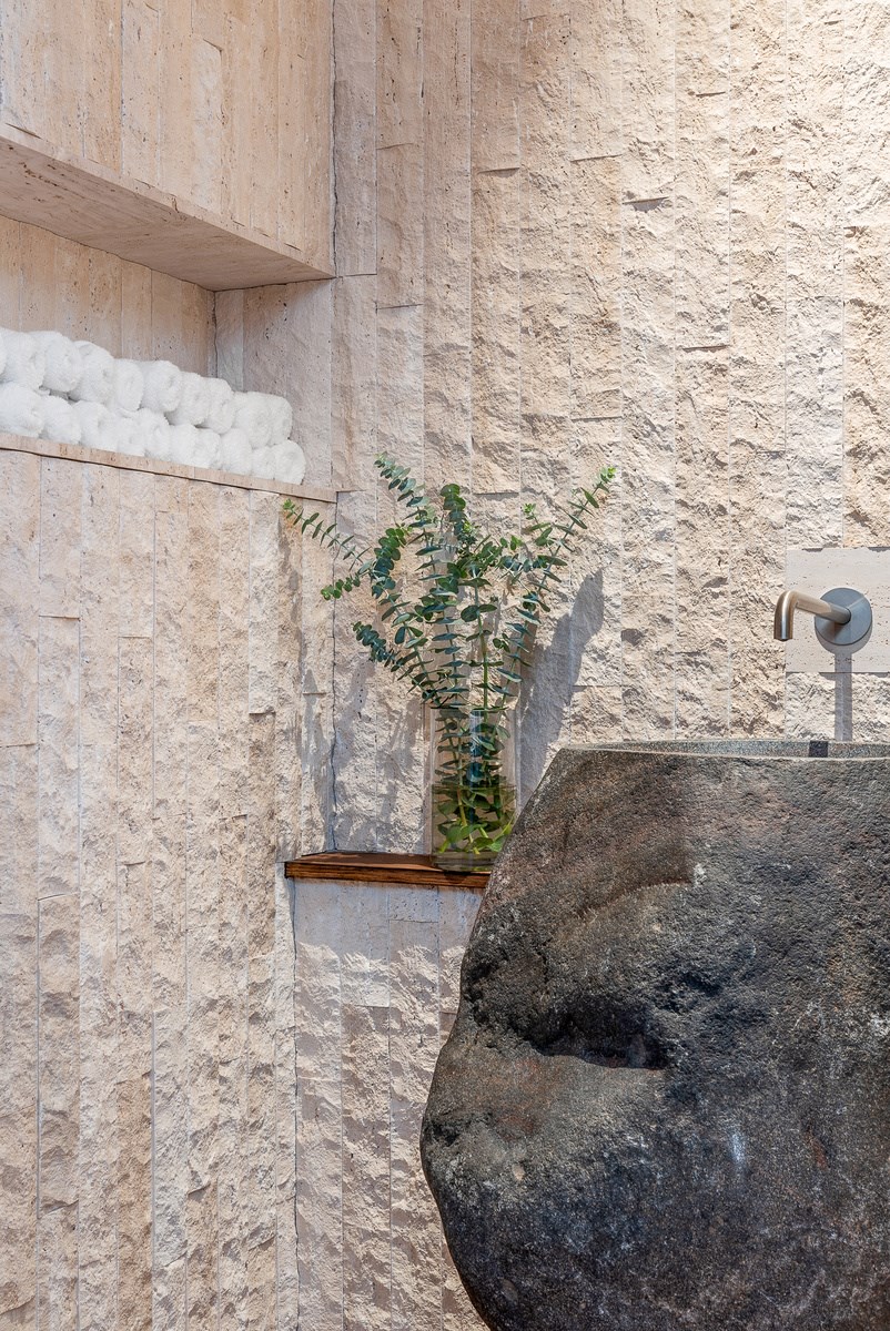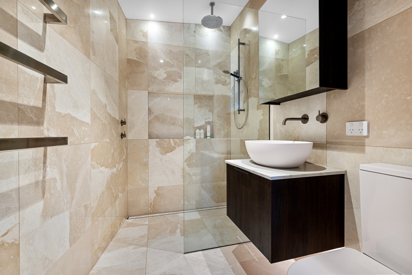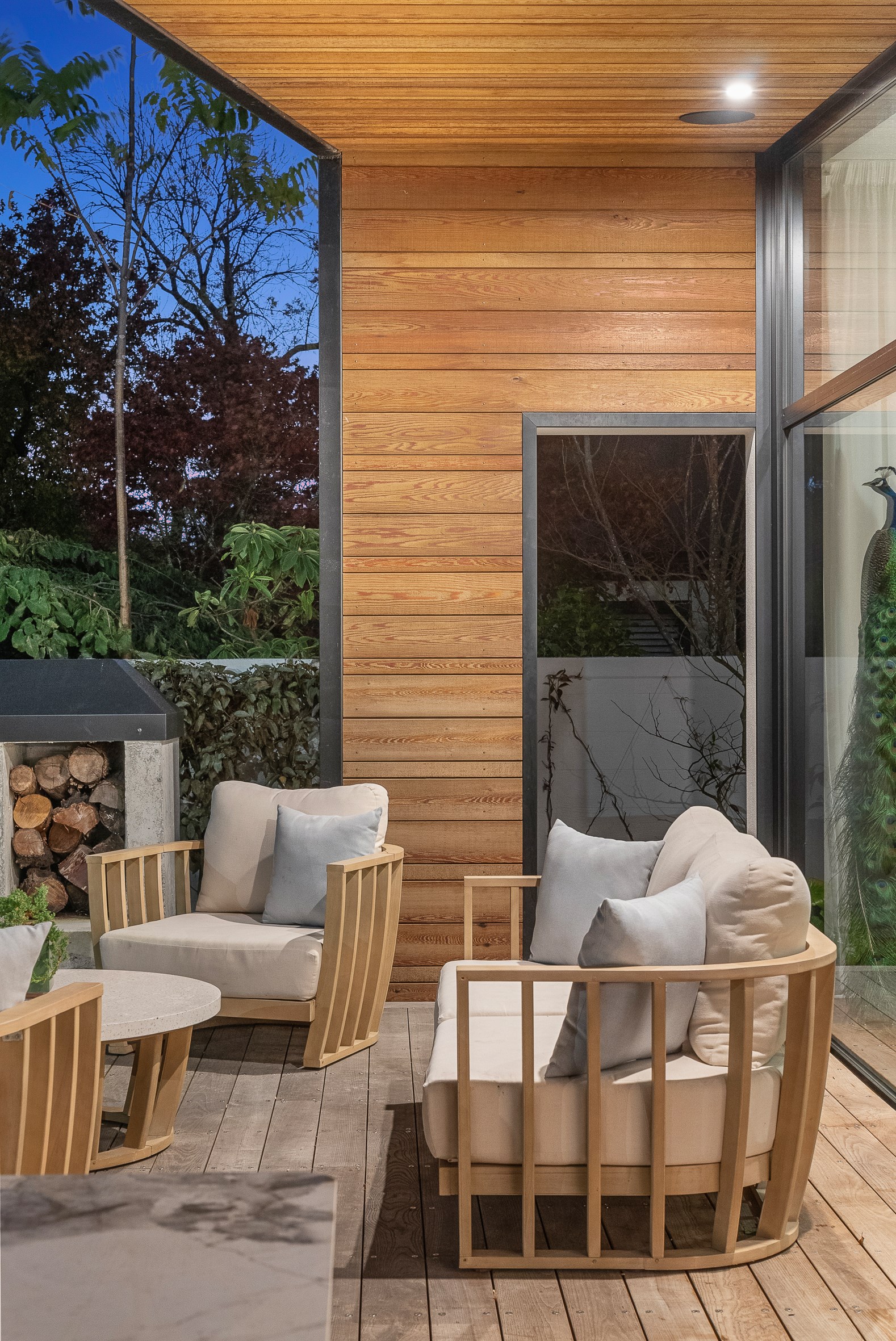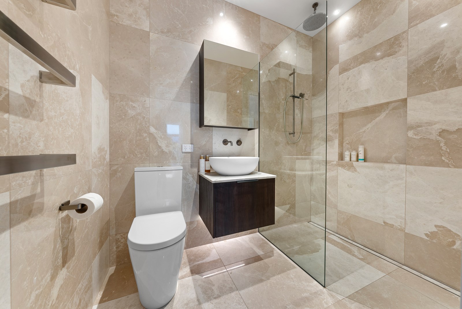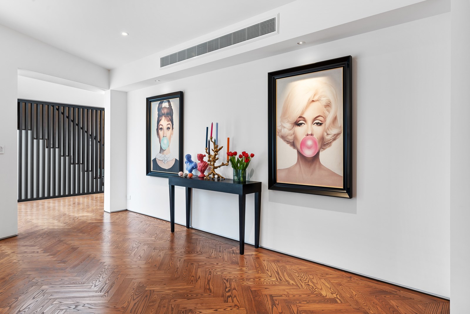 The downstairs open-plan living areas spill onto the outdoor living, with a built-in outdoor kitchen barbecue area with louvre roof and outdoor fire, opening it up for year-round use. Established trees and a stream provide lovely views and privacy. The exquisite kitchen has solid American Ash herringbone floors, generous quartzite benchtops and an eye-catching marble splashback. The powder room has split-faced travertine walls and a granite boulder sink. A hall skylight overlooks a beautifully landscaped courtyard, and there’s a wine cellar in the main hallway with back-lighting. All four of the bedrooms, including the guest suite on the lower level, have ensuites, the main ensuite boasting a cedar sauna. This home is a truly luxurious retreat.