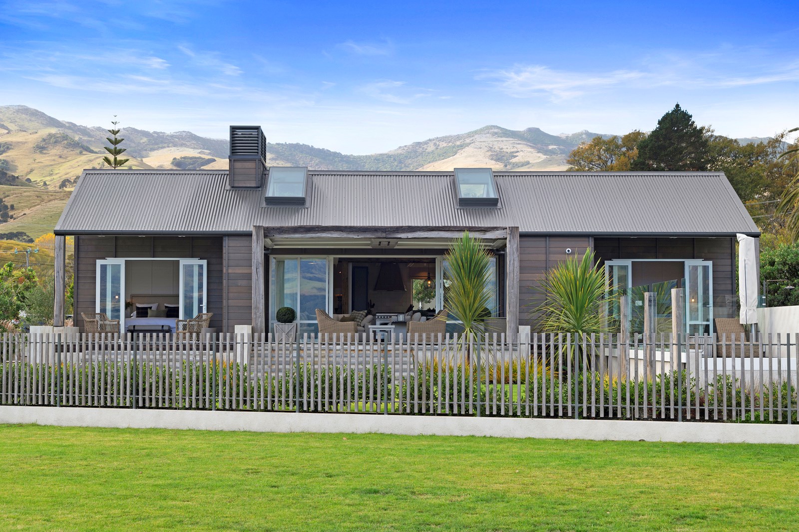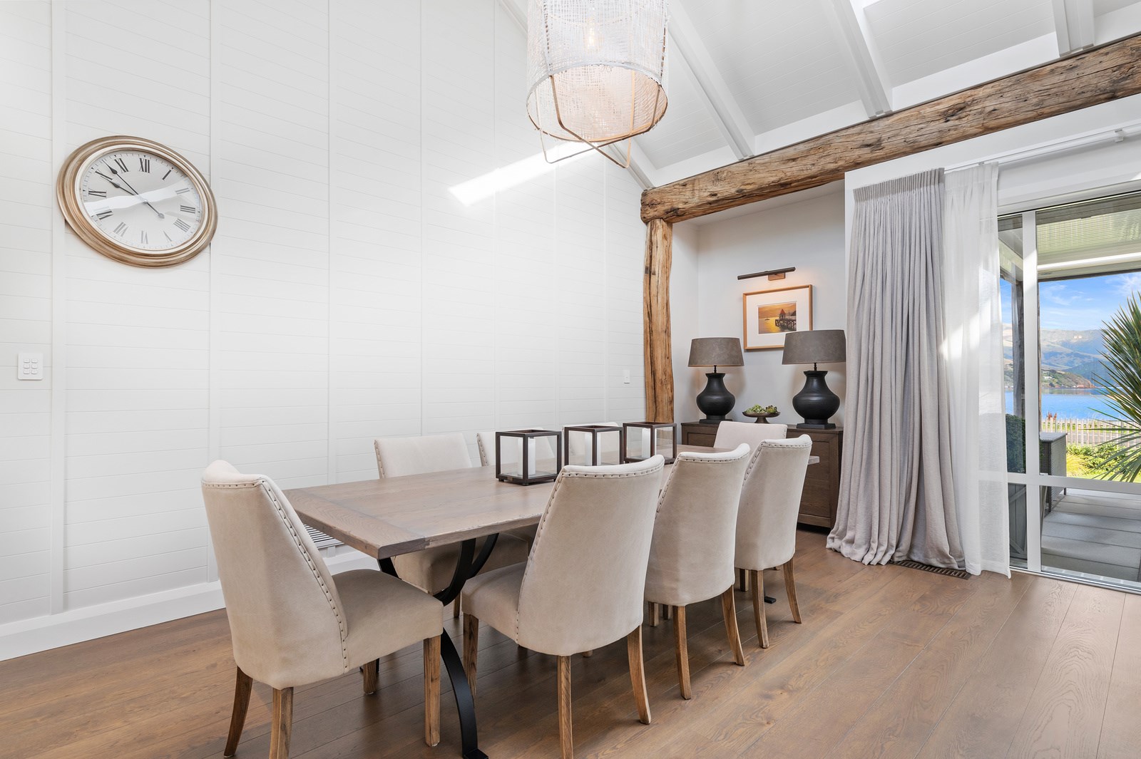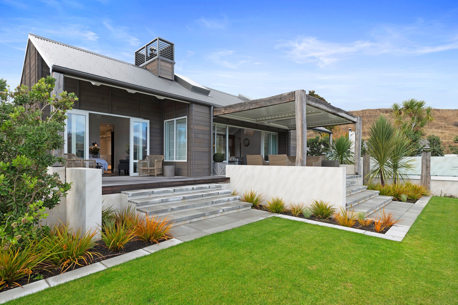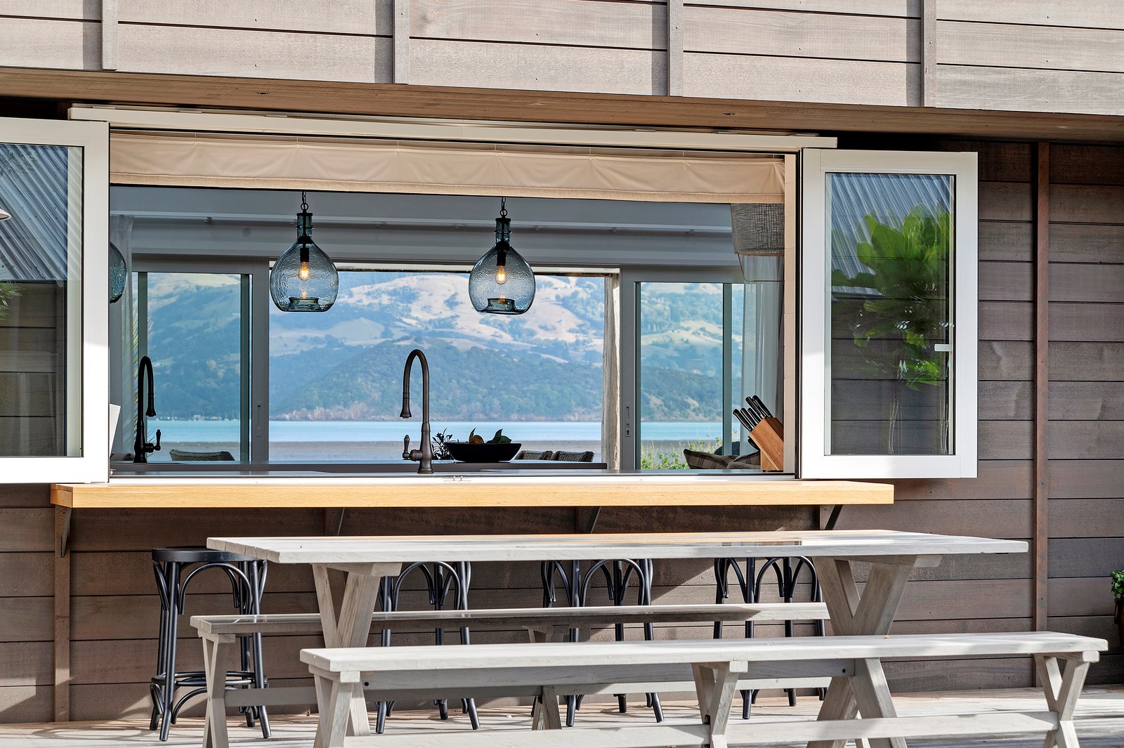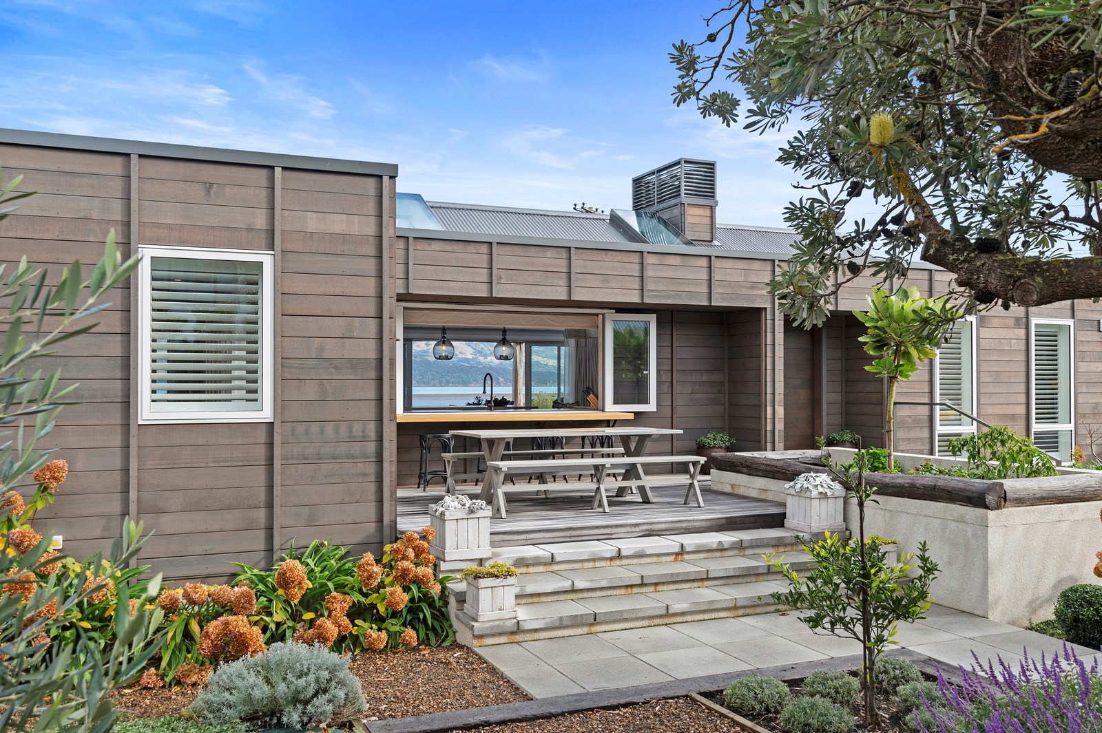 Drawing inspiration from the original coastal cribs found on Banks Peninsula, horizontal rusticated cedar weatherboard with vertical display battens have been used to clad this Takamatua Bay house. Mitred corners indicate the level of craftsmanship involved. One-of-a-kind, rustic 300-year-old oak beams, sourced from France, are a unique focal point of the home. More than just decoration, the beams are a large part of the structural integrity, with all roof structures supported by them. Soffits are cedar or grooved ply with exposed-steel rafters sandwiched in timber to match those of the interior.