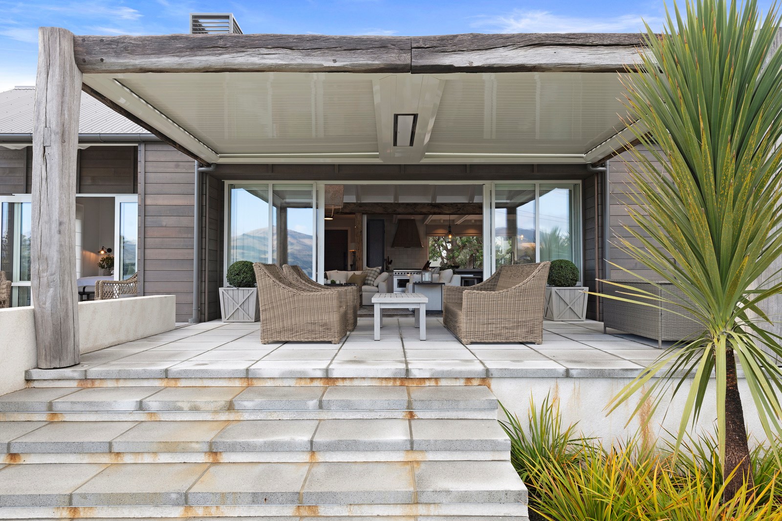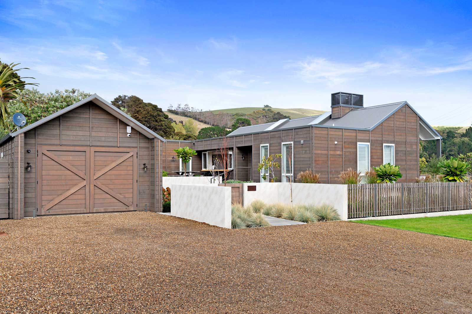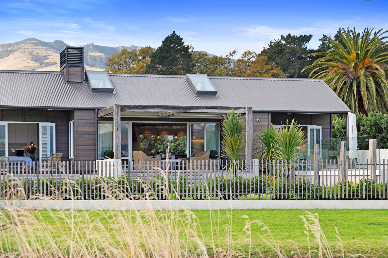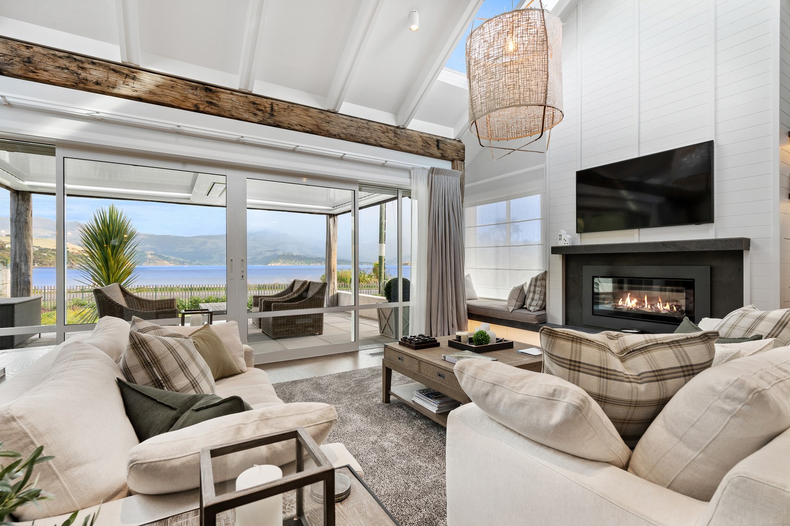 Drawing inspiration from the original coastal cribs found on Banks Peninsula, horizontal rusticated cedar weatherboard with vertical display battens have been used to clad this Takamatua Bay house. Mitred corners indicate the level of craftsmanship involved. One-of-a-kind, rustic 300-year-old oak beams, sourced from France, are a unique focal point of the home. More than just decoration, the beams are a large part of the structural integrity, with all roof structures supported by them. Soffits are cedar or grooved ply with exposed-steel rafters sandwiched in timber to match those of the interior.