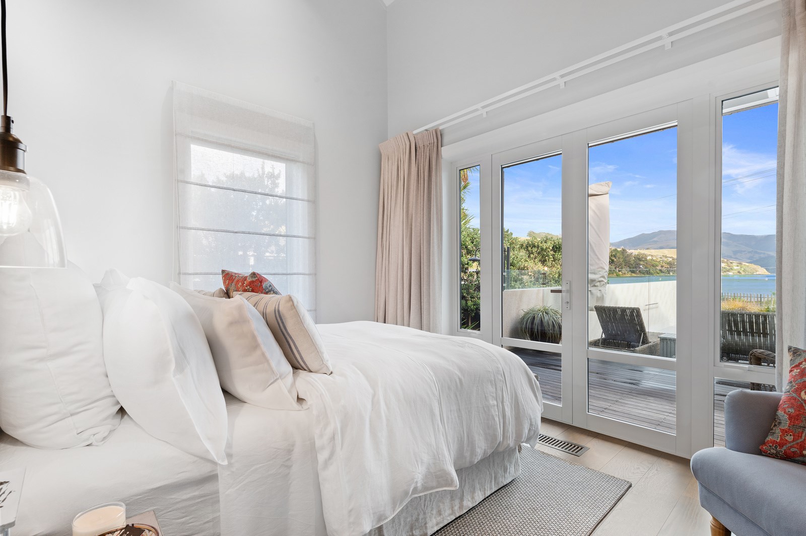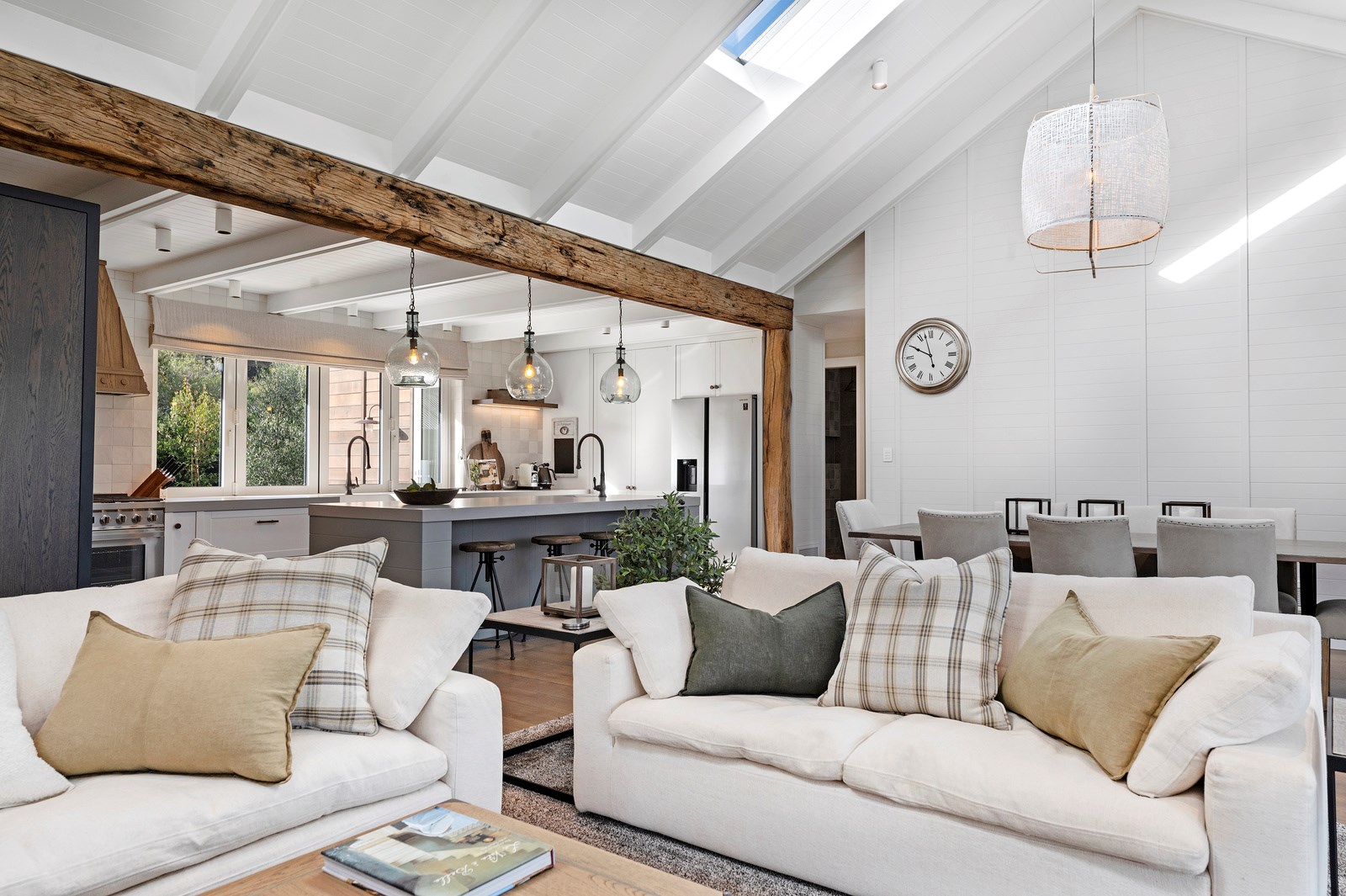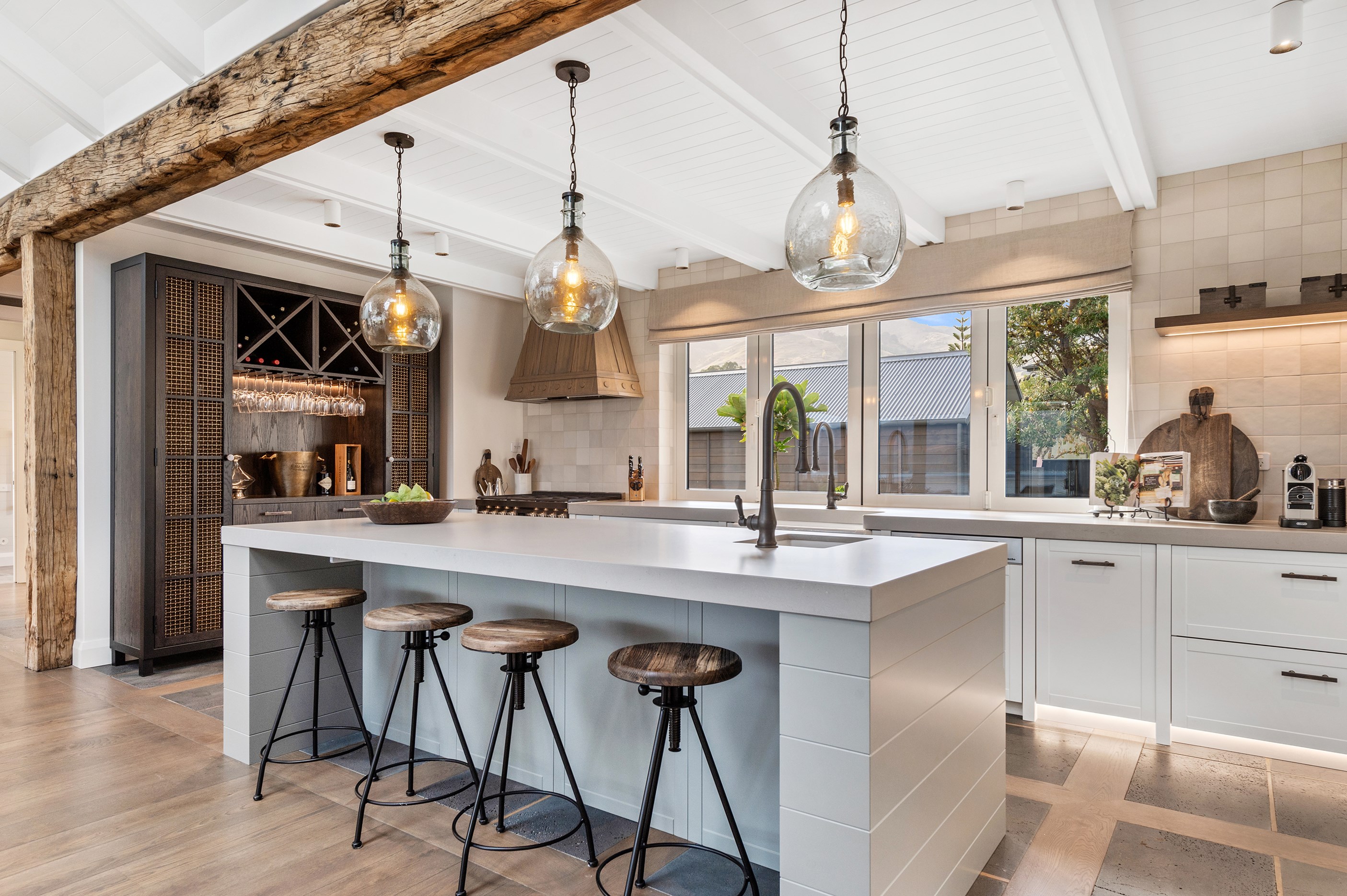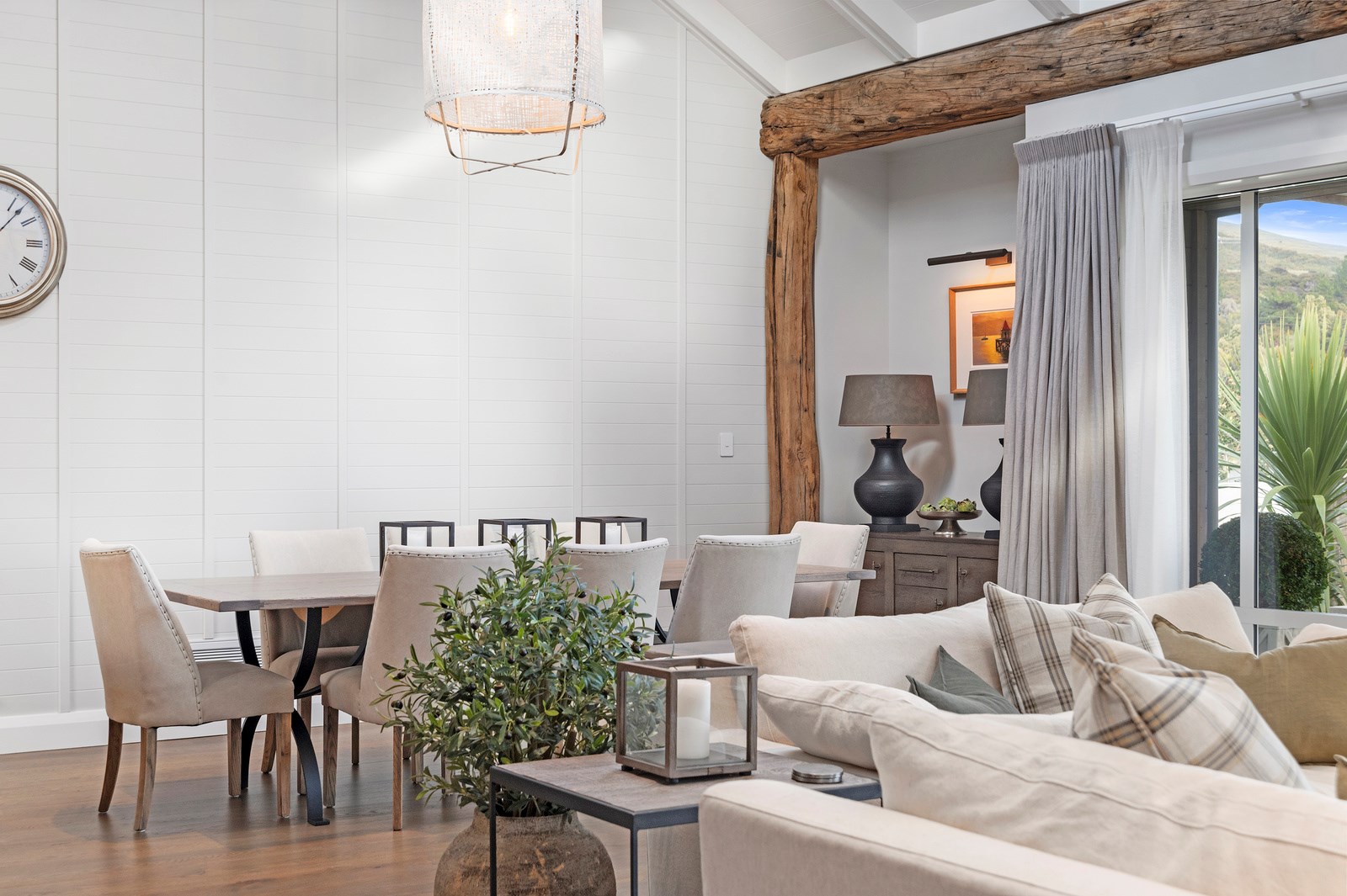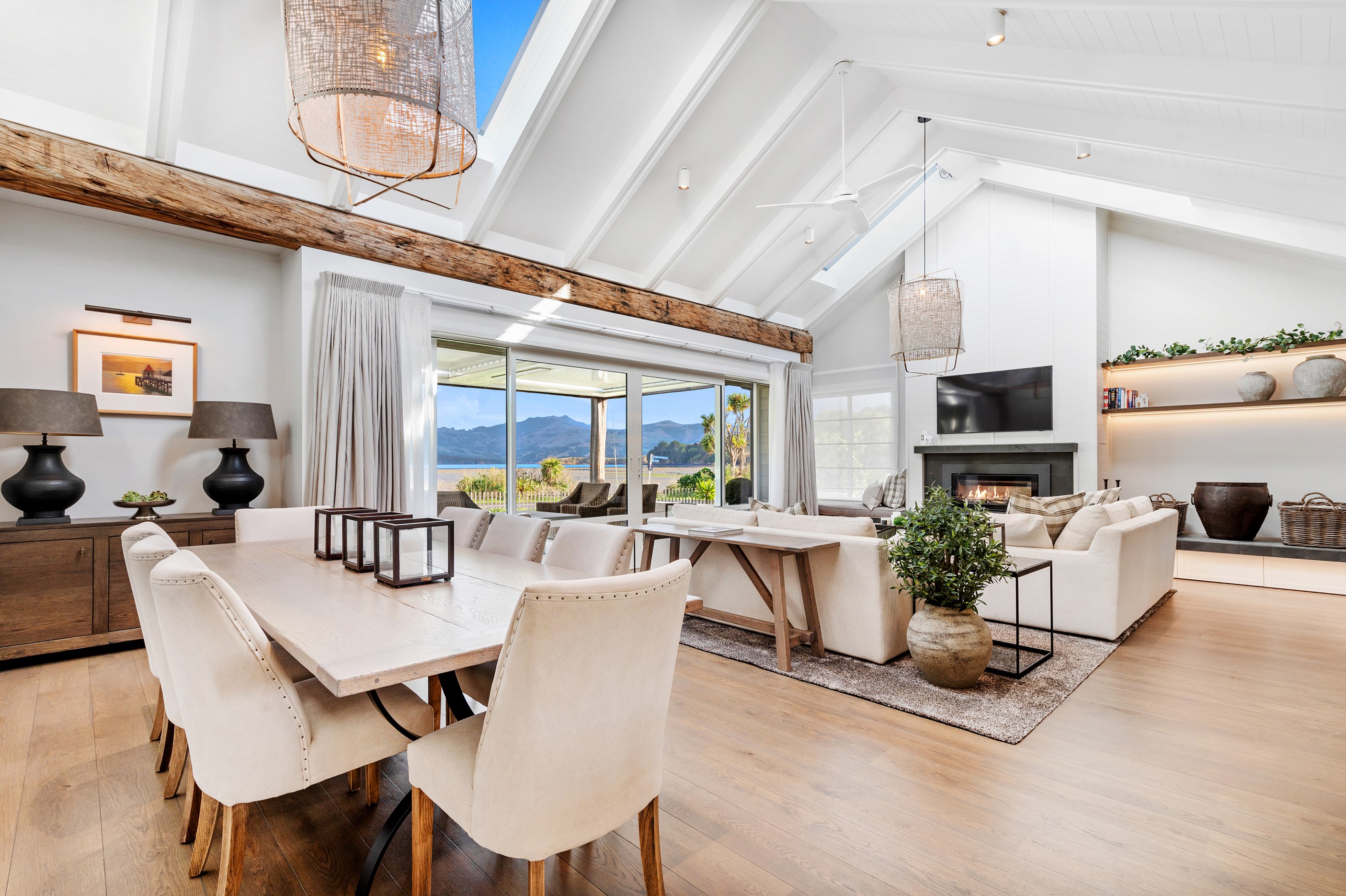 Drawing inspiration from the original coastal cribs found on Banks Peninsula, horizontal rusticated cedar weatherboard with vertical display battens have been used to clad this Takamatua Bay house. Mitred corners indicate the level of craftsmanship involved. One-of-a-kind, rustic 300-year-old oak beams, sourced from France, are a unique focal point of the home. More than just decoration, the beams are a large part of the structural integrity, with all roof structures supported by them. Soffits are cedar or grooved ply with exposed-steel rafters sandwiched in timber to match those of the interior.