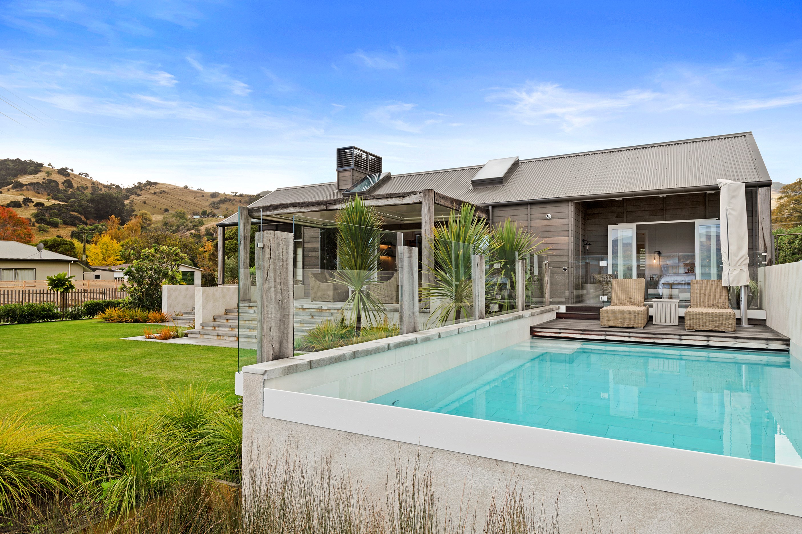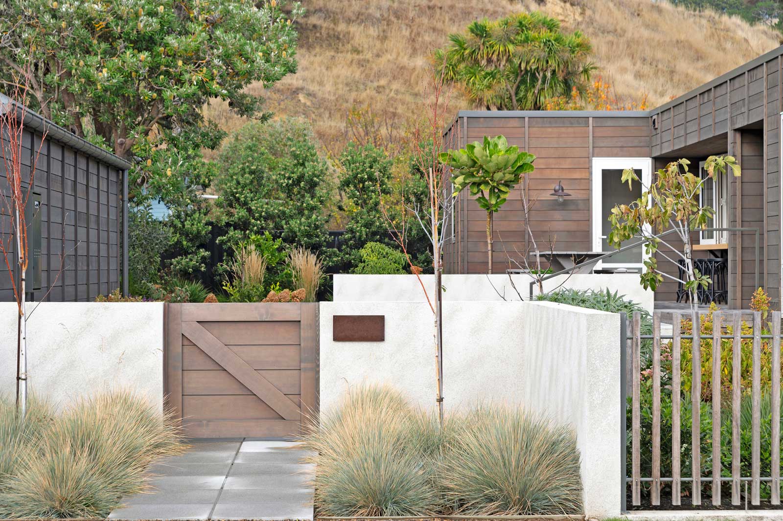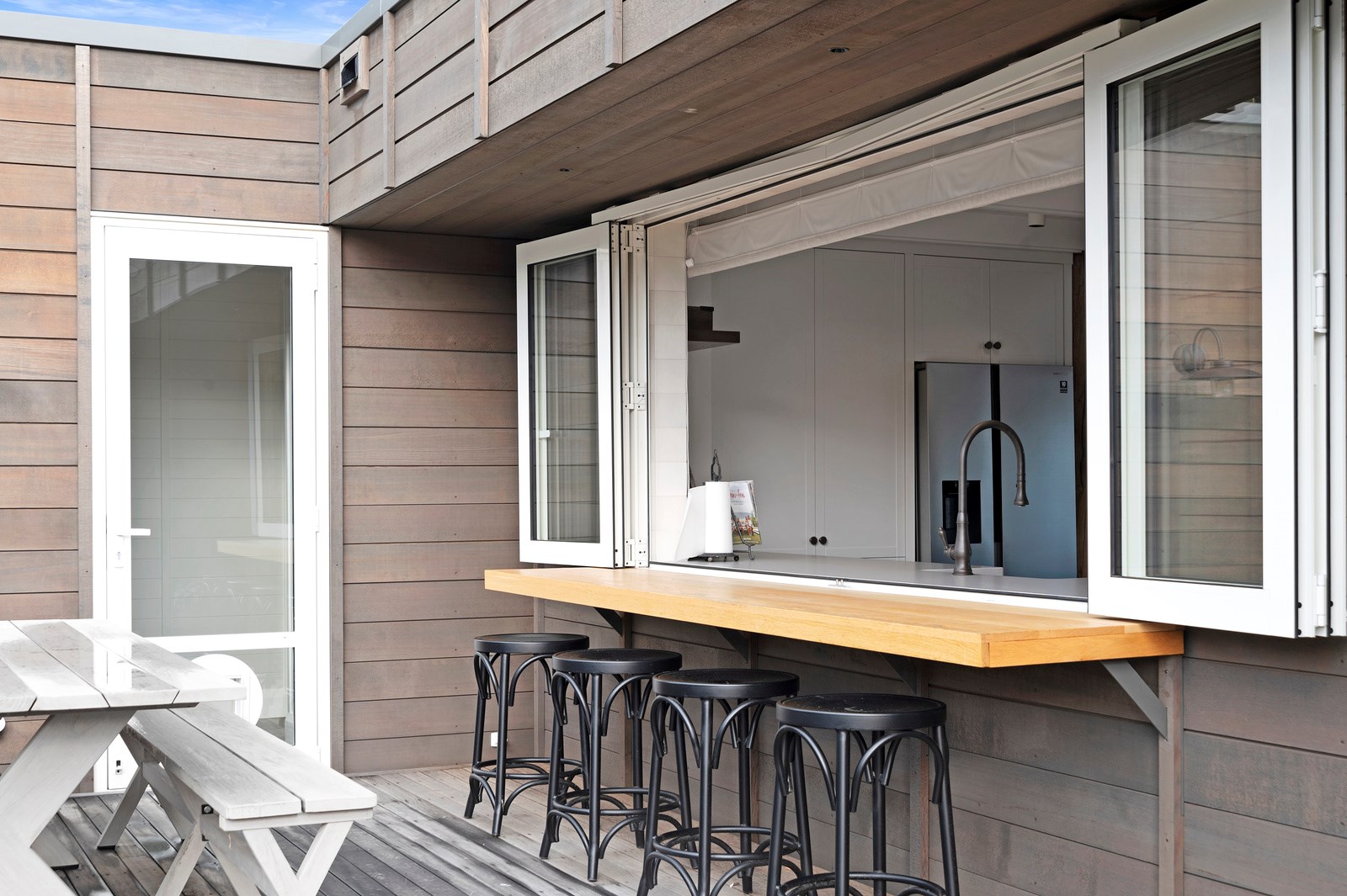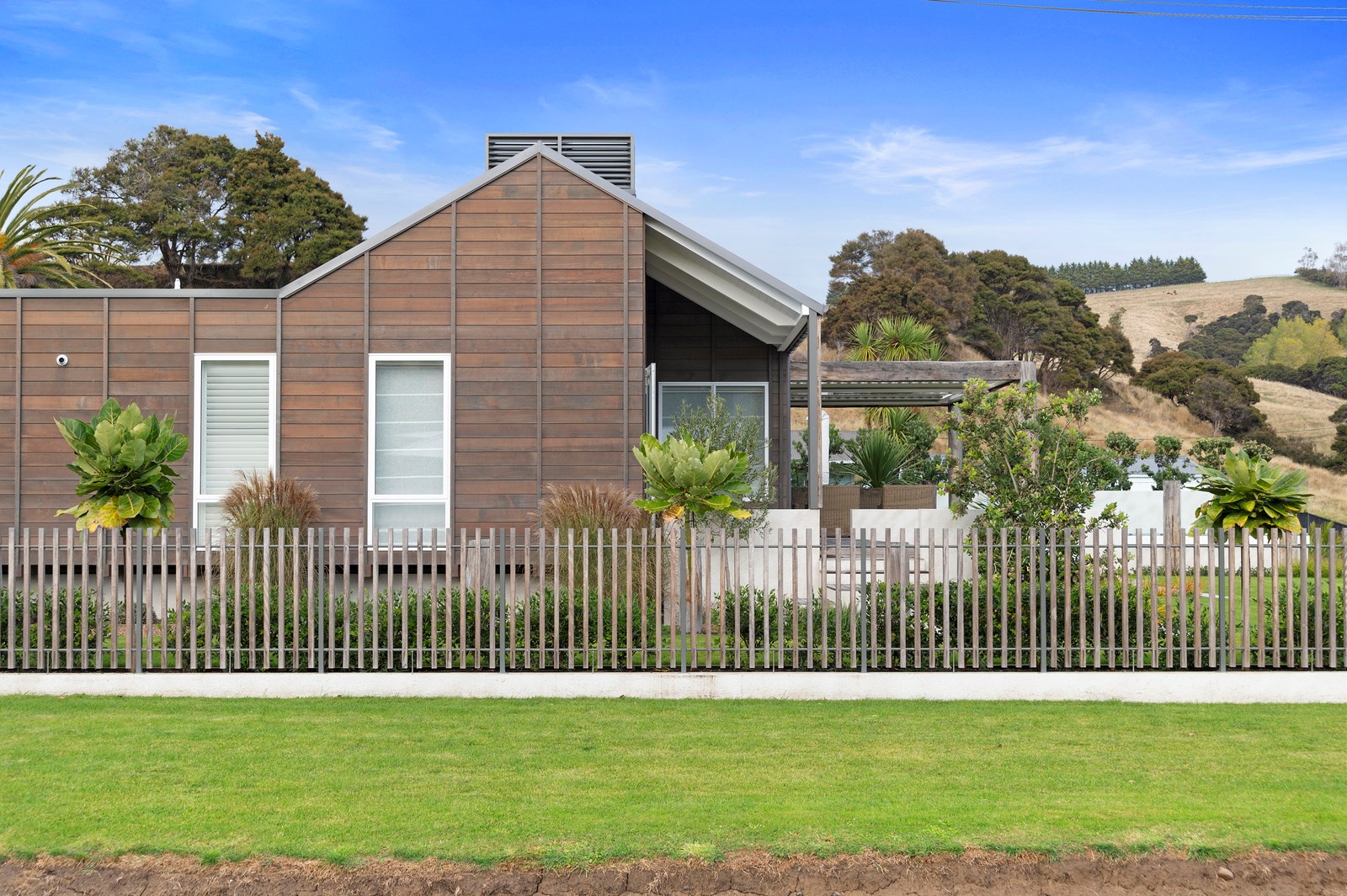 Drawing inspiration from the original coastal cribs found on Banks Peninsula, horizontal rusticated cedar weatherboard with vertical display battens have been used to clad this Takamatua Bay house. Mitred corners indicate the level of craftsmanship involved. One-of-a-kind, rustic 300-year-old oak beams, sourced from France, are a unique focal point of the home. More than just decoration, the beams are a large part of the structural integrity, with all roof structures supported by them. Soffits are cedar or grooved ply with exposed-steel rafters sandwiched in timber to match those of the interior.