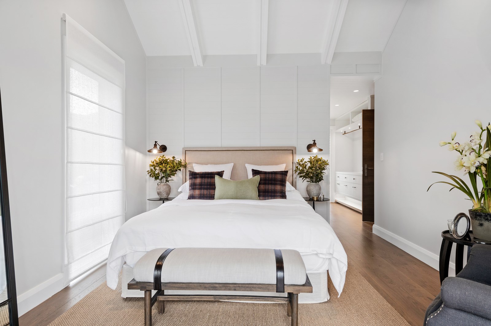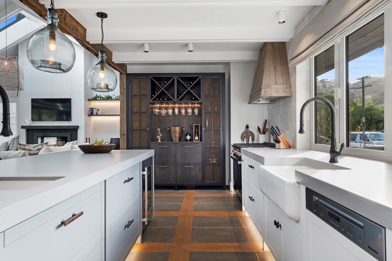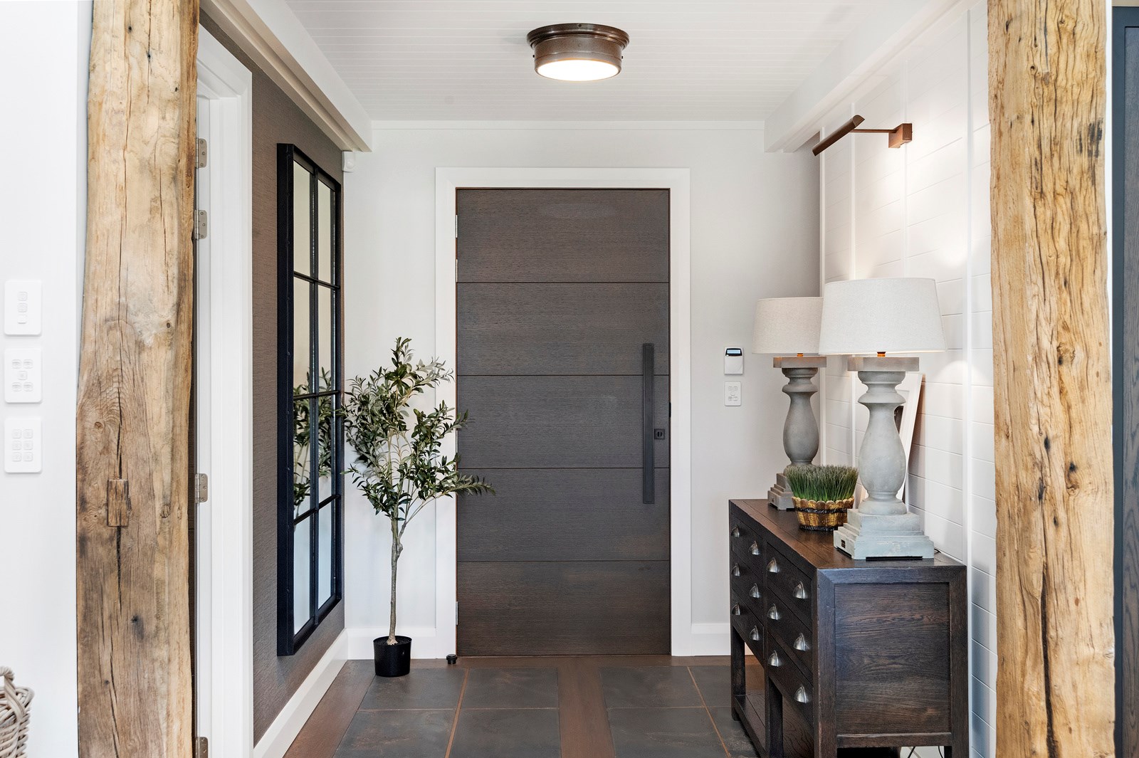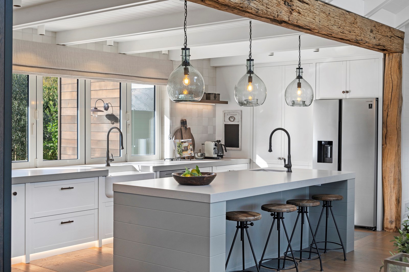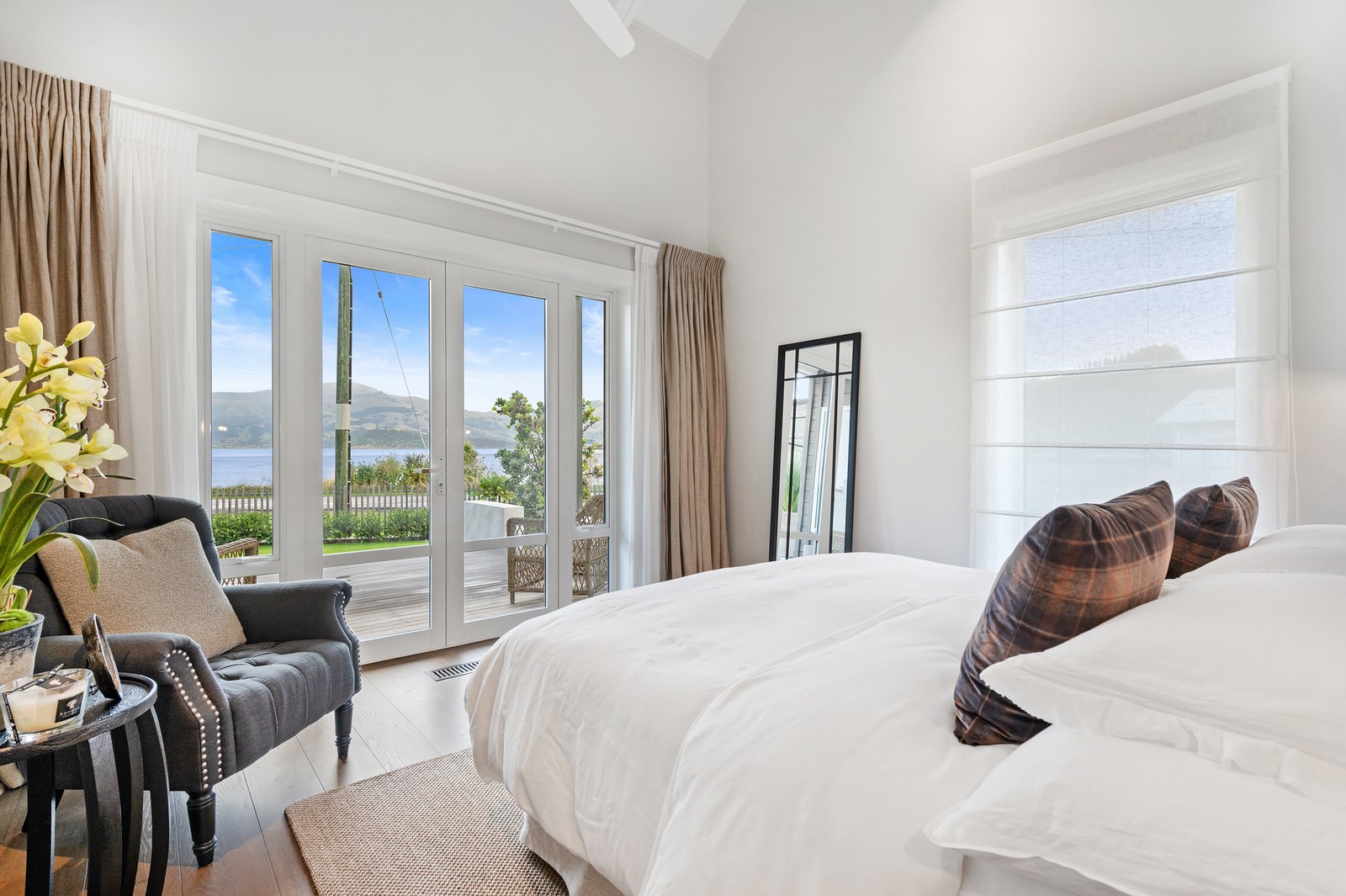 Drawing inspiration from the original coastal cribs found on Banks Peninsula, horizontal rusticated cedar weatherboard with vertical display battens have been used to clad this Takamatua Bay house. Mitred corners indicate the level of craftsmanship involved. One-of-a-kind, rustic 300-year-old oak beams, sourced from France, are a unique focal point of the home. More than just decoration, the beams are a large part of the structural integrity, with all roof structures supported by them. Soffits are cedar or grooved ply with exposed-steel rafters sandwiched in timber to match those of the interior.