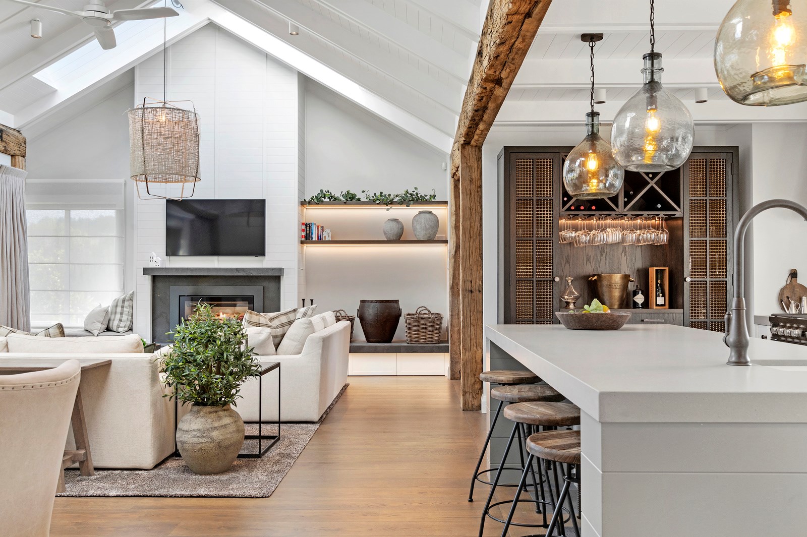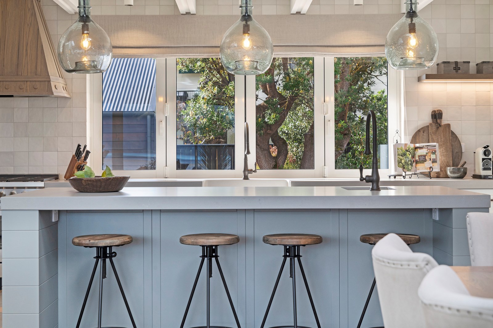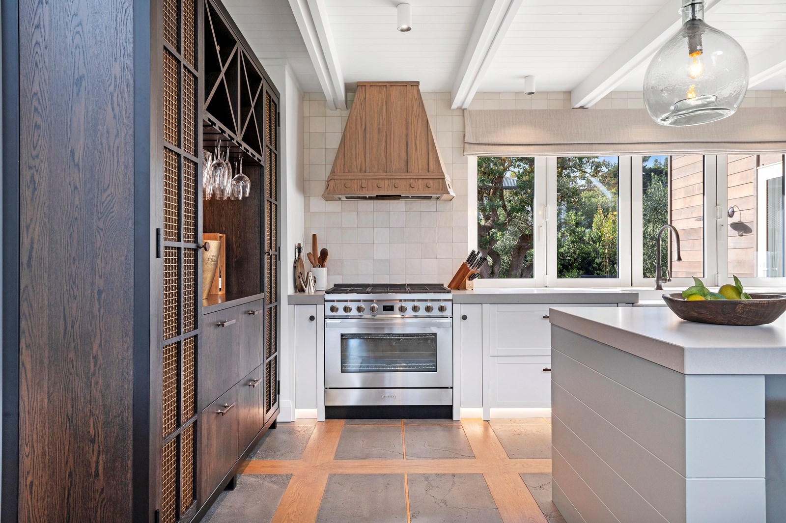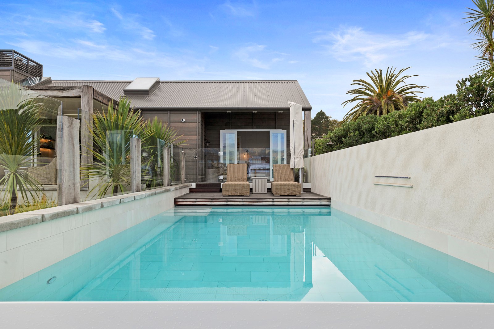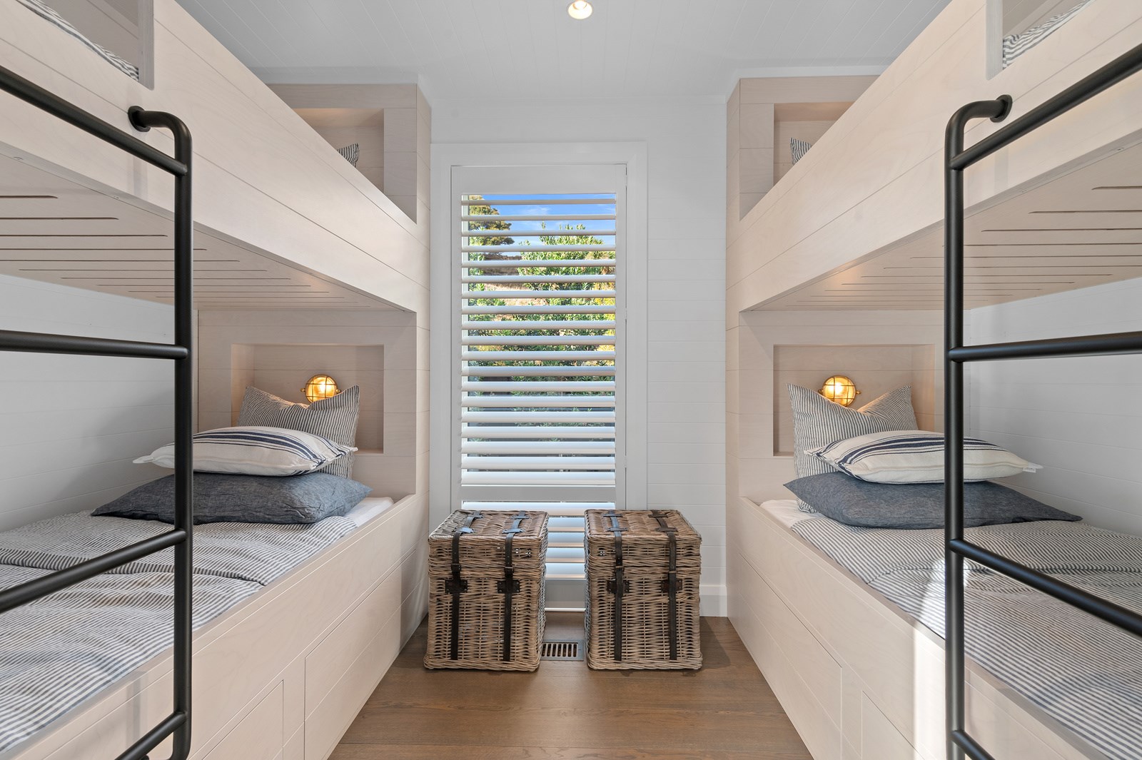 Grooved plywood also lines the walls throughout the house. At the heart of the home, luxurious textured rafters with a raked ceiling, a grand fireplace with bluestone hearth in the living room, oak flooring and built-in shelving tie the different spaces together. And those French oak beams are also a significant feature inside. Every room keeps within the coastal aesthetic and exudes luxury lodge vibes. The warm, earthy tones of tiling, benchtops and splashbacks, and blue-grey and dark timber cabinetry, come together beautifully. Morning and afternoon terraces, and a swimming pool, bring life outside. A separate guest wing and nautical-themed bunk room allow an overflow of guests to enjoy a very comfortable beachside break.