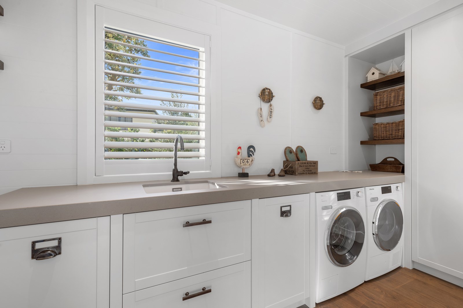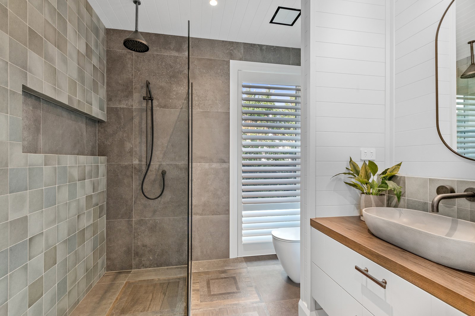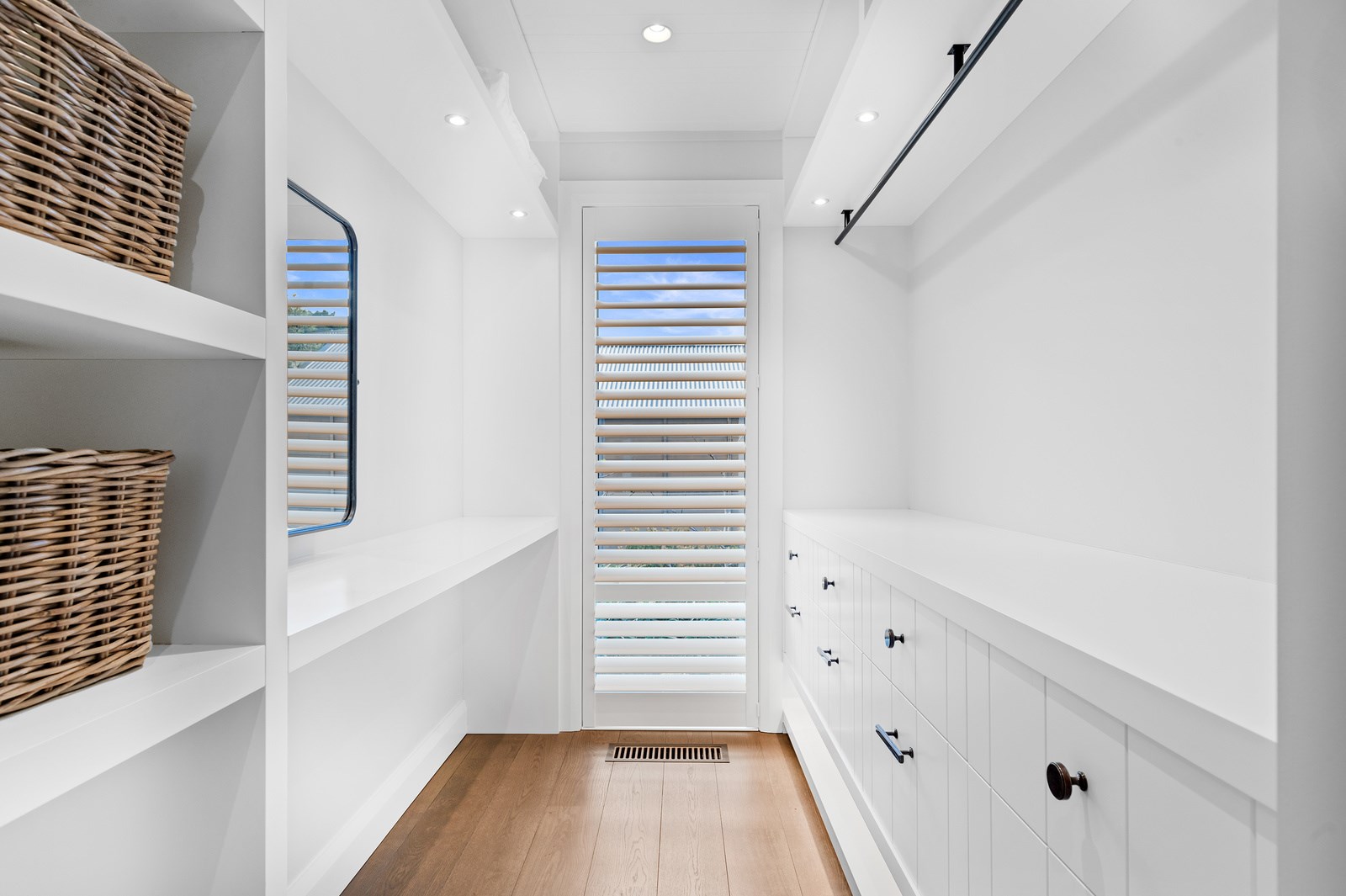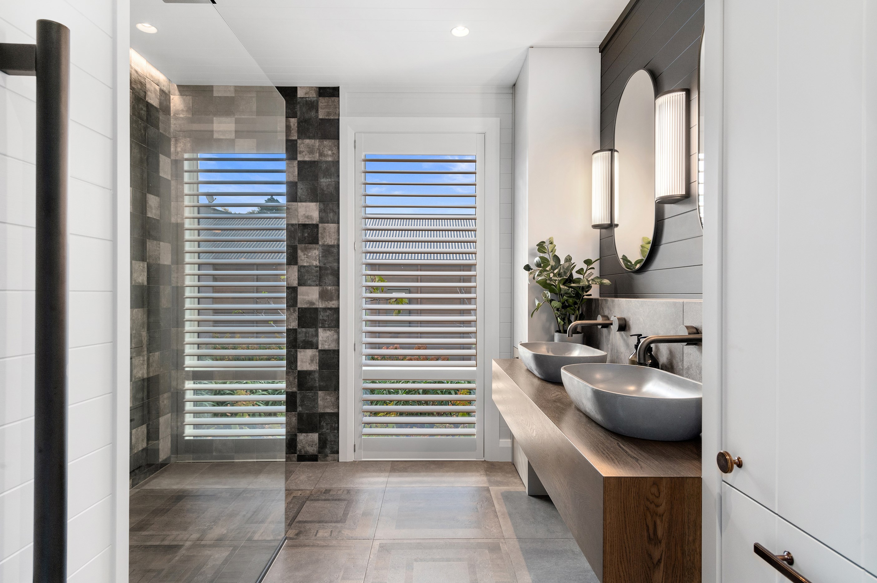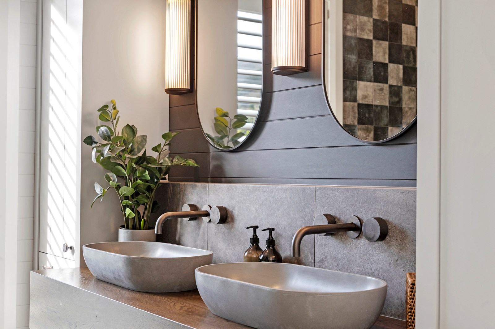 Grooved plywood also lines the walls throughout the house. At the heart of the home, luxurious textured rafters with a raked ceiling, a grand fireplace with bluestone hearth in the living room, oak flooring and built-in shelving tie the different spaces together. And those French oak beams are also a significant feature inside. Every room keeps within the coastal aesthetic and exudes luxury lodge vibes. The warm, earthy tones of tiling, benchtops and splashbacks, and blue-grey and dark timber cabinetry, come together beautifully. Morning and afternoon terraces, and a swimming pool, bring life outside. A separate guest wing and nautical-themed bunk room allow an overflow of guests to enjoy a very comfortable beachside break.