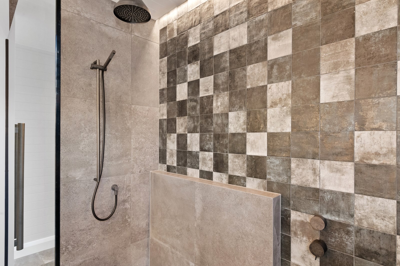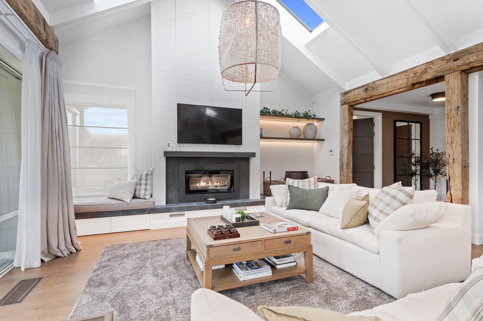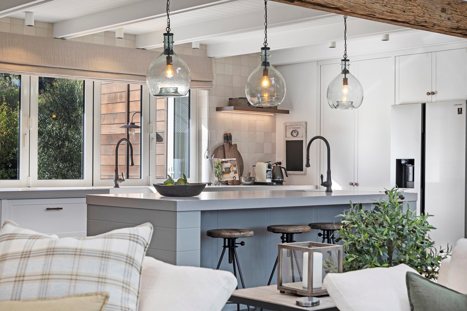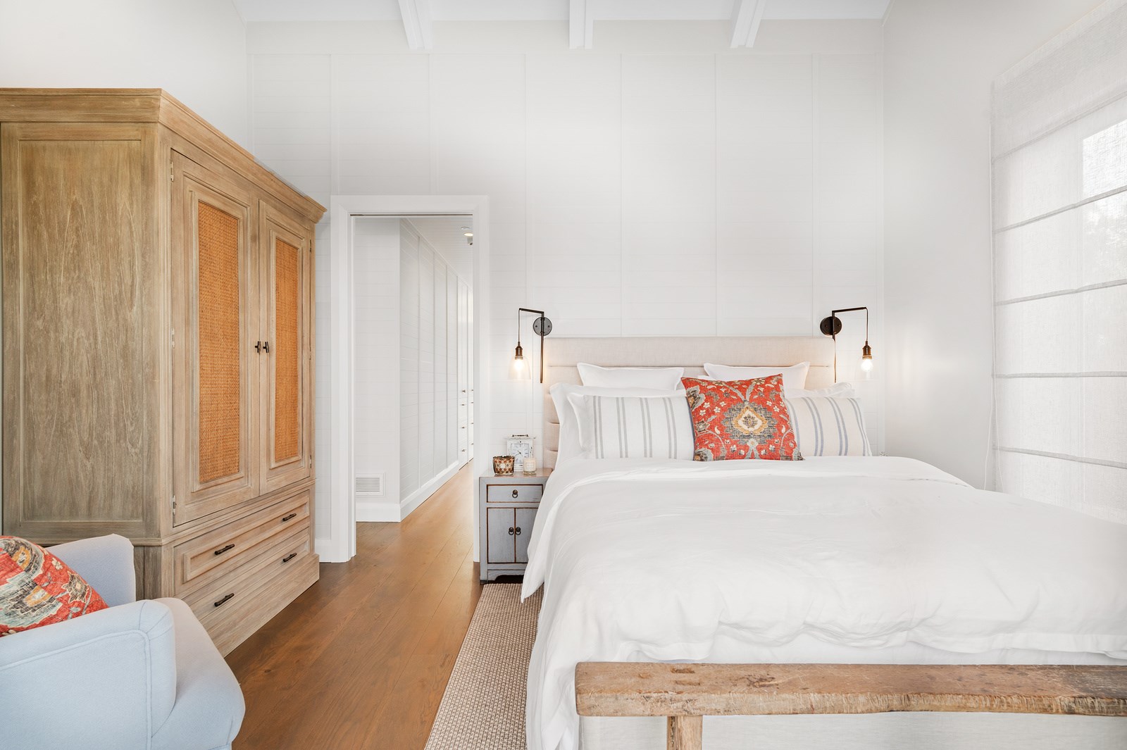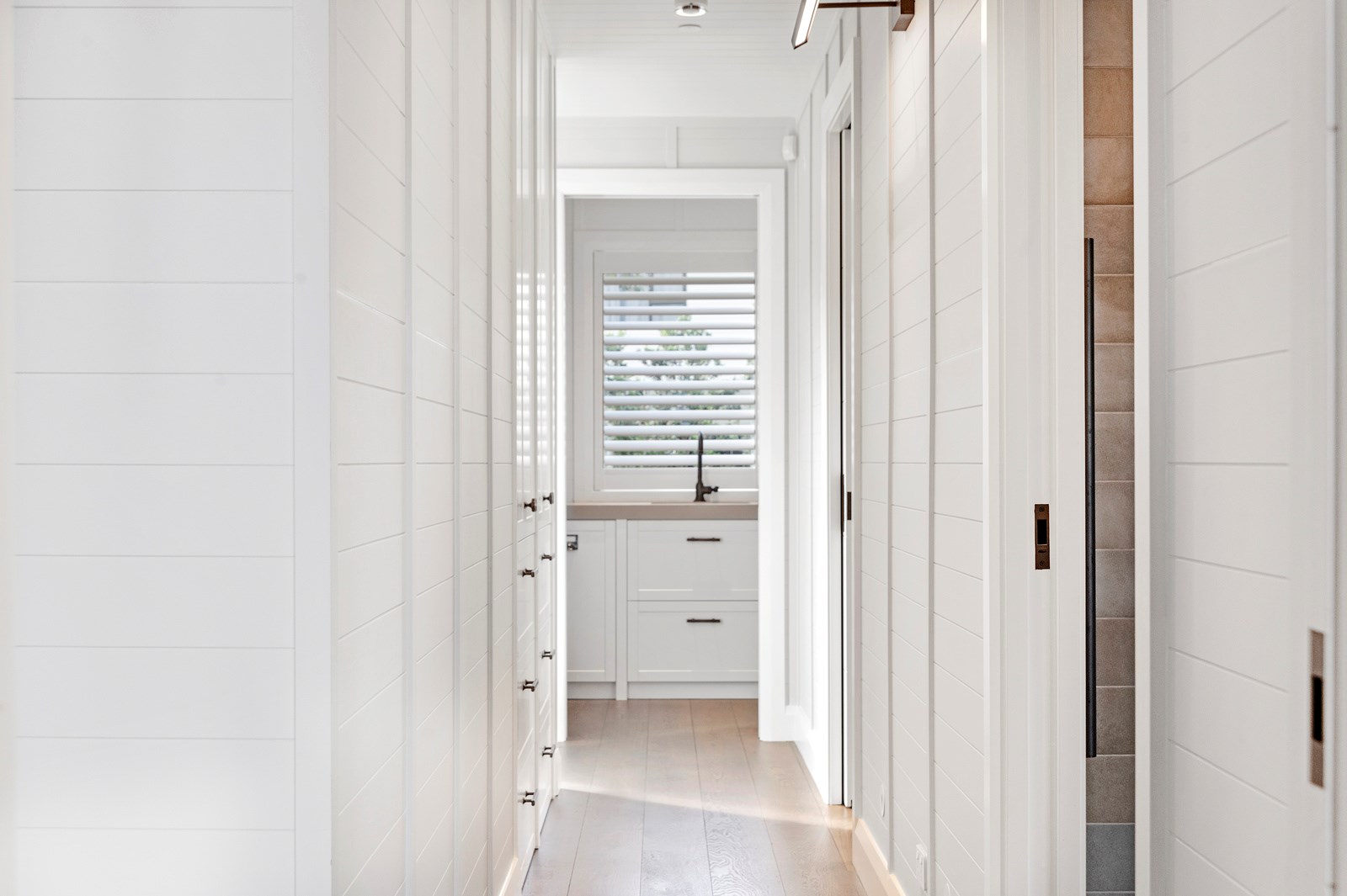 Grooved plywood also lines the walls throughout the house. At the heart of the home, luxurious textured rafters with a raked ceiling, a grand fireplace with bluestone hearth in the living room, oak flooring and built-in shelving tie the different spaces together. And those French oak beams are also a significant feature inside. Every room keeps within the coastal aesthetic and exudes luxury lodge vibes. The warm, earthy tones of tiling, benchtops and splashbacks, and blue-grey and dark timber cabinetry, come together beautifully. Morning and afternoon terraces, and a swimming pool, bring life outside. A separate guest wing and nautical-themed bunk room allow an overflow of guests to enjoy a very comfortable beachside break.