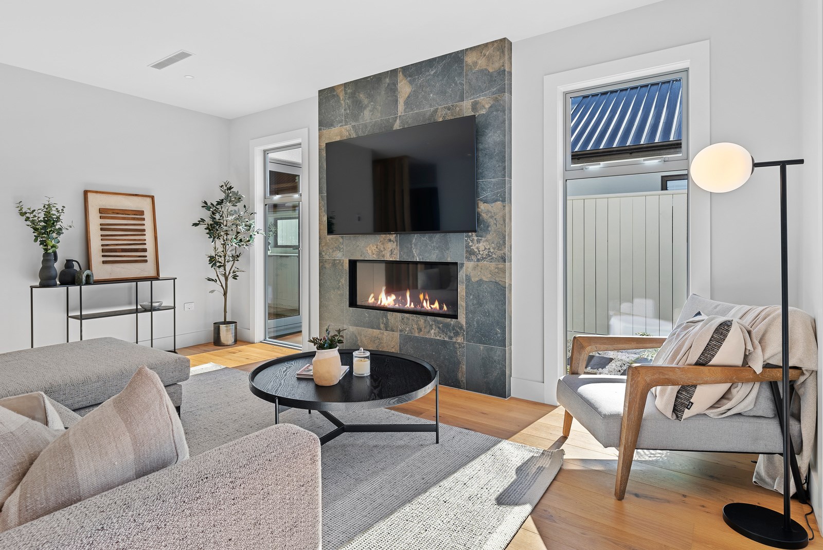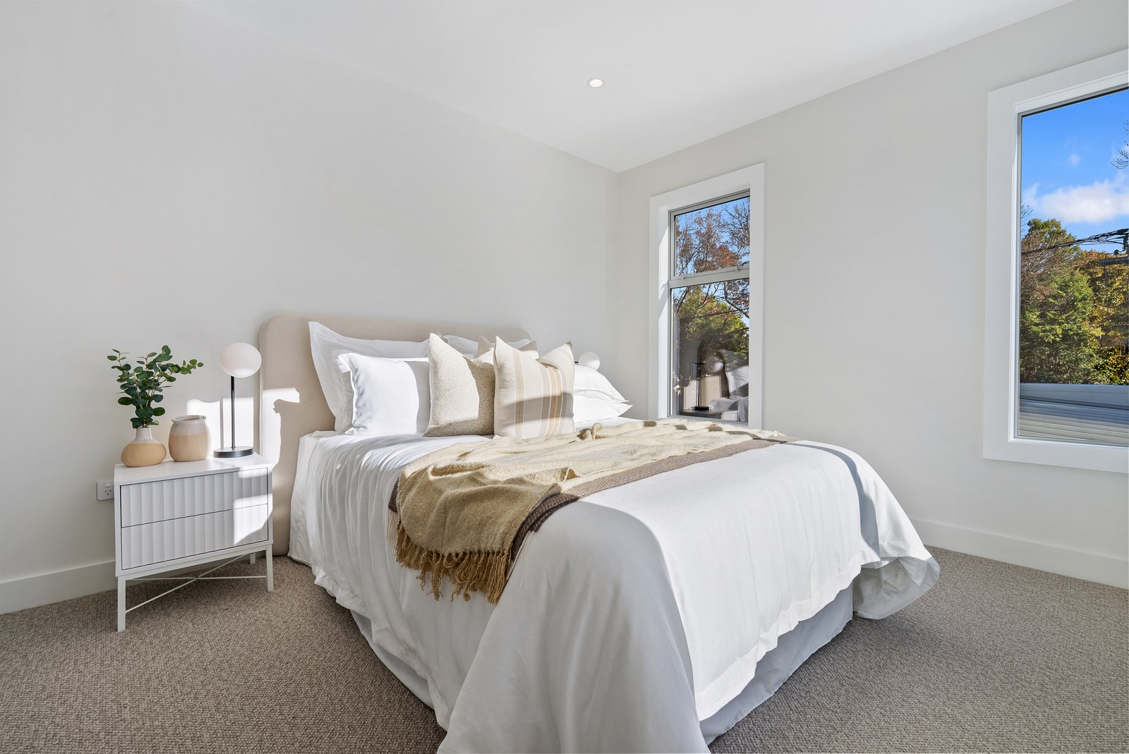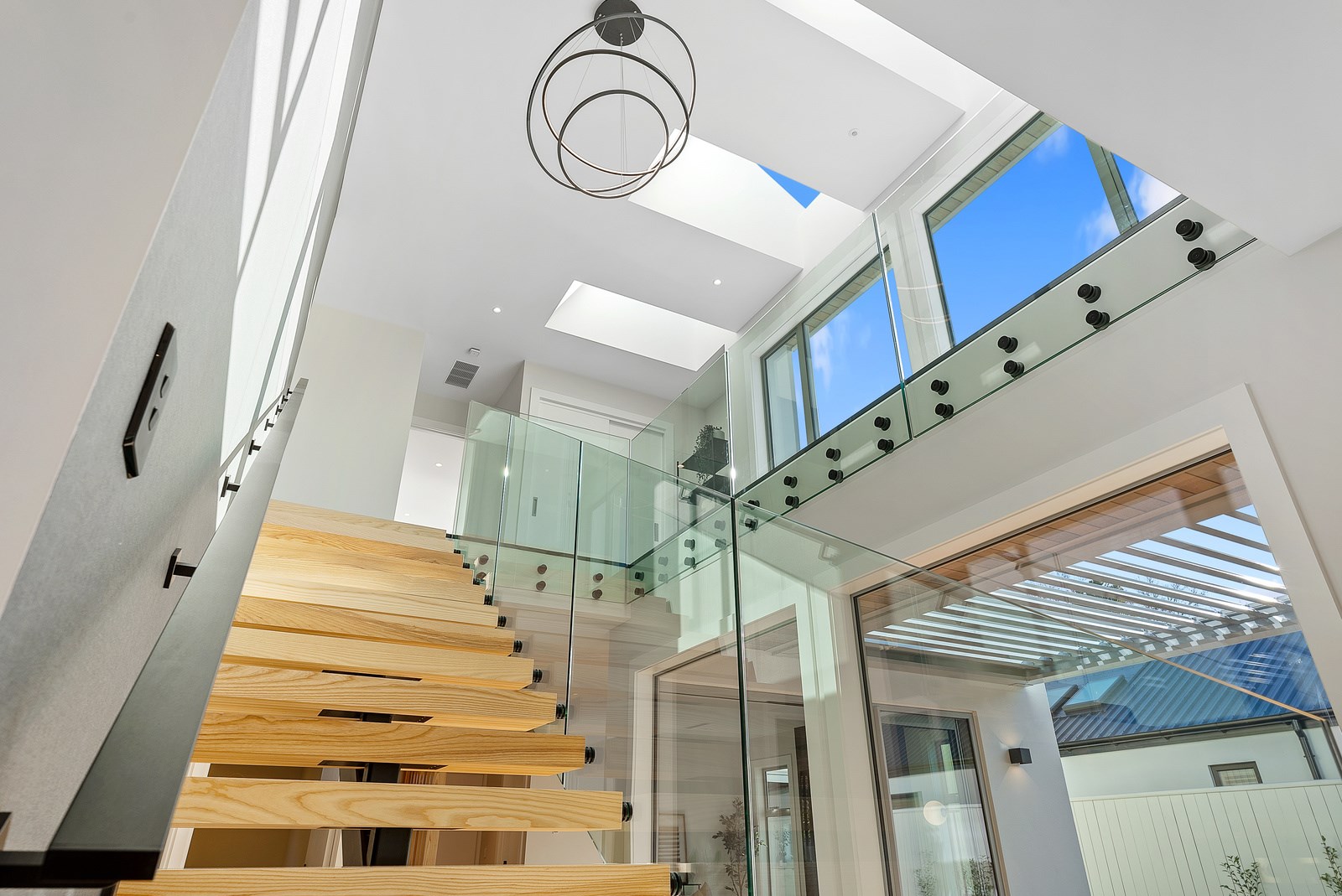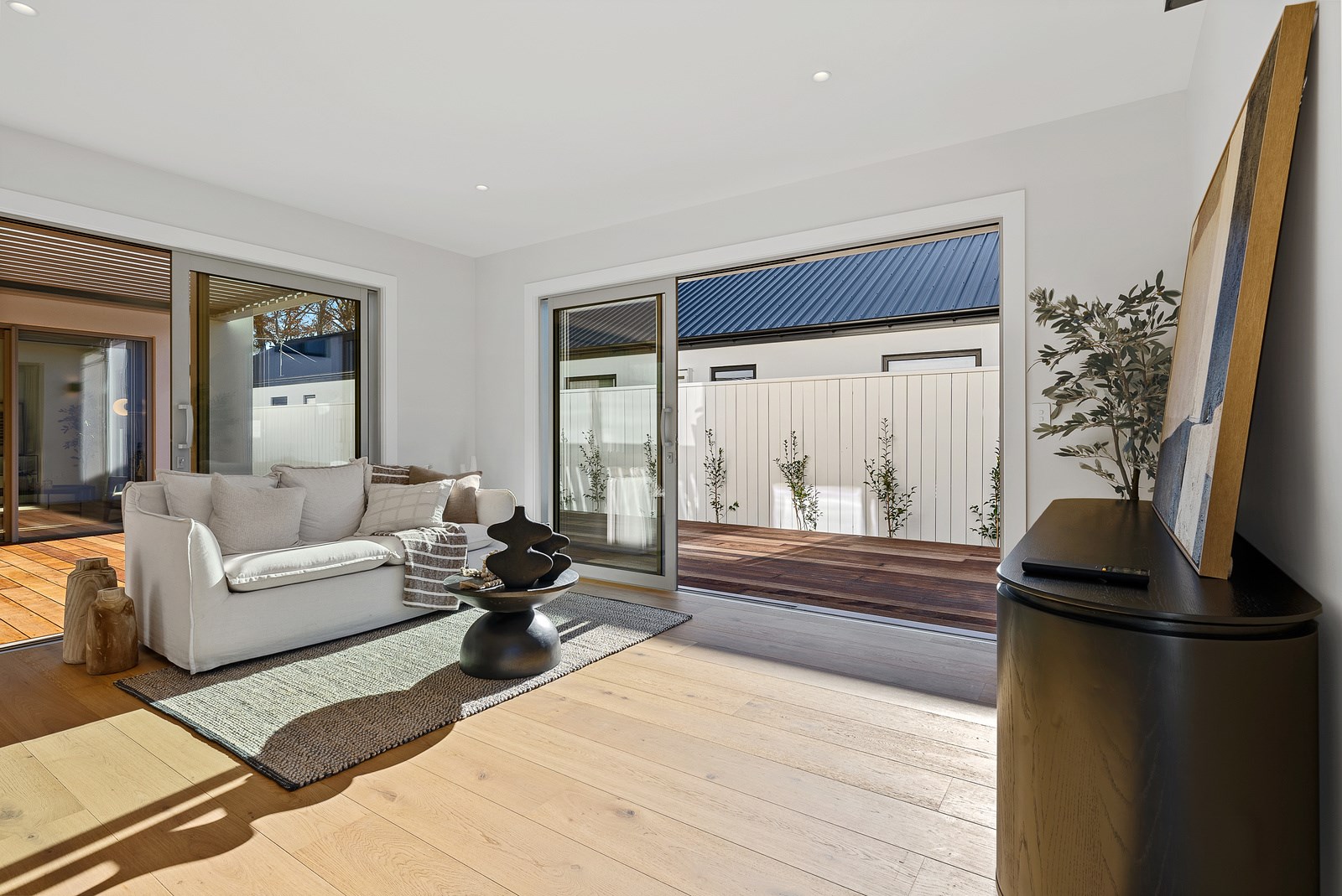 A fireplace feature wall is a stunning focal point in one of the two living rooms, as is a stylish floating staircase to the second floor. Sustainability was front of mind when the home was built – it’s set back from the street to protect 100-year-old trees; the mains power cable was dug by hand beneath existing tree -root systems to ensure they weren’t damaged. No plastic has been used on any window or door frames and all construction materials were recycled where possible. Among its numerous smart features is a PDL Wiser system (including lighting and voice activation), an e-lock on the front door and an outdoor louvre that automatically retracts in the rain. All of which make this ingenious home very easy to live in.