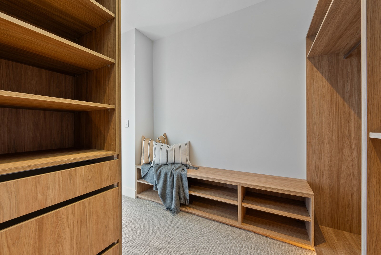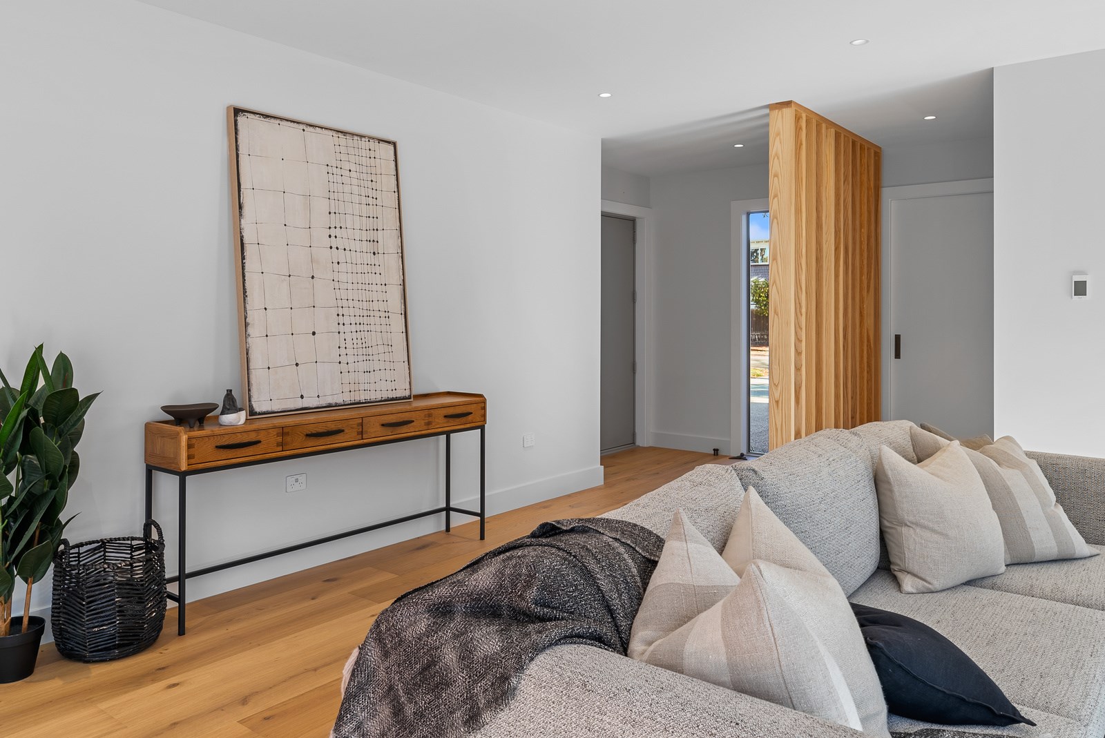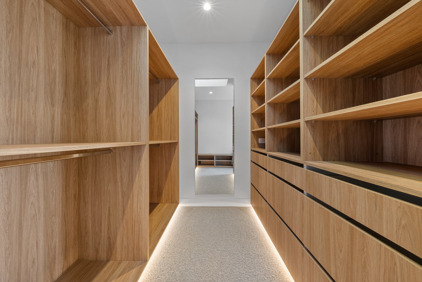 A fireplace feature wall is a stunning focal point in one of the two living rooms, as is a stylish floating staircase to the second floor. Sustainability was front of mind when the home was built – it’s set back from the street to protect 100-year-old trees; the mains power cable was dug by hand beneath existing tree -root systems to ensure they weren’t damaged. No plastic has been used on any window or door frames and all construction materials were recycled where possible. Among its numerous smart features is a PDL Wiser system (including lighting and voice activation), an e-lock on the front door and an outdoor louvre that automatically retracts in the rain. All of which make this ingenious home very easy to live in.