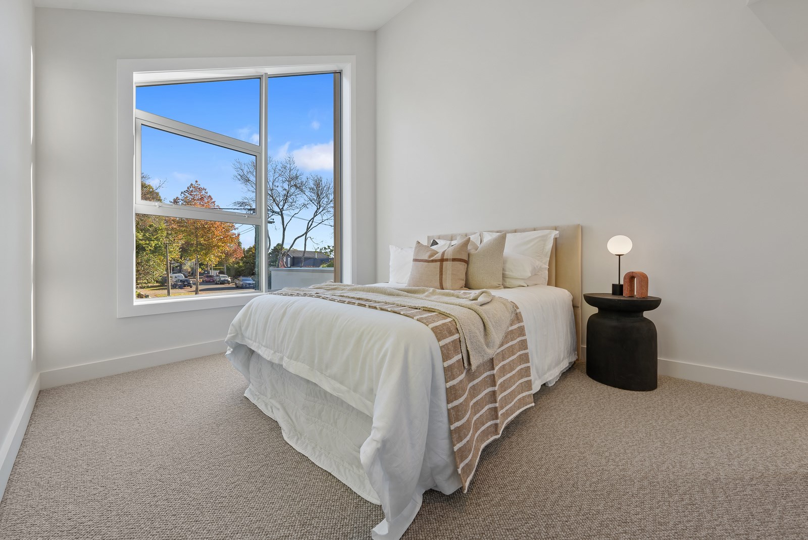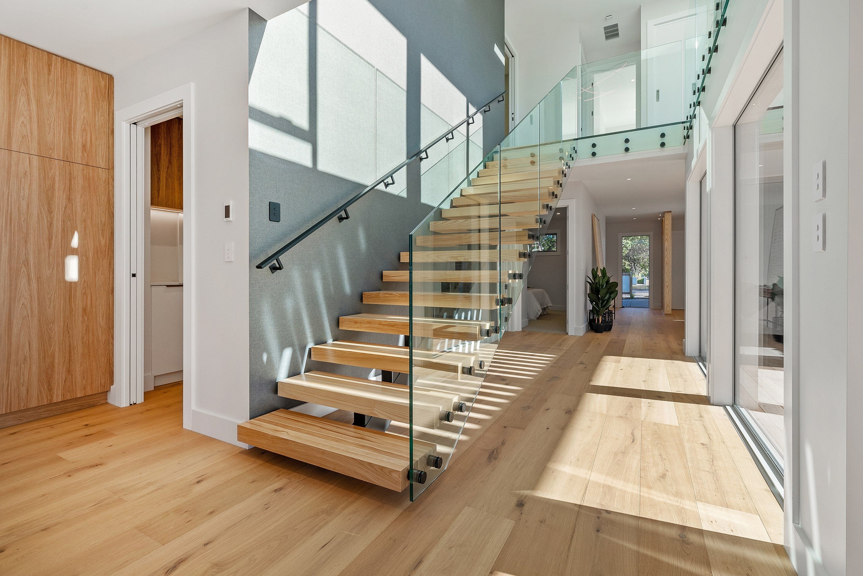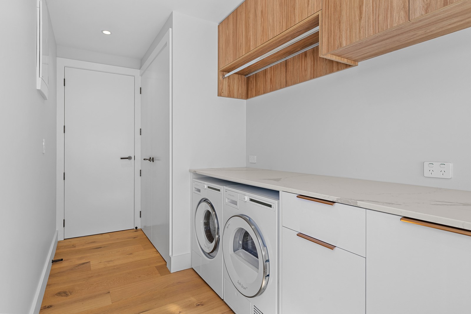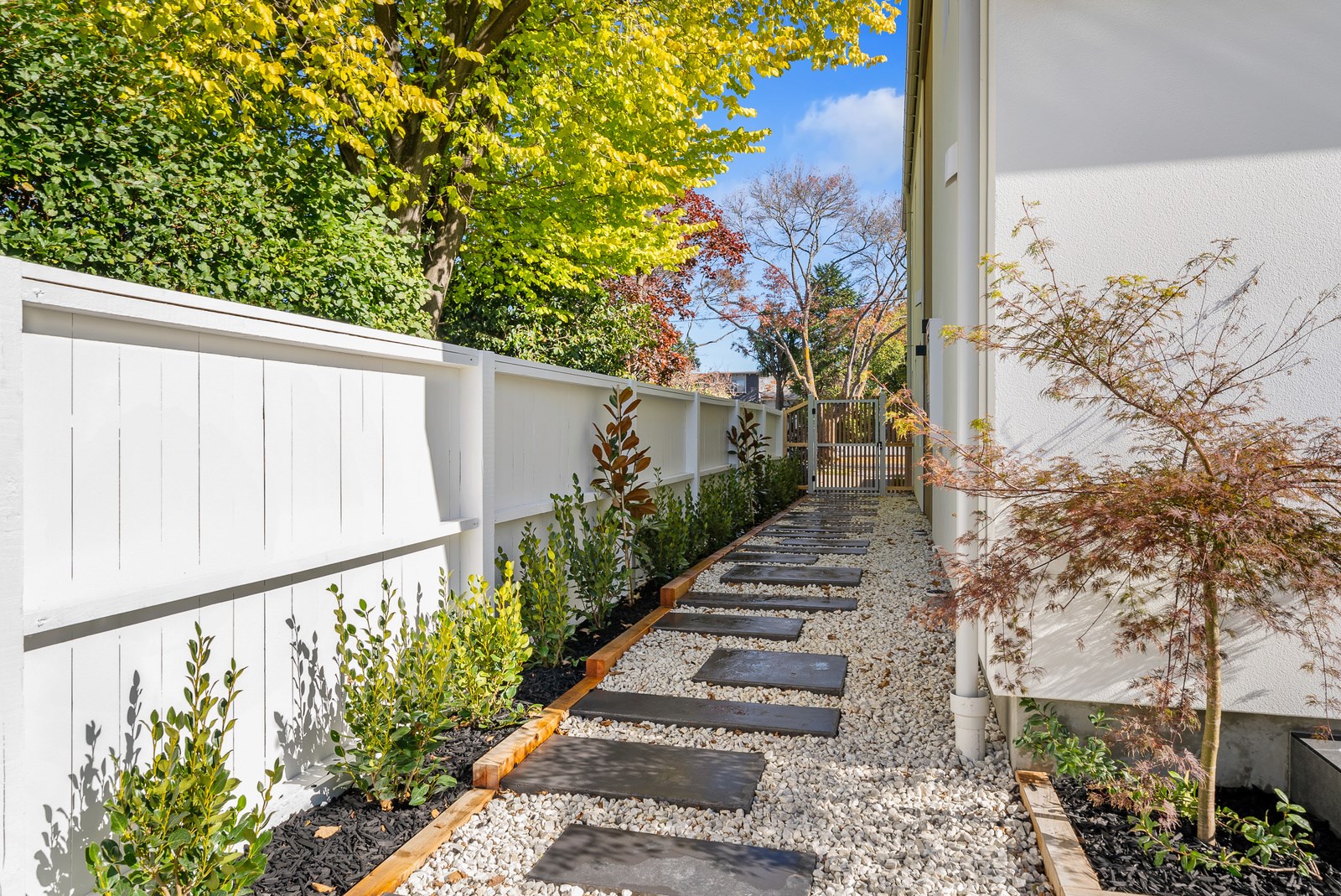 A fireplace feature wall is a stunning focal point in one of the two living rooms, as is a stylish floating staircase to the second floor. Sustainability was front of mind when the home was built – it’s set back from the street to protect 100-year-old trees; the mains power cable was dug by hand beneath existing tree -root systems to ensure they weren’t damaged. No plastic has been used on any window or door frames and all construction materials were recycled where possible. Among its numerous smart features is a PDL Wiser system (including lighting and voice activation), an e-lock on the front door and an outdoor louvre that automatically retracts in the rain. All of which make this ingenious home very easy to live in.