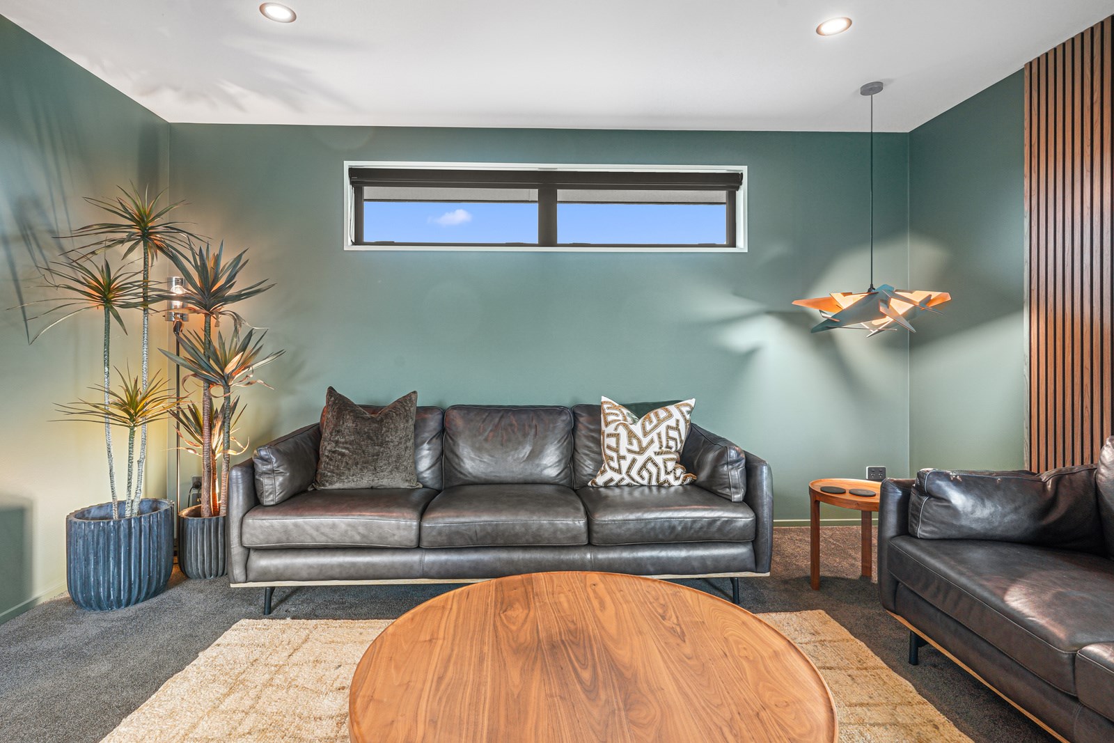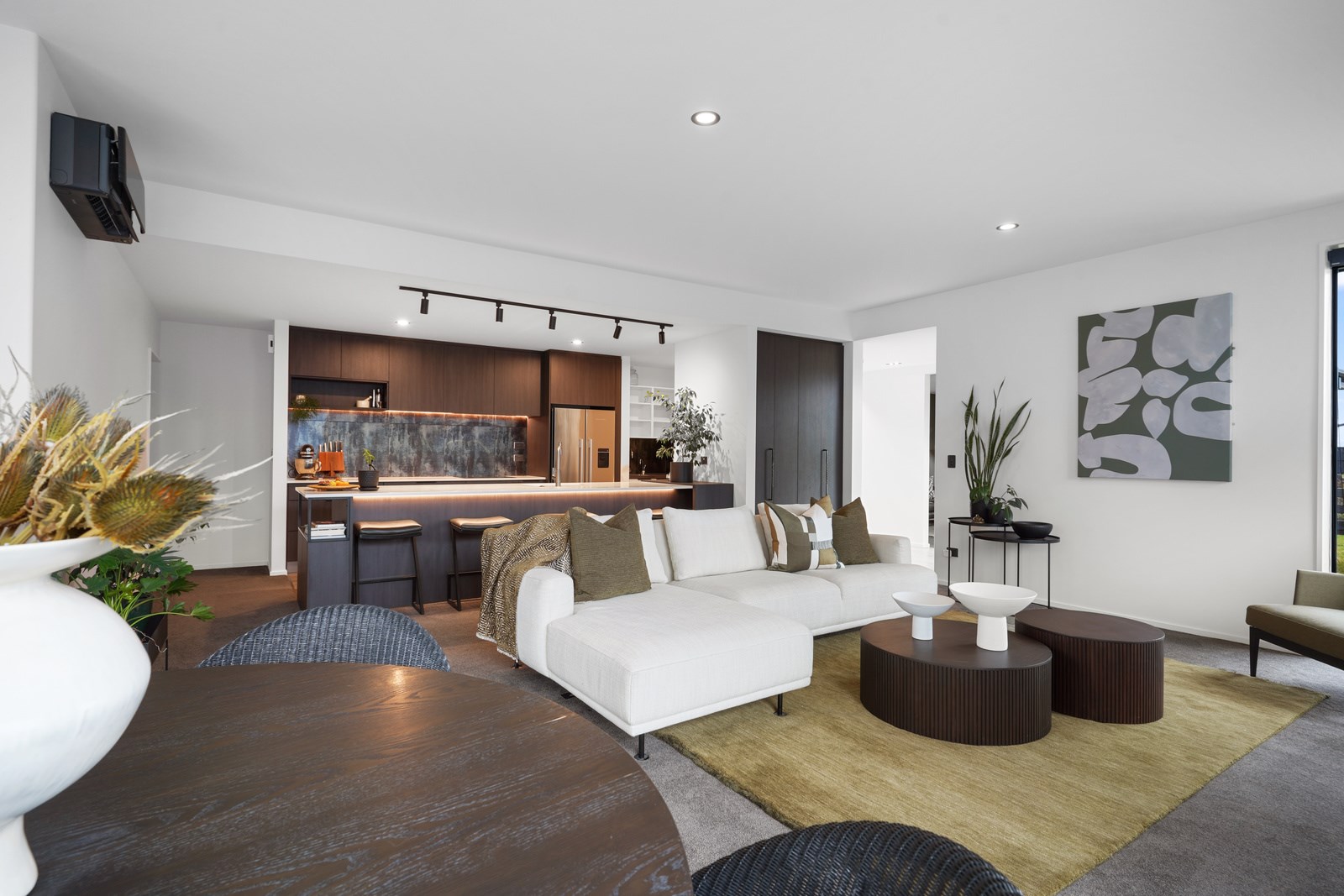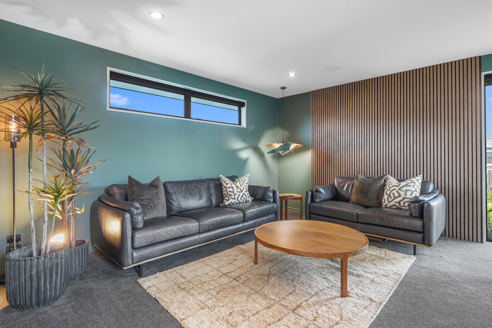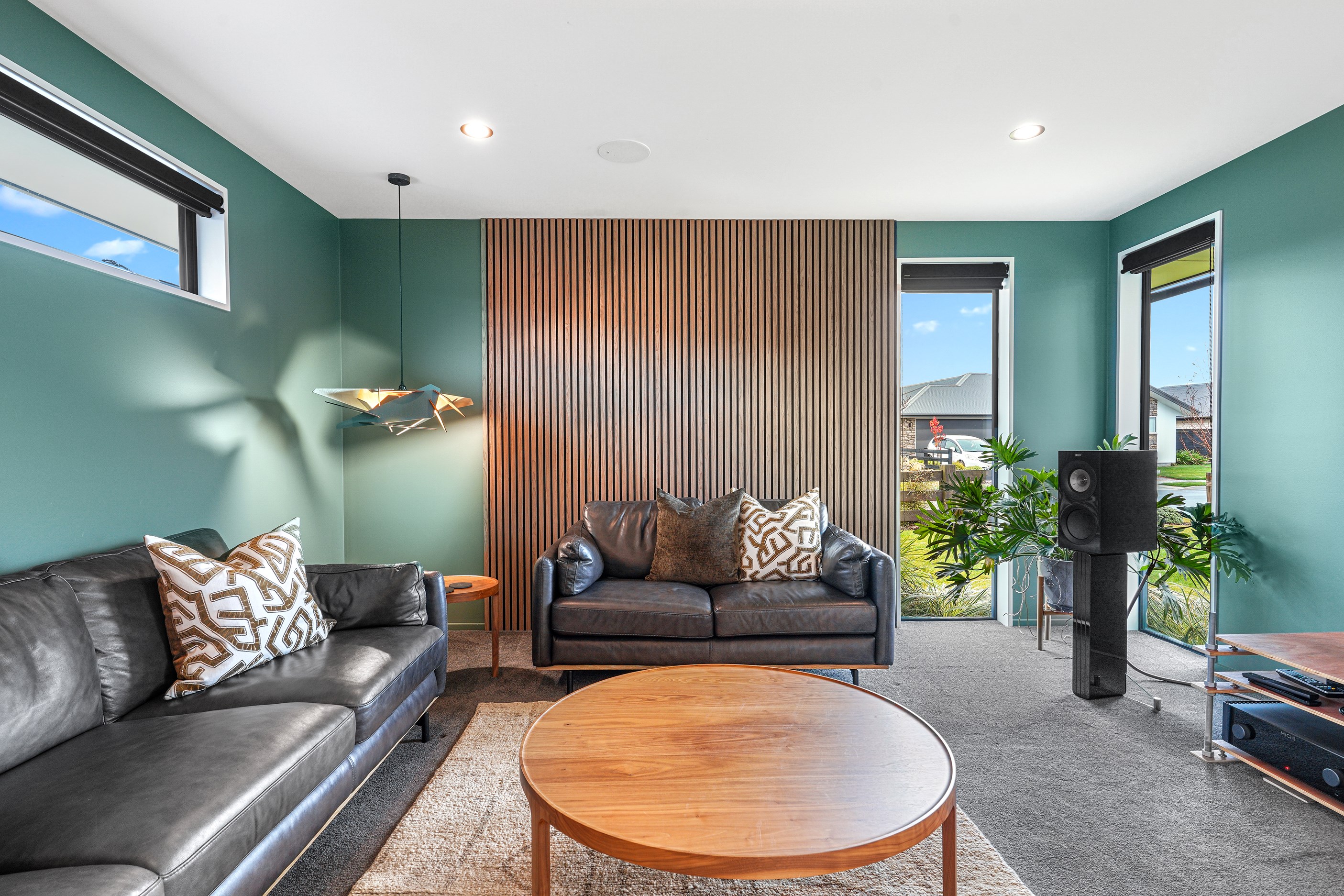 Relatively modest in size but not in character, this 208sqm home is a shining example of effective modern house design. A mix of concrete-style panels, brick veneer and charred cladding creates a beautifully serene arrival to the house that simultaneously lends privacy from the street. The distinctive low-pitch roof has contemporary charm that continues inside through an oversized front door. To the left of the entrance, a media room is tucked privately away. It’s warm green walls and timber-slat features differentiate it from the main open-plan living zone’s neutral decor.