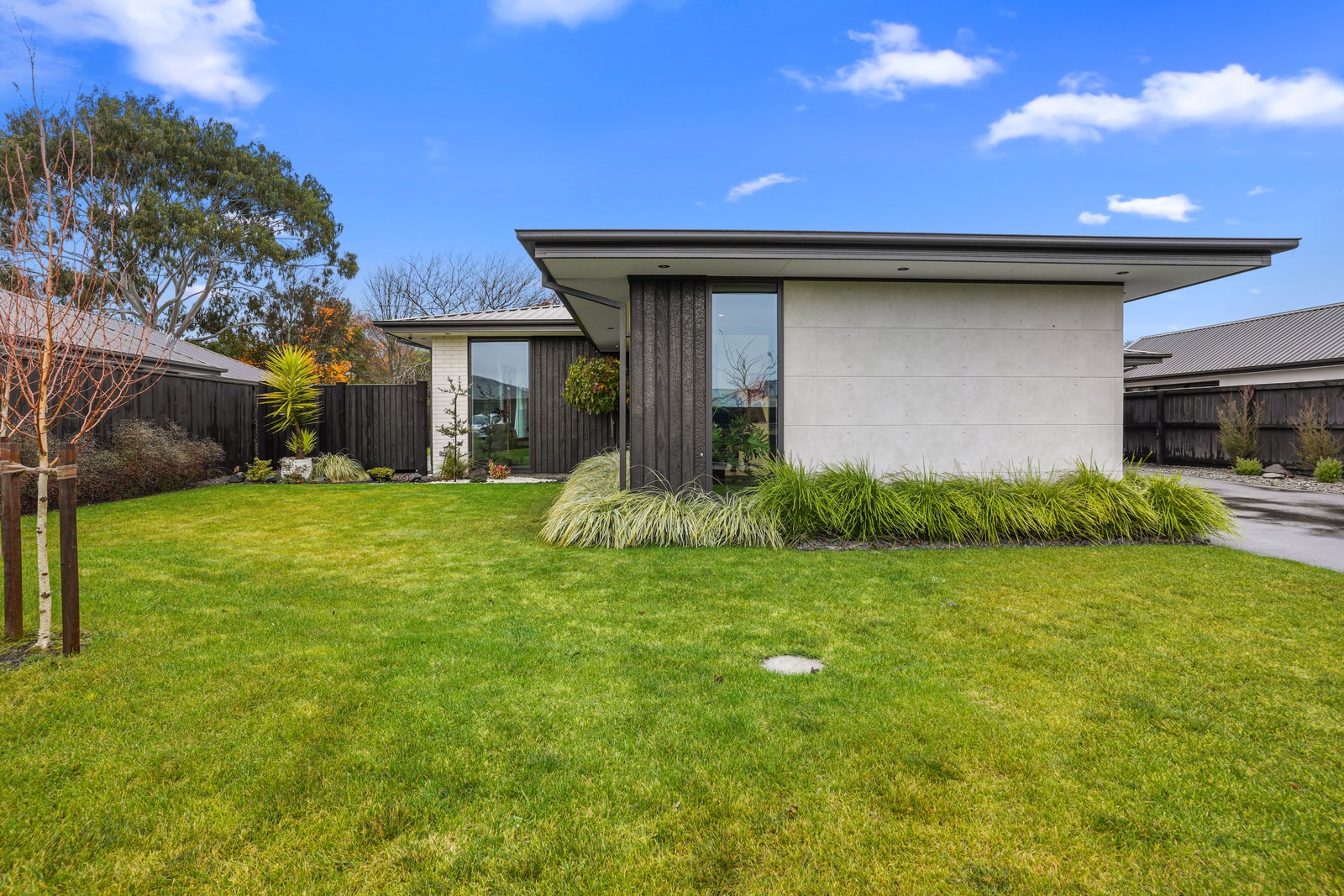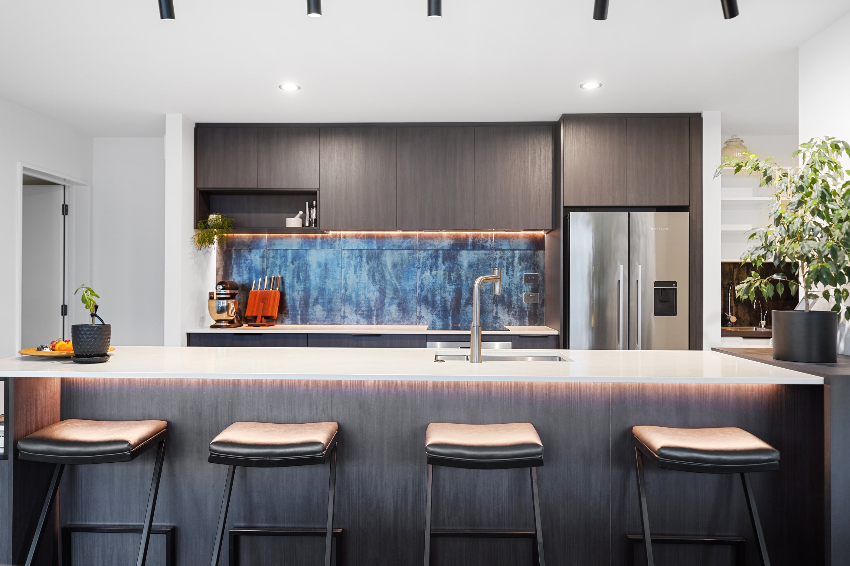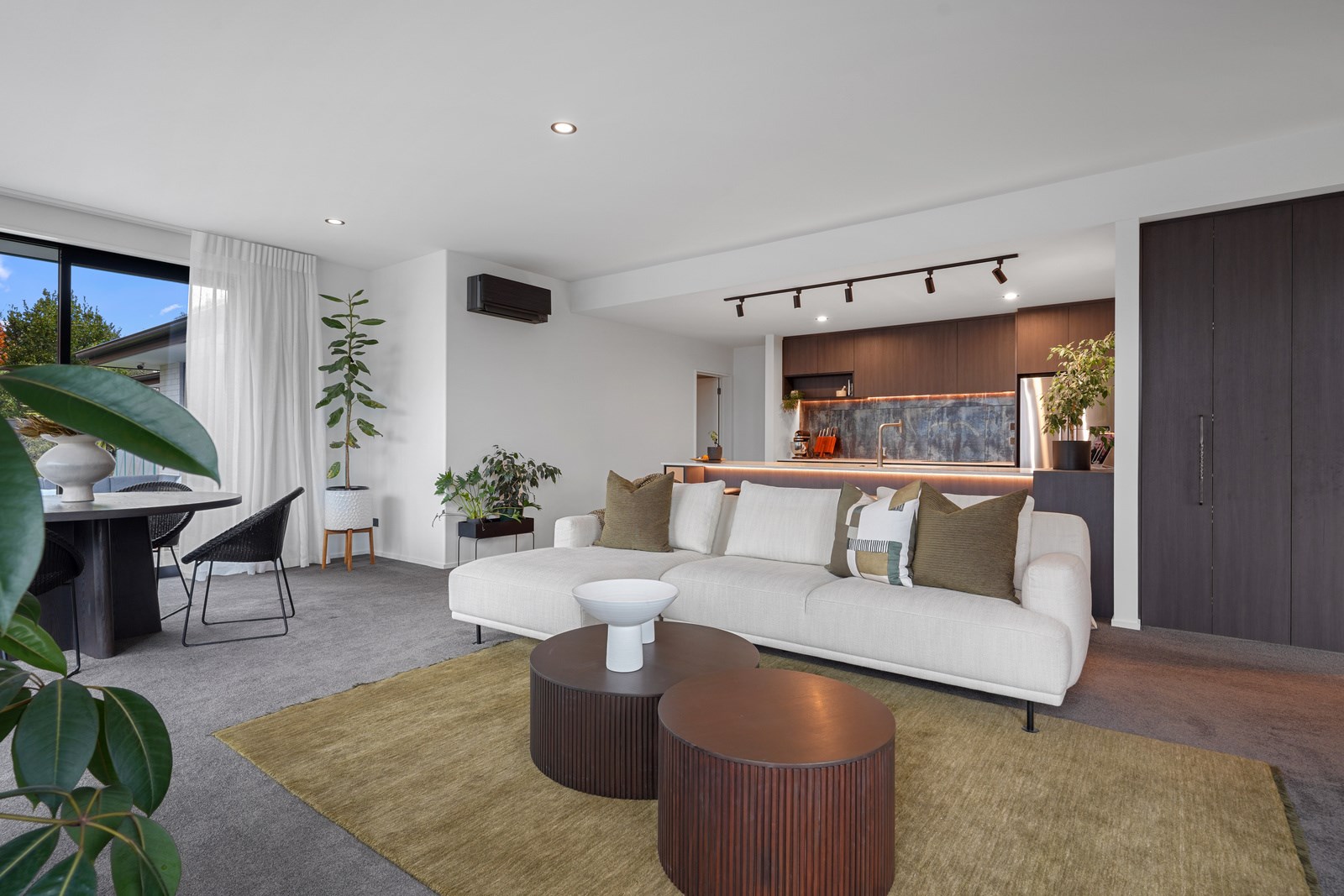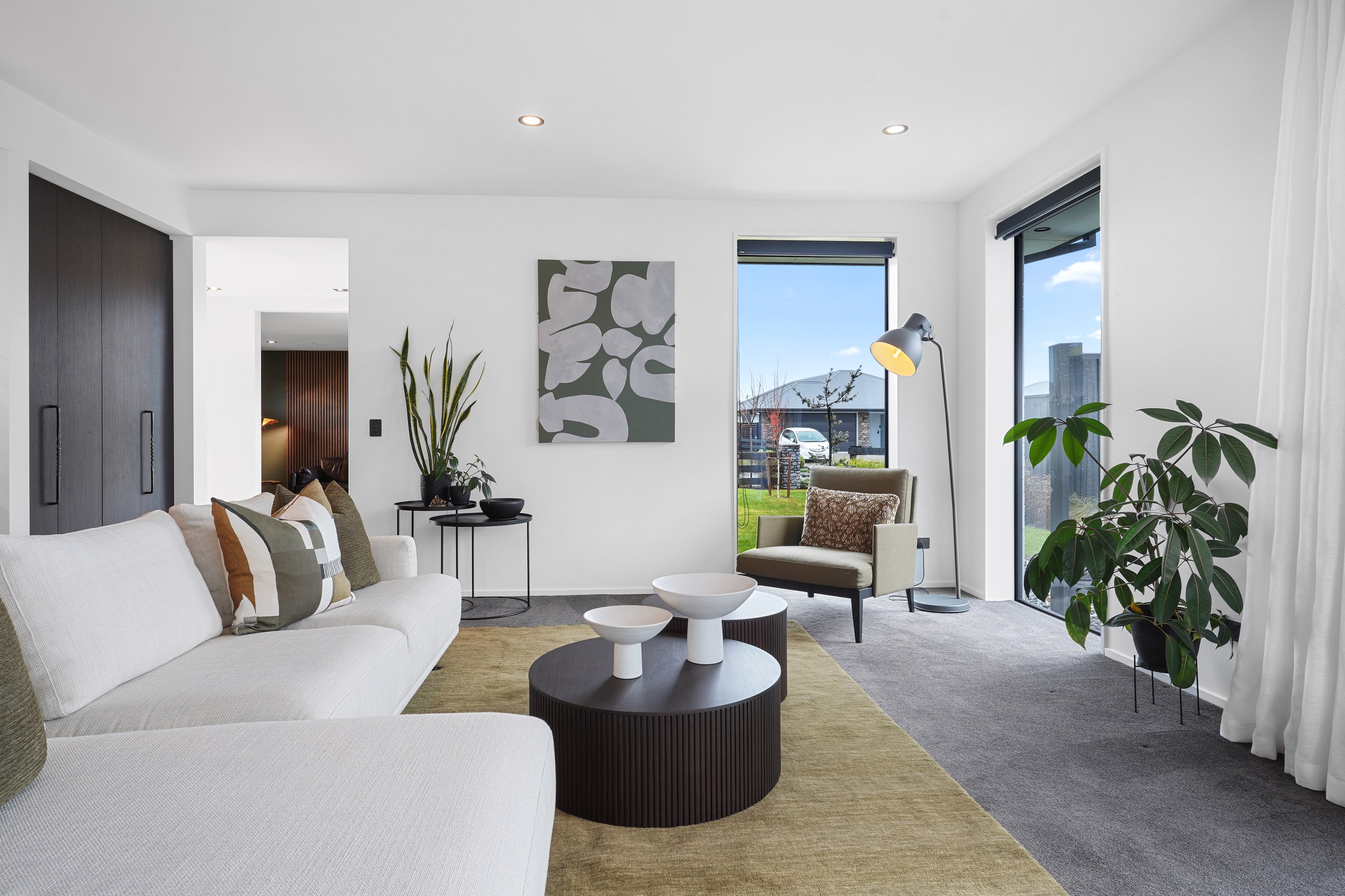 Relatively modest in size but not in character, this 208sqm home is a shining example of effective modern house design. A mix of concrete-style panels, brick veneer and charred cladding creates a beautifully serene arrival to the house that simultaneously lends privacy from the street. The distinctive low-pitch roof has contemporary charm that continues inside through an oversized front door. To the left of the entrance, a media room is tucked privately away. It’s warm green walls and timber-slat features differentiate it from the main open-plan living zone’s neutral decor.