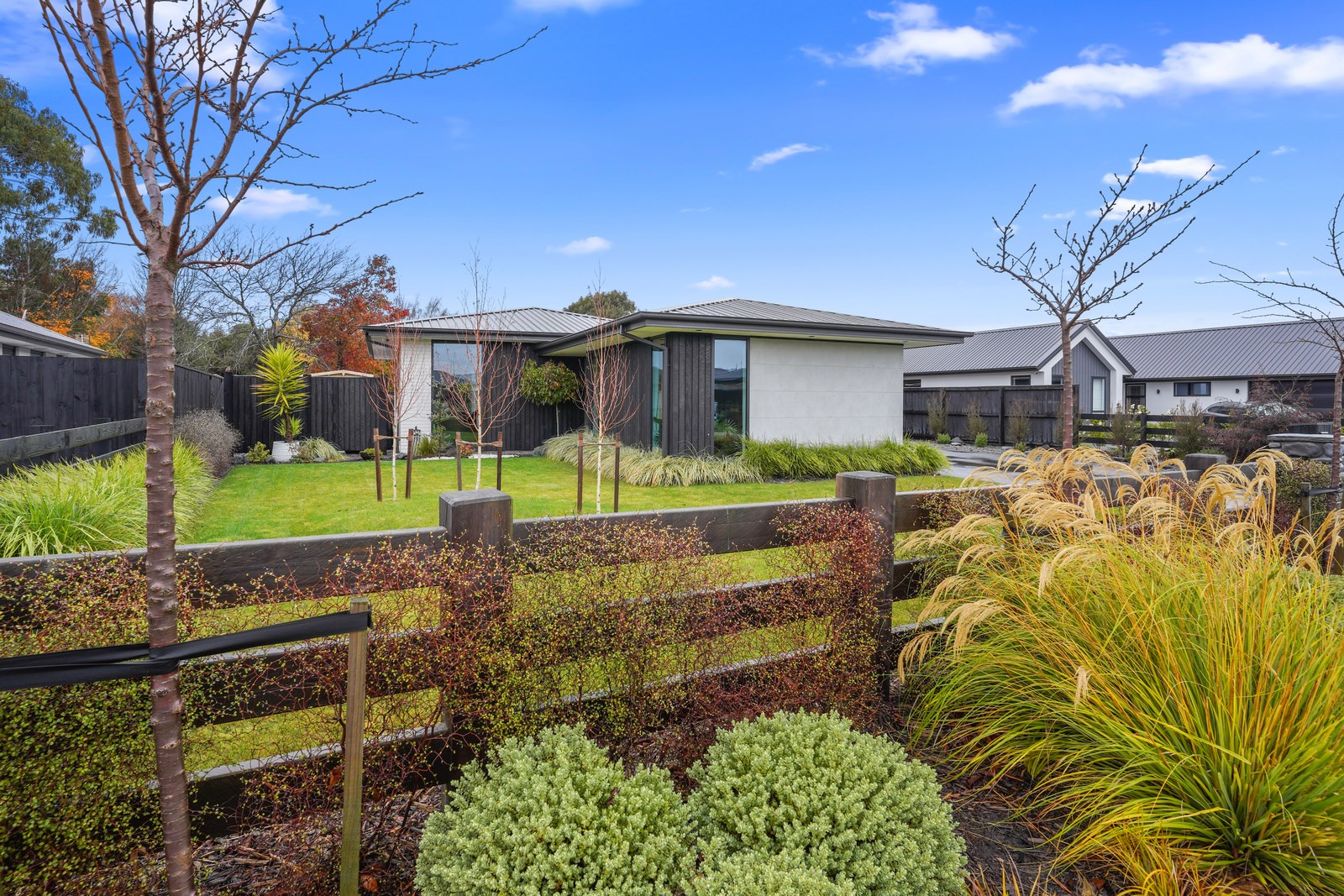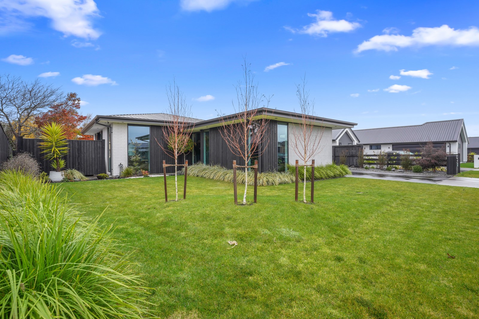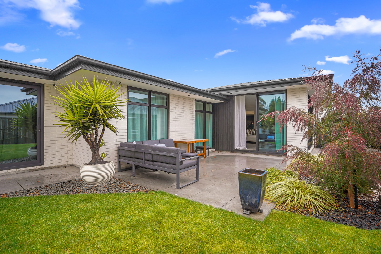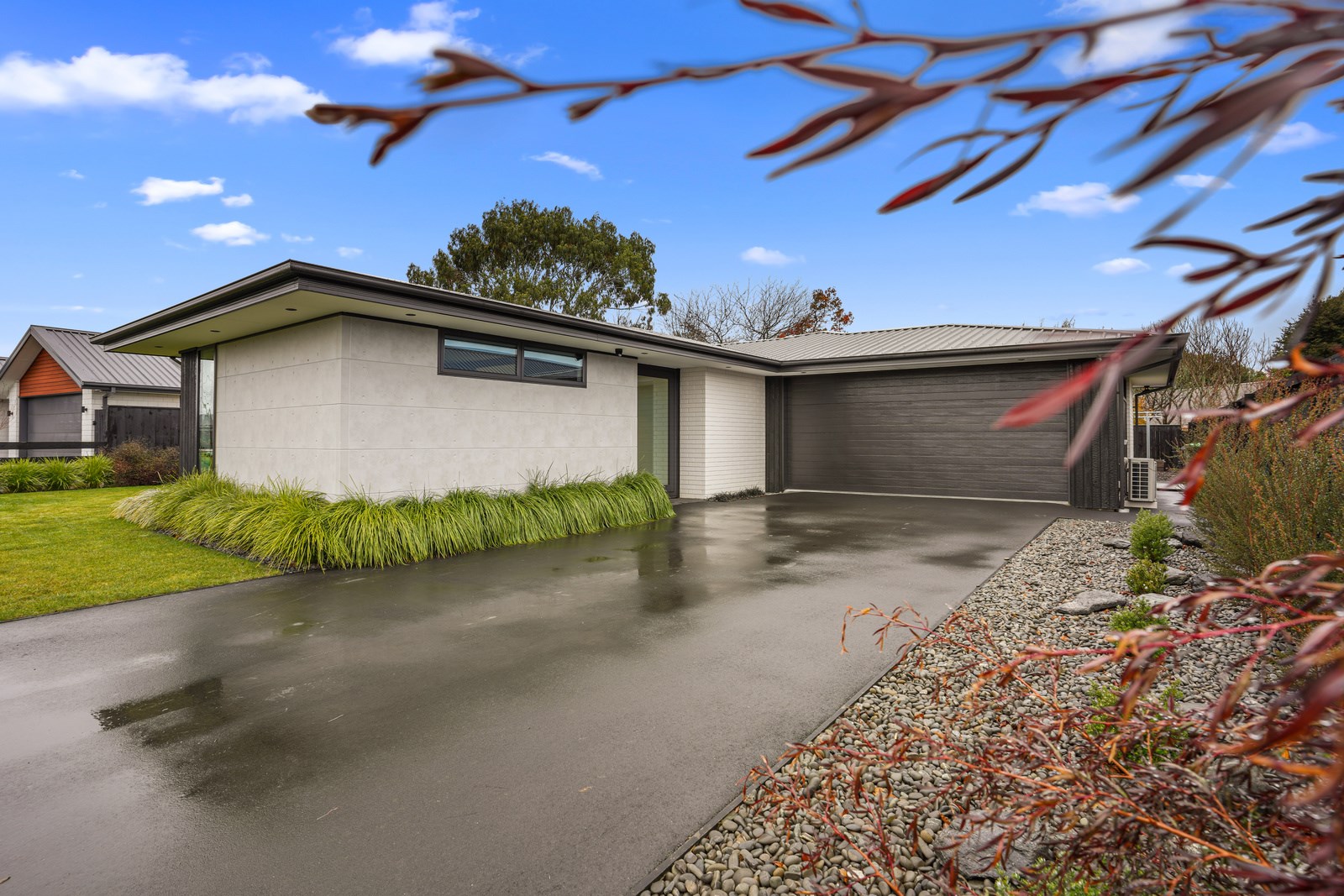Relatively modest in size but not in character, this 208sqm home is a shining example of effective modern house design. A mix of concrete-style panels, brick veneer and charred cladding creates a beautifully serene arrival to the house that simultaneously lends privacy from the street. The distinctive low-pitch roof has contemporary charm that continues inside through an oversized front door. To the left of the entrance, a media room is tucked privately away. It’s warm green walls and timber-slat features differentiate it from the main open-plan living zone’s neutral decor.