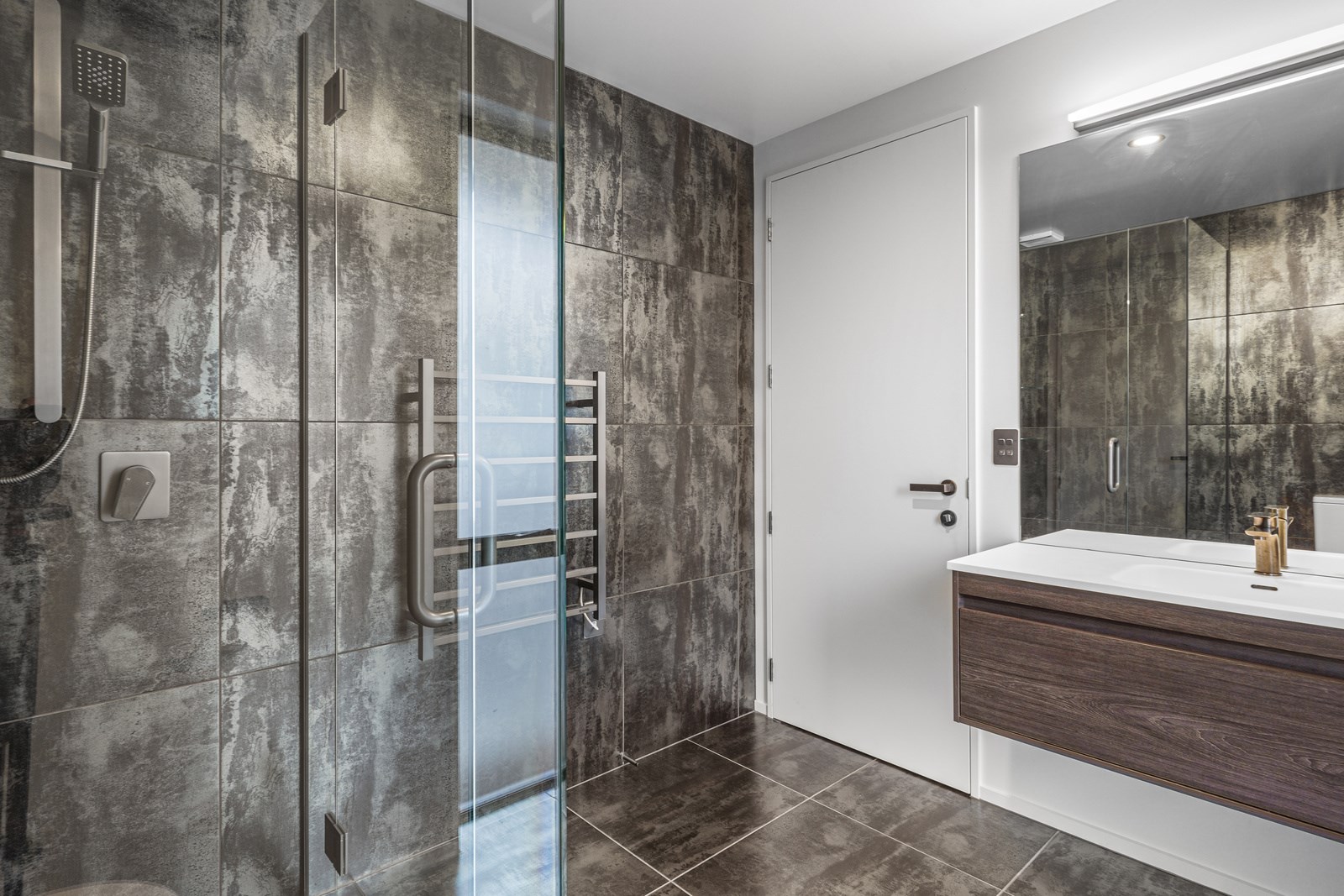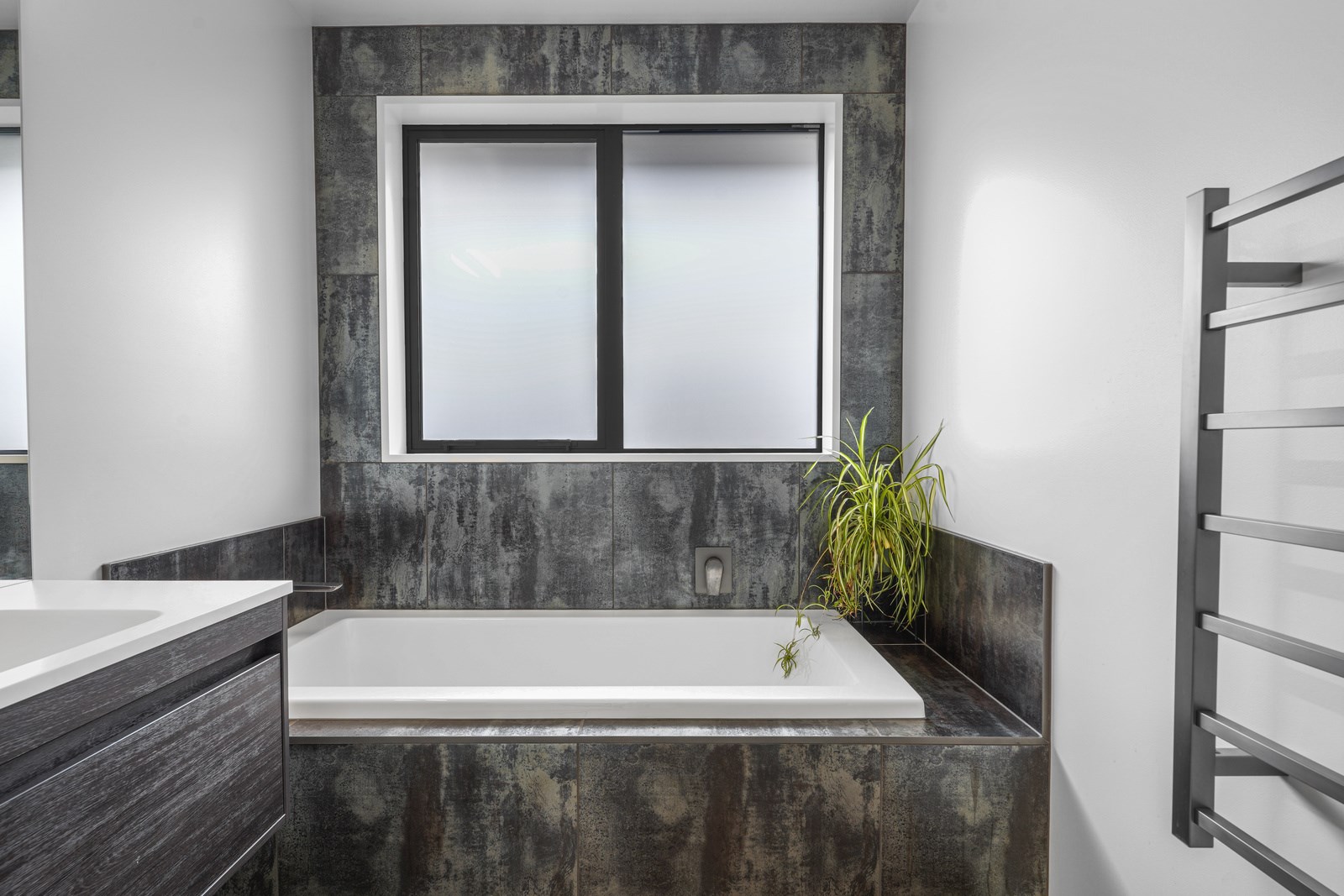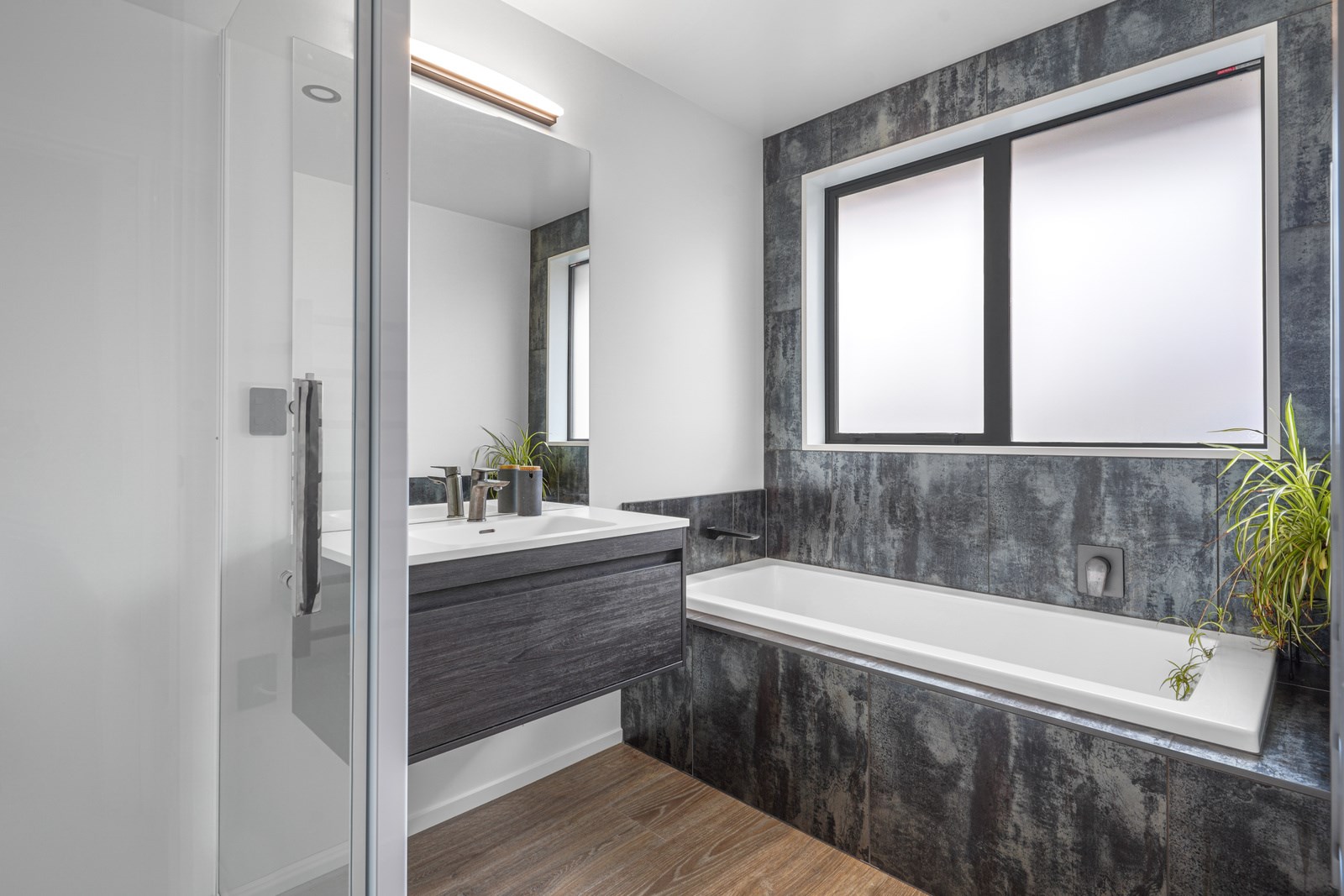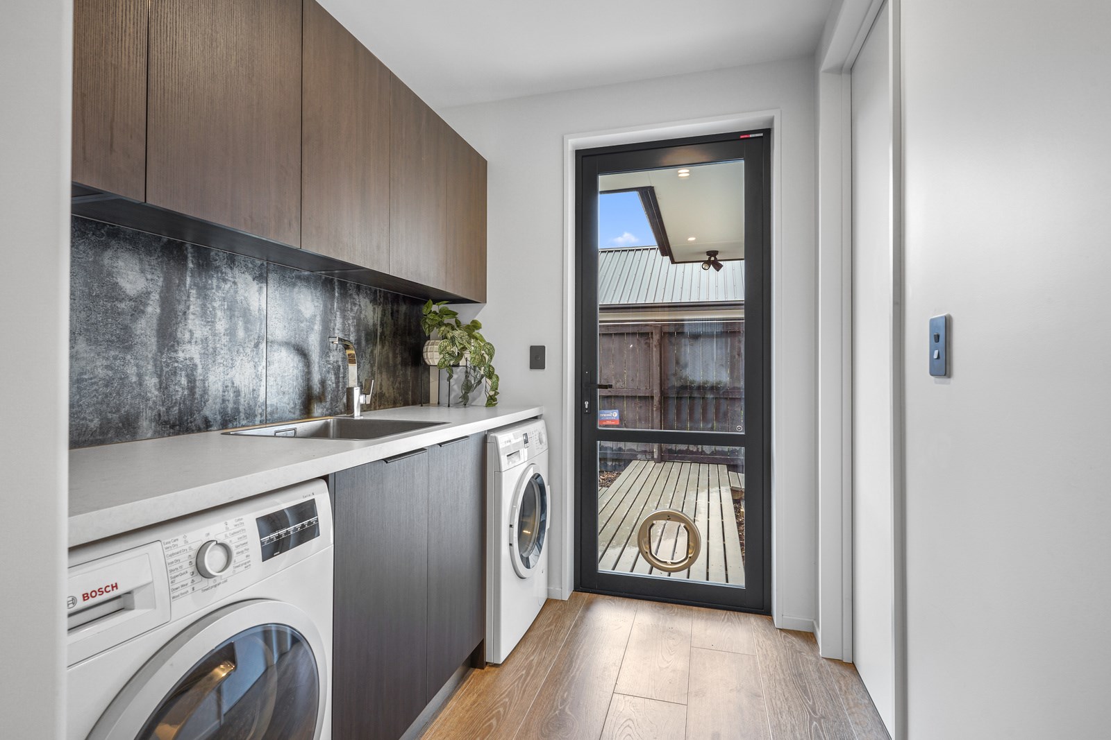 Relatively modest in size but not in character, this 208sqm home is a shining example of effective modern house design. A mix of concrete-style panels, brick veneer and charred cladding creates a beautifully serene arrival to the house that simultaneously lends privacy from the street. The distinctive low-pitch roof has contemporary charm that continues inside through an oversized front door. To the left of the entrance, a media room is tucked privately away. It’s warm green walls and timber-slat features differentiate it from the main open-plan living zone’s neutral decor.